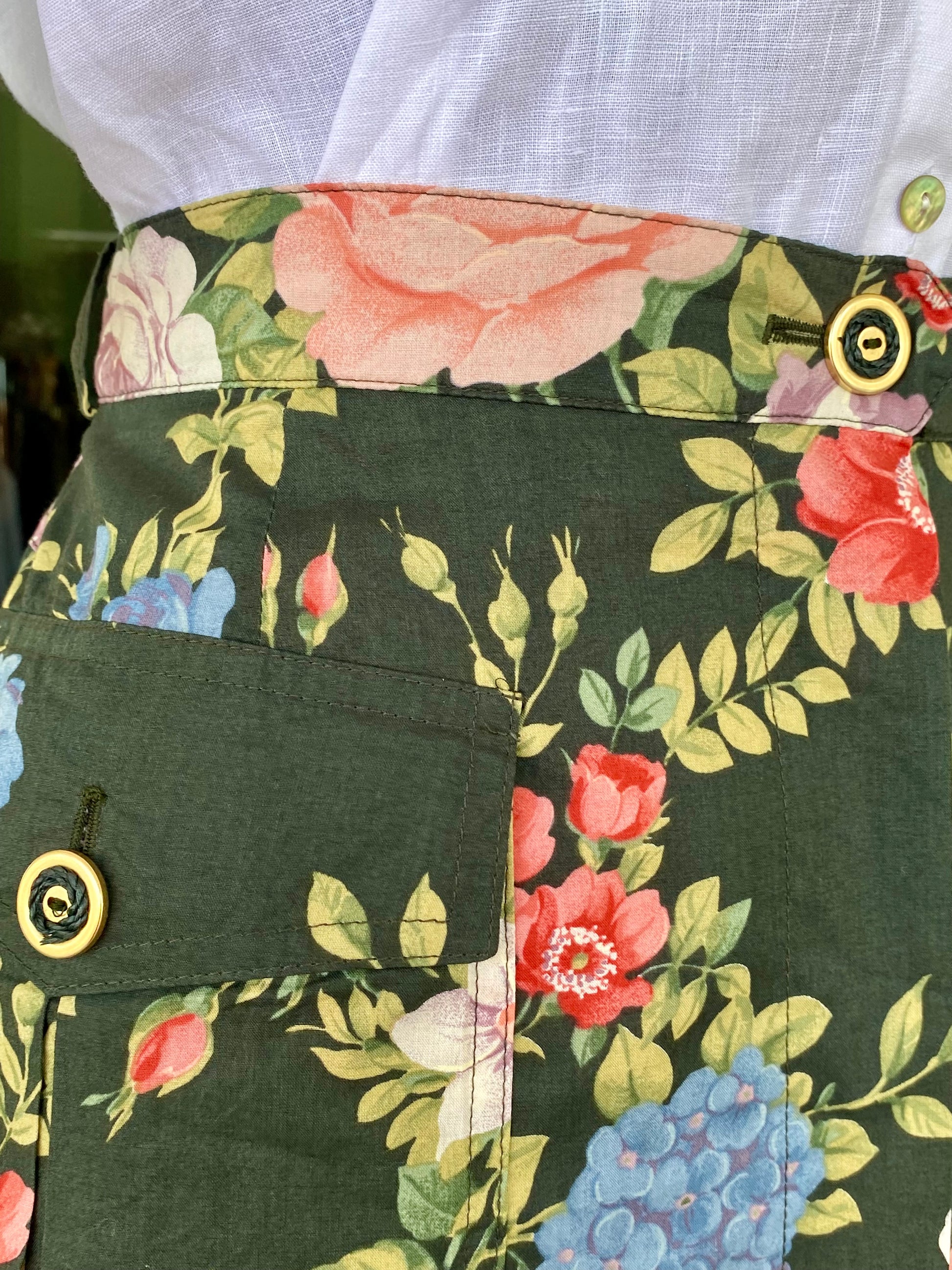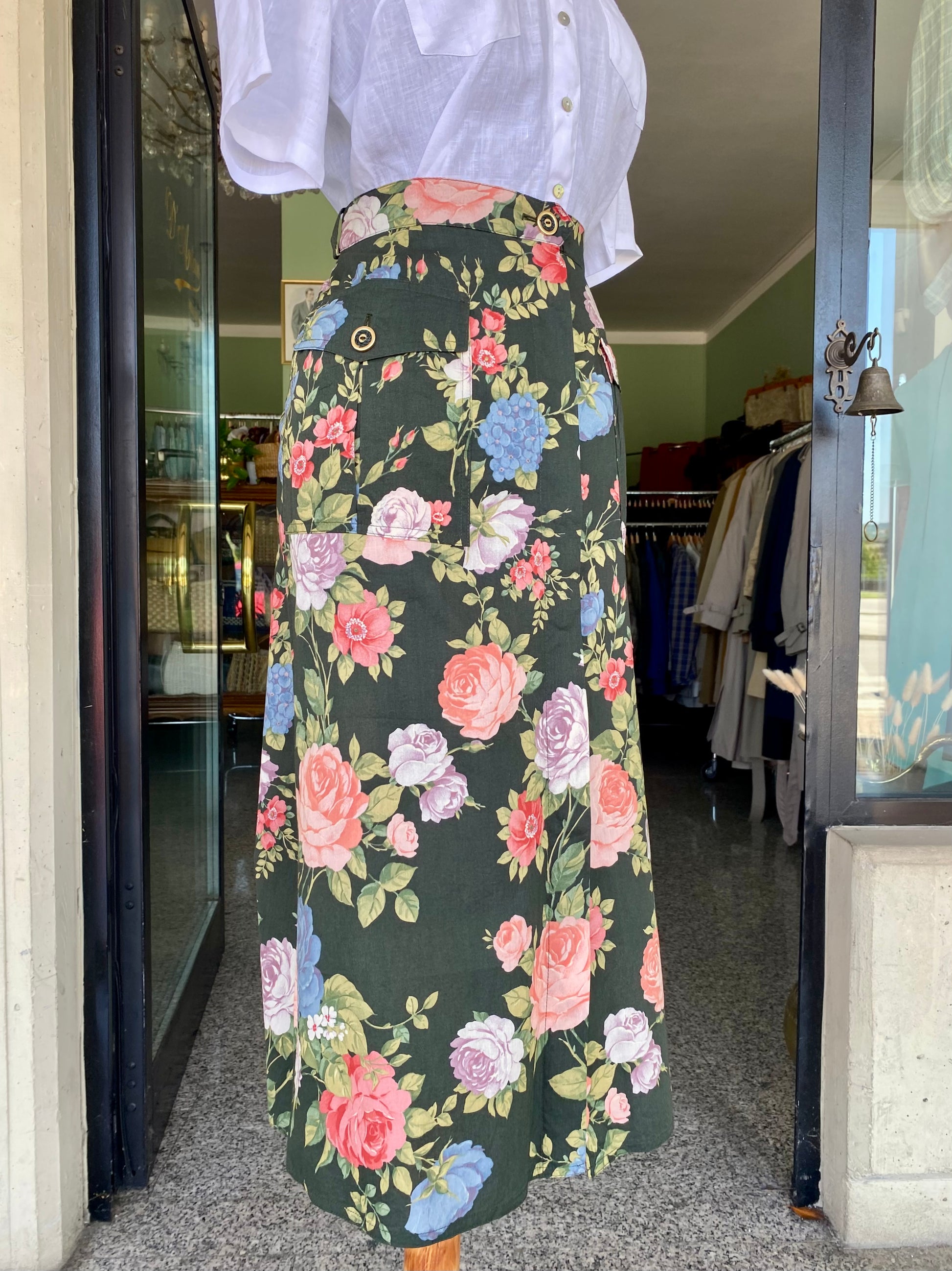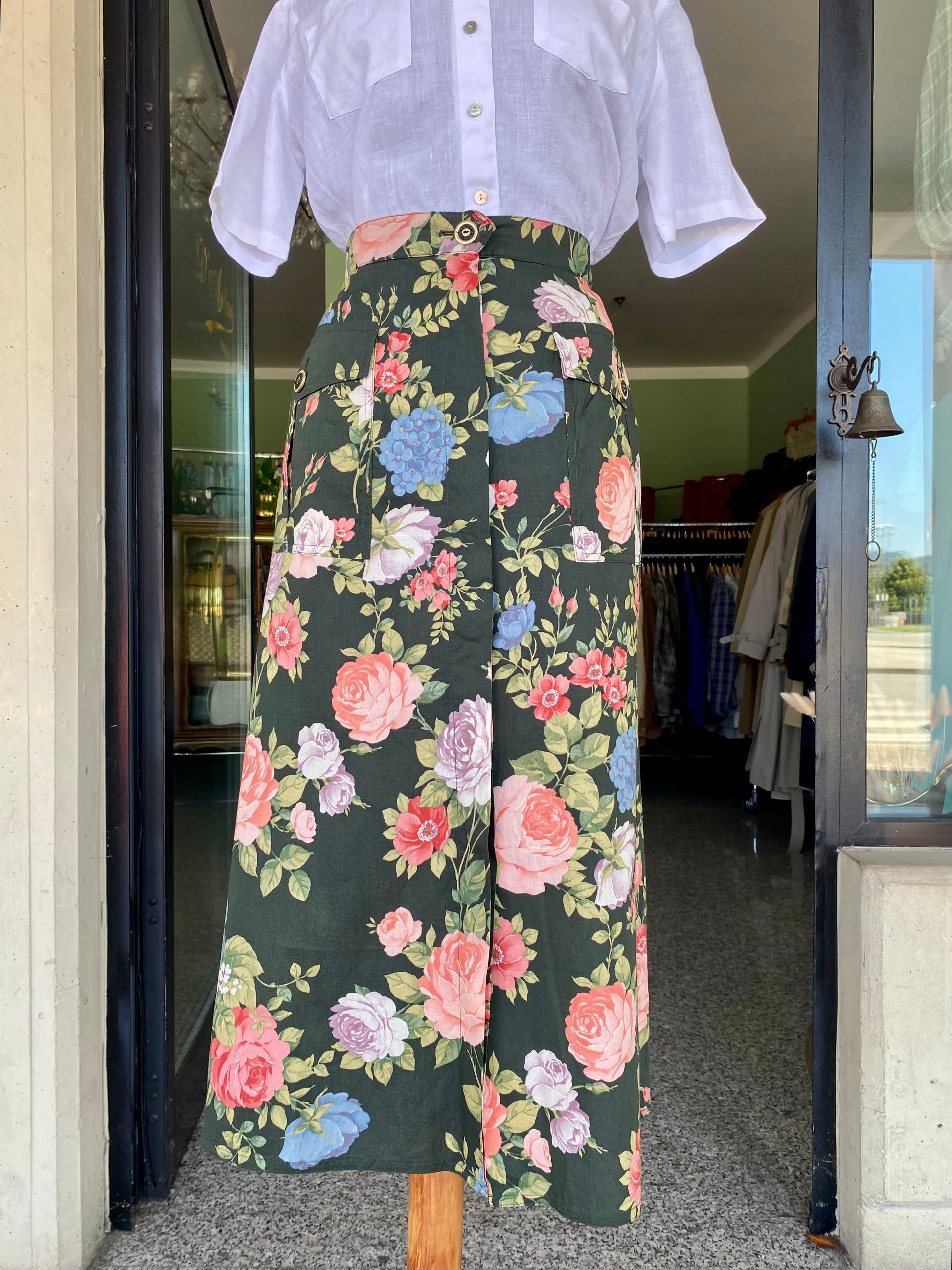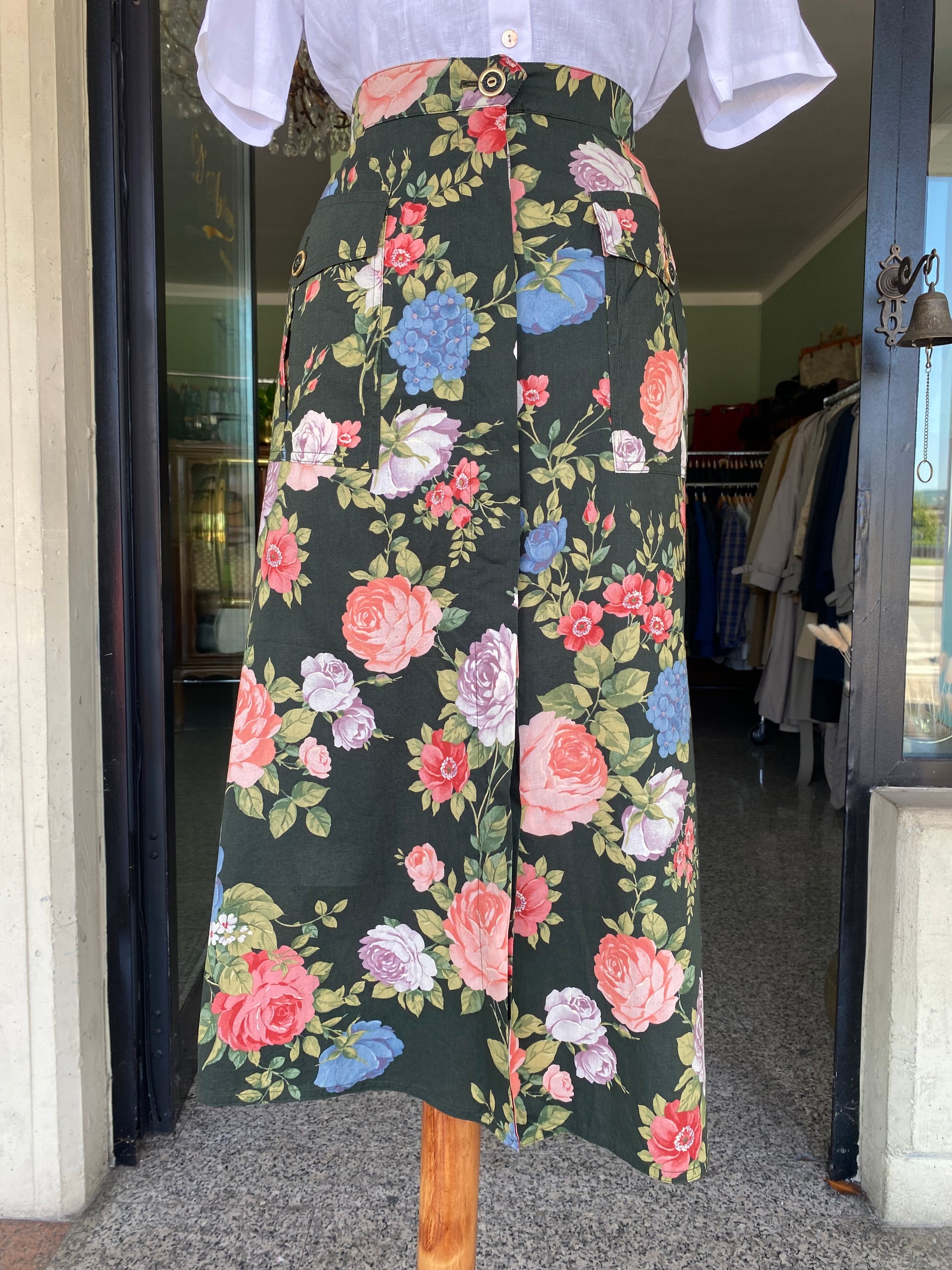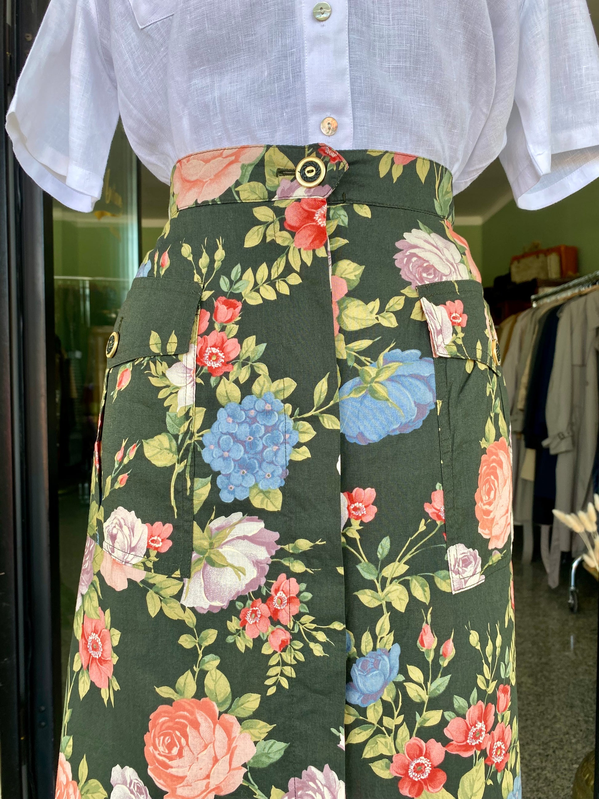 Un tripudio di rose e ortensie su fondo verde bosco: questa gonna longuette in puro cotone è un invito a passeggiare in giardino anche in città. Linea svasata, taschine applicate e chiusura frontale con bottoni. Fresca e romantica