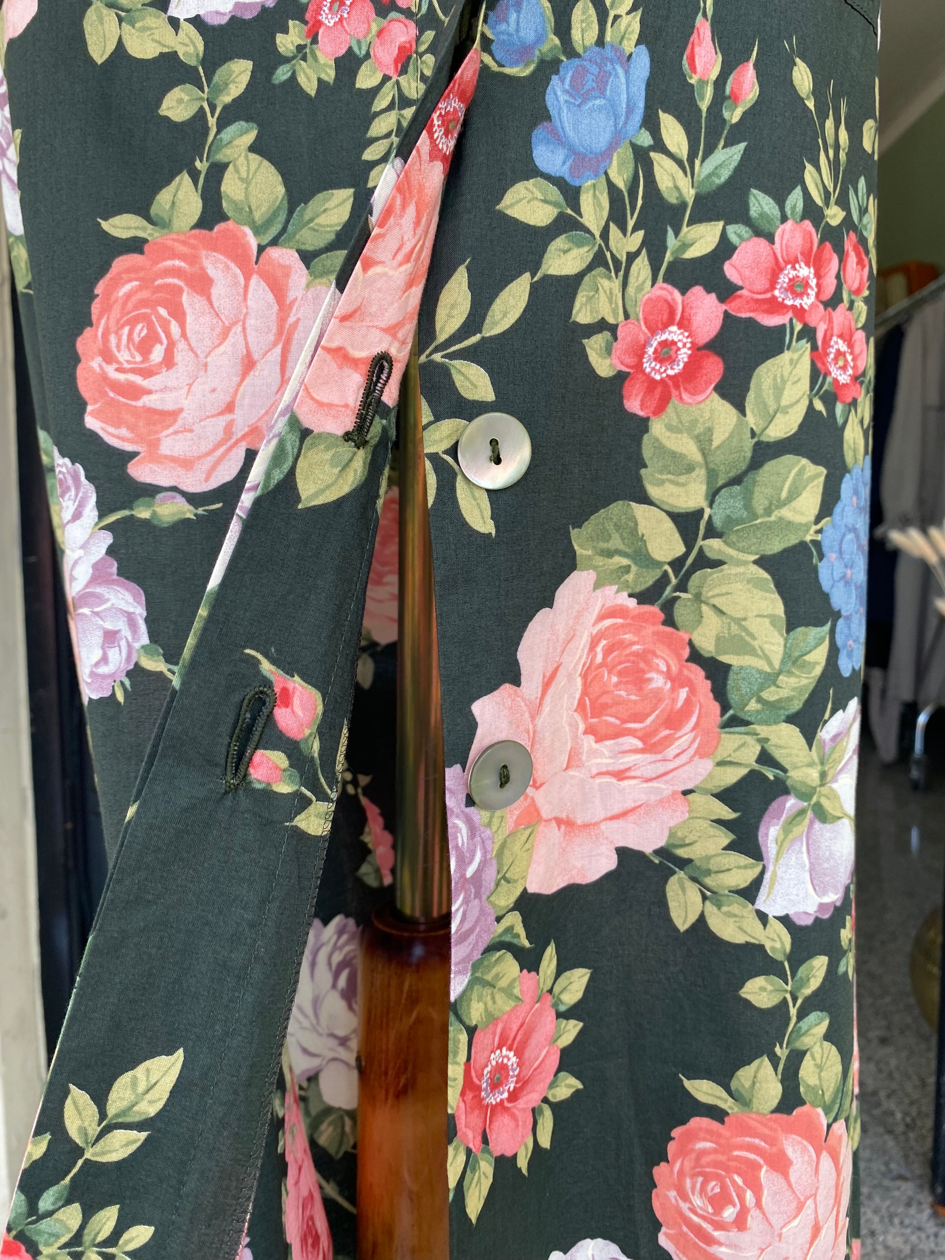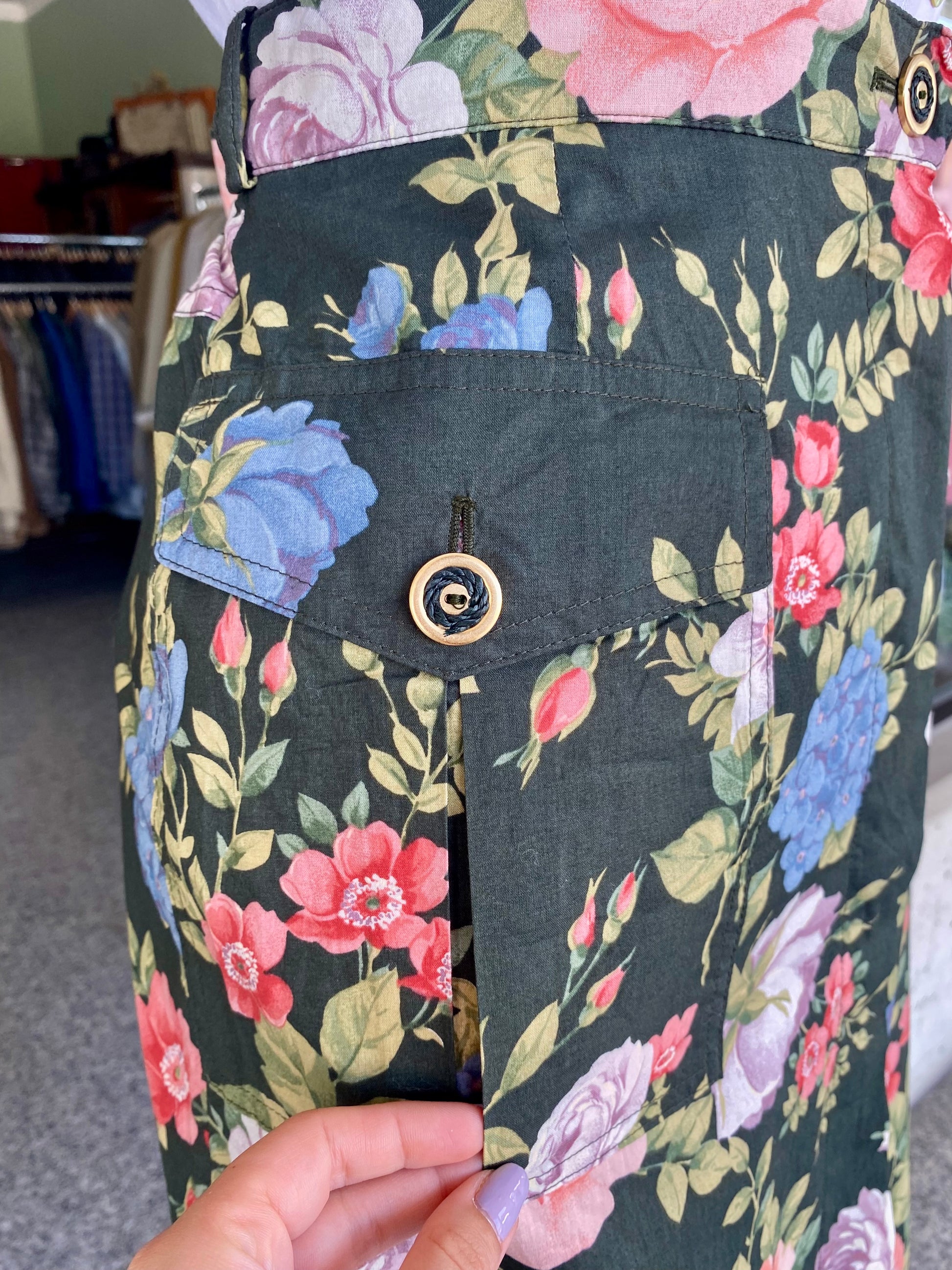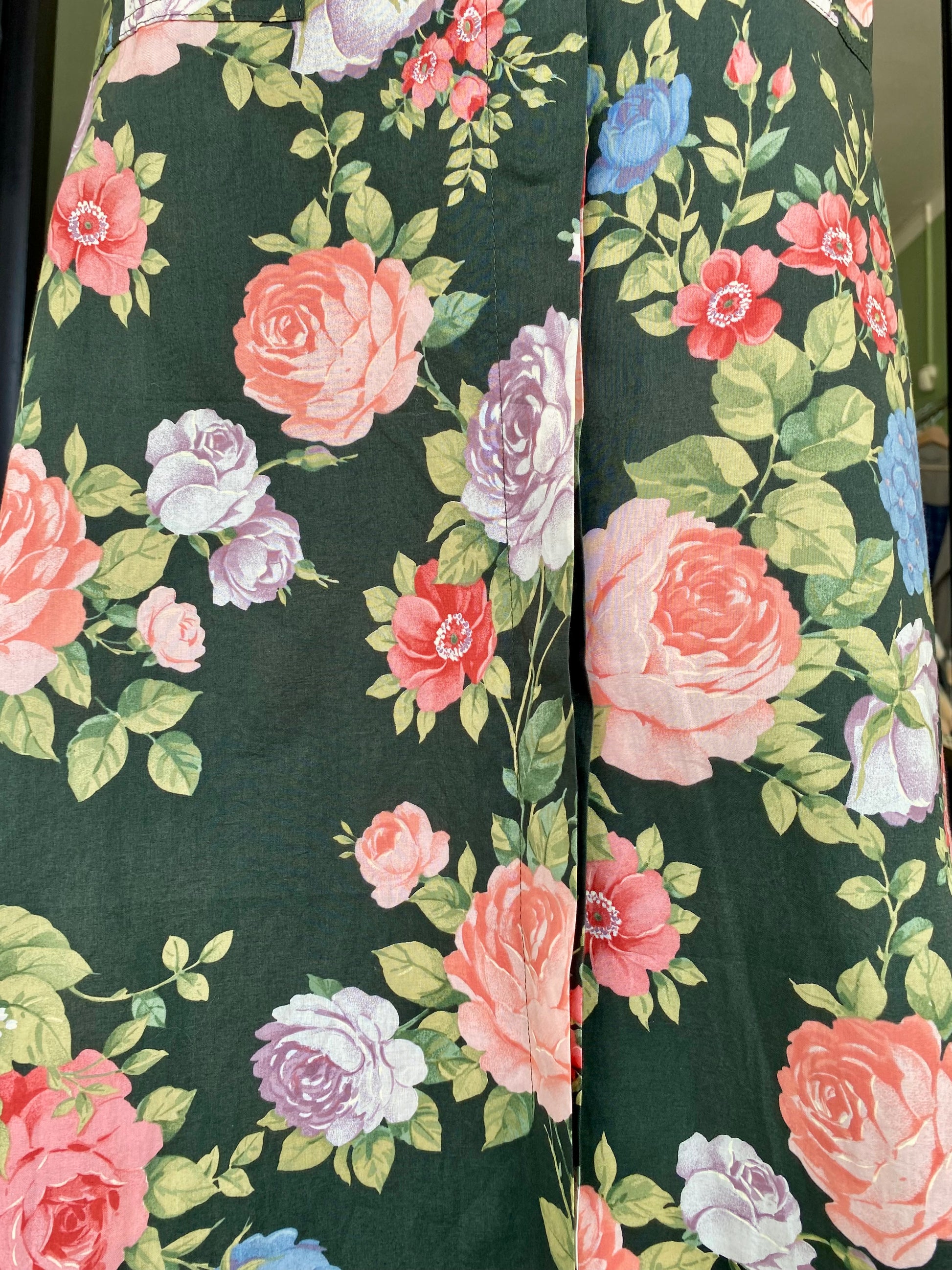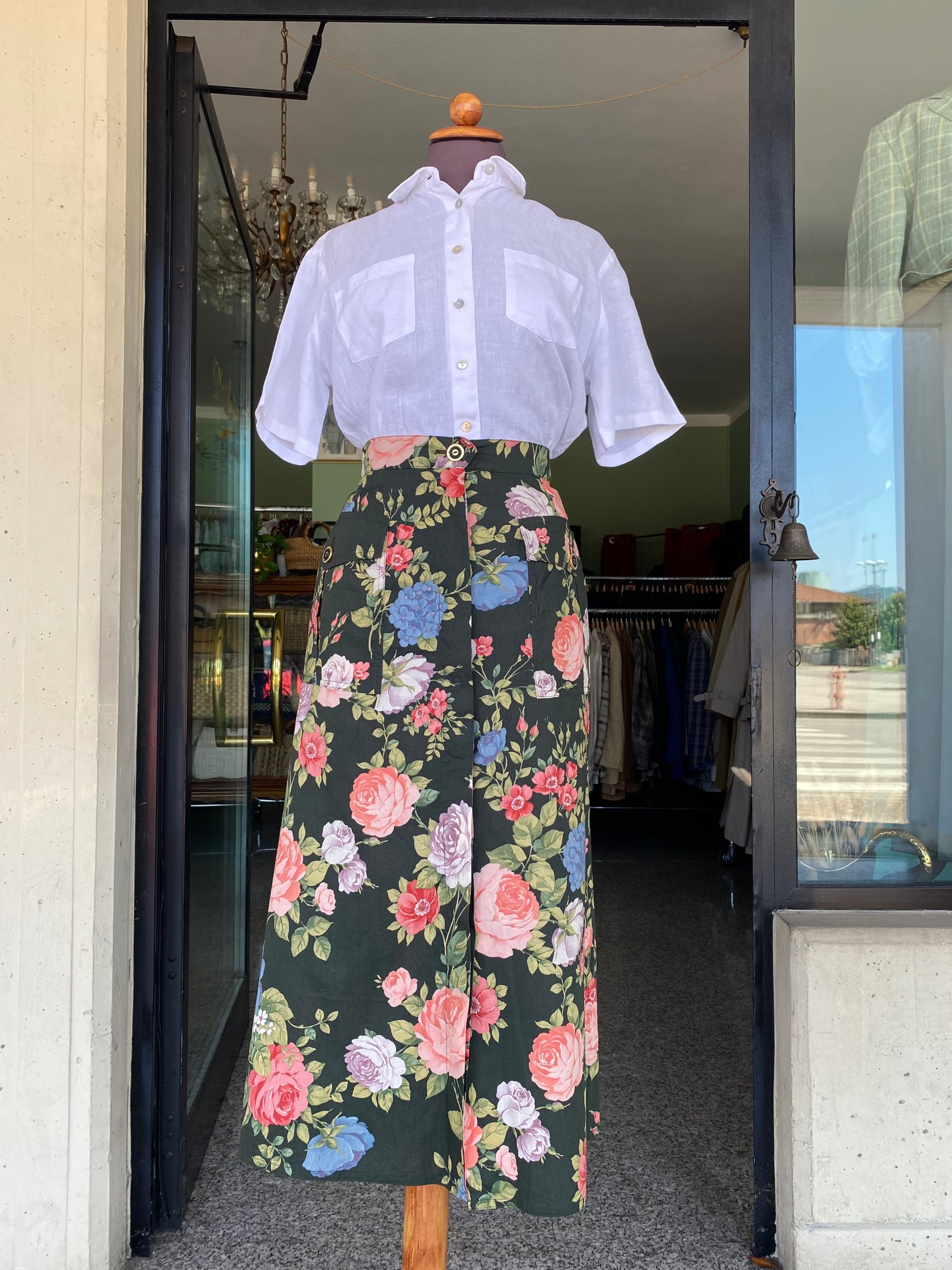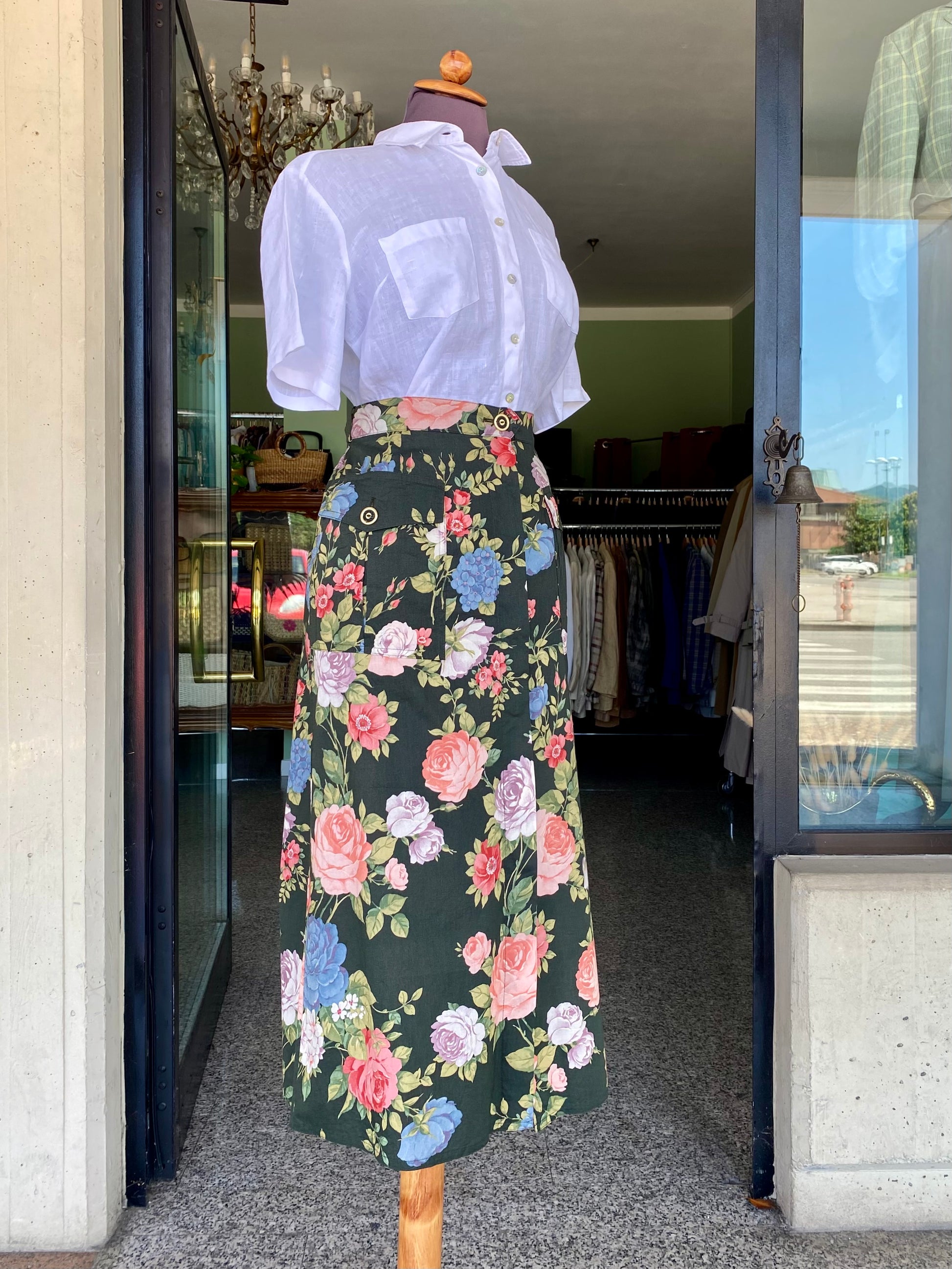 Un tripudio di rose e ortensie su fondo verde bosco: questa gonna longuette in puro cotone è un invito a passeggiare in giardino anche in città. Linea svasata, taschine applicate e chiusura frontale con bottoni. Fresca e romantica
