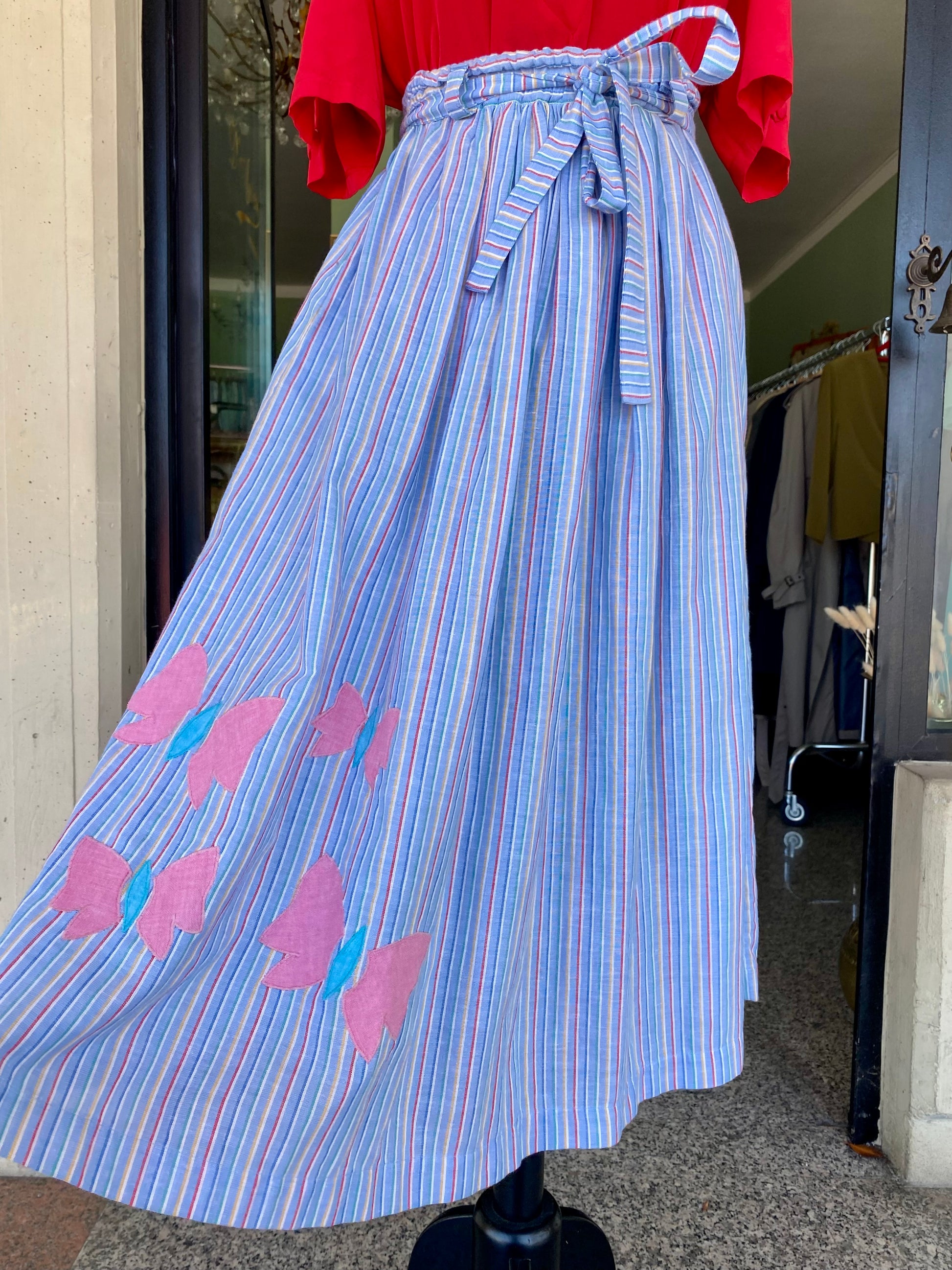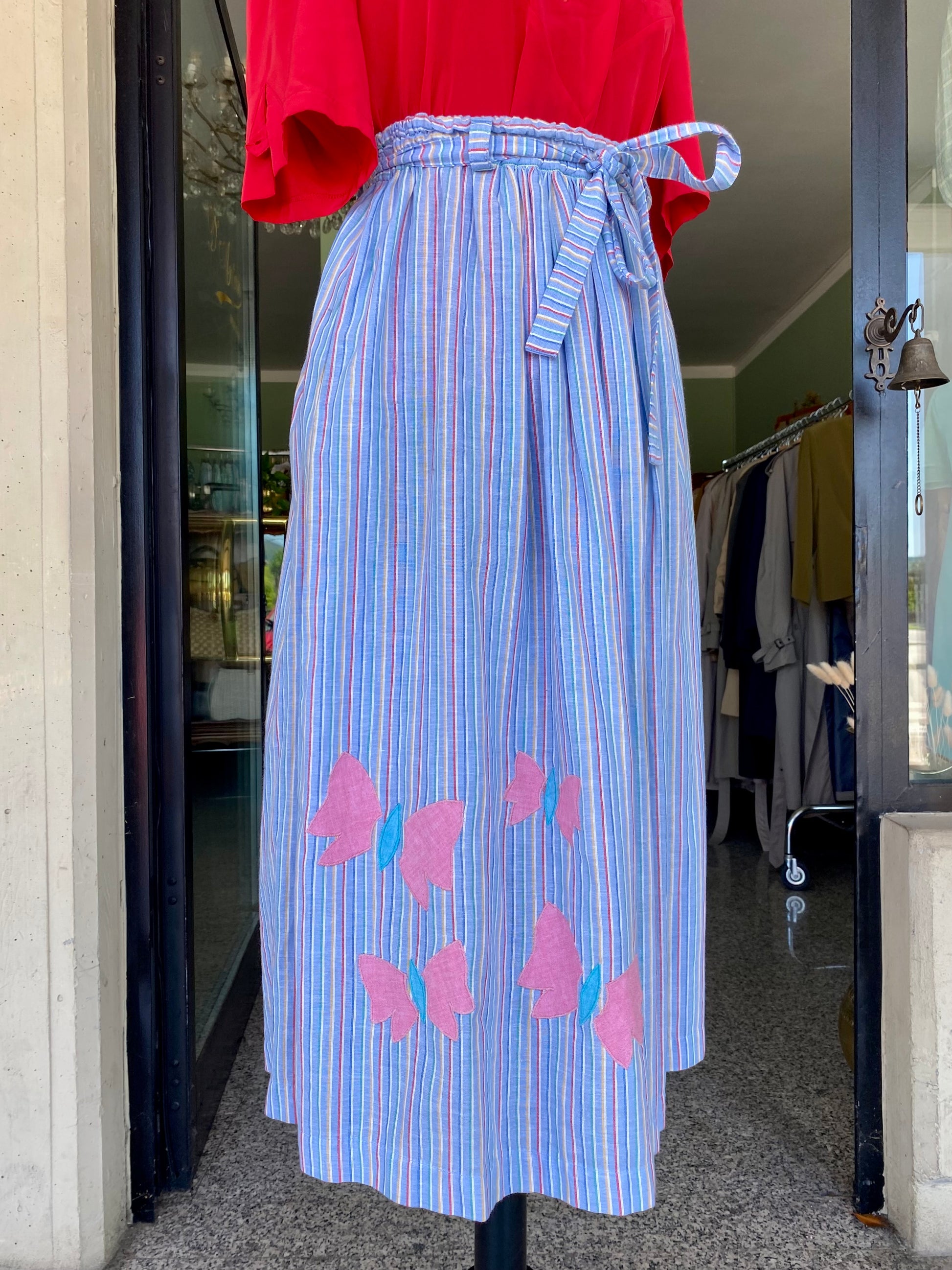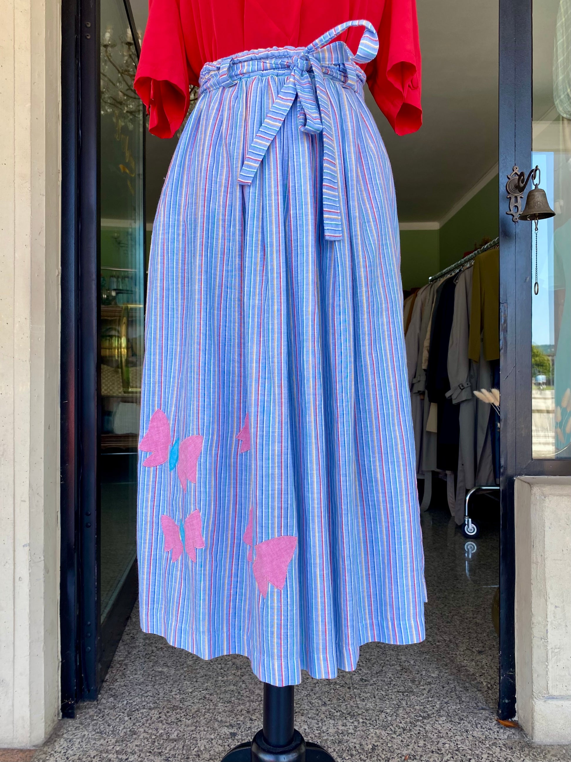 Gonna estiva in cotone leggero a righe arcobaleno, impreziosita da romantiche farfalle applicate a mano. Vita alta con cinturina annodata per valorizzare la silhouette. Fresca, allegra e perfetta per giornate spensierate.