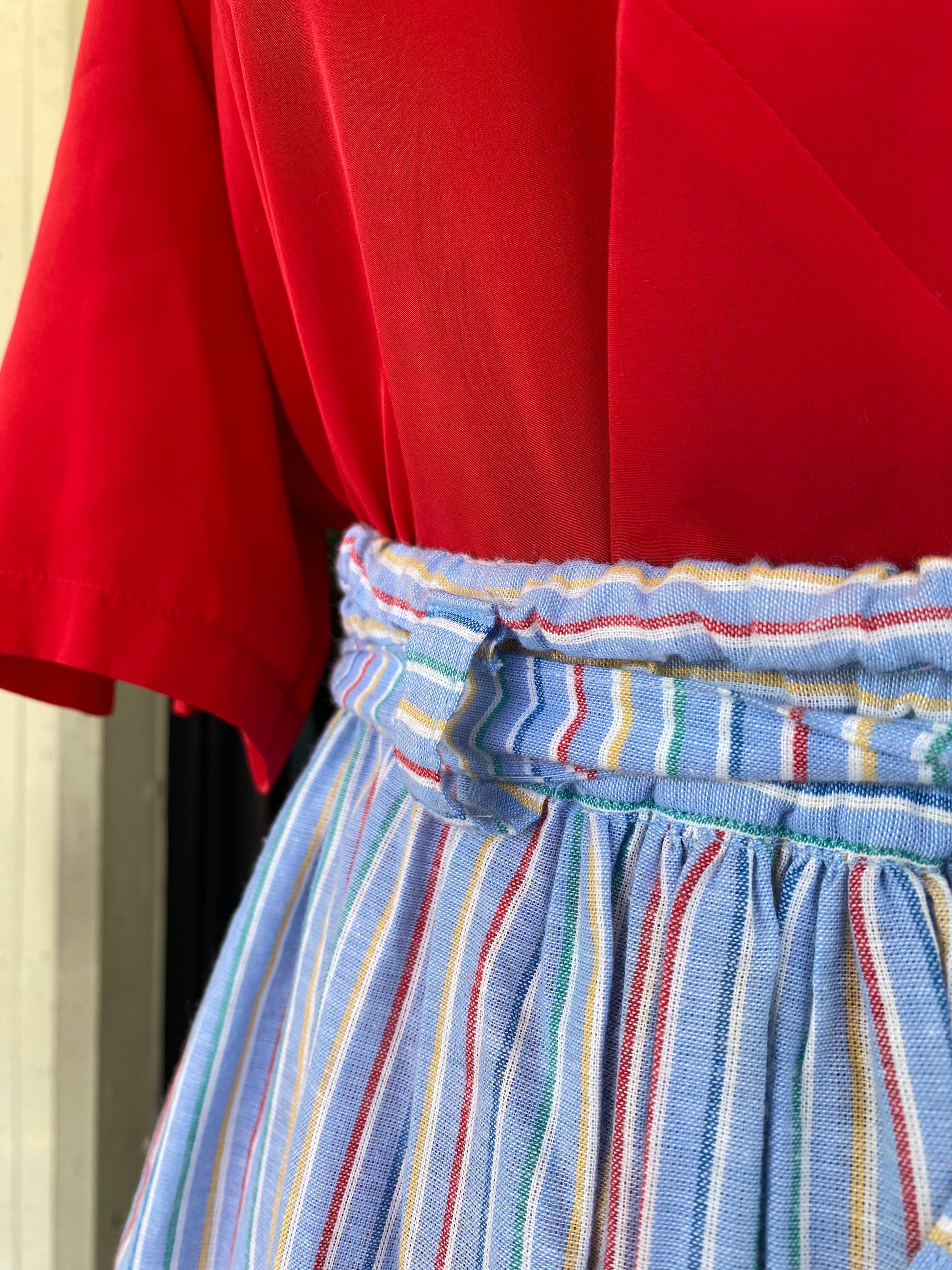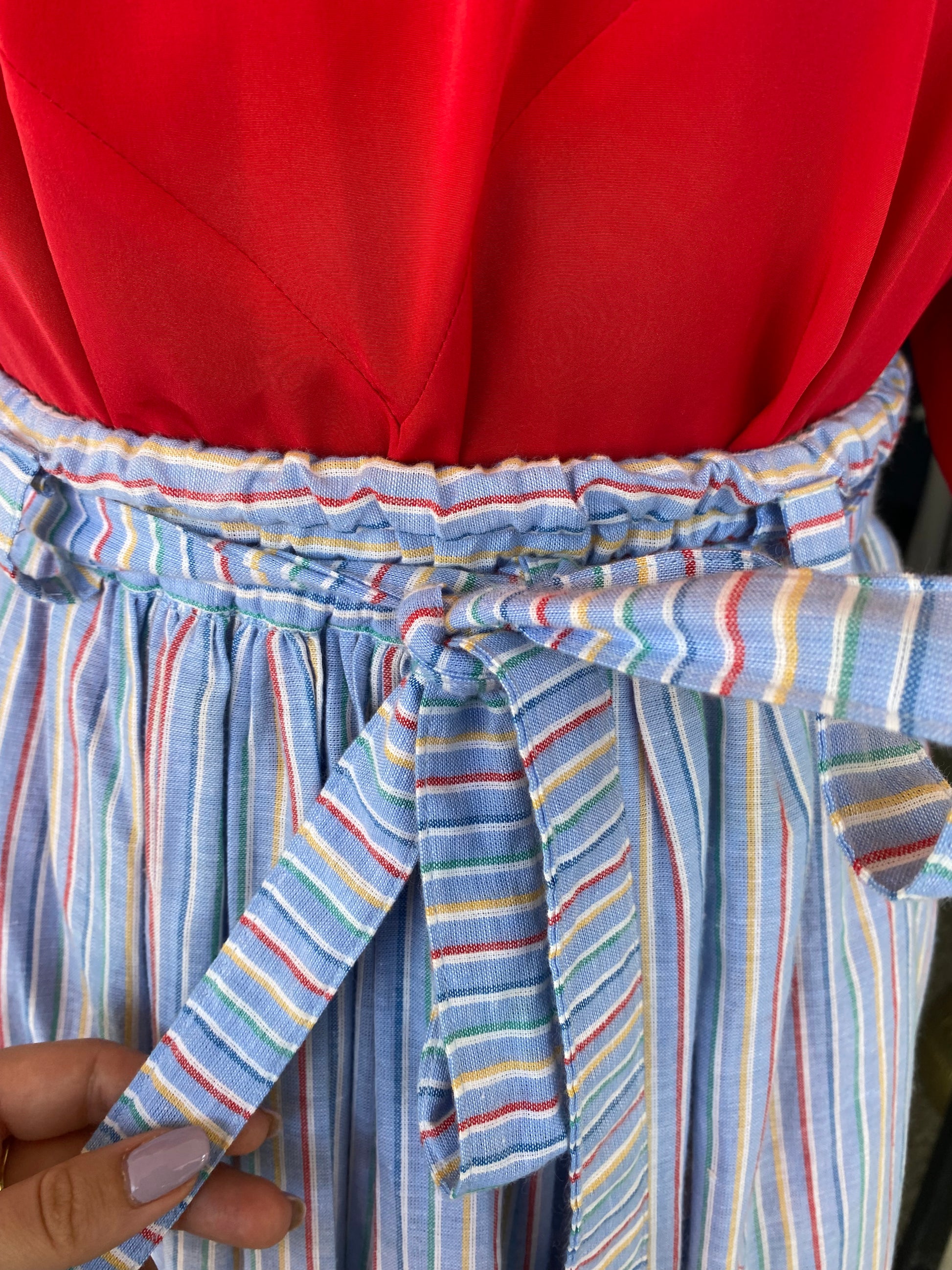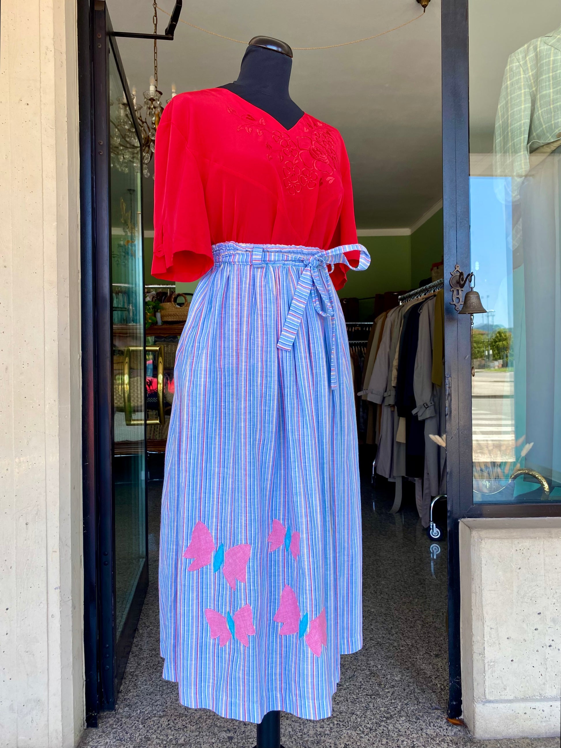 Gonna estiva in cotone leggero a righe arcobaleno, impreziosita da romantiche farfalle applicate a mano. Vita alta con cinturina annodata per valorizzare la silhouette. Fresca, allegra e perfetta per giornate spensierate.