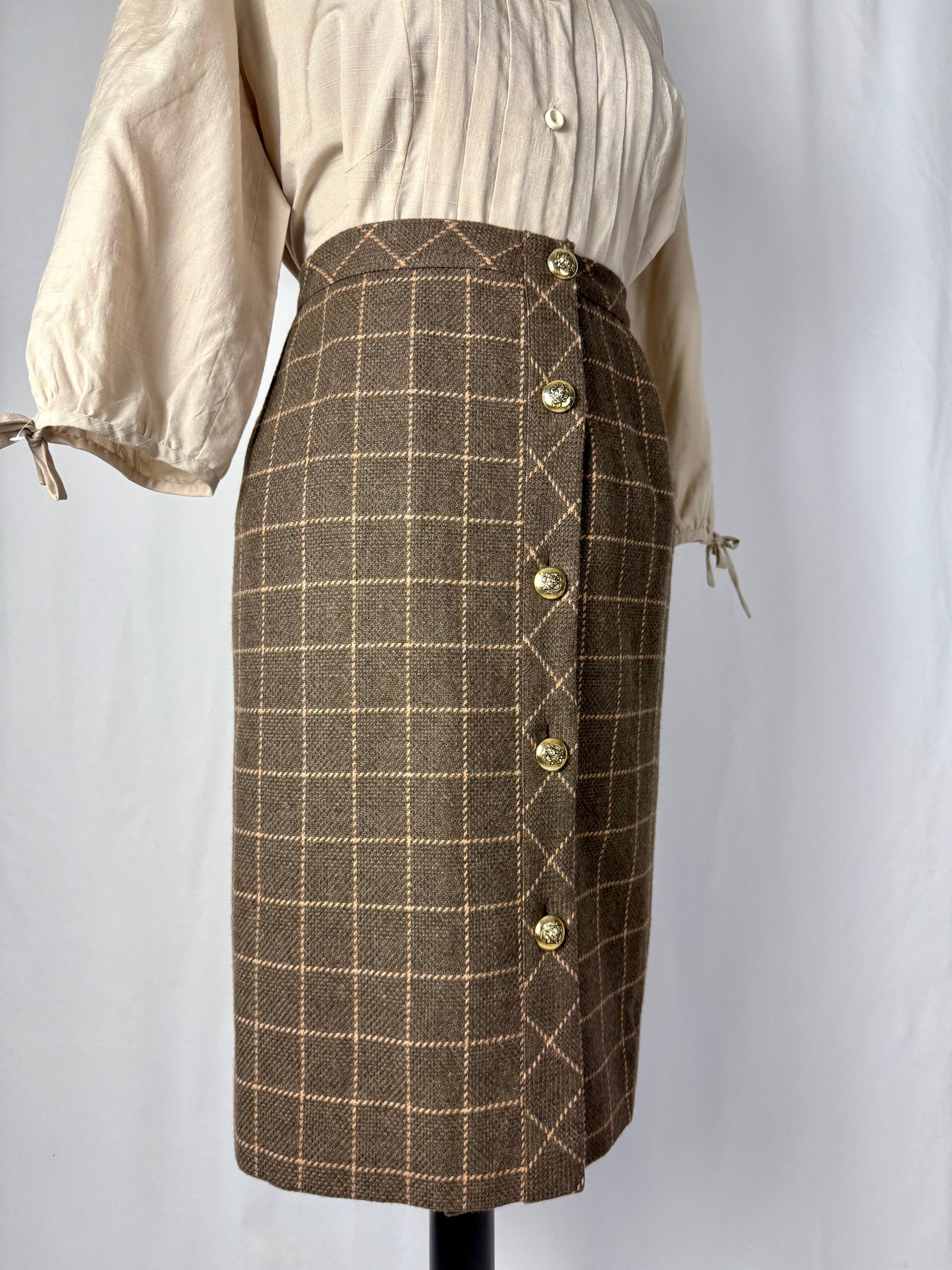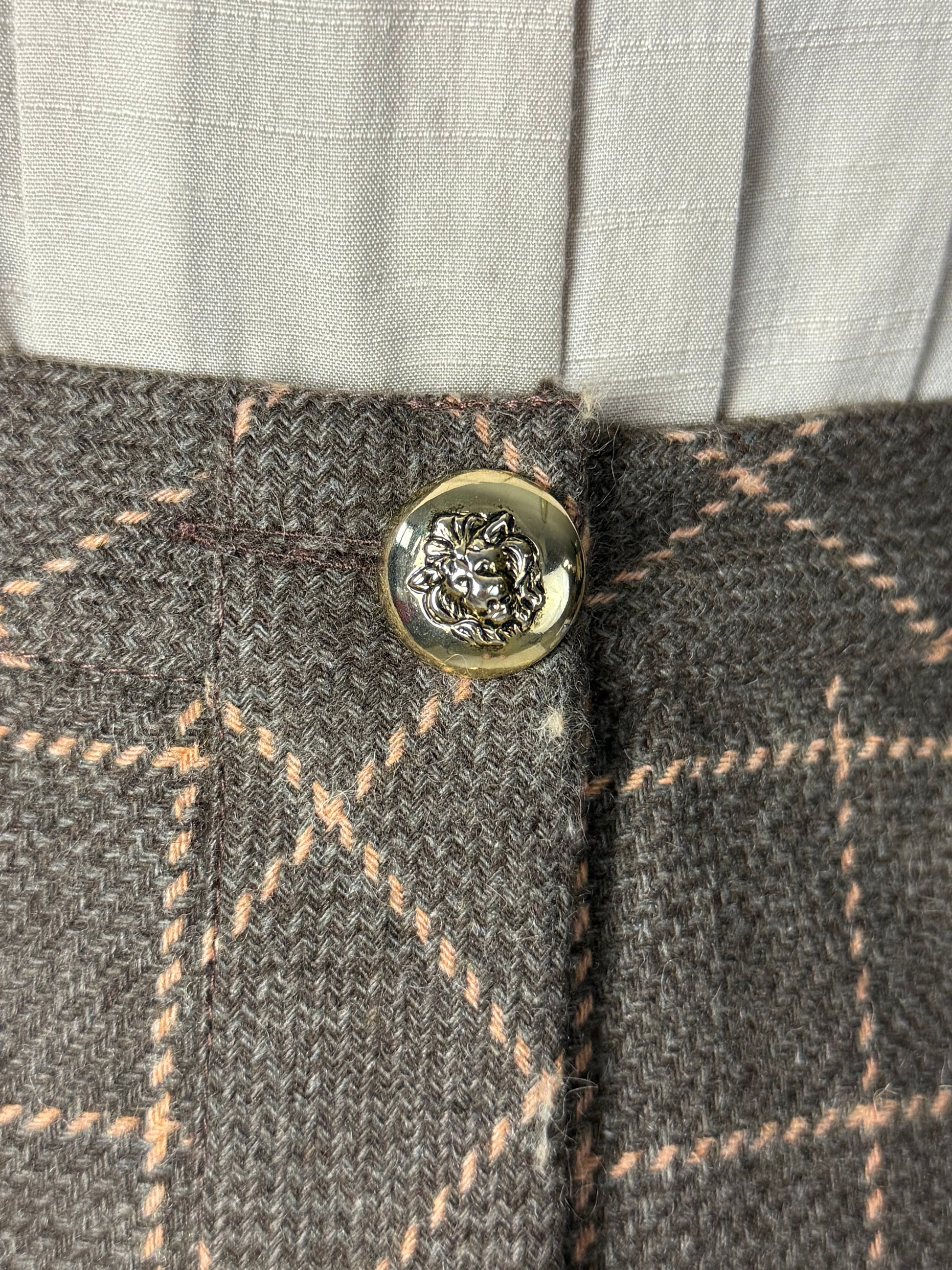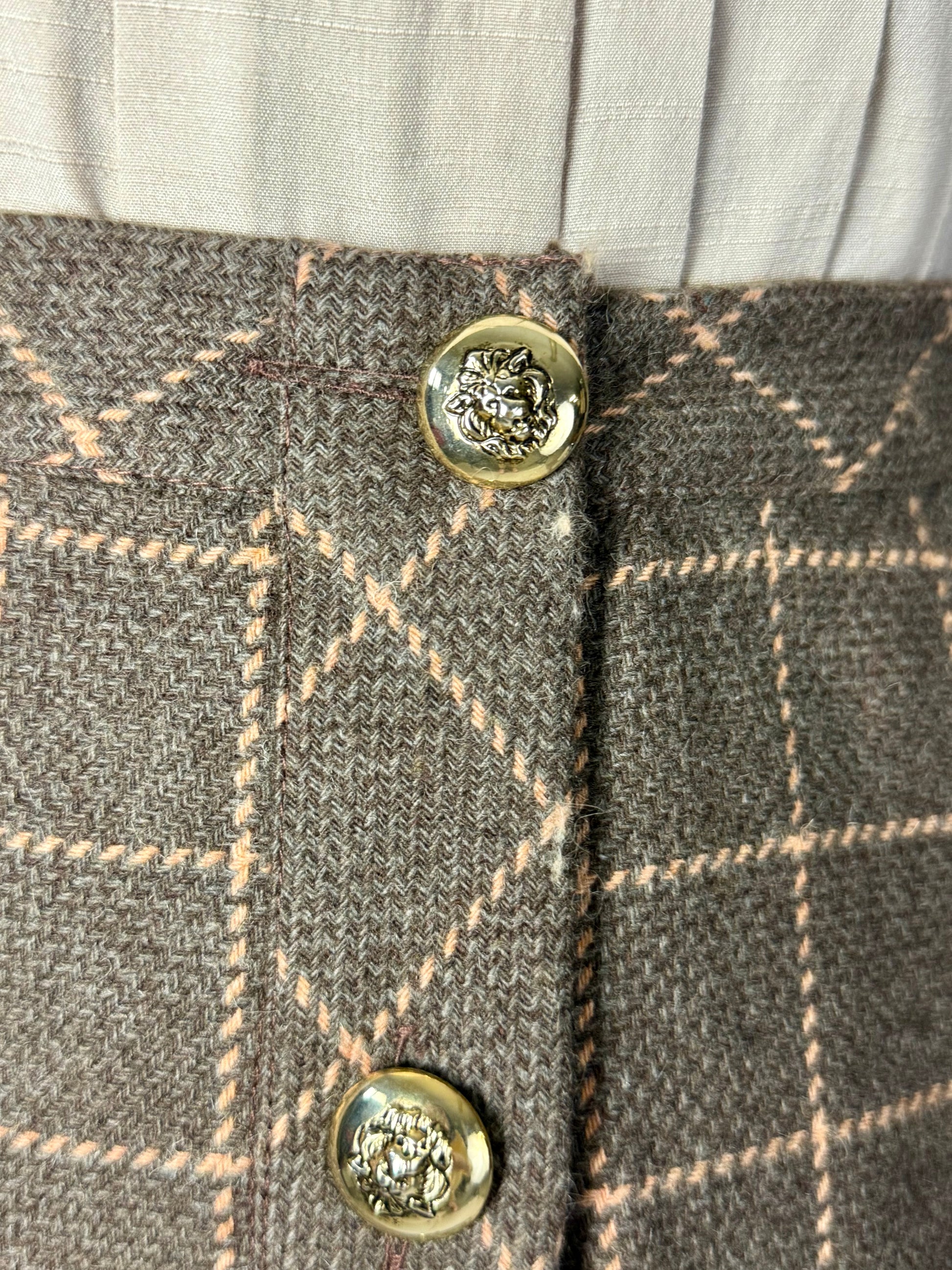 Gonna classica anni ‘80 in lana e cashmere con motivo a quadri nei toni del tortora e del rosa antico. Bottoni dorati decorati da teste di leone, dettaglio prezioso che aggiunge carattere ed eleganza. Un capo raffinato, caldo e senza tempo, perfetto per autunno e inverno.