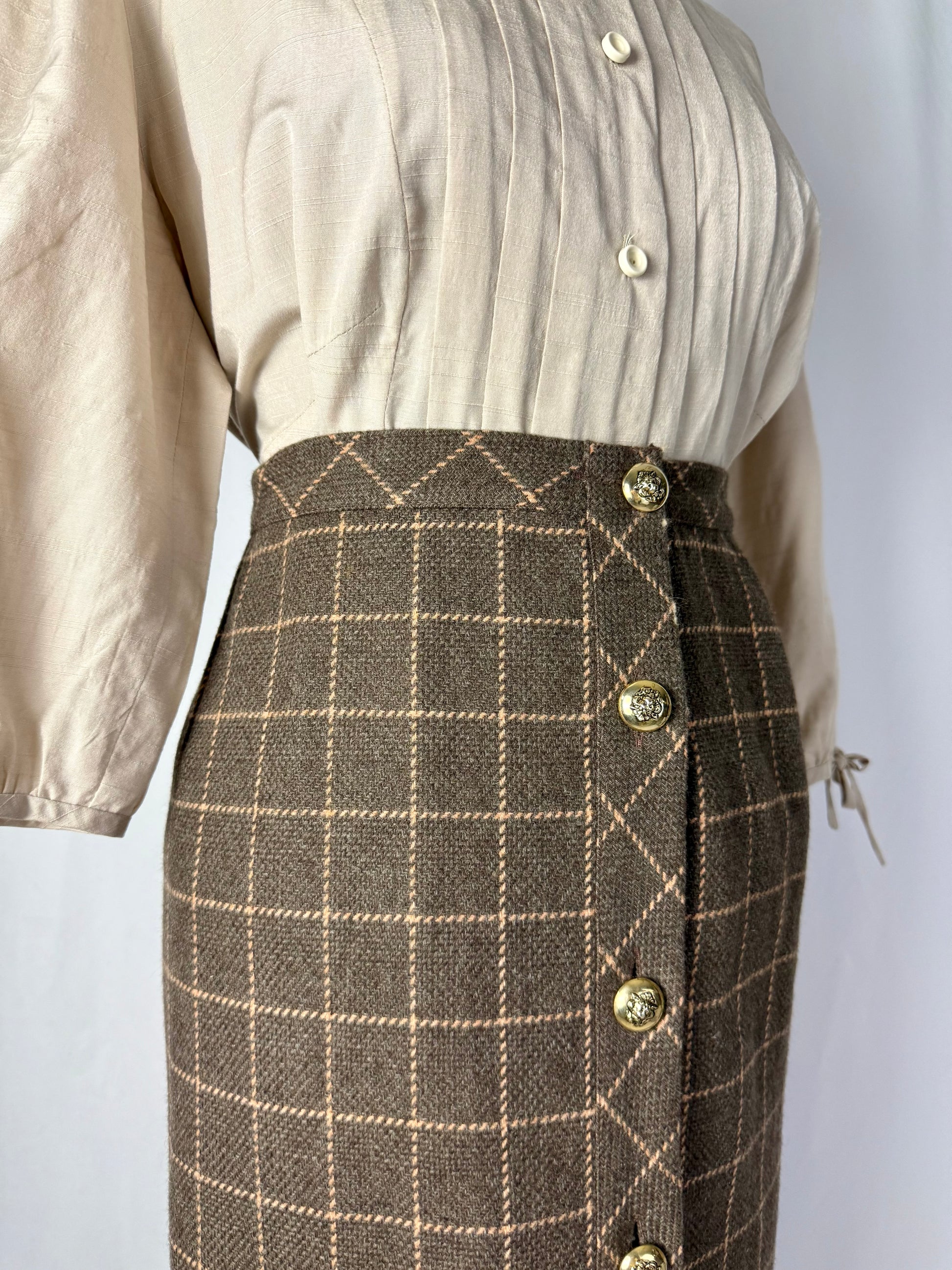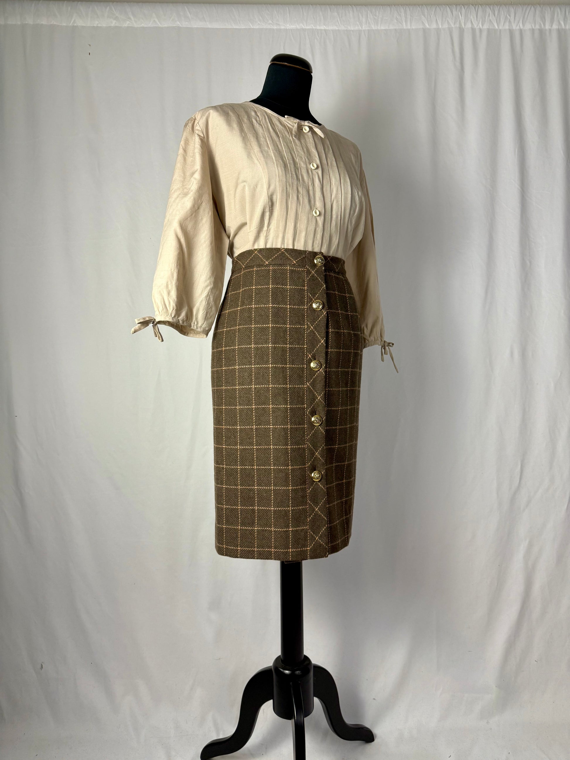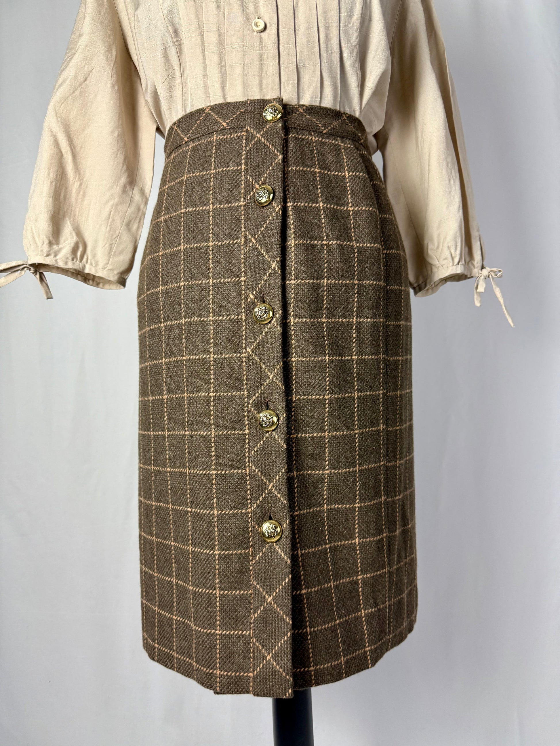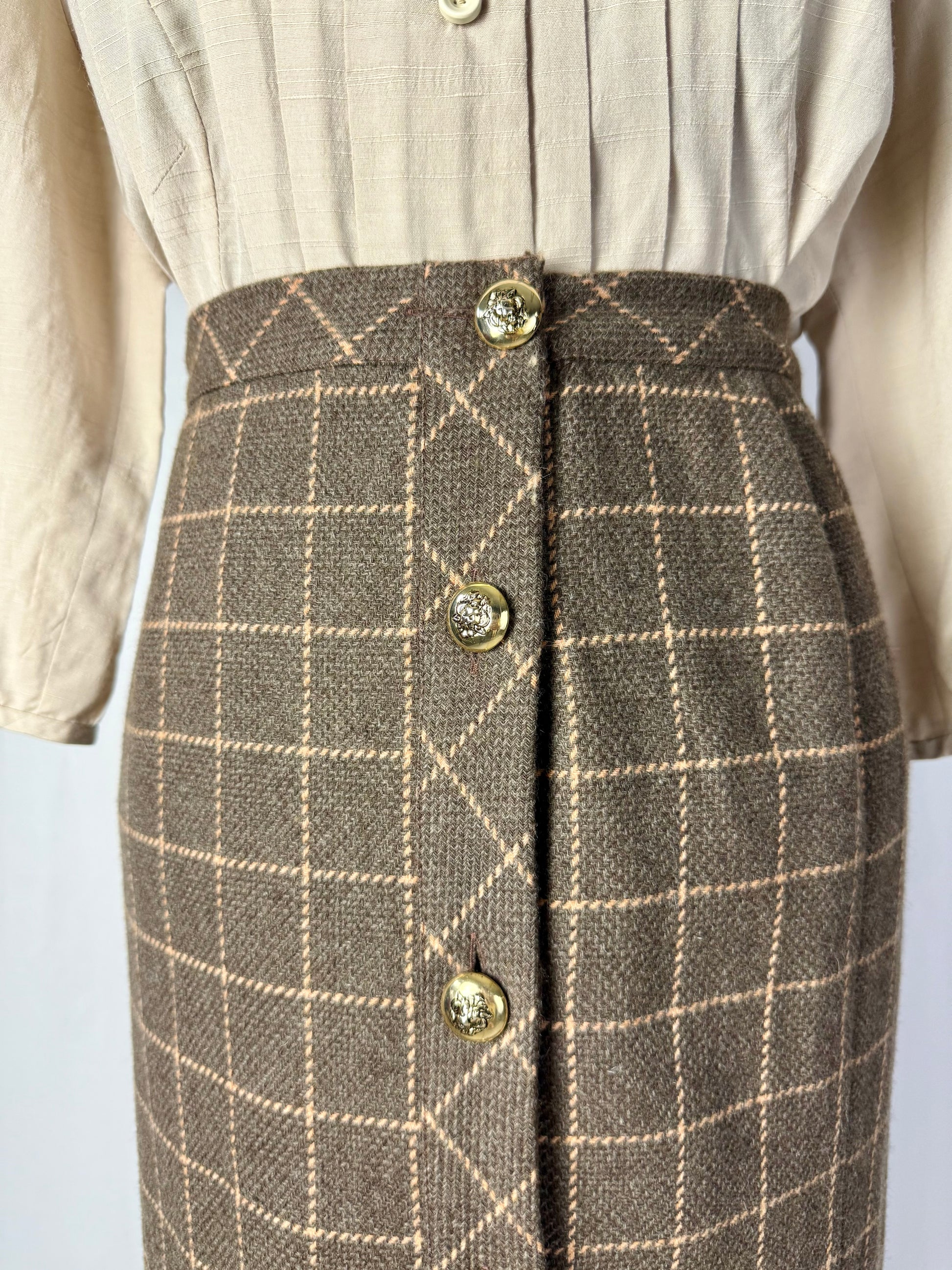 Gonna classica anni ‘80 in lana e cashmere con motivo a quadri nei toni del tortora e del rosa antico. Bottoni dorati decorati da teste di leone, dettaglio prezioso che aggiunge carattere ed eleganza. Un capo raffinato, caldo e senza tempo, perfetto per autunno e inverno.