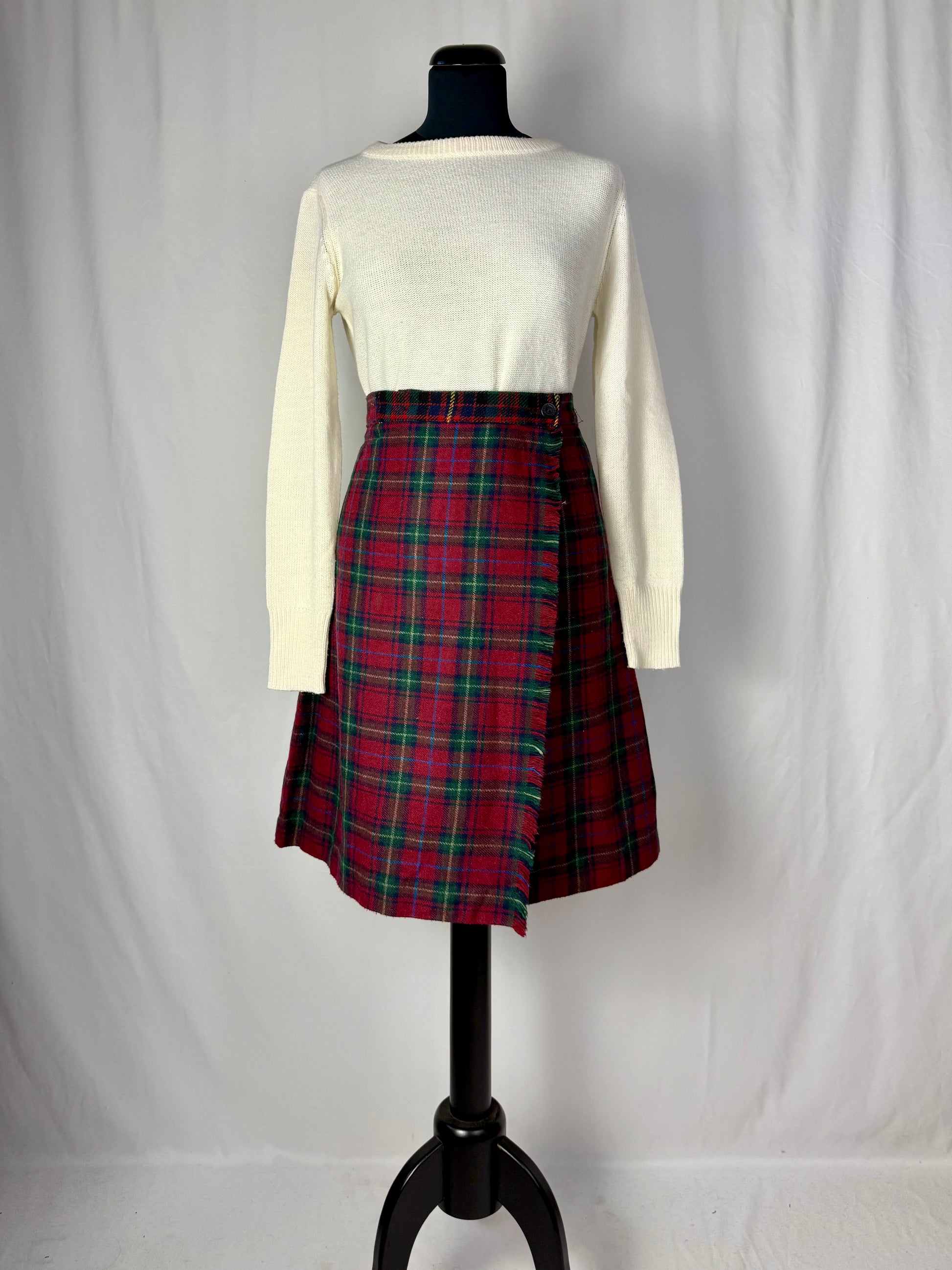 Gonna vintage anni ’70/‘80 in morbida lana a fantasia tartan rosso scuro. verde e blu. Modello a portafoglio con frange laterali e pieghe sul retro. Calda, elegante e perfetta per l’inverno.