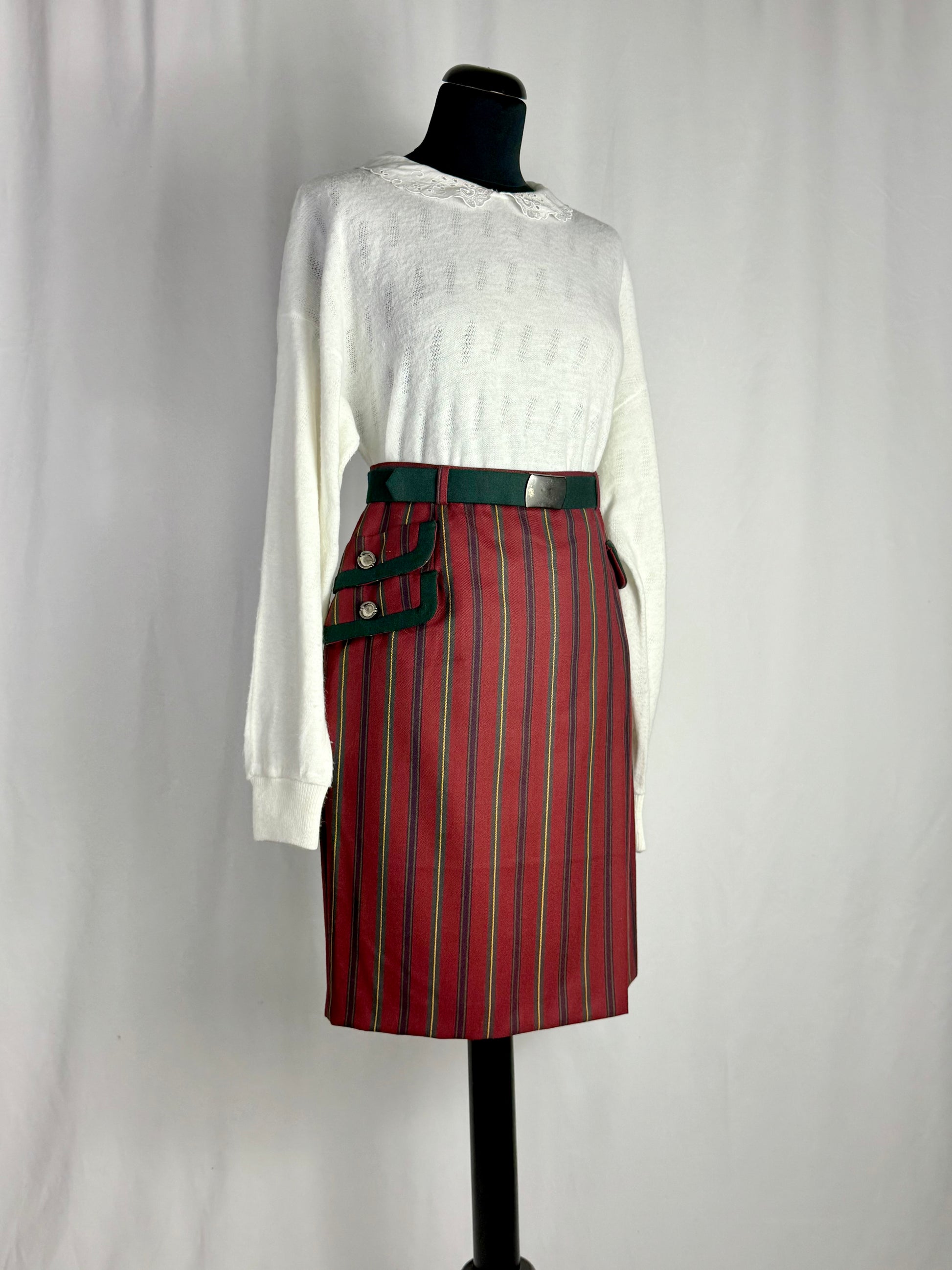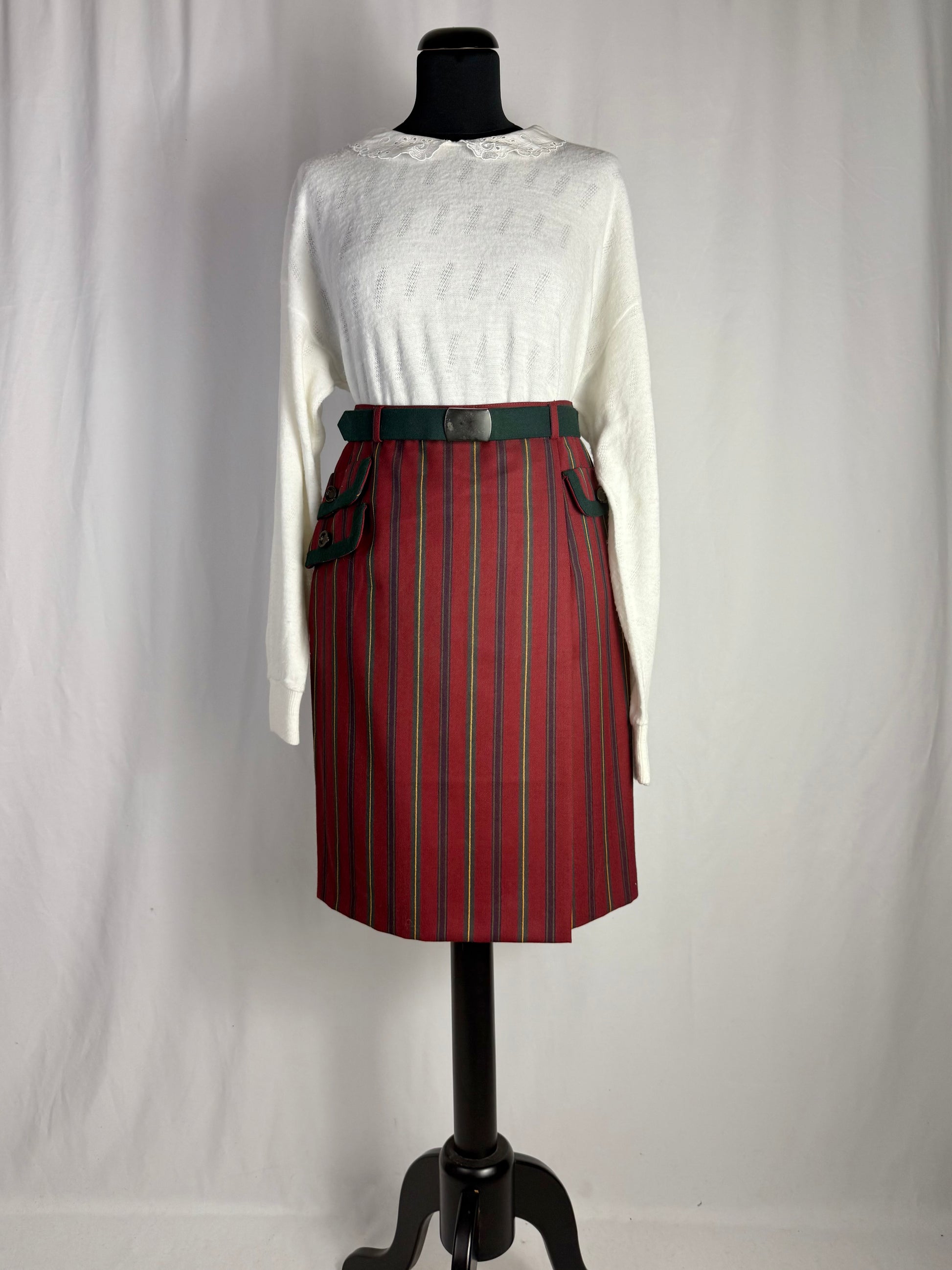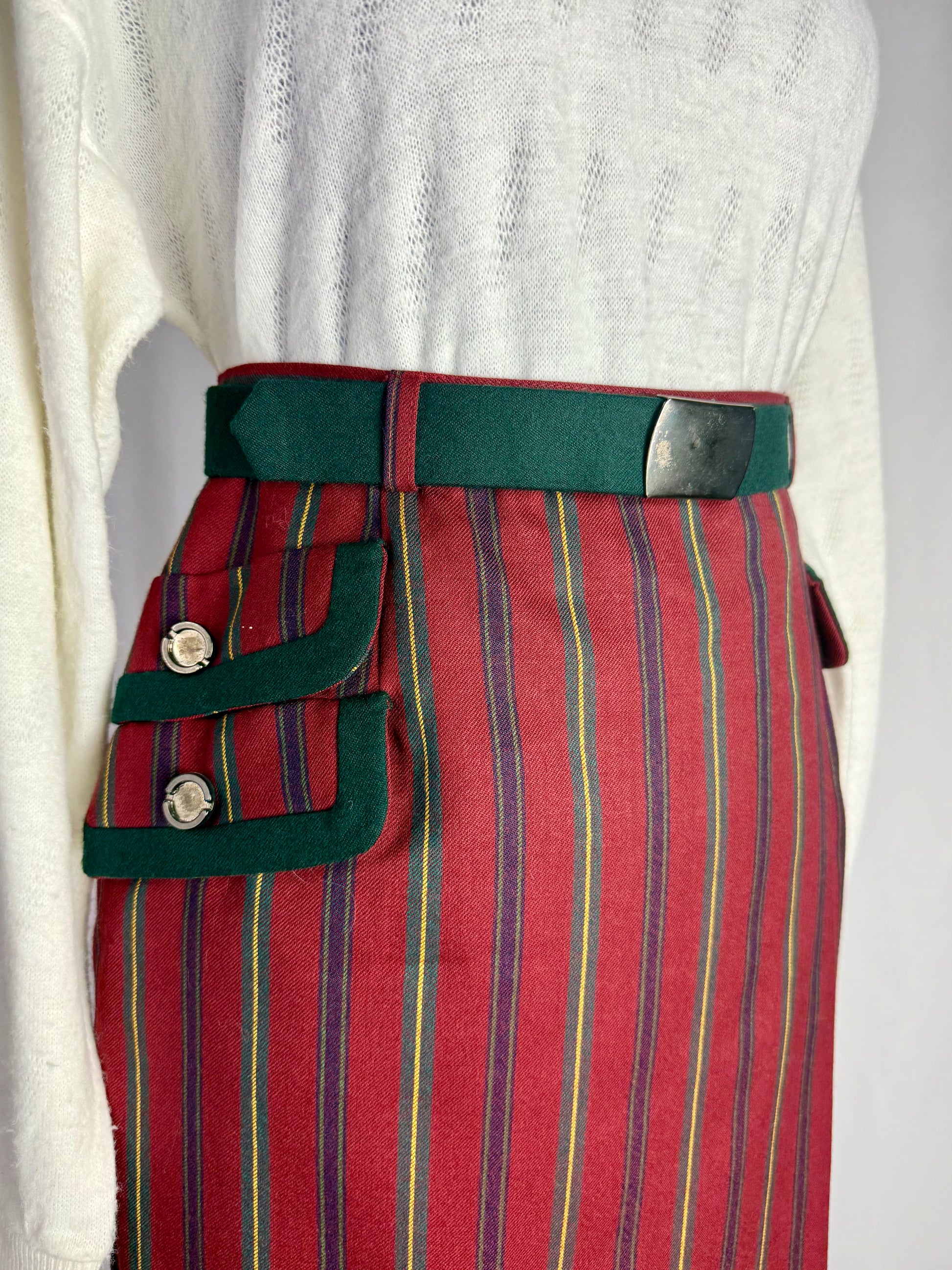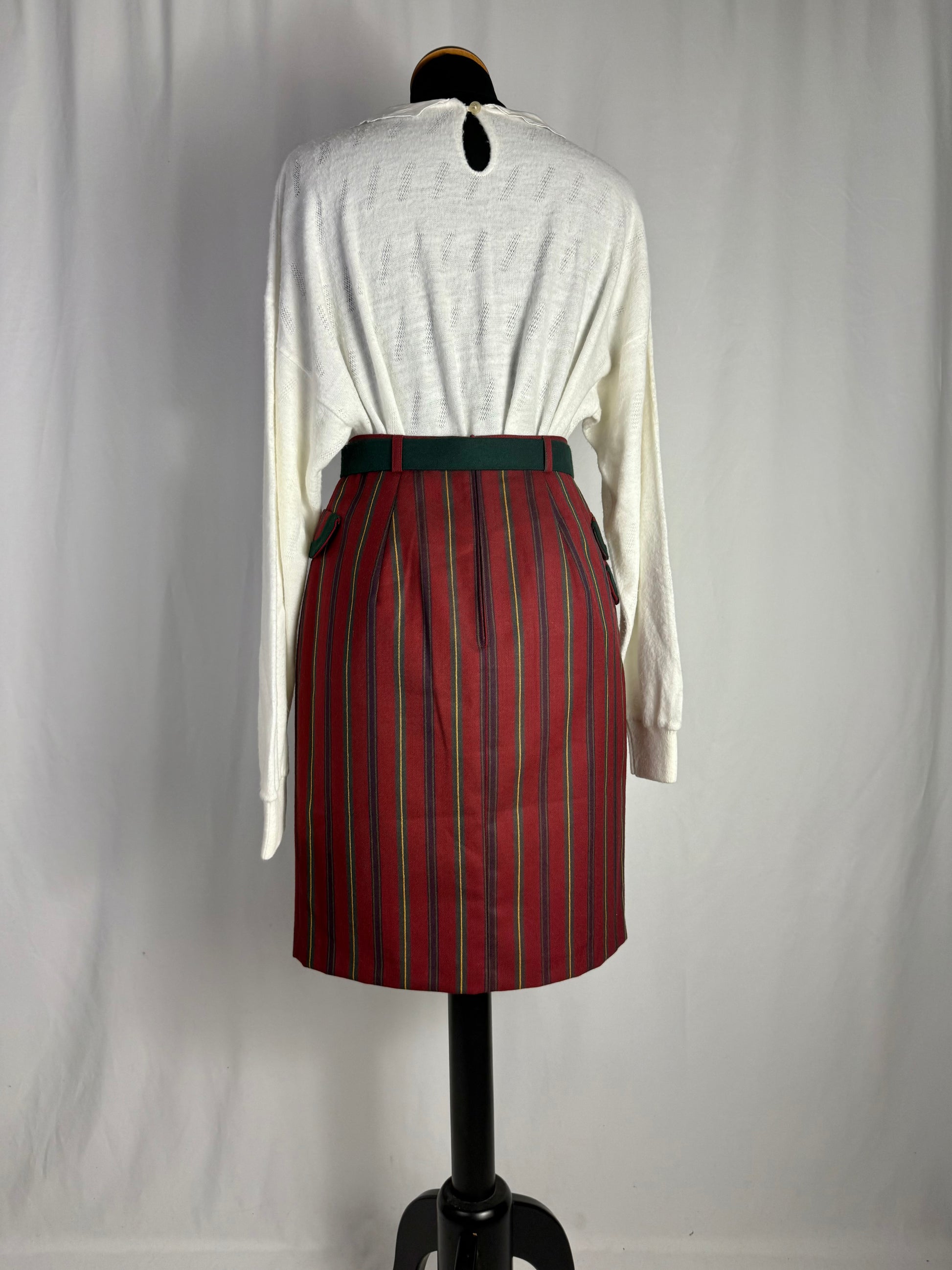 Gonna anni ‘80 a tubino in lana corposa con pattern gessato multicolore su base rosso intenso, caratterizzata da vita alta con cintura integrata in contrasto verde e chiusura con fibbia metallica, impreziosita da doppio dettaglio laterale con alamari e bottoni argentati.