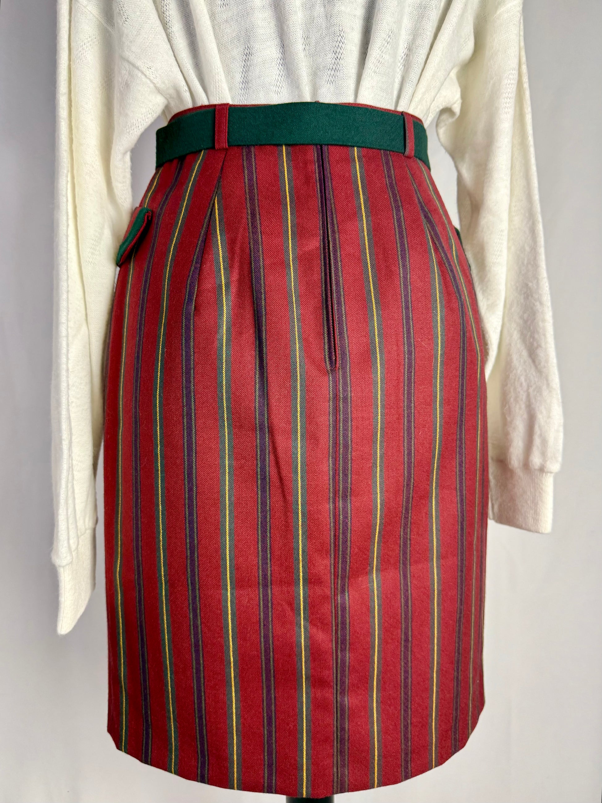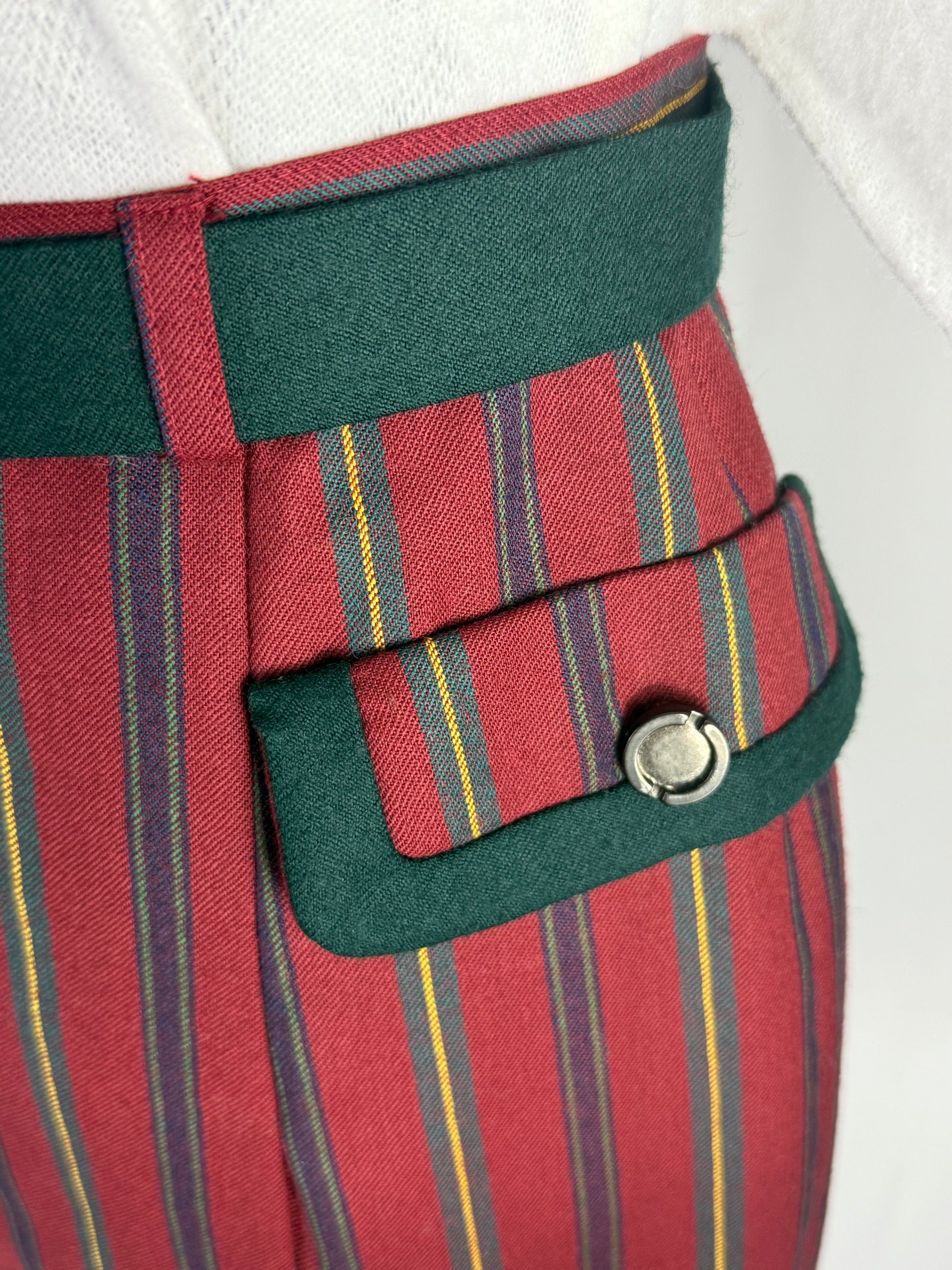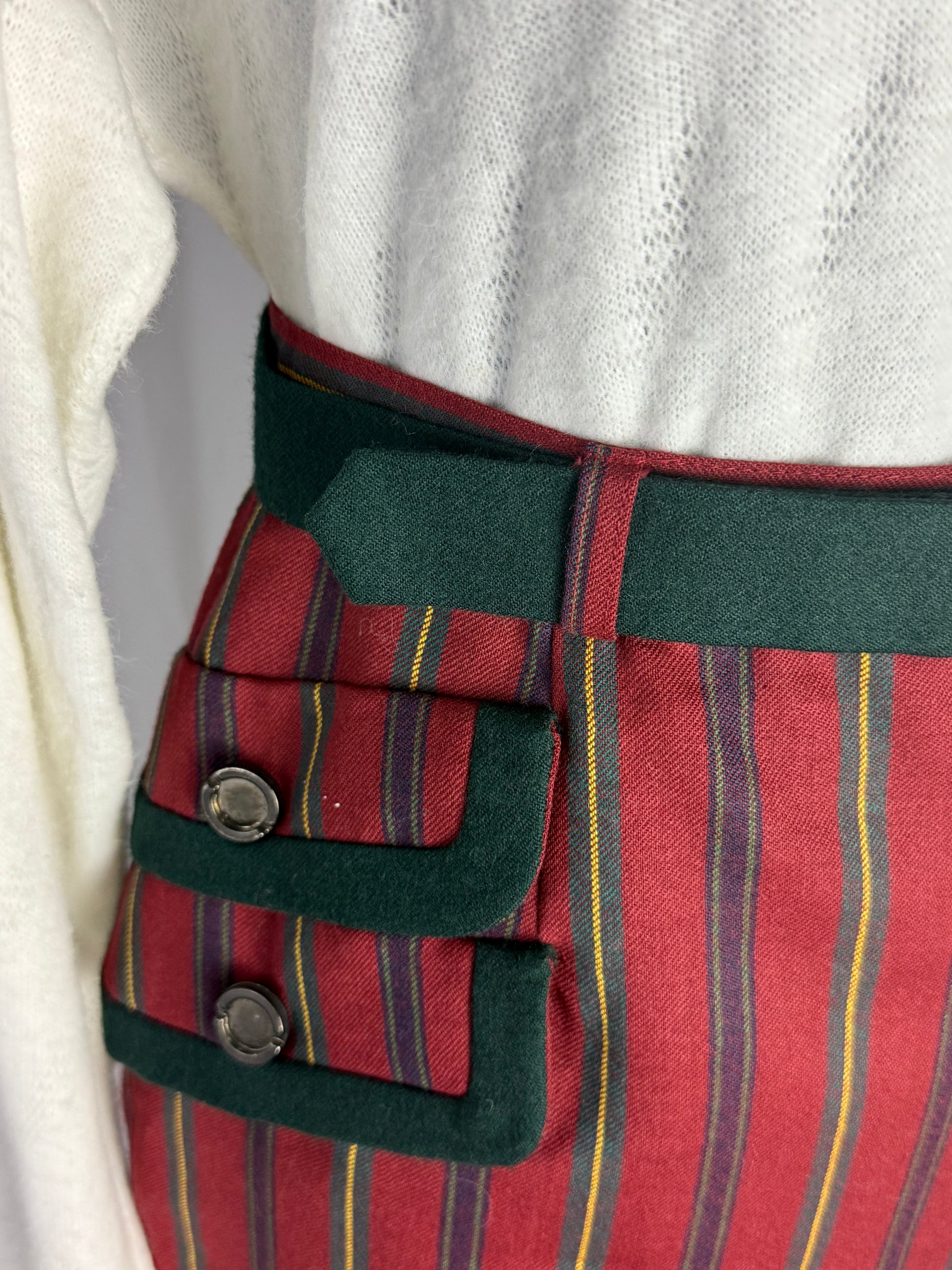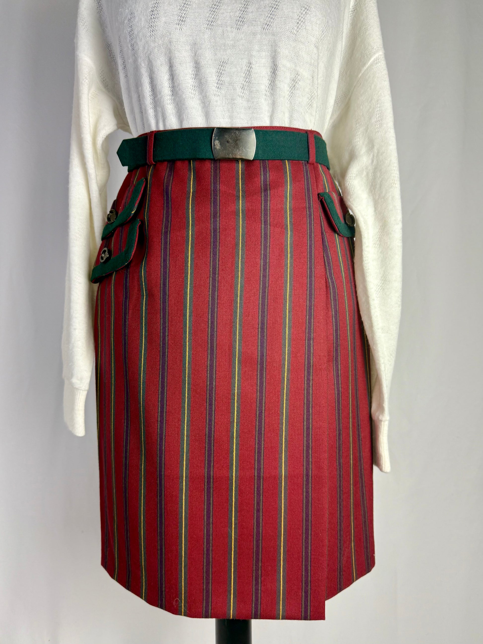 Gonna anni ‘80 a tubino in lana corposa con pattern gessato multicolore su base rosso intenso, caratterizzata da vita alta con cintura integrata in contrasto verde e chiusura con fibbia metallica, impreziosita da doppio dettaglio laterale con alamari e bottoni argentati.