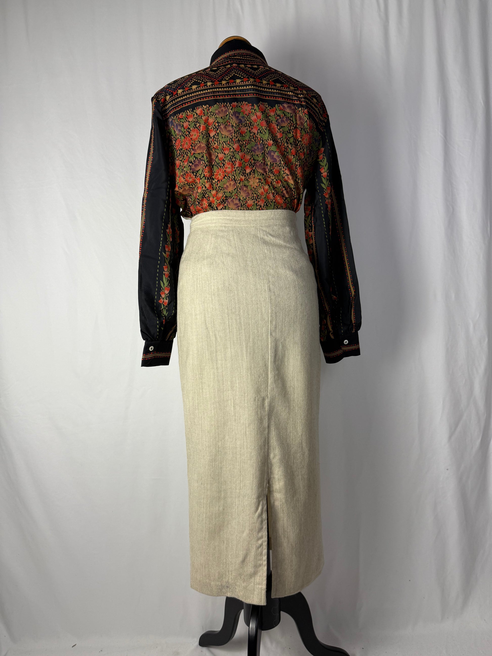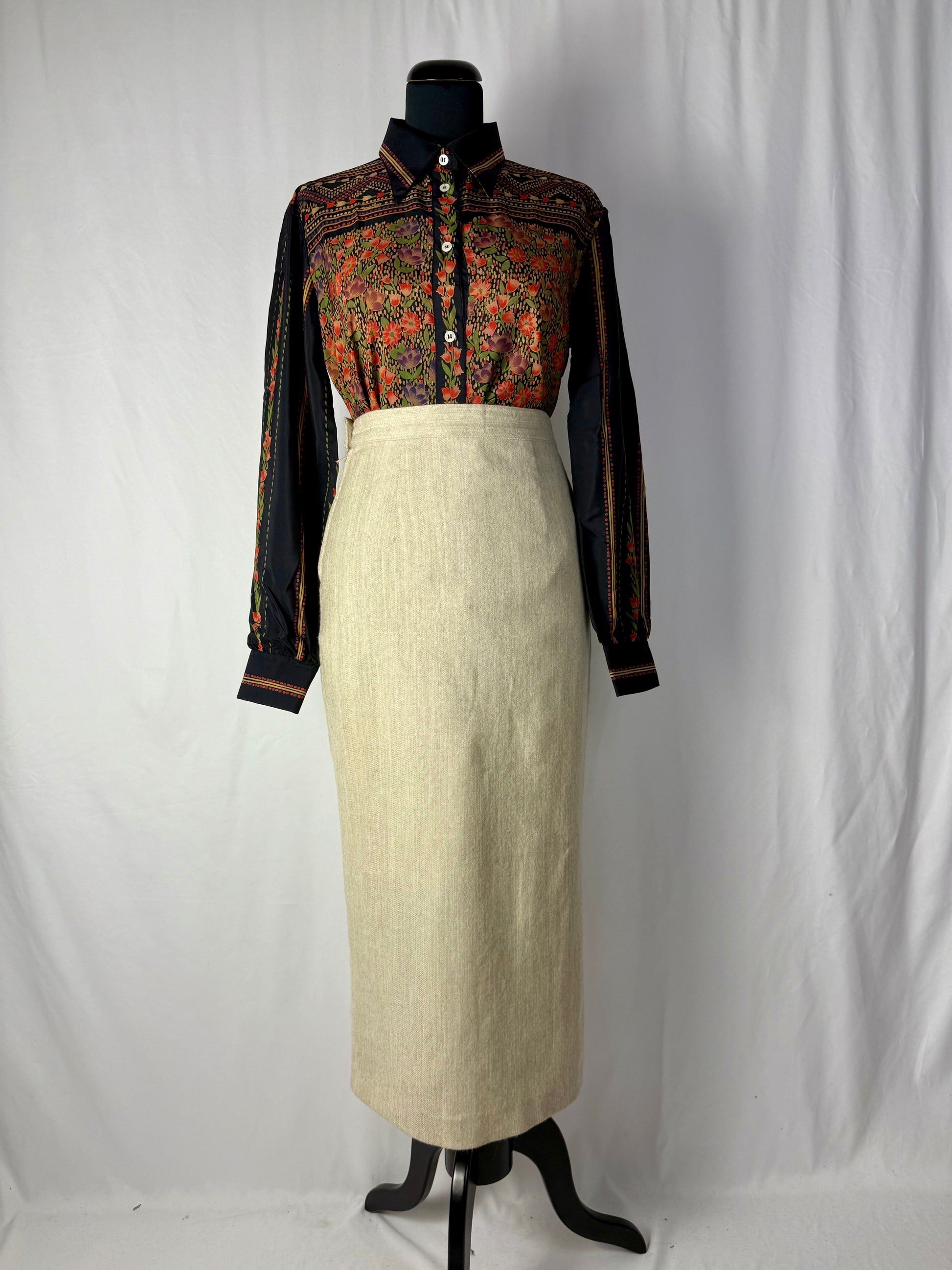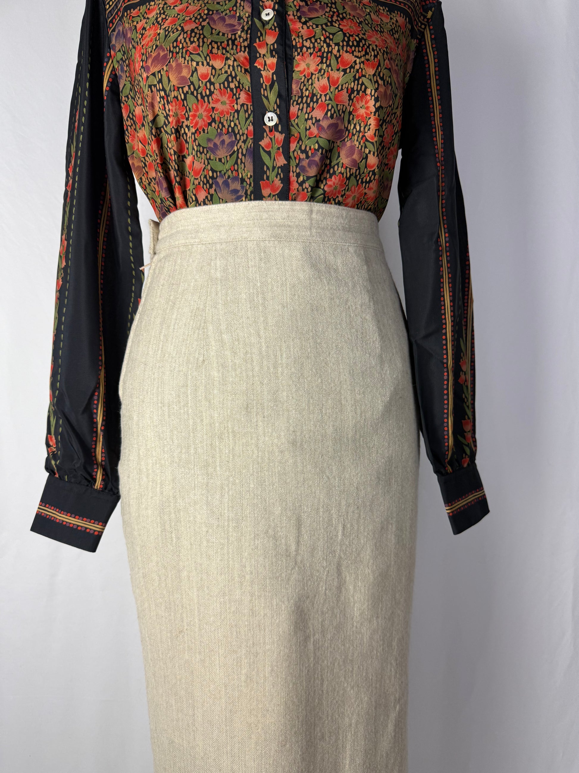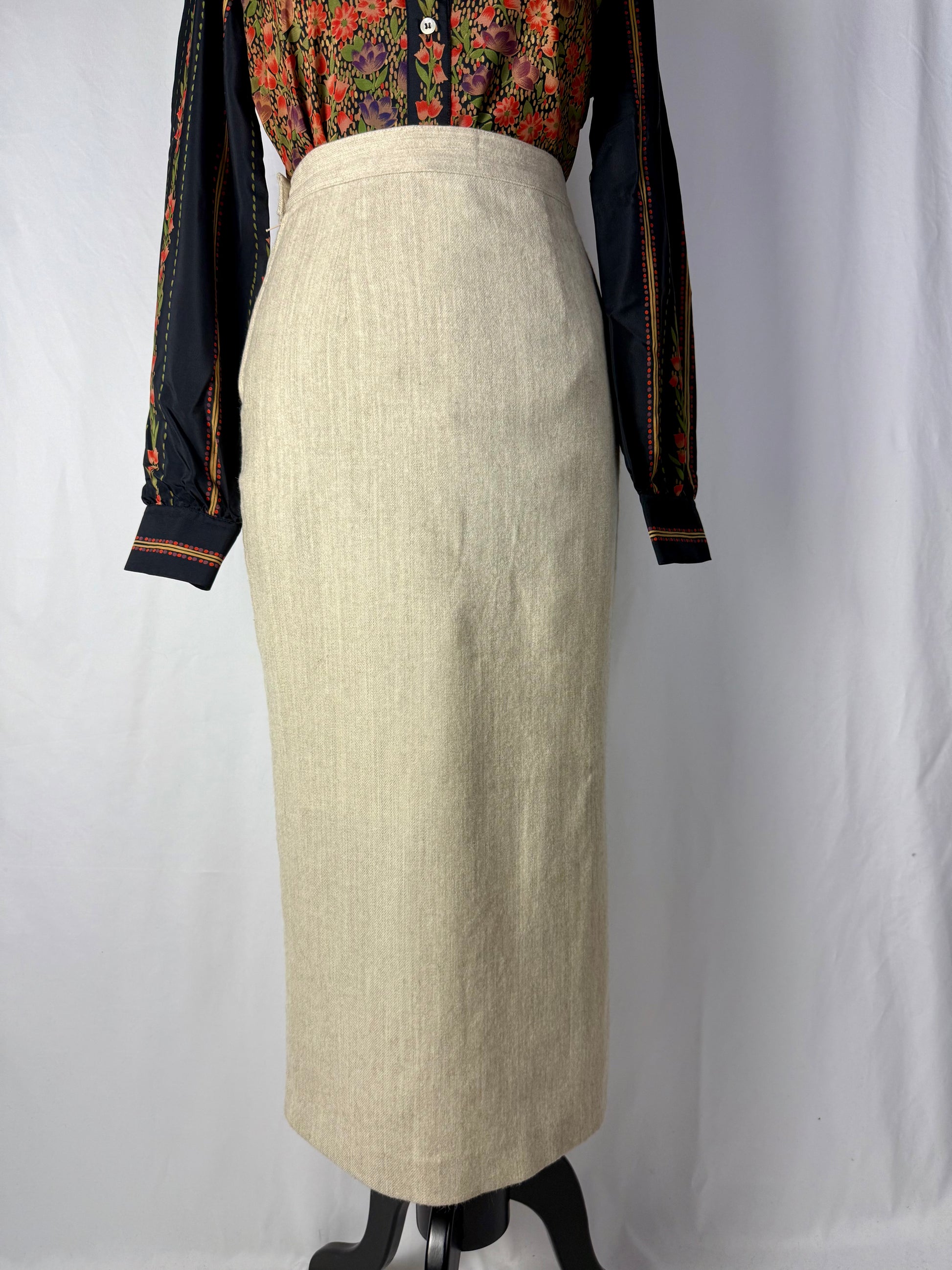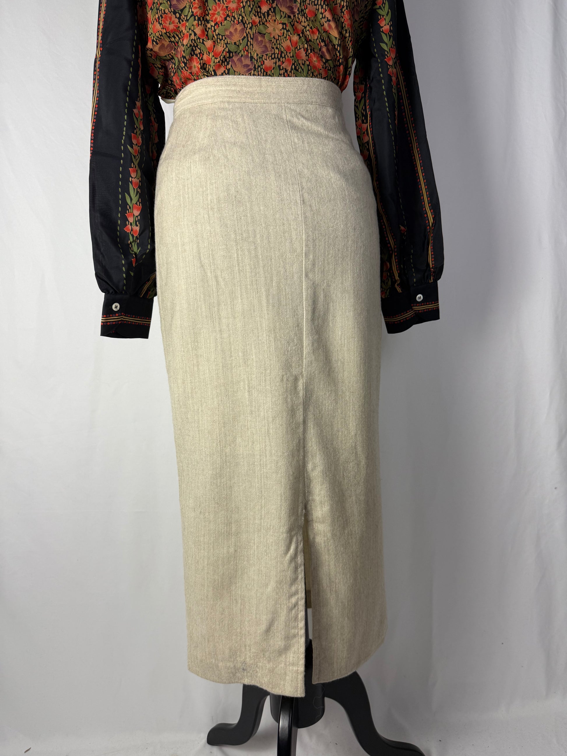 Gonna longuette classica ed elegante, in lana color beige, foderata. Chiusura laterale con zip e bottoncini, spacco sul retro.