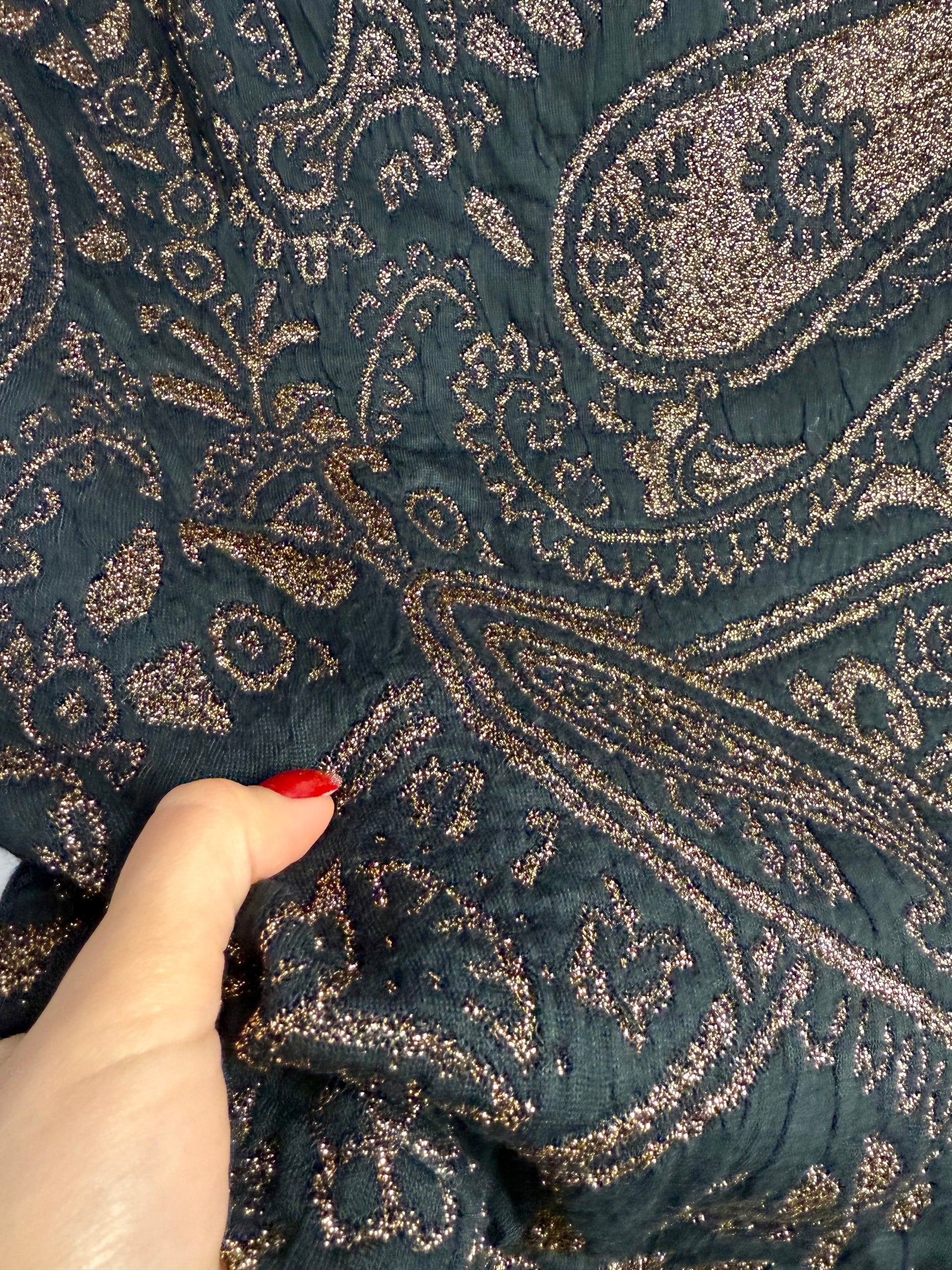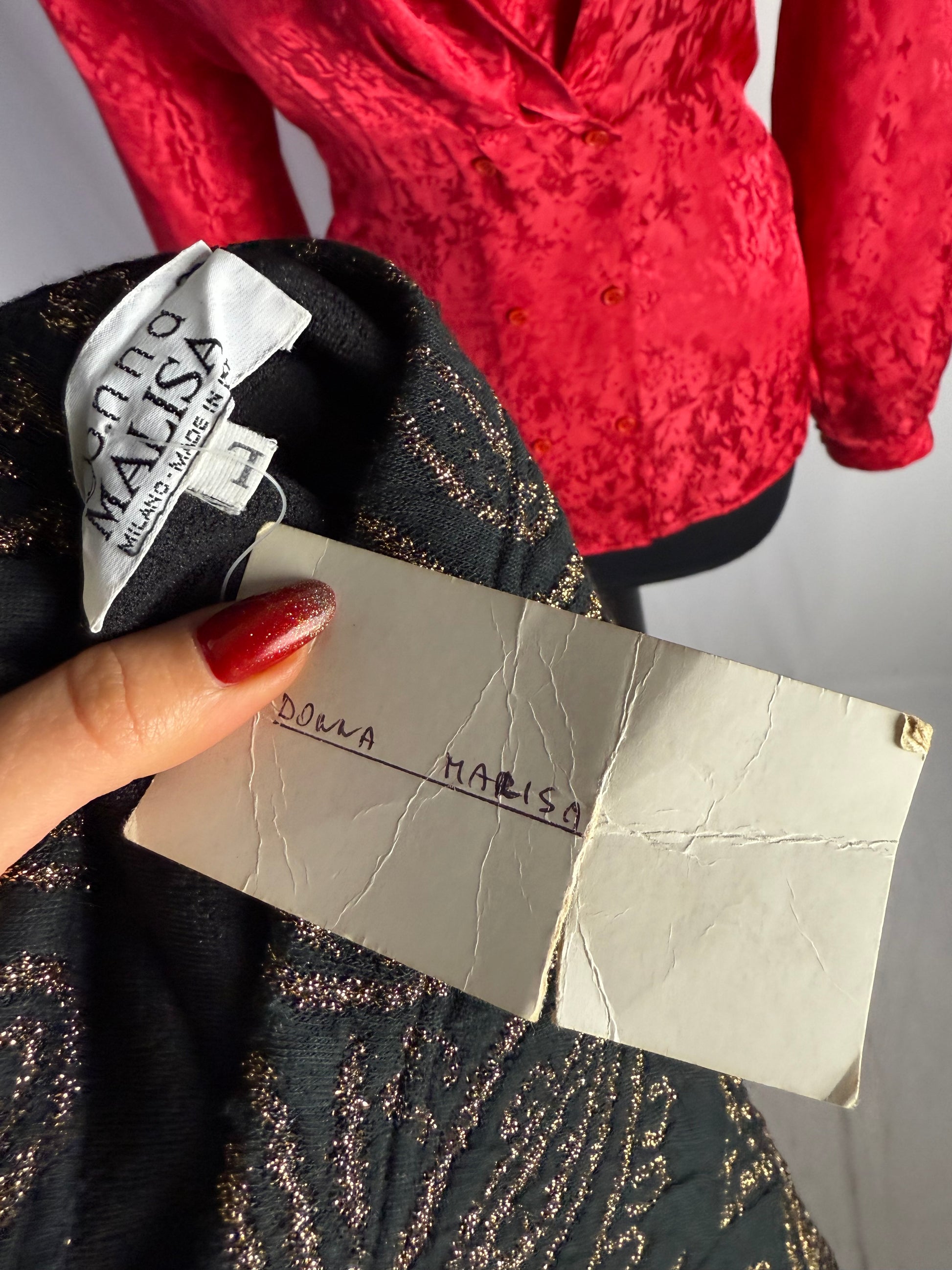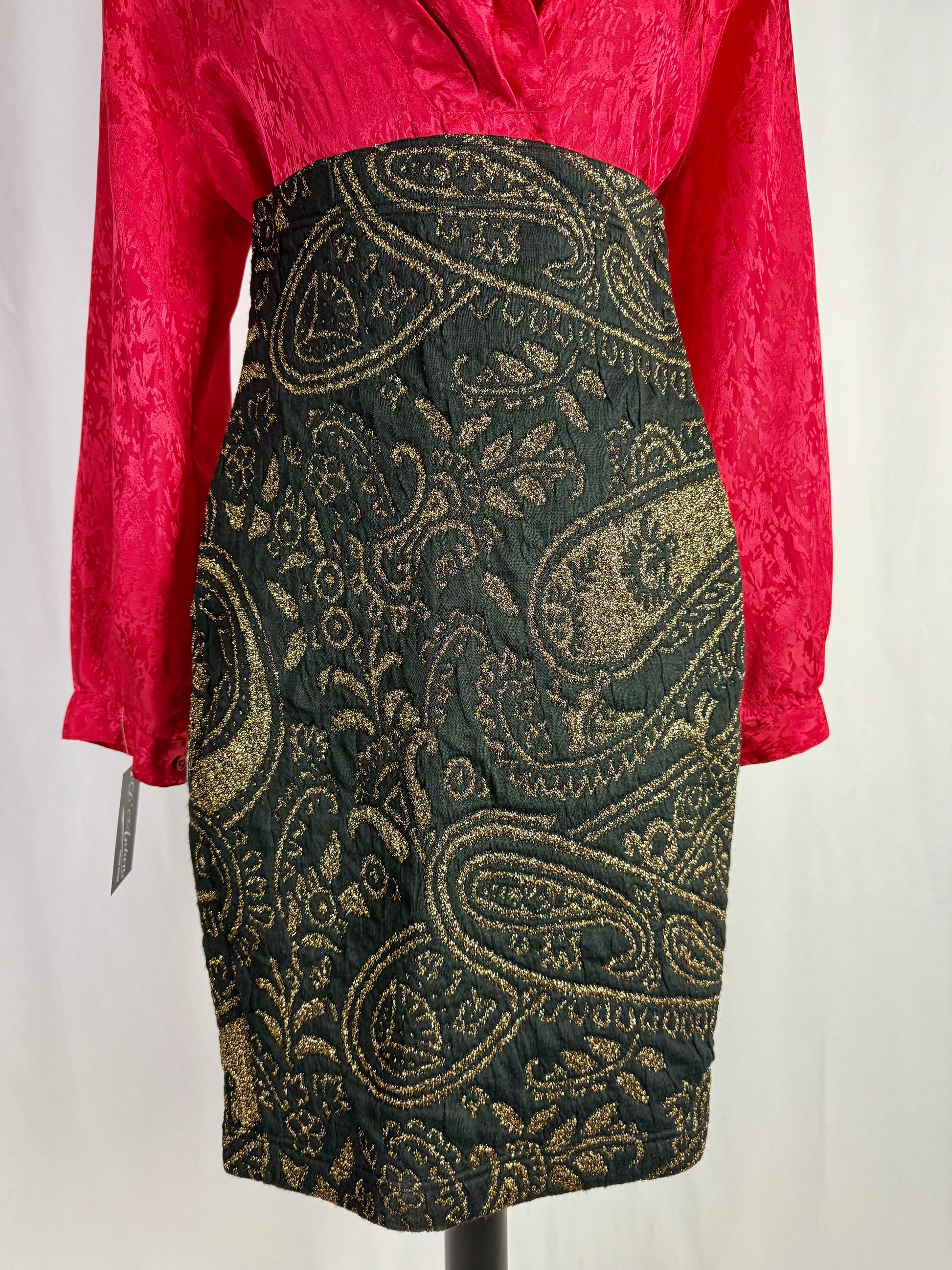 Gonna anni ‘80 nuova fondo di magazzino, realizzata in tessuto jacquard nero con ricco motivo paisley dorato in filato metallico, dona profondità e luce al capo, evocando suggestioni barocche e un’eleganza da sera senza tempo. La linea è pulita e strutturata, pensata per valorizzare il punto vita e accompagnare il movimento con classe.