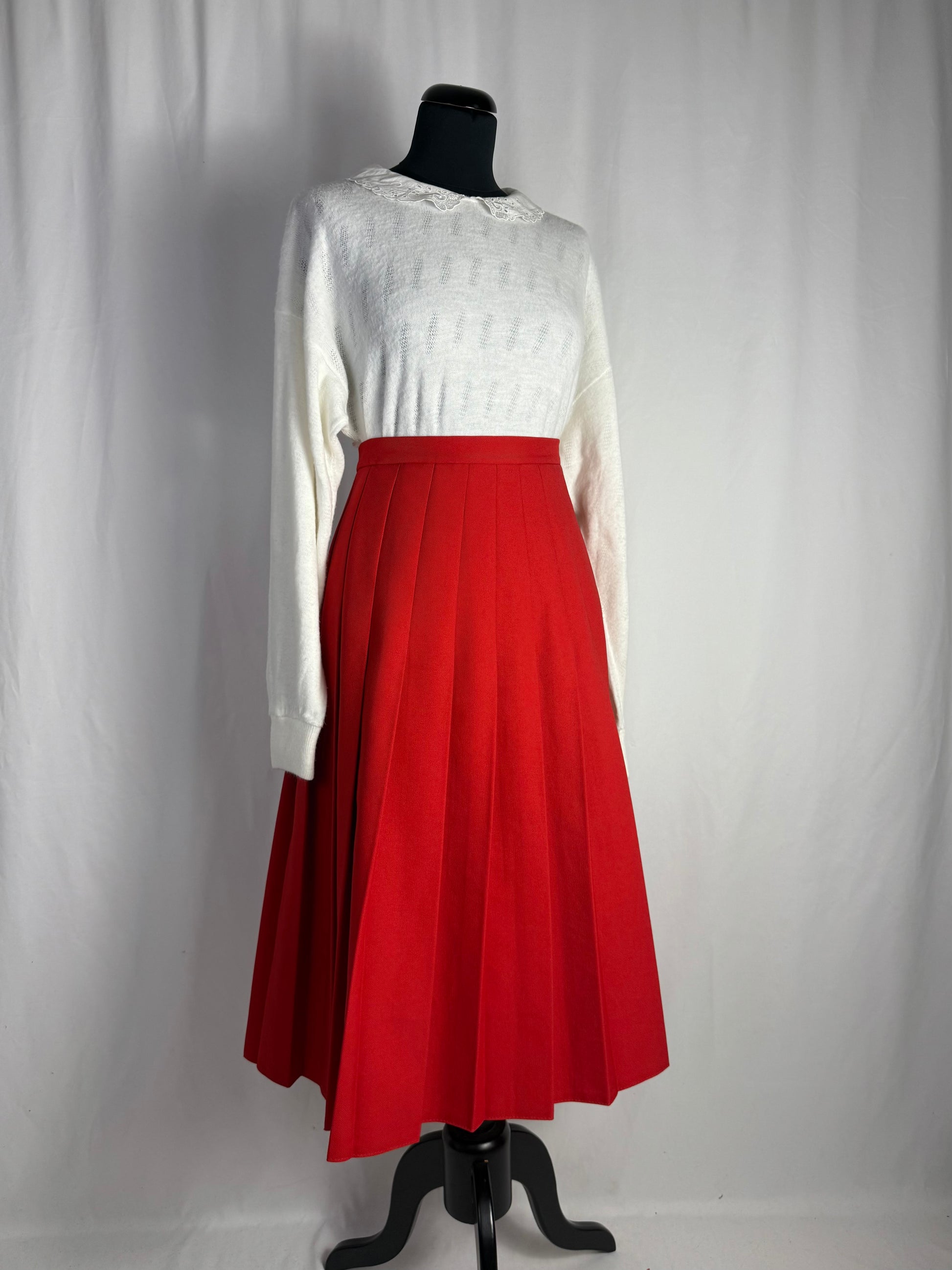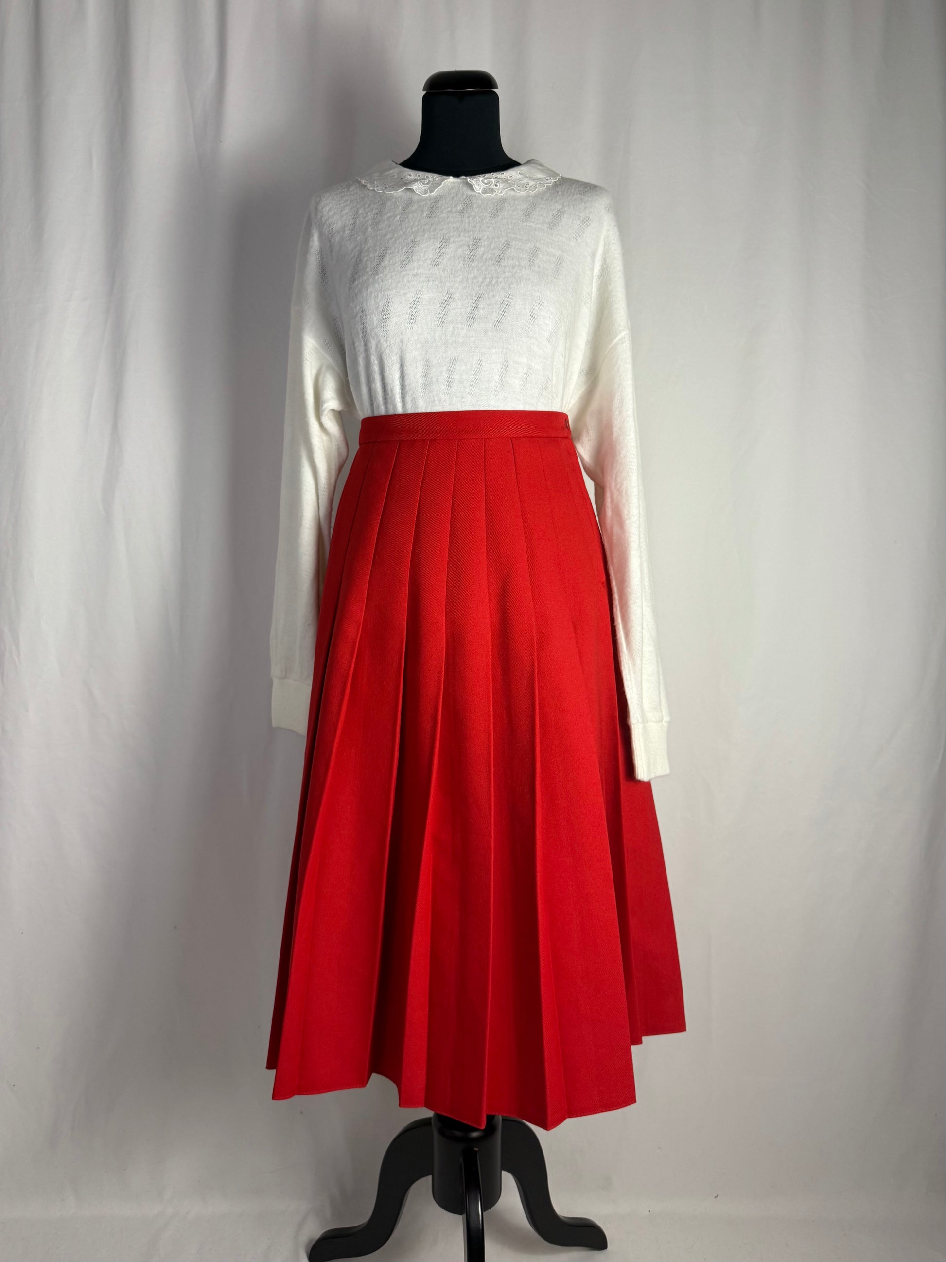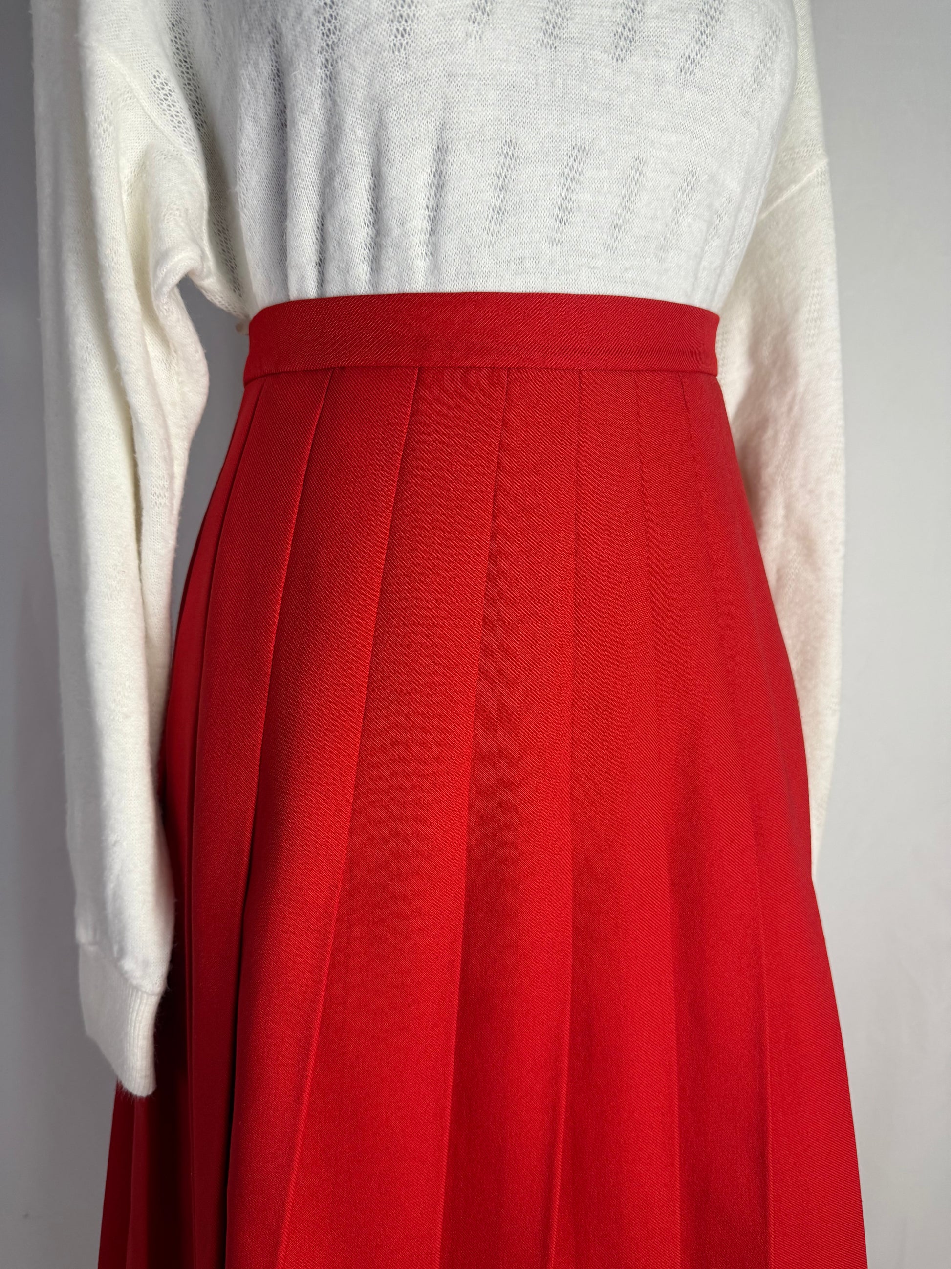 Gonna anni ‘70 a vita alta e Plissettata, realizzata in tessuto strutturato di medio peso che garantisce una caduta fluida ma sostenuta, ideale per la stagione autunno-inverno e per outfit da giorno o sera dal gusto rétro. La linea è svasata con pieghe piatte distribuite su tutta la superficie, che valorizzano il punto vita e slanciano la figura. Il colore rosso pieno e intenso dona carattere al capo, rendendolo perfetto sia in abbinamento a maglieria chiara che a capi più scuri.