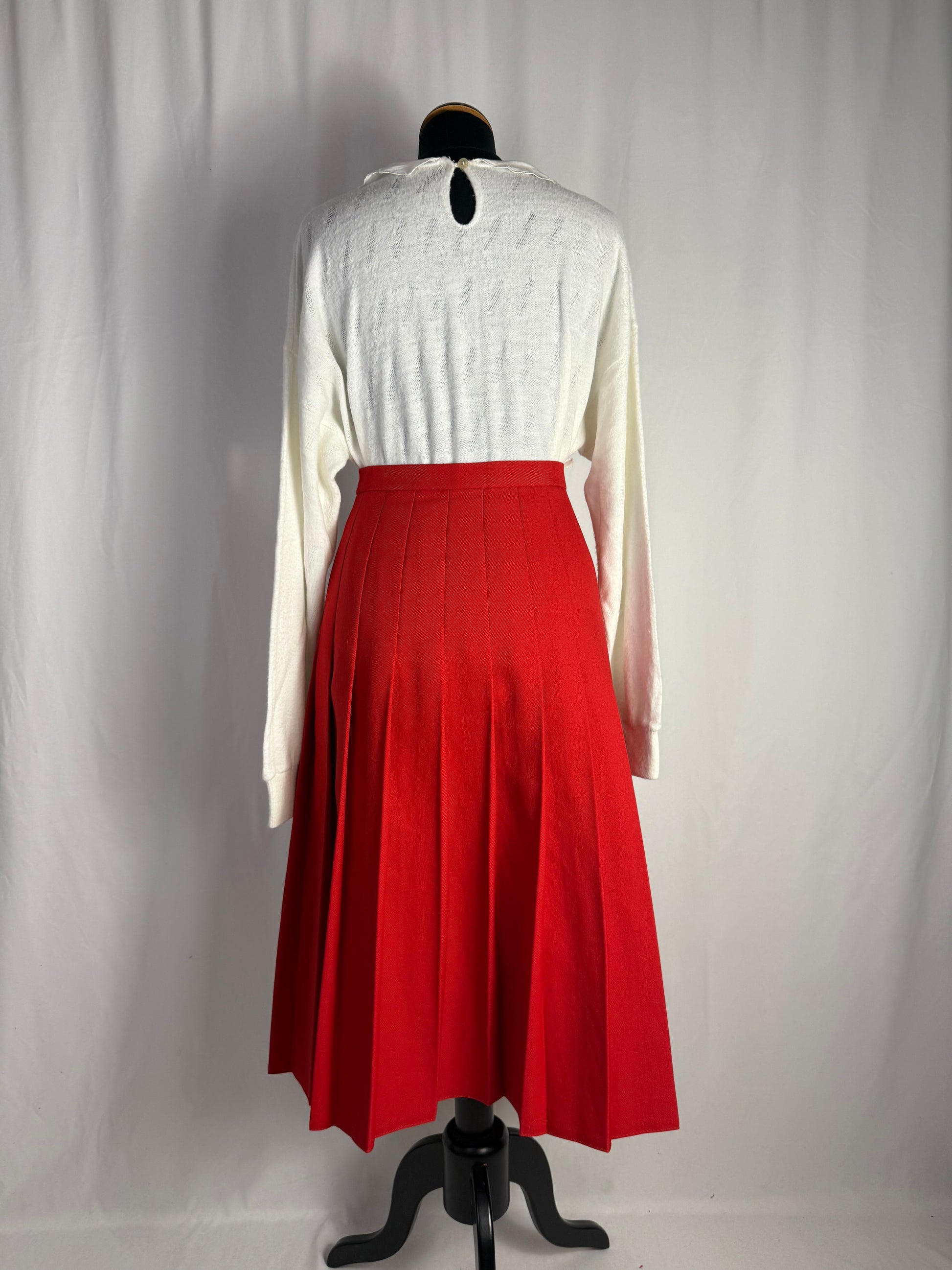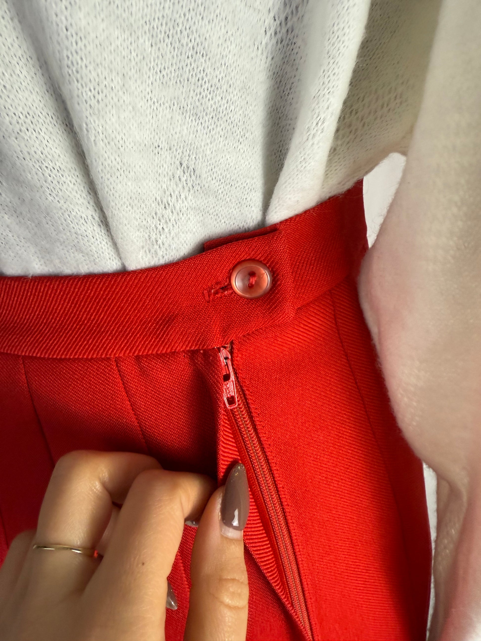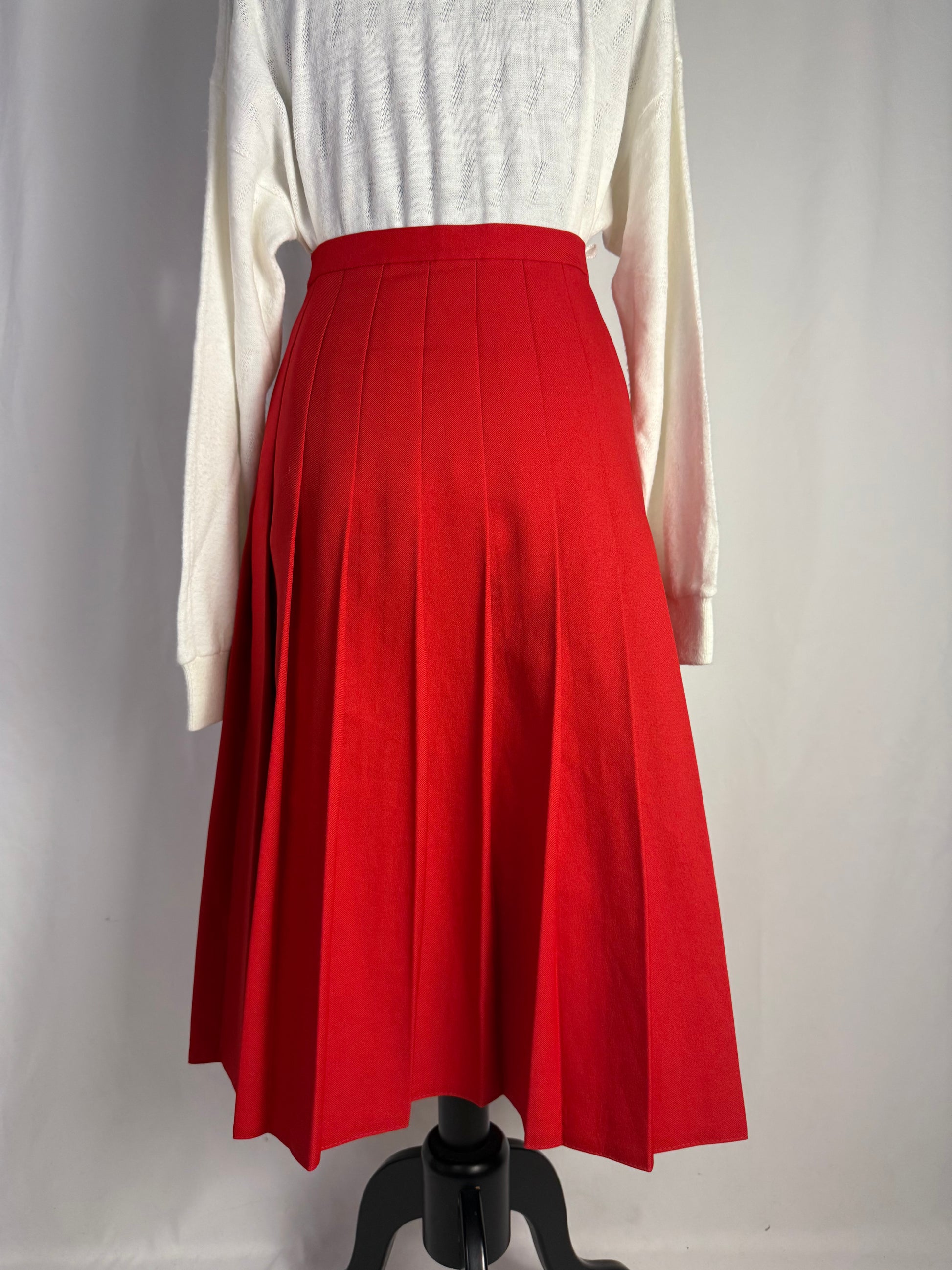 Gonna anni ‘70 a vita alta e Plissettata, realizzata in tessuto strutturato di medio peso che garantisce una caduta fluida ma sostenuta, ideale per la stagione autunno-inverno e per outfit da giorno o sera dal gusto rétro. La linea è svasata con pieghe piatte distribuite su tutta la superficie, che valorizzano il punto vita e slanciano la figura. Il colore rosso pieno e intenso dona carattere al capo, rendendolo perfetto sia in abbinamento a maglieria chiara che a capi più scuri.