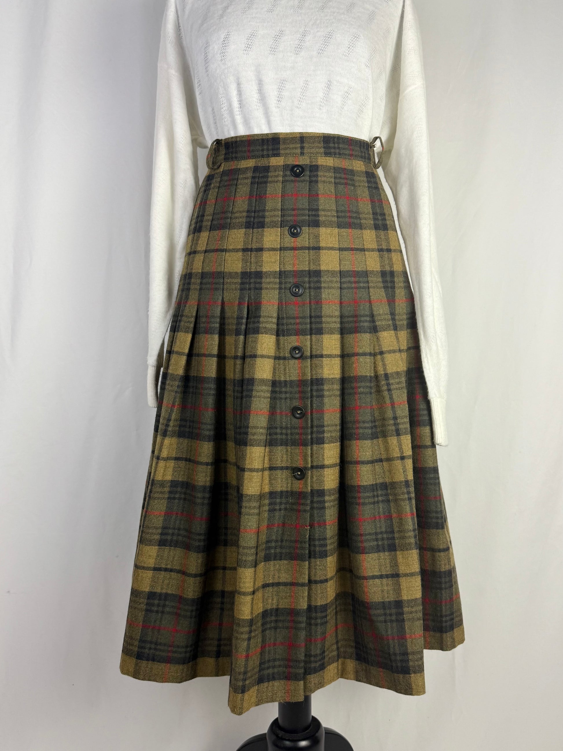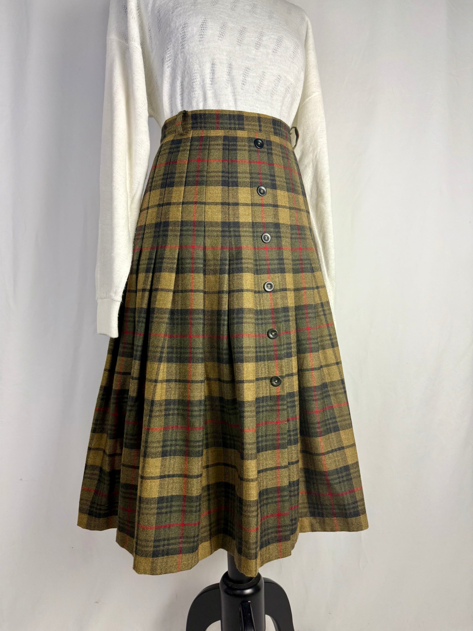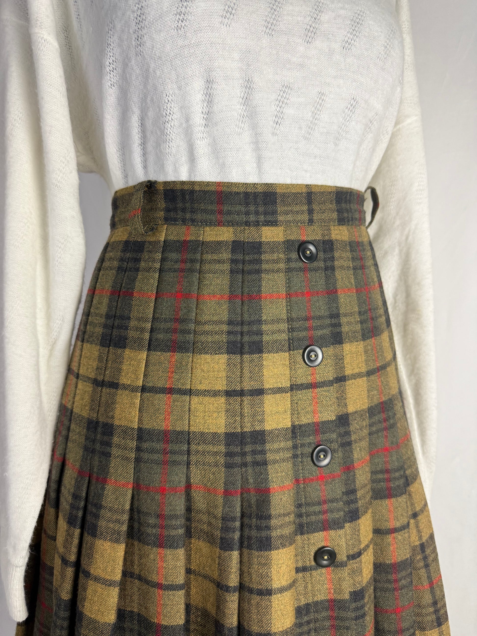 Gonna in pura lana di alta qualità, caratterizzata da un classico tartan scozzese nelle sfumature calde del verde, cachi e rosso. Il tessuto, morbido ma compatto, offre ottimo isolamento termico e una caduta strutturata, perfetta per i mesi freddi. Il modello presenta vita alta sagomata, passanti per cintura e una raffinata abbottonatura frontale decorativa che valorizza la verticalità della silhouette. Le ampie pieghe distribuite su tutta la circonferenza donano movimento e volume equilibrato, richiamando le gonne tradizionali scozzesi reinterpretate in chiave femminile.