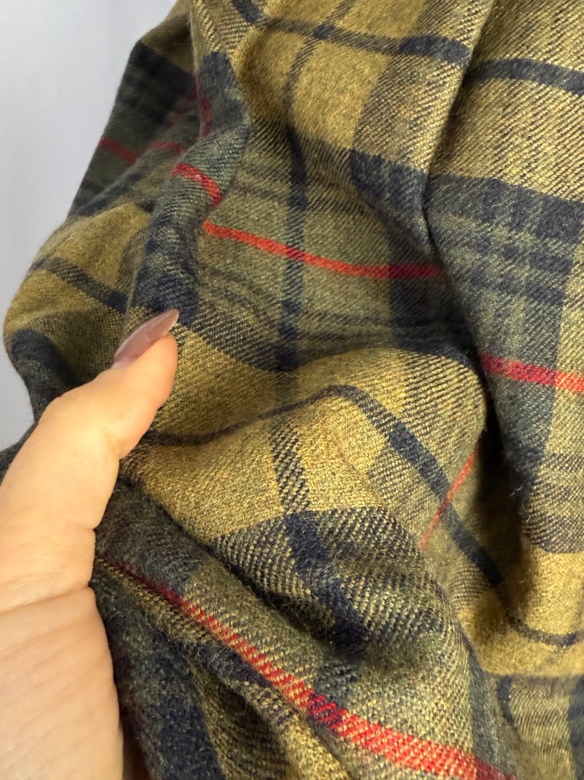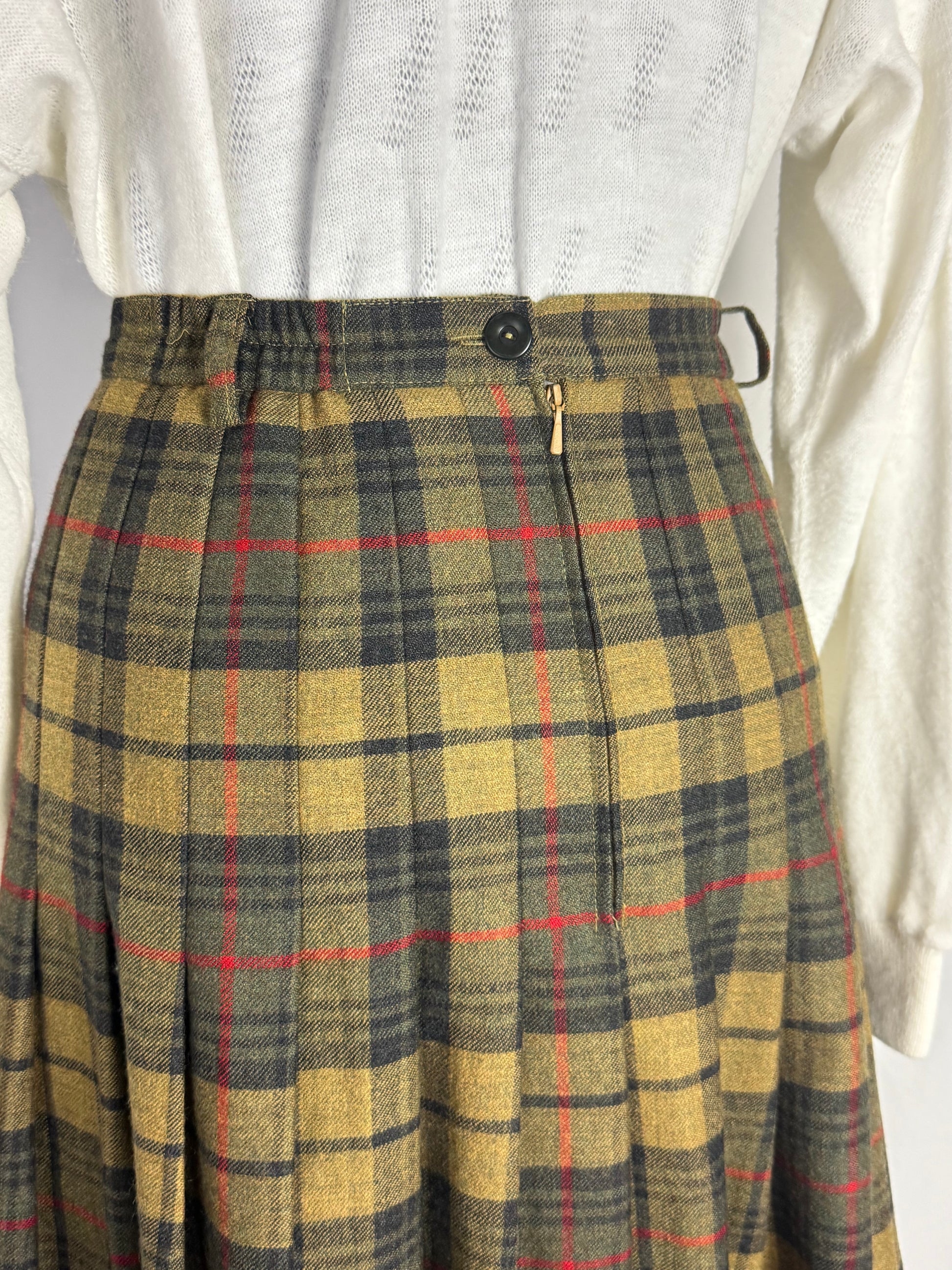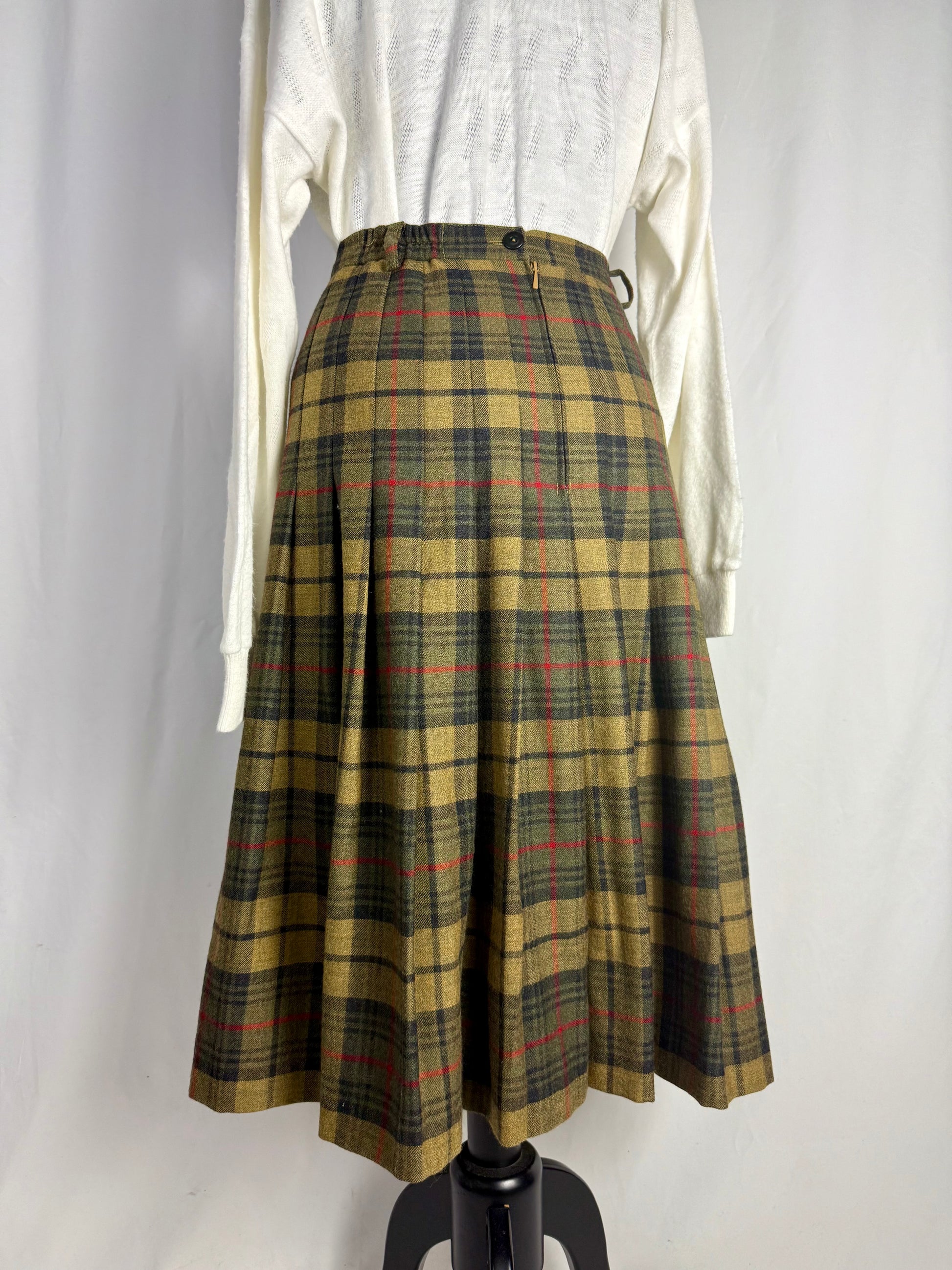 Gonna in pura lana di alta qualità, caratterizzata da un classico tartan scozzese nelle sfumature calde del verde, cachi e rosso. Il tessuto, morbido ma compatto, offre ottimo isolamento termico e una caduta strutturata, perfetta per i mesi freddi. Il modello presenta vita alta sagomata, passanti per cintura e una raffinata abbottonatura frontale decorativa che valorizza la verticalità della silhouette. Le ampie pieghe distribuite su tutta la circonferenza donano movimento e volume equilibrato, richiamando le gonne tradizionali scozzesi reinterpretate in chiave femminile.