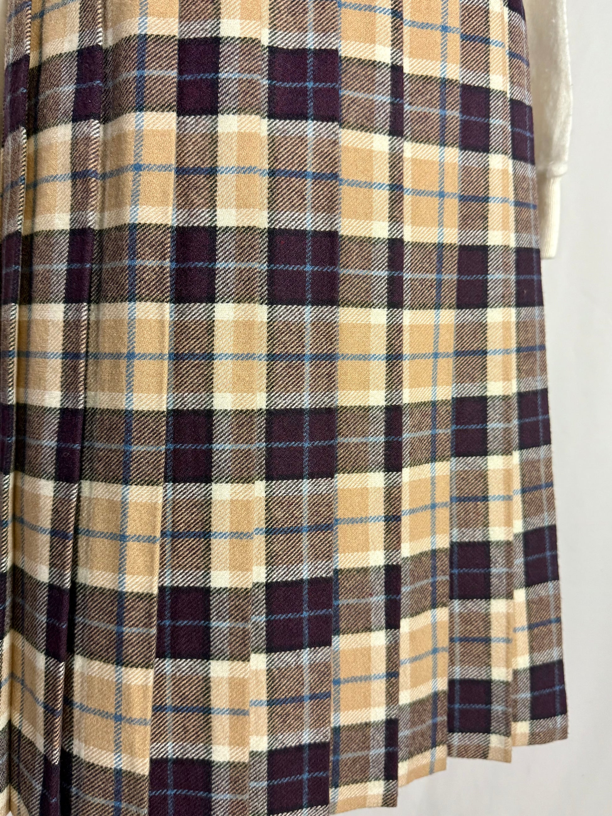 Gonna anni ‘70 nuova fondo di magazzino in tessuto tartan scozzese, realizzata in lana con struttura a pieghe e chiusura laterale a portafoglio con doppie fibbie regolabili in pelle e finiture in metallo dorato, dettaglio tipico dei modelli ispirati al kilt tradizionale; il motivo a quadri nei toni del beige, blu e bordeaux la rende un capo estremamente versatile, perfetto per outfit autunnali e invernali.
