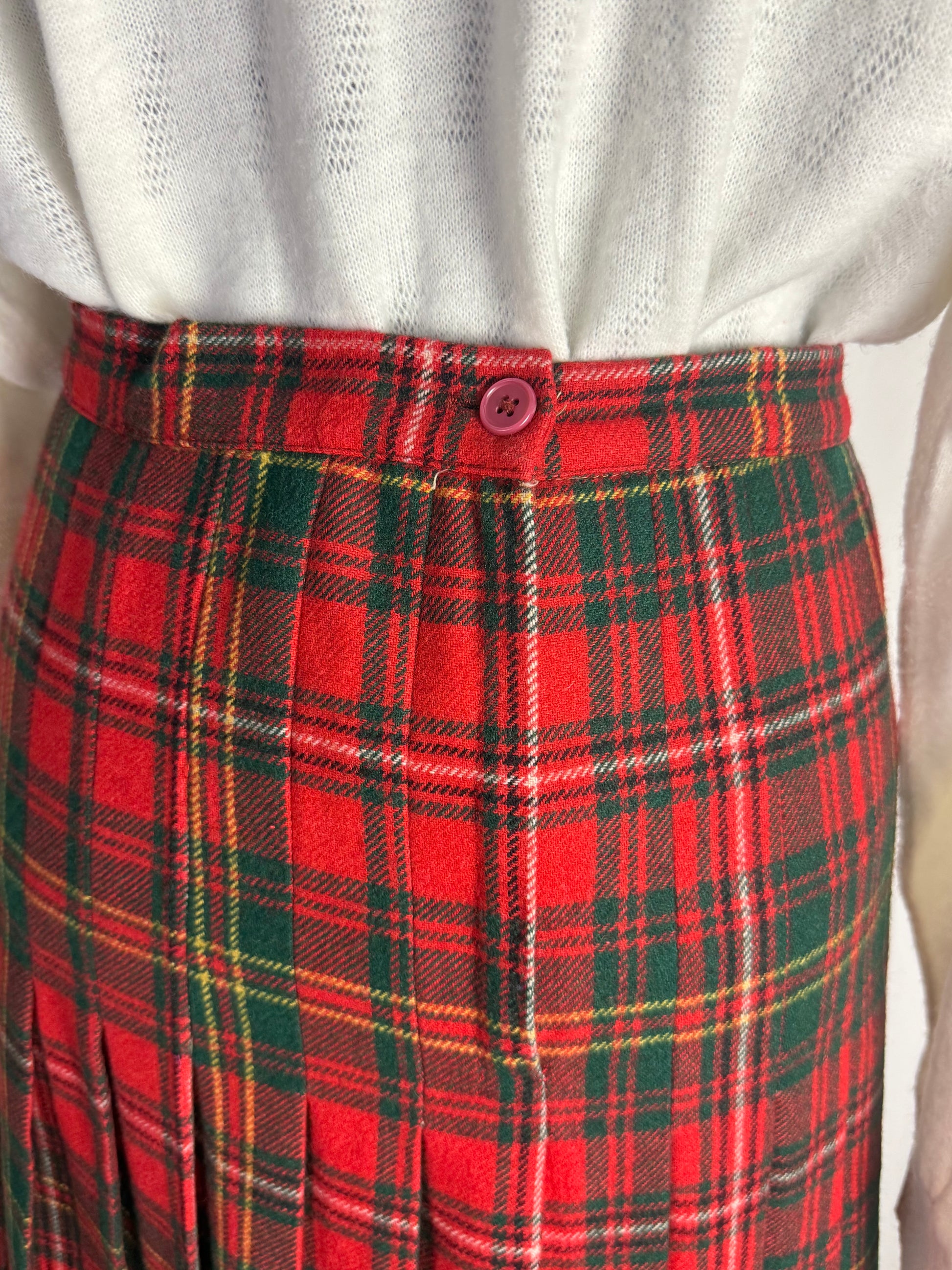 Gonna a pieghe in pura lana pesante con iconico pattern tartan rosso e verde, caratterizzata da vita alta strutturata, taglio svasato e costruzione sartoriale di alta qualità, pensata per garantire caduta impeccabile, isolamento termico e massima resistenza nel tempo. Il tessuto, molto corposo e consistente, conferisce volume naturale e stabilità alle pieghe, rendendo il capo ideale per la stagione autunno-inverno.