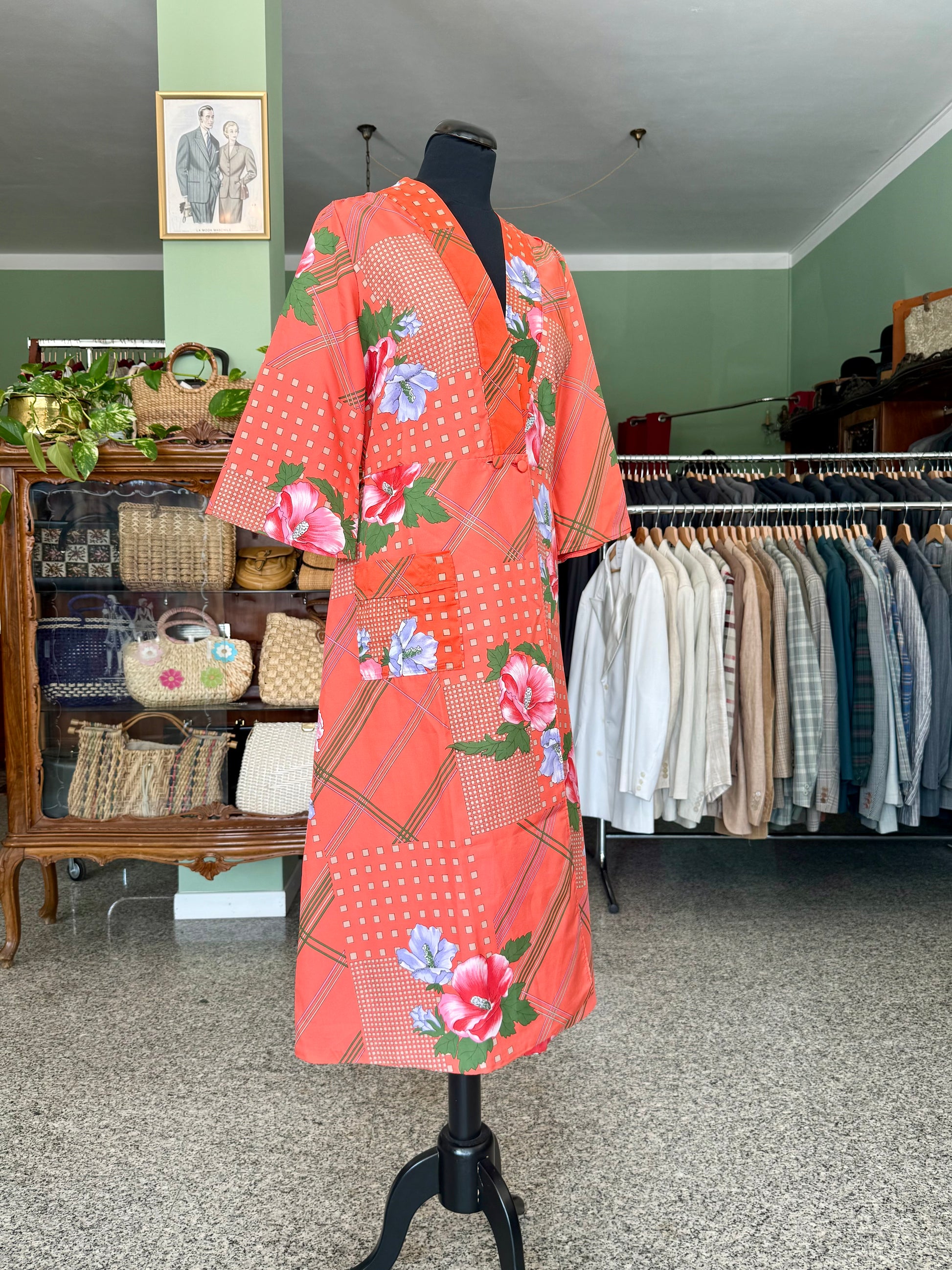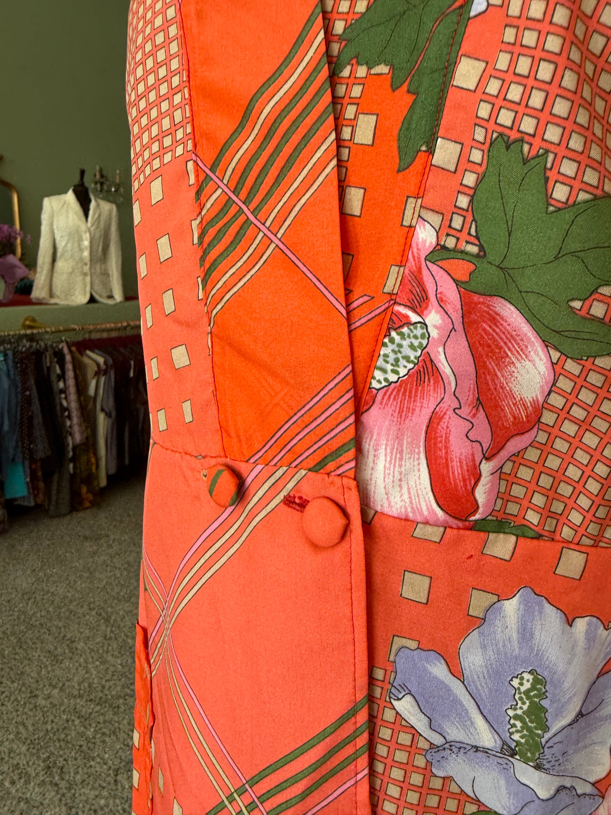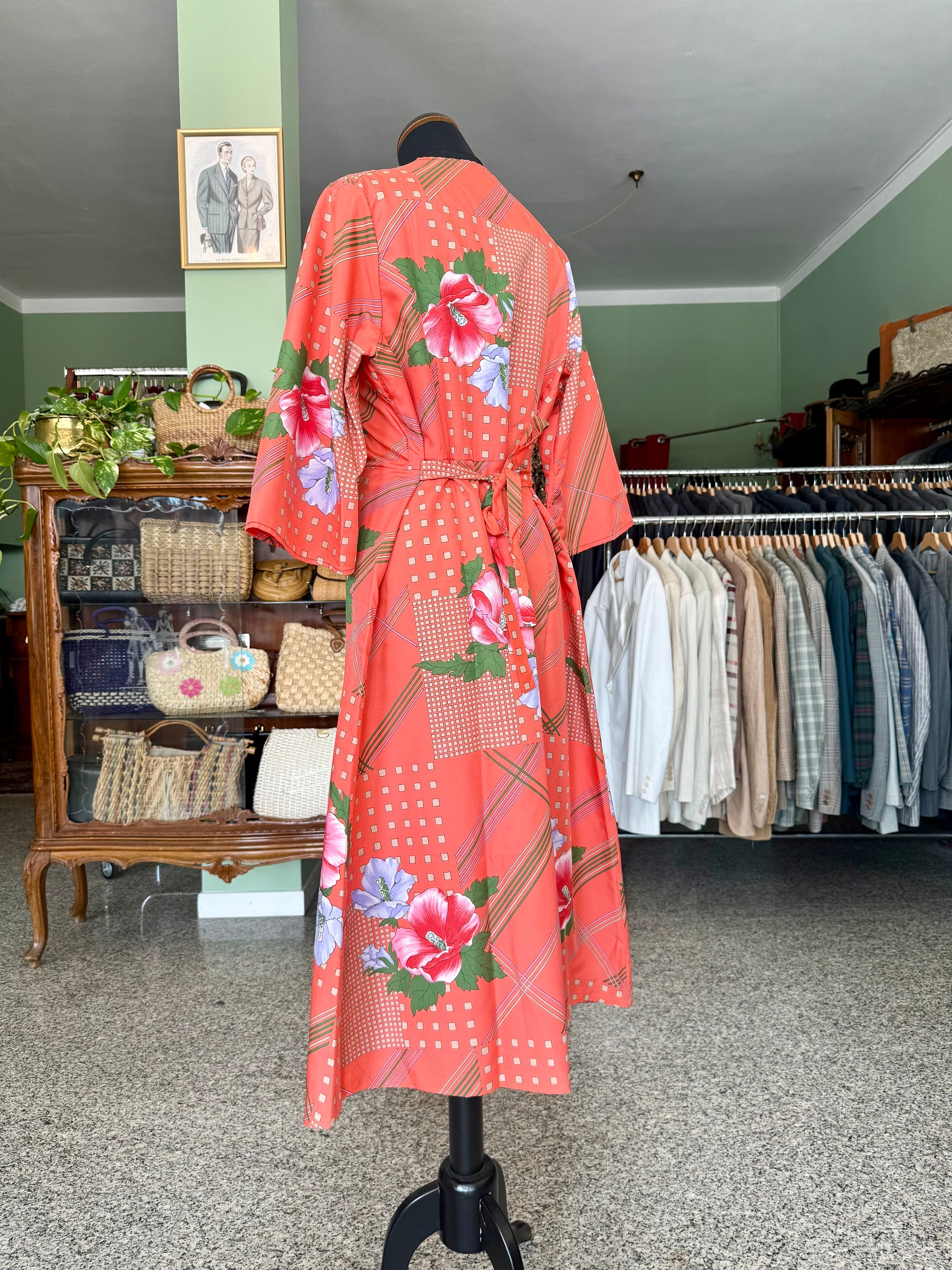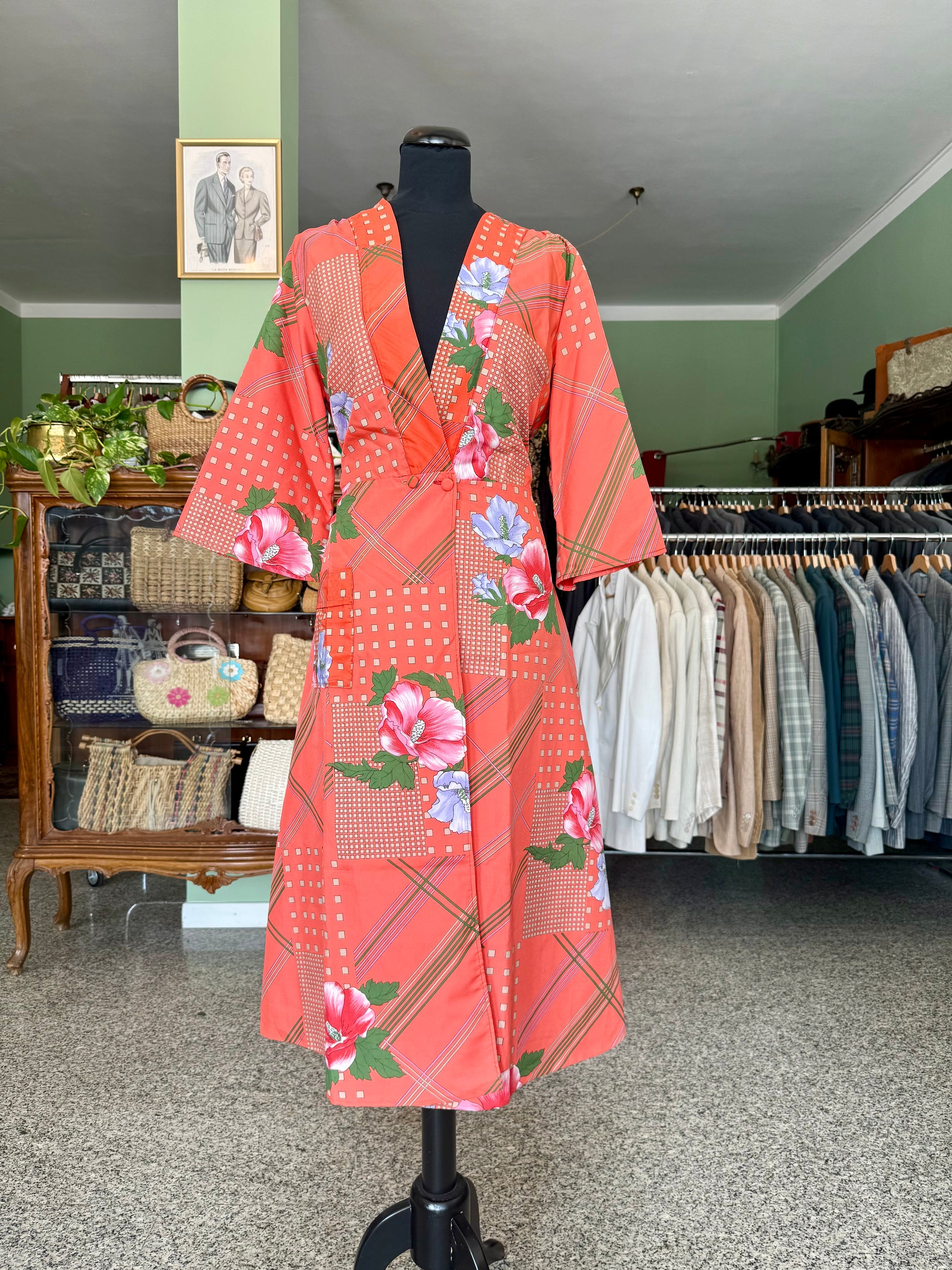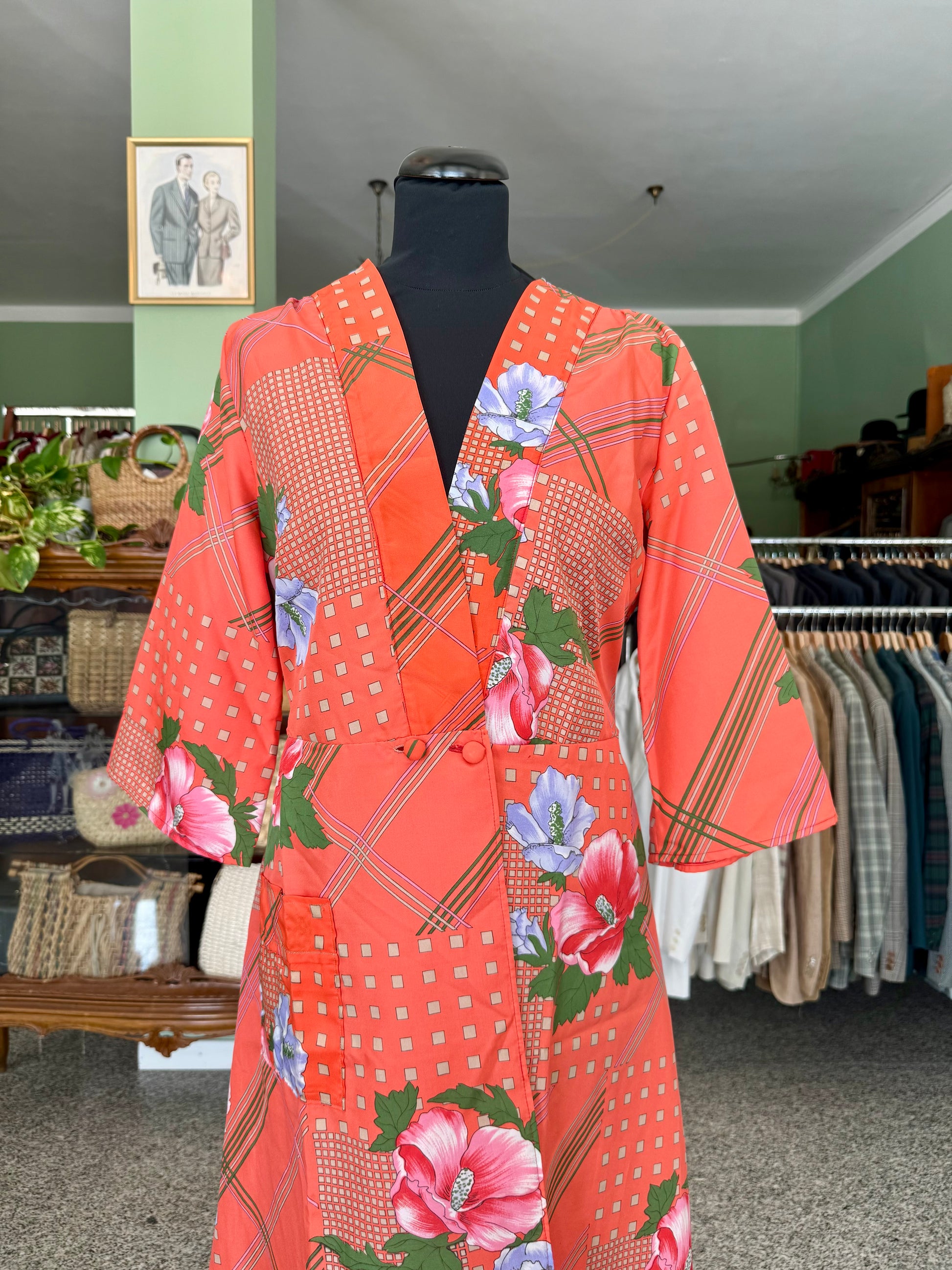 Capo vintage anni ’70 dal taglio kimono, in vivace tessuto arancio con maxi fiori e fantasia geometrica. Modello incrociato con laccetti sul retro e maniche ampie a tre quarti. Può essere indossato come vestaglia elegante, abito da casa, oppure reinterpretato come soprabito leggero per look creativi e boho. Stile esotico e grafico, tipico degli anni ’70, perfetto per chi ama i pezzi unici e versatili