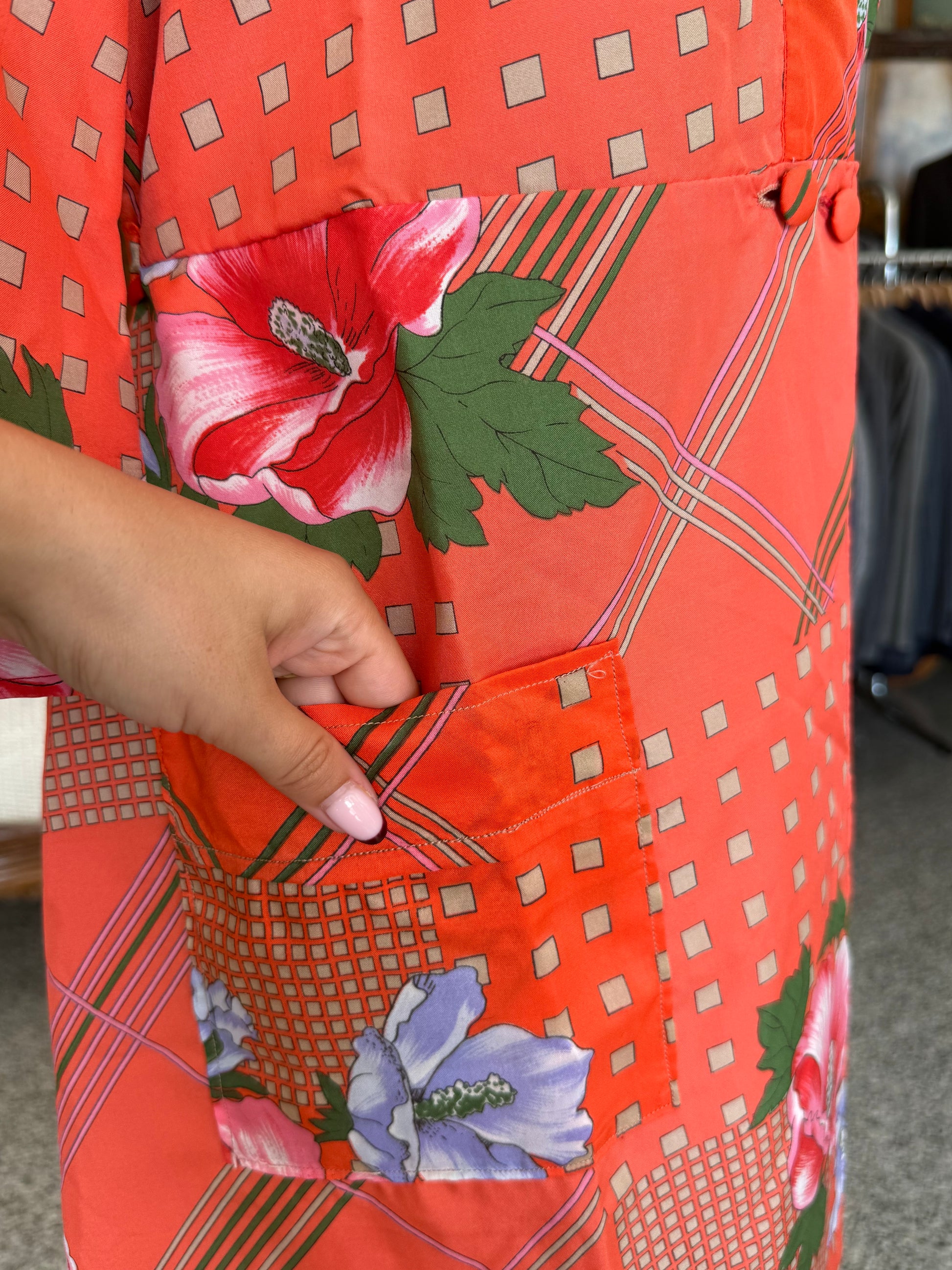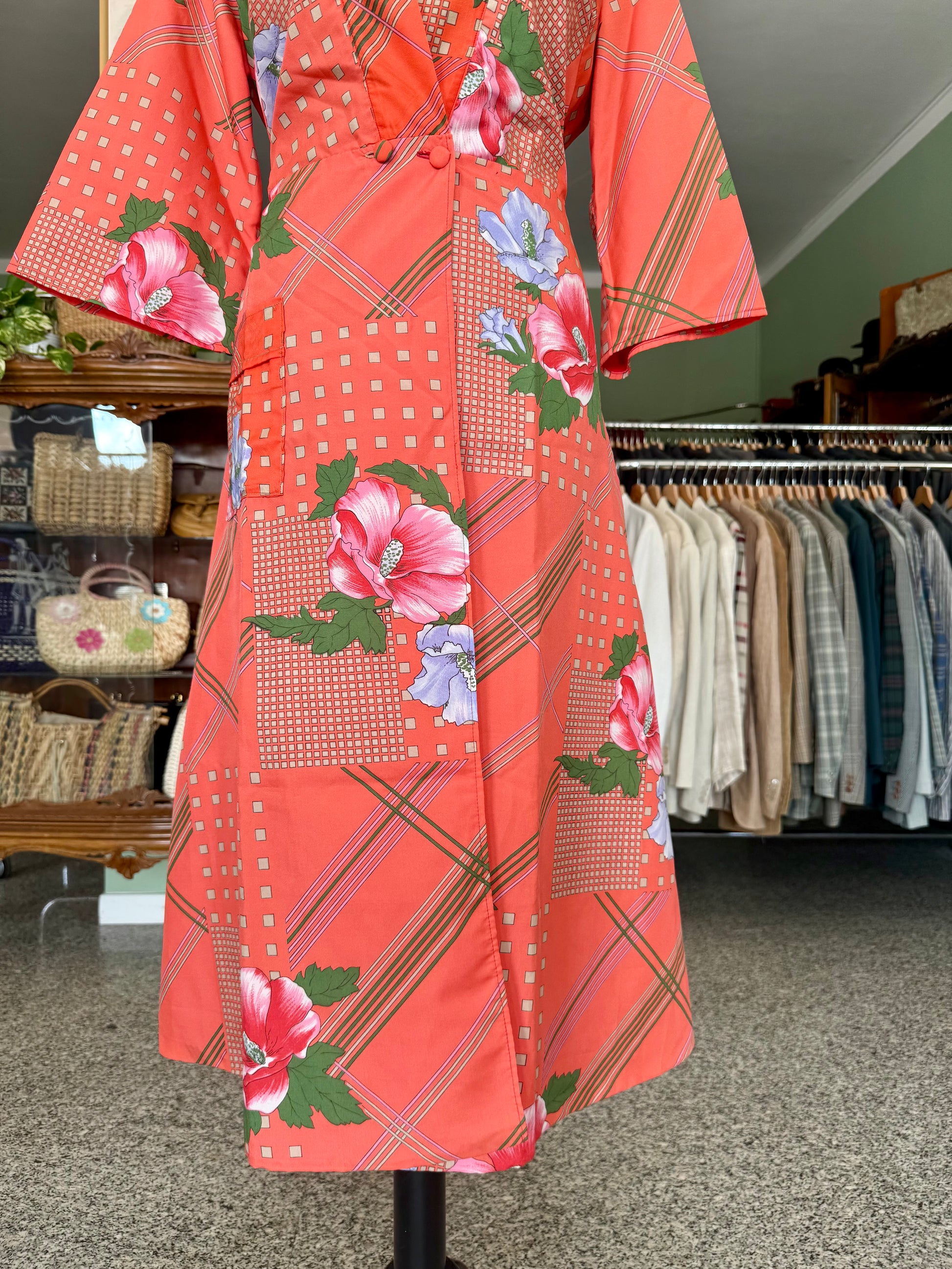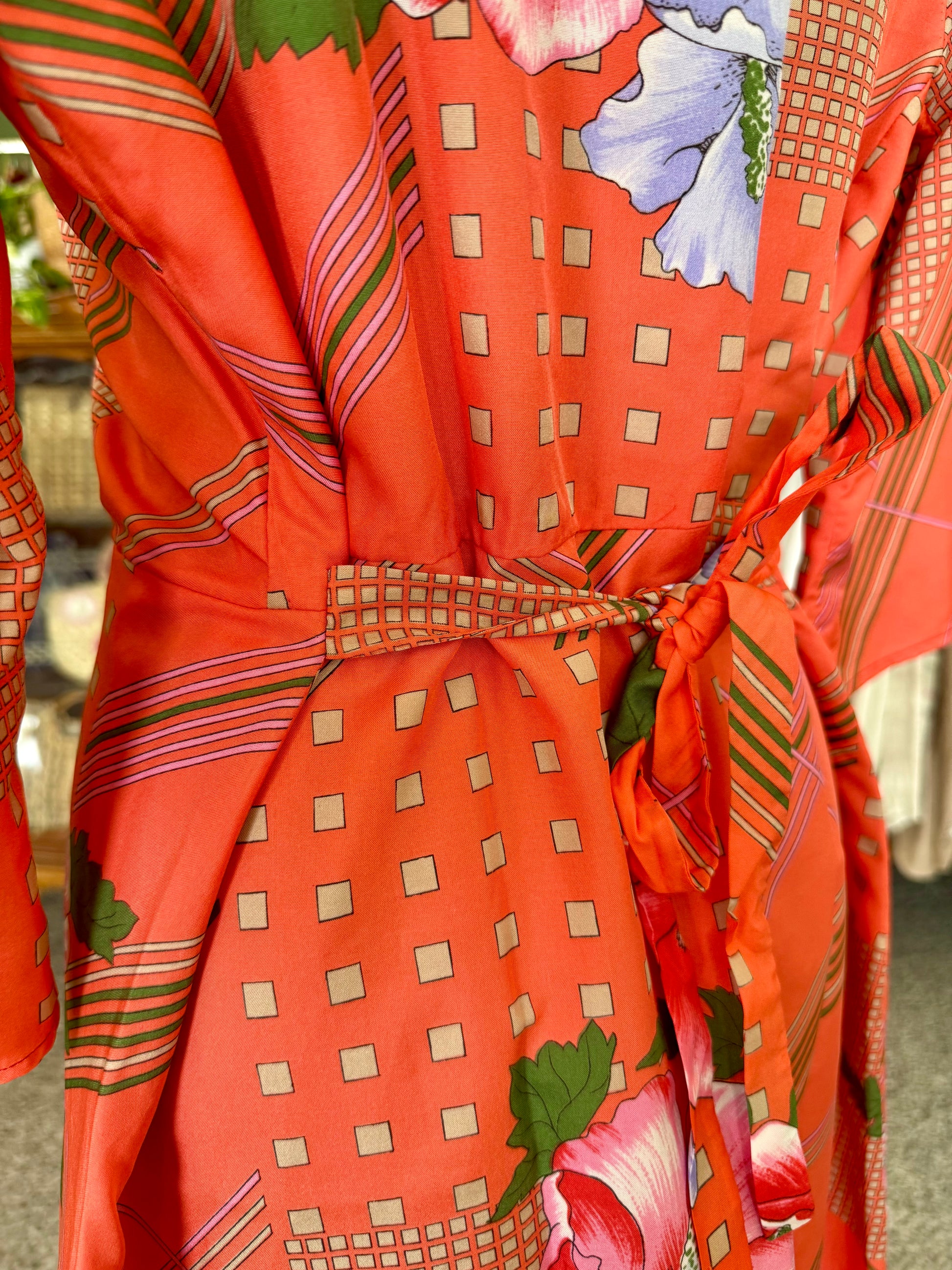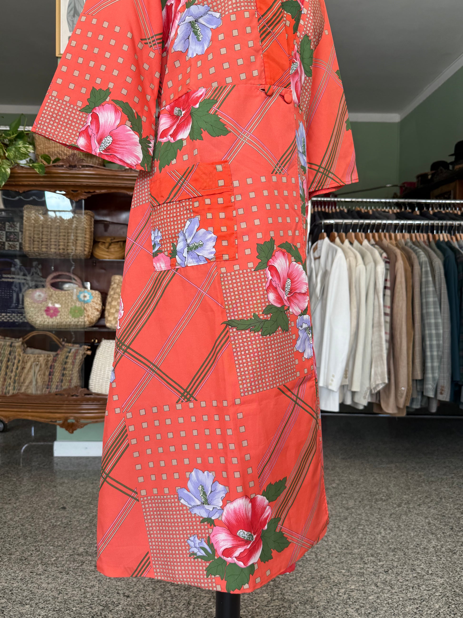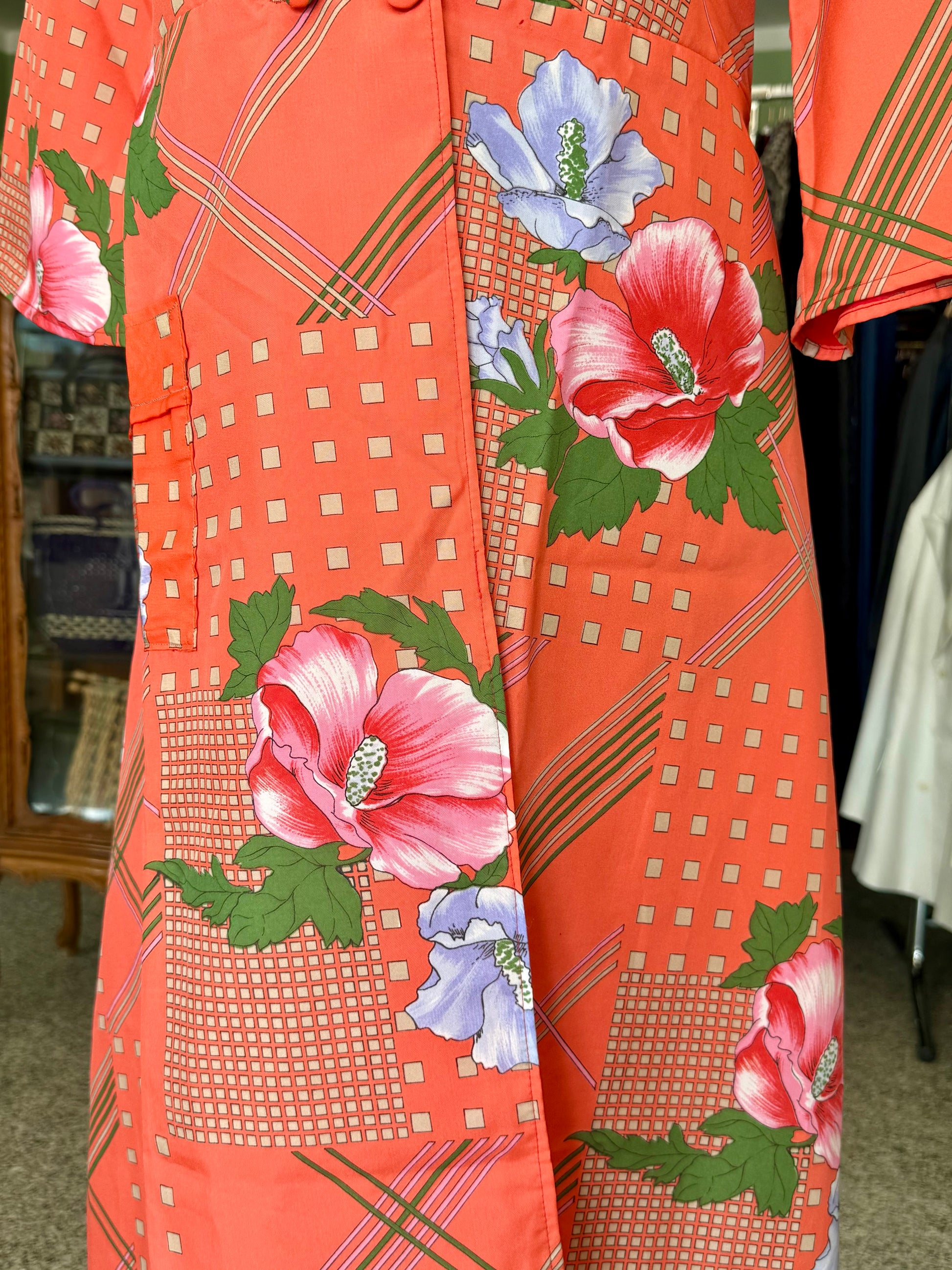 Capo vintage anni ’70 dal taglio kimono, in vivace tessuto arancio con maxi fiori e fantasia geometrica. Modello incrociato con laccetti sul retro e maniche ampie a tre quarti. Può essere indossato come vestaglia elegante, abito da casa, oppure reinterpretato come soprabito leggero per look creativi e boho. Stile esotico e grafico, tipico degli anni ’70, perfetto per chi ama i pezzi unici e versatili