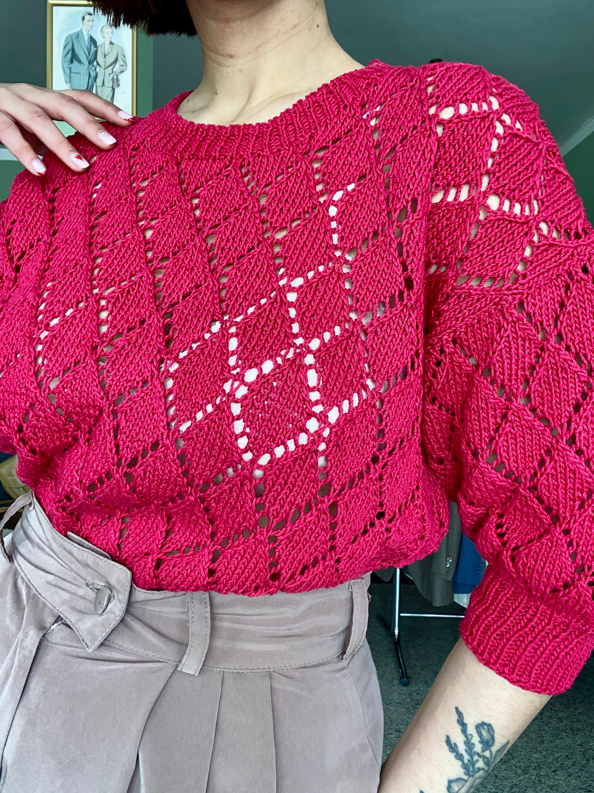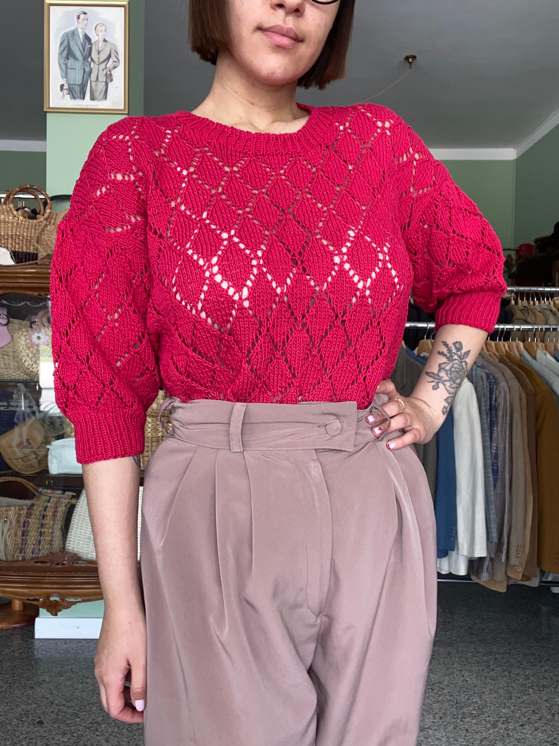 Maglia traforata in cotone realizzata a mano, probabilmente risalente agli anni ’80. Il colore rosso ciliegia acceso e la lavorazione a rombi traforati la rendono perfetta per la primavera e l’estate, da indossare con un top sotto o a pelle per un effetto vedo-non-vedo. Taglio dritto, morbido e comodo, manica tre quarti con polsino aderente.