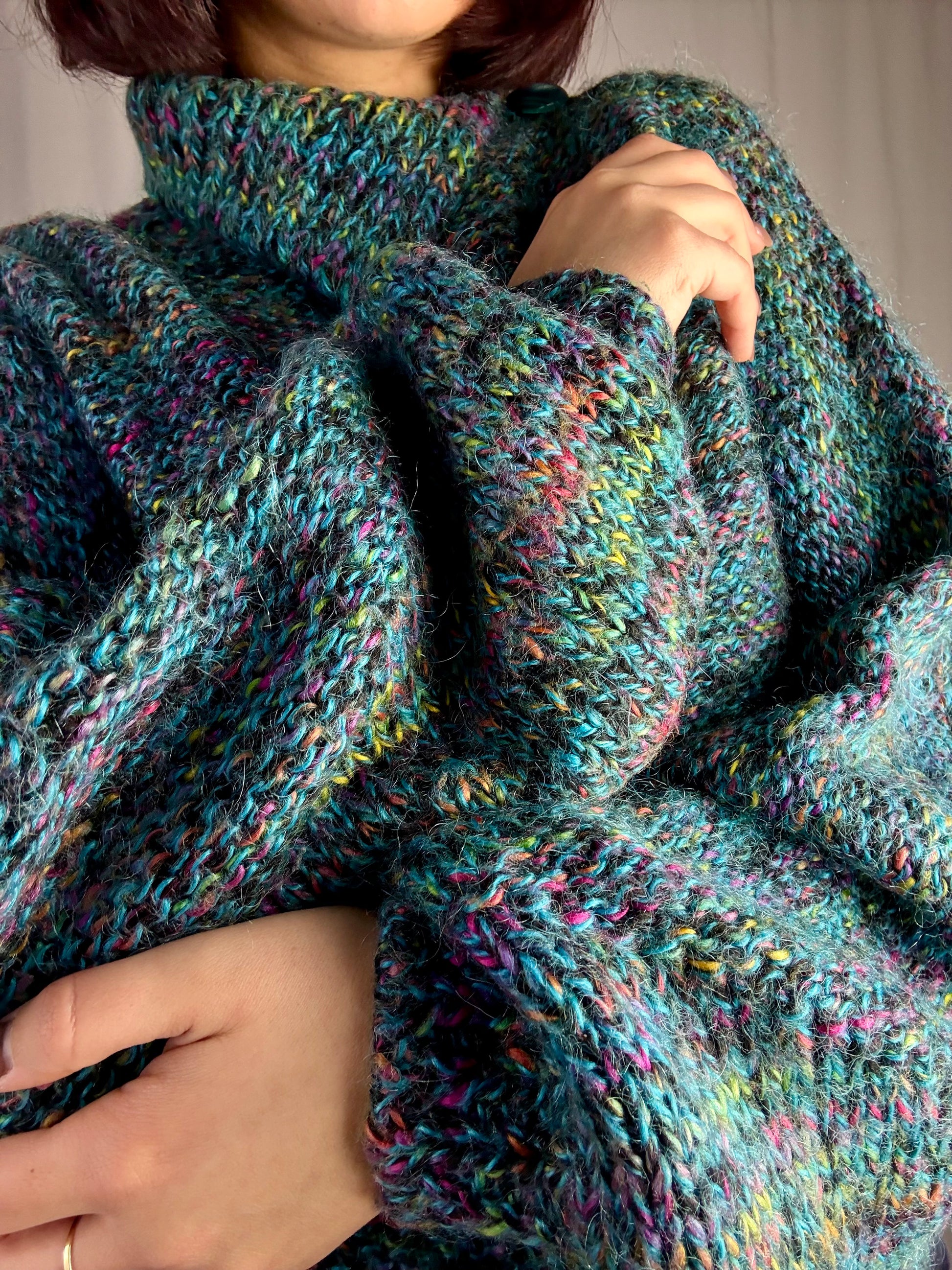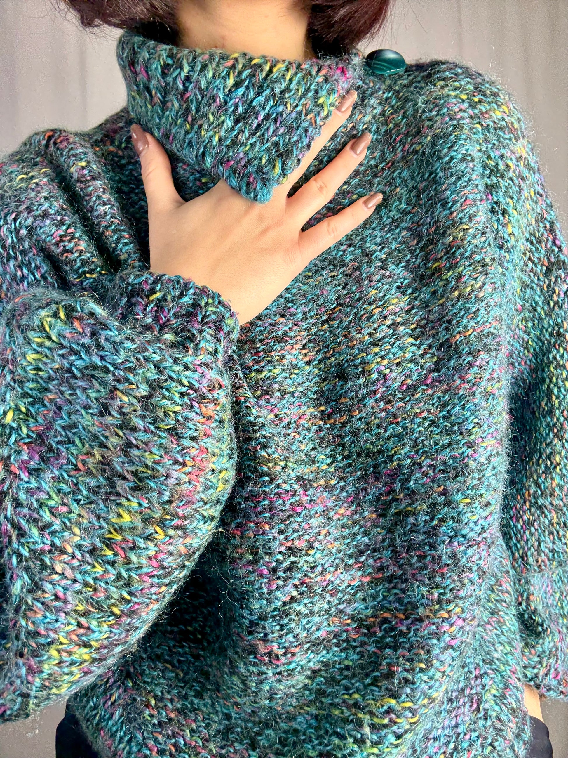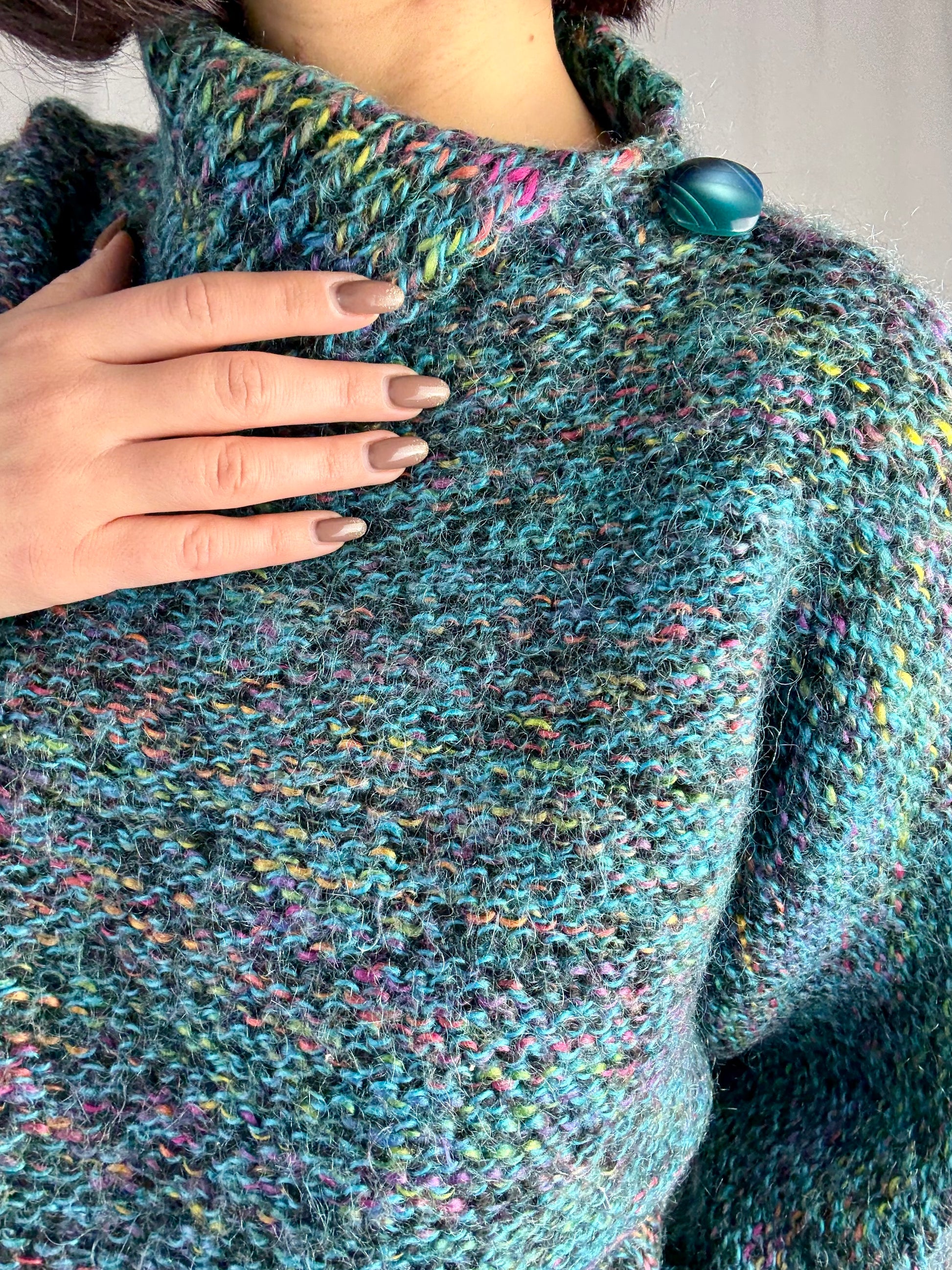 Maglione anni ‘80 in filato mélange dai toni freddi del verde, turchese e blu, arricchito da micro sfumature multicolor che creano un effetto vibrante e materico. La lavorazione a maglia grossa dona volume e morbidezza, mentre il collo strutturato — chiuso lateralmente da un grande bottone satinato — aggiunge un dettaglio originale e sofisticato.
