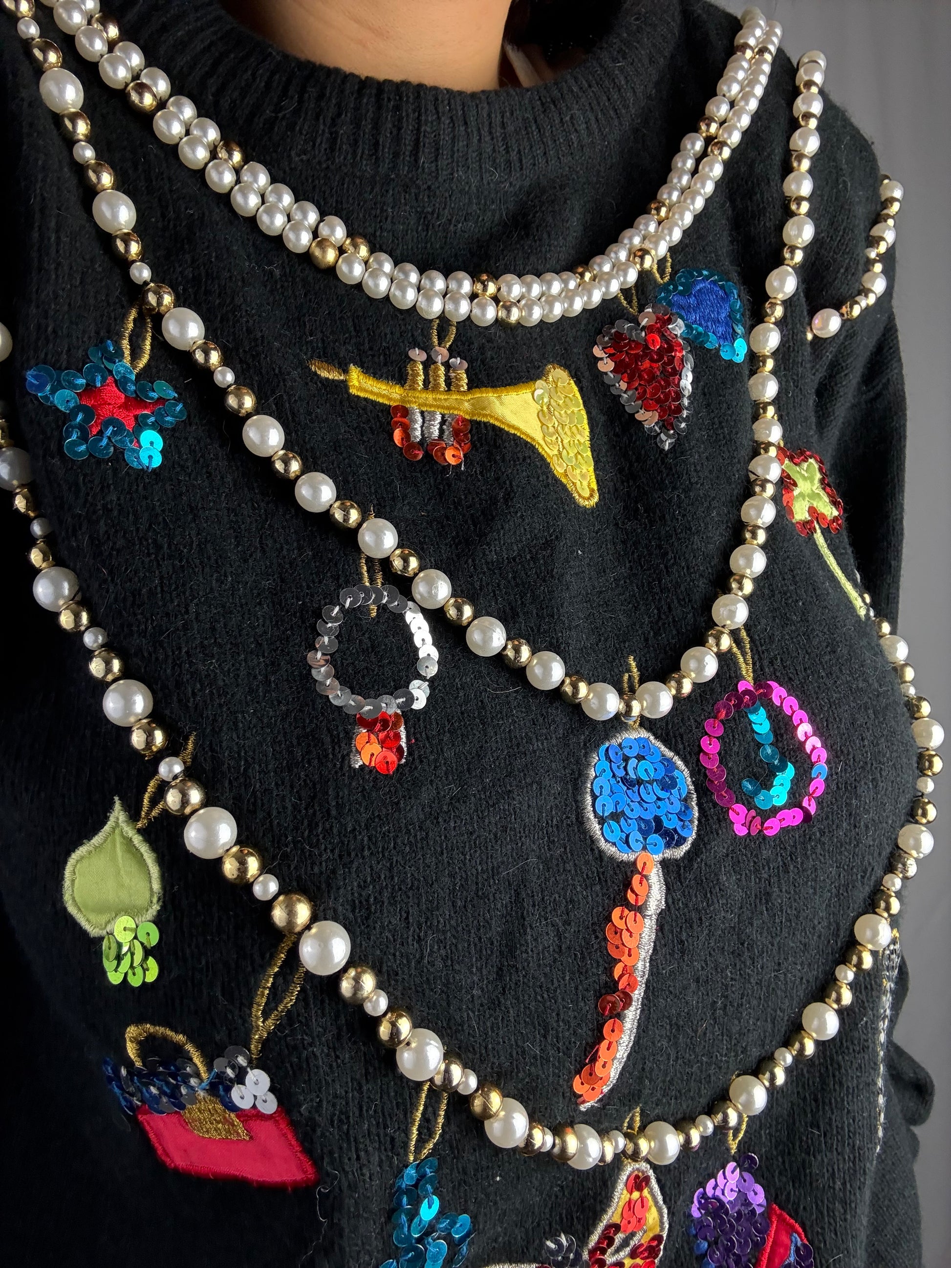 Maglione anni ‘80 nero dalla linea morbida e avvolgente, interamente decorato sul fronte da spettacolari catene di perle applicate che creano l’effetto di collane sovrapposte. Ogni “ciondolo” è ricamato a mano con paillettes e fili colorati, raffigurando piccoli oggetti e simboli dal gusto giocoso e prezioso: strumenti musicali, fiocchi, borse, cuori e dettagli luminose. Un capo scenografico e iconico