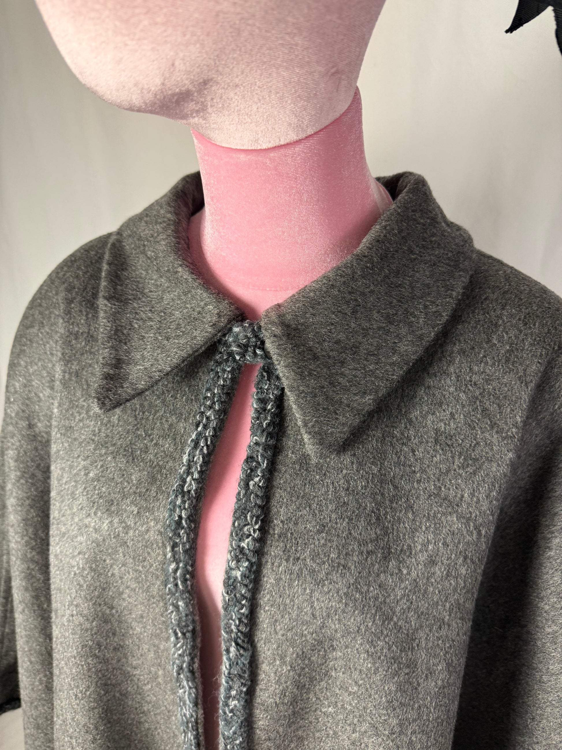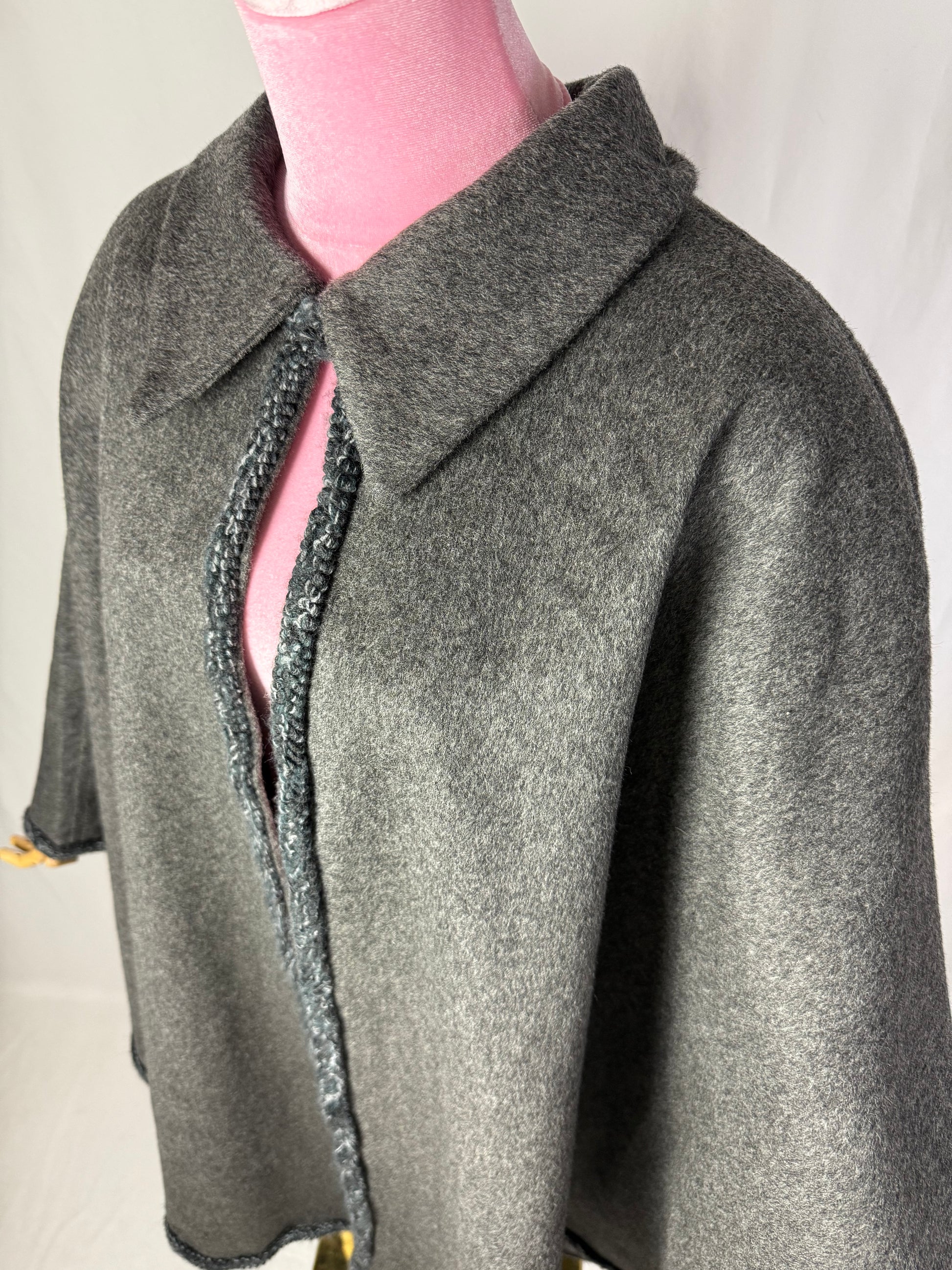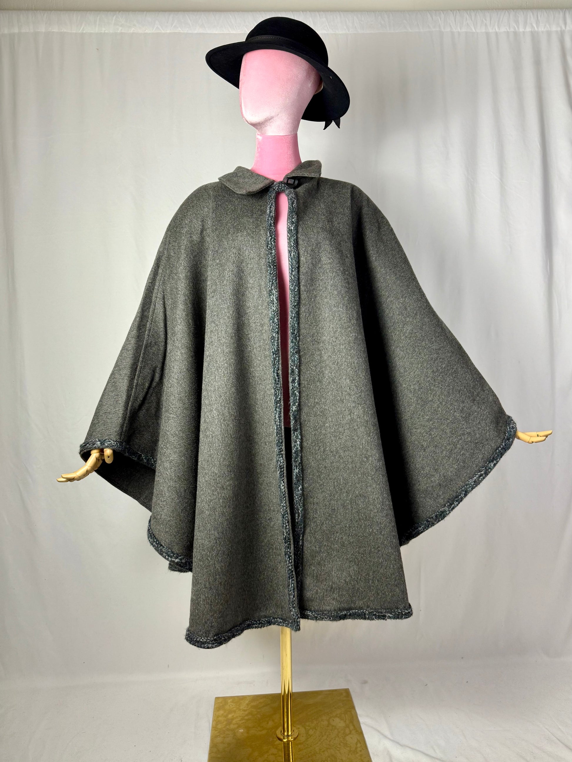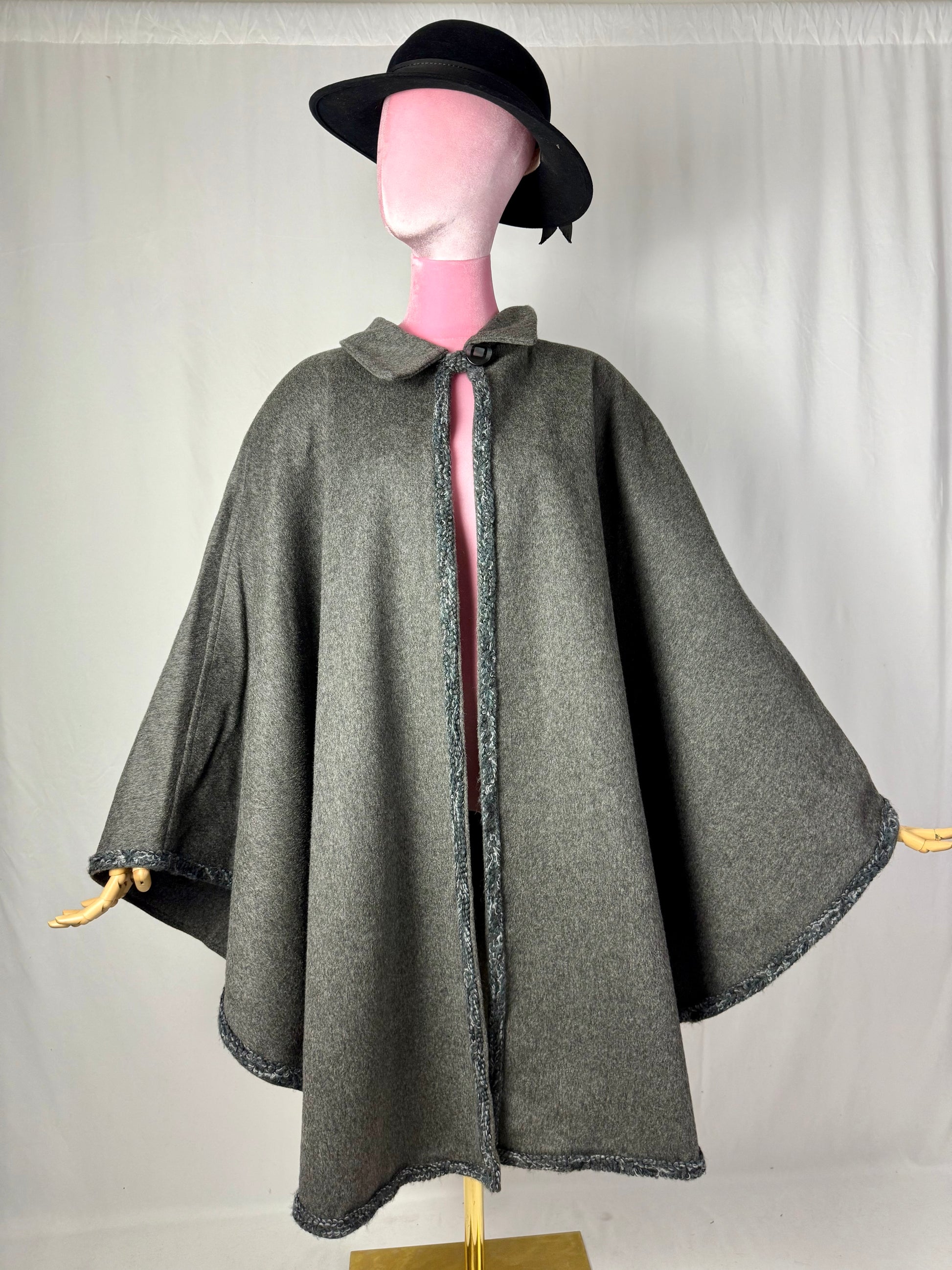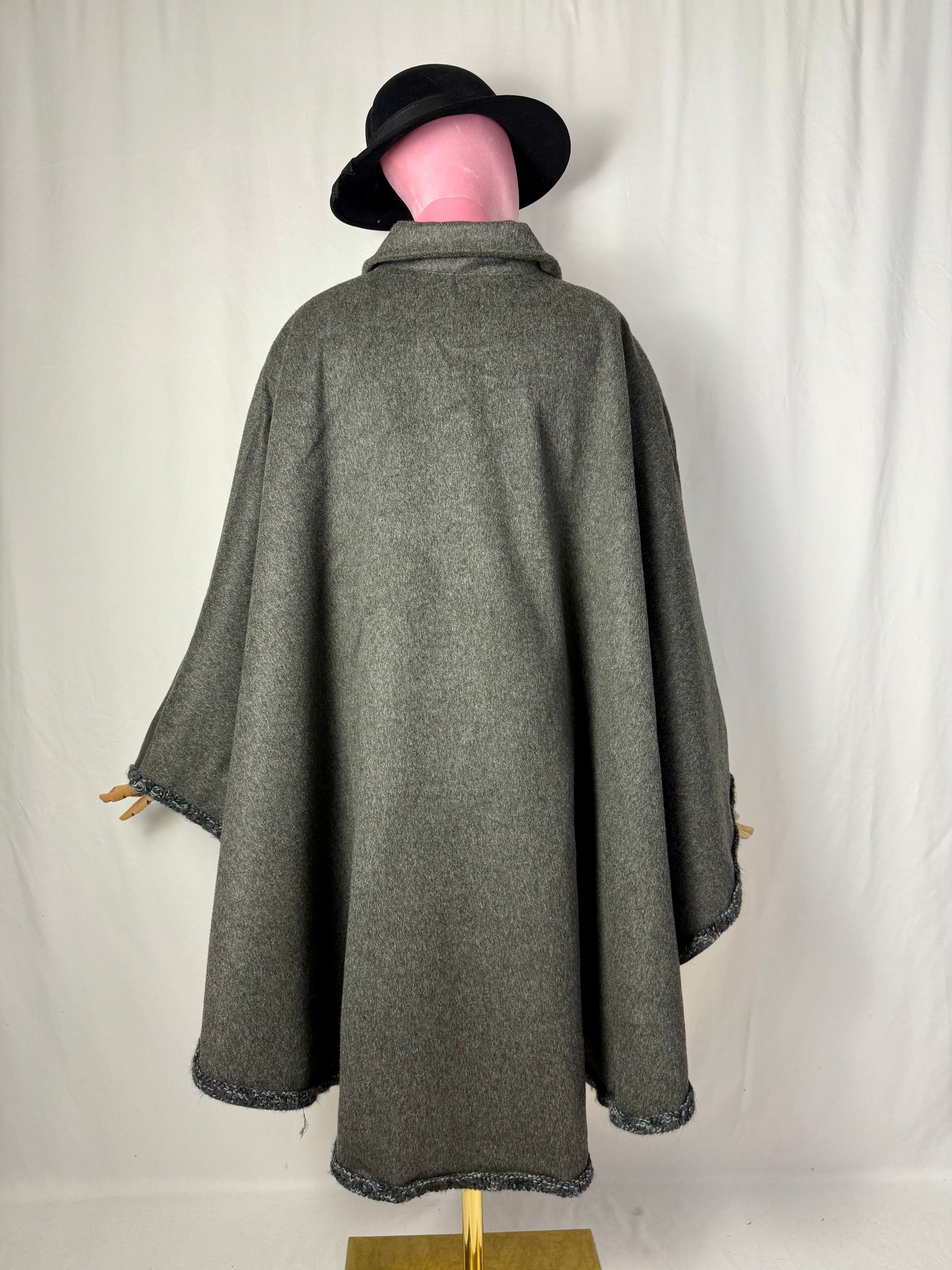 Mantella artigianale in pura lana, con probabile presenza di cashmere vista la morbidezza, interamente rifinita a mano. Modello ampio e avvolgente, chiusura con bottone singolo e bordi lavorati all’uncinetto. Colletto morbido, tessuto caldo e di qualità superiore. Un pezzo unico dallo stile raffinato e senza tempo.