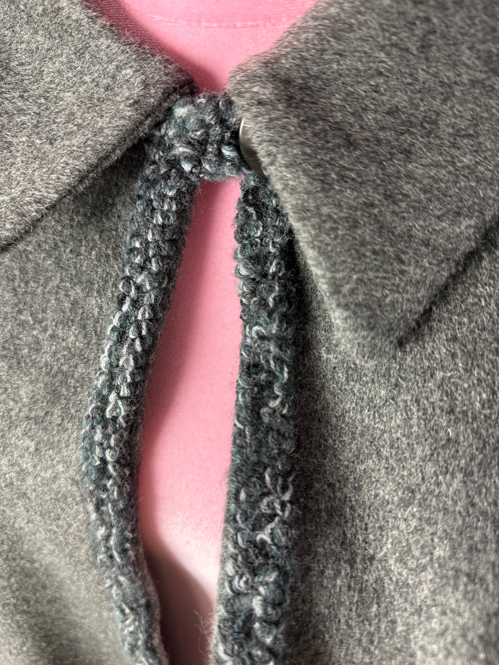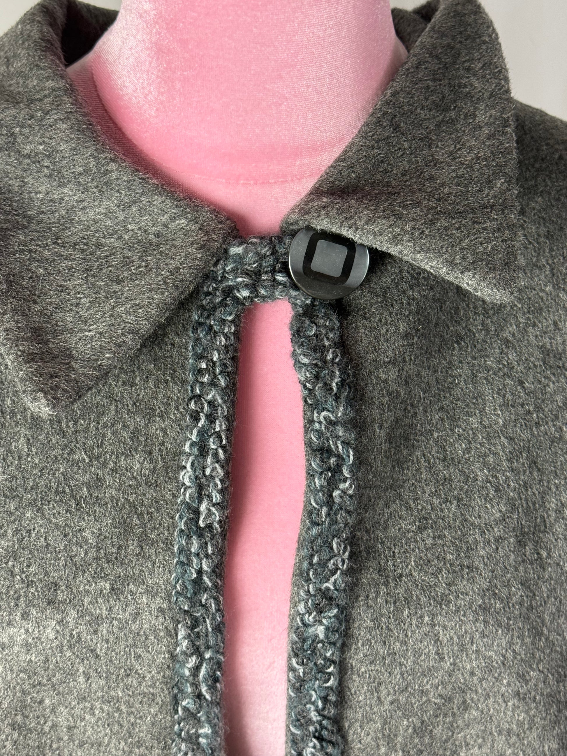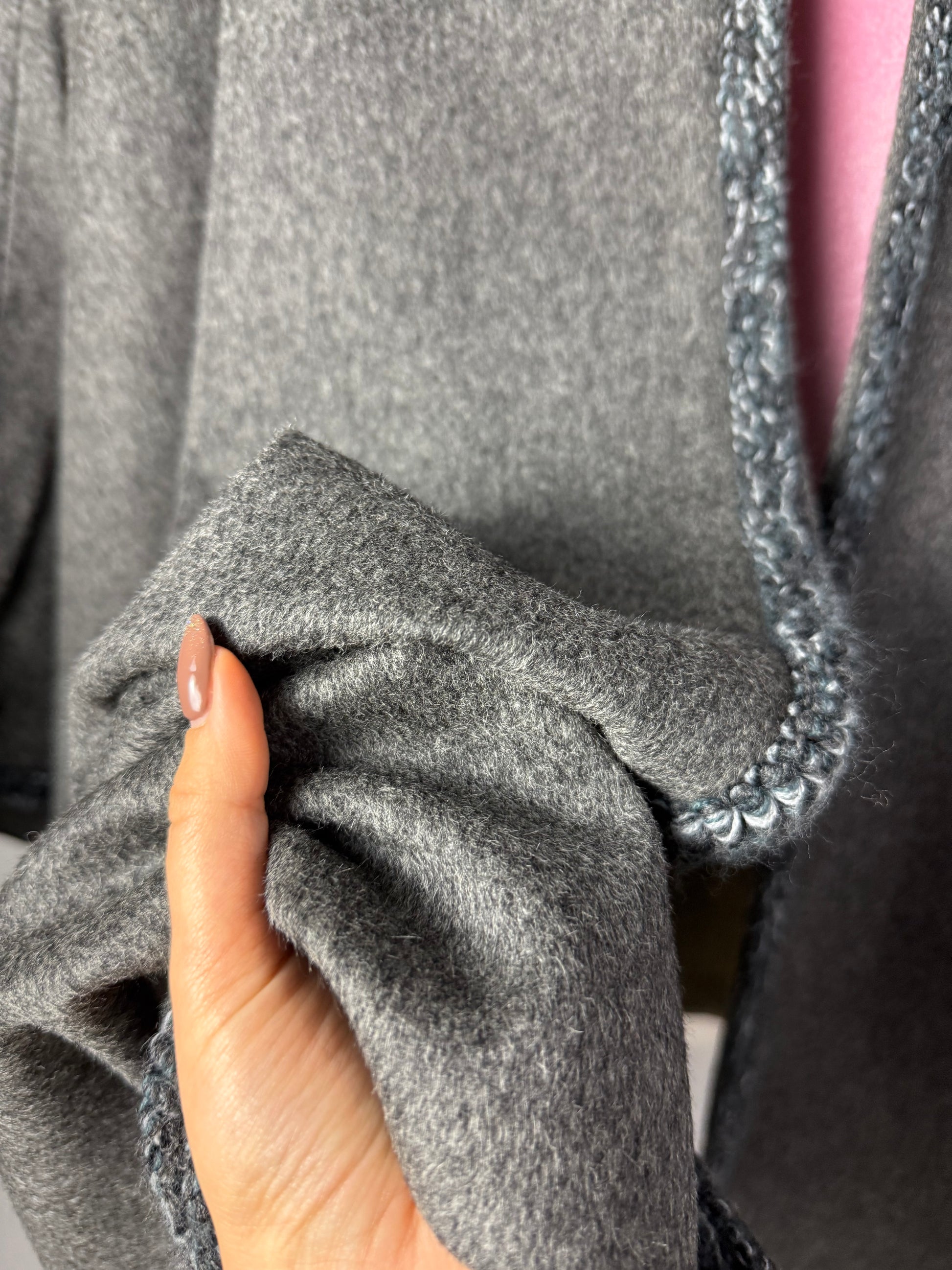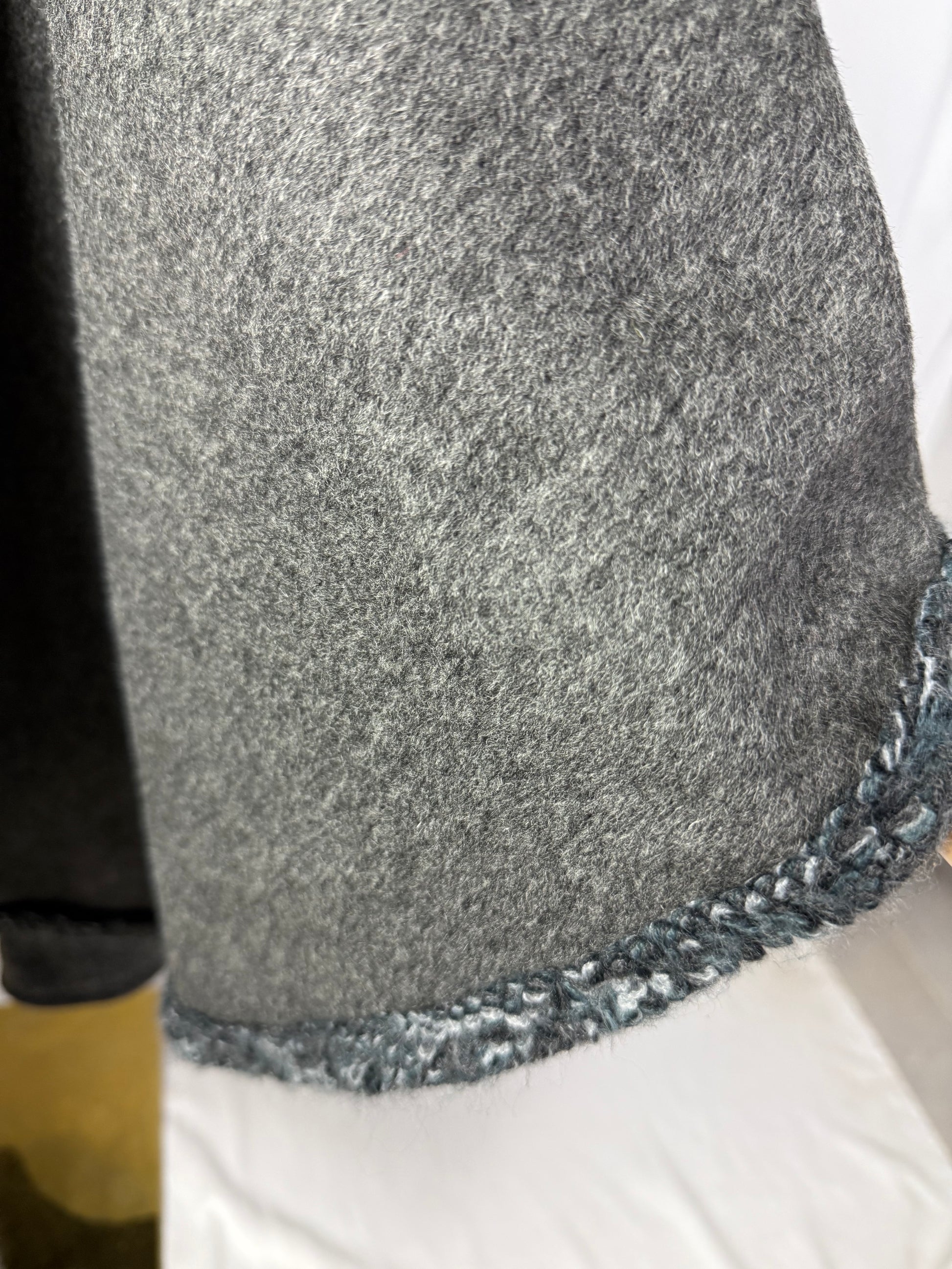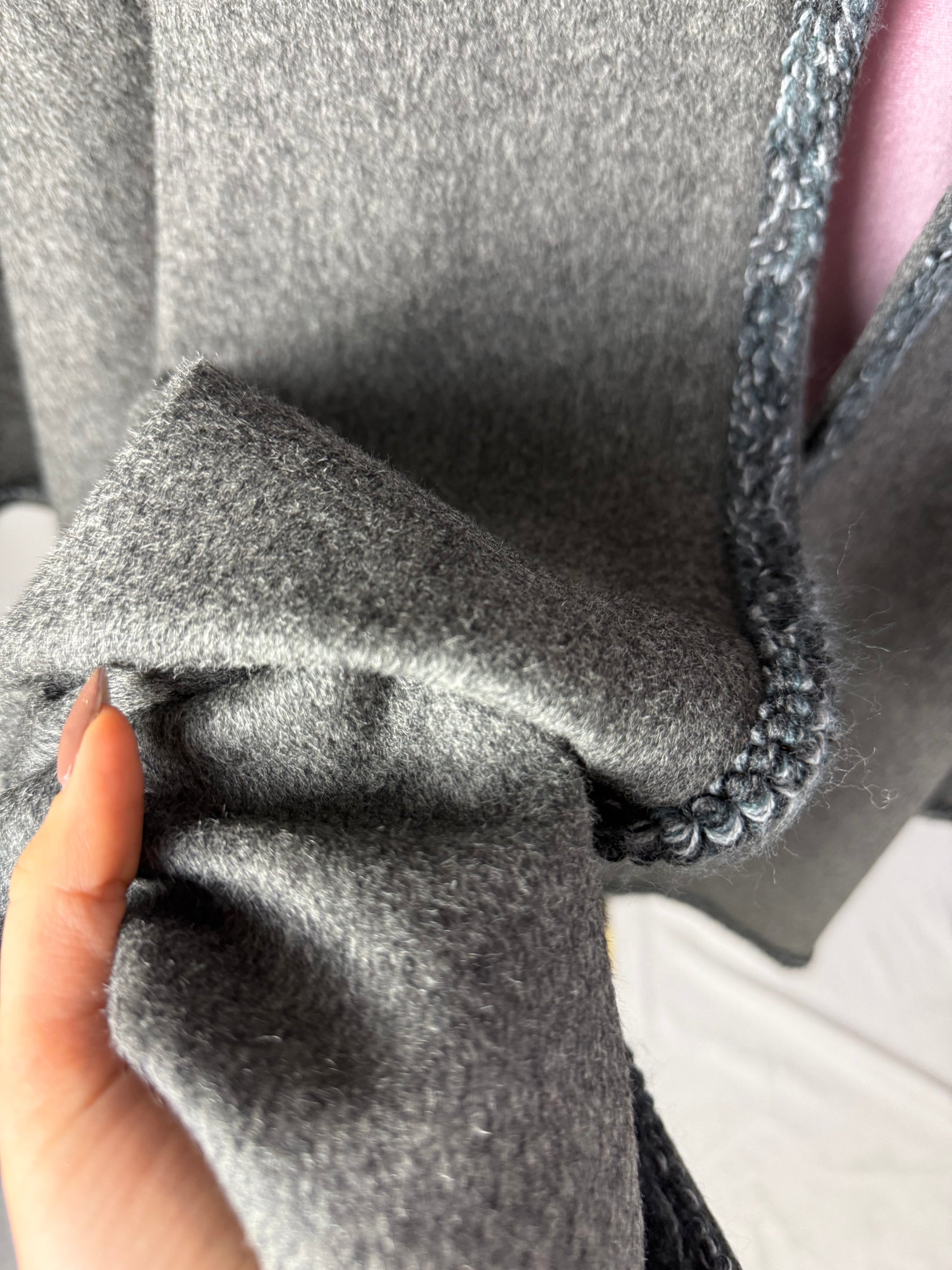 Mantella artigianale in pura lana, con probabile presenza di cashmere vista la morbidezza, interamente rifinita a mano. Modello ampio e avvolgente, chiusura con bottone singolo e bordi lavorati all’uncinetto. Colletto morbido, tessuto caldo e di qualità superiore. Un pezzo unico dallo stile raffinato e senza tempo.
