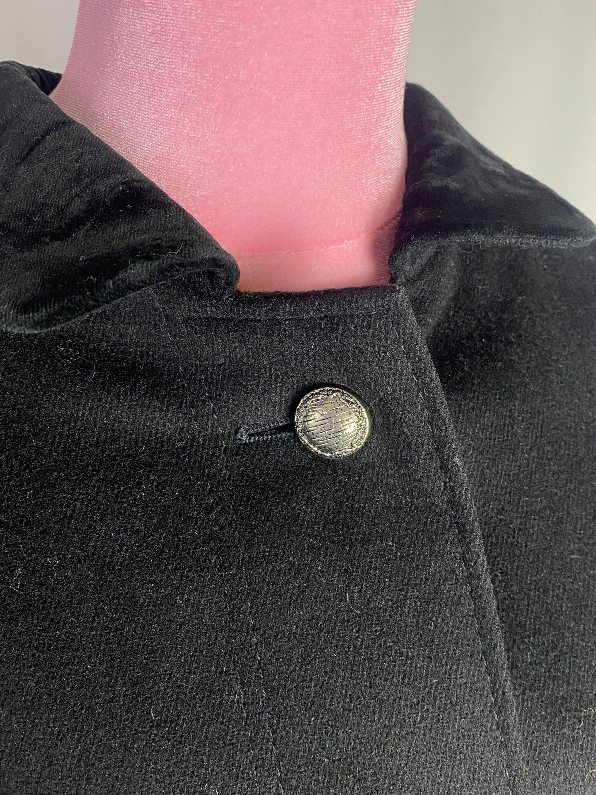 colletto, pattine delle tasche e martingala sono in velluto tono su tono, molto chic