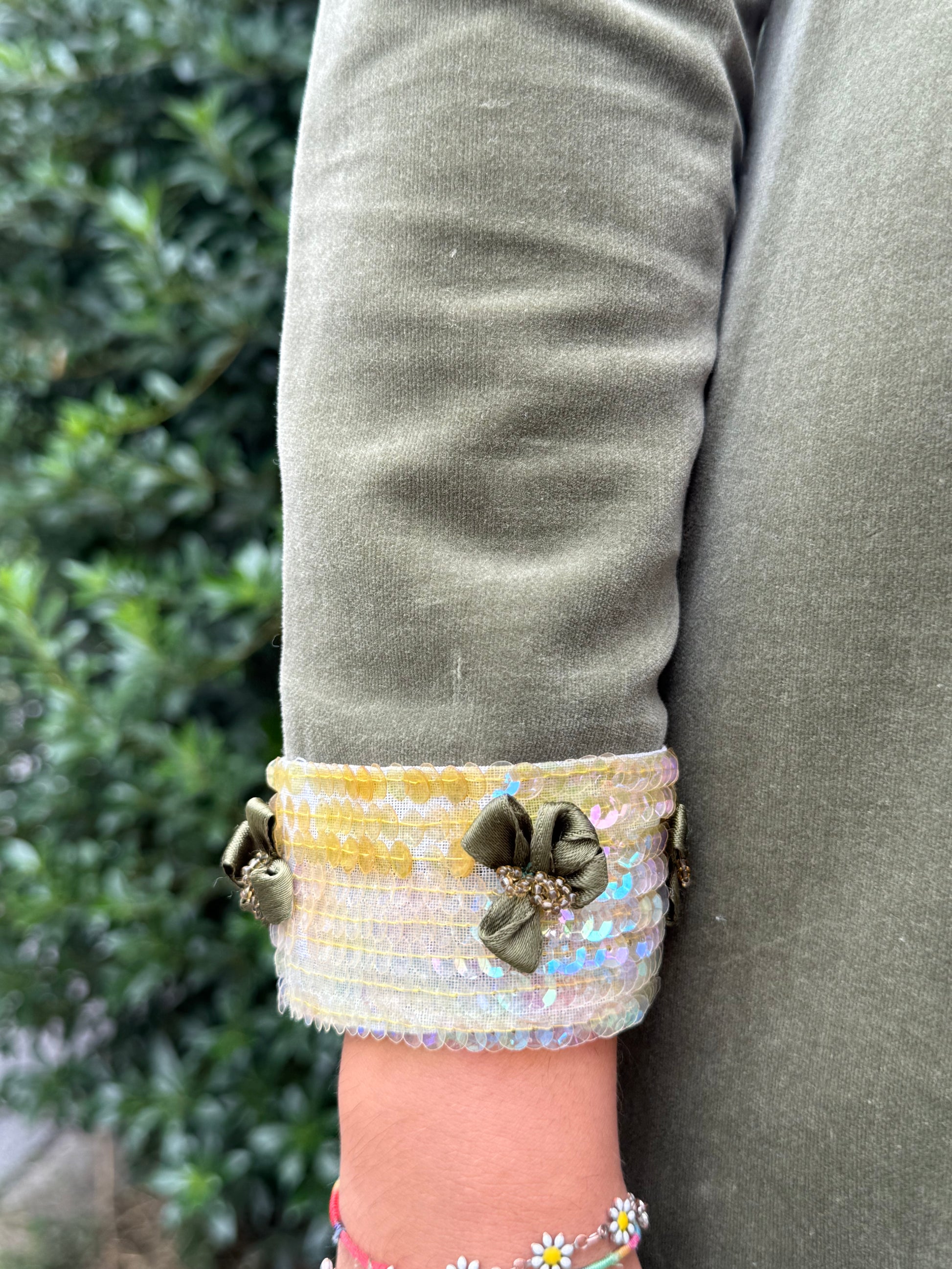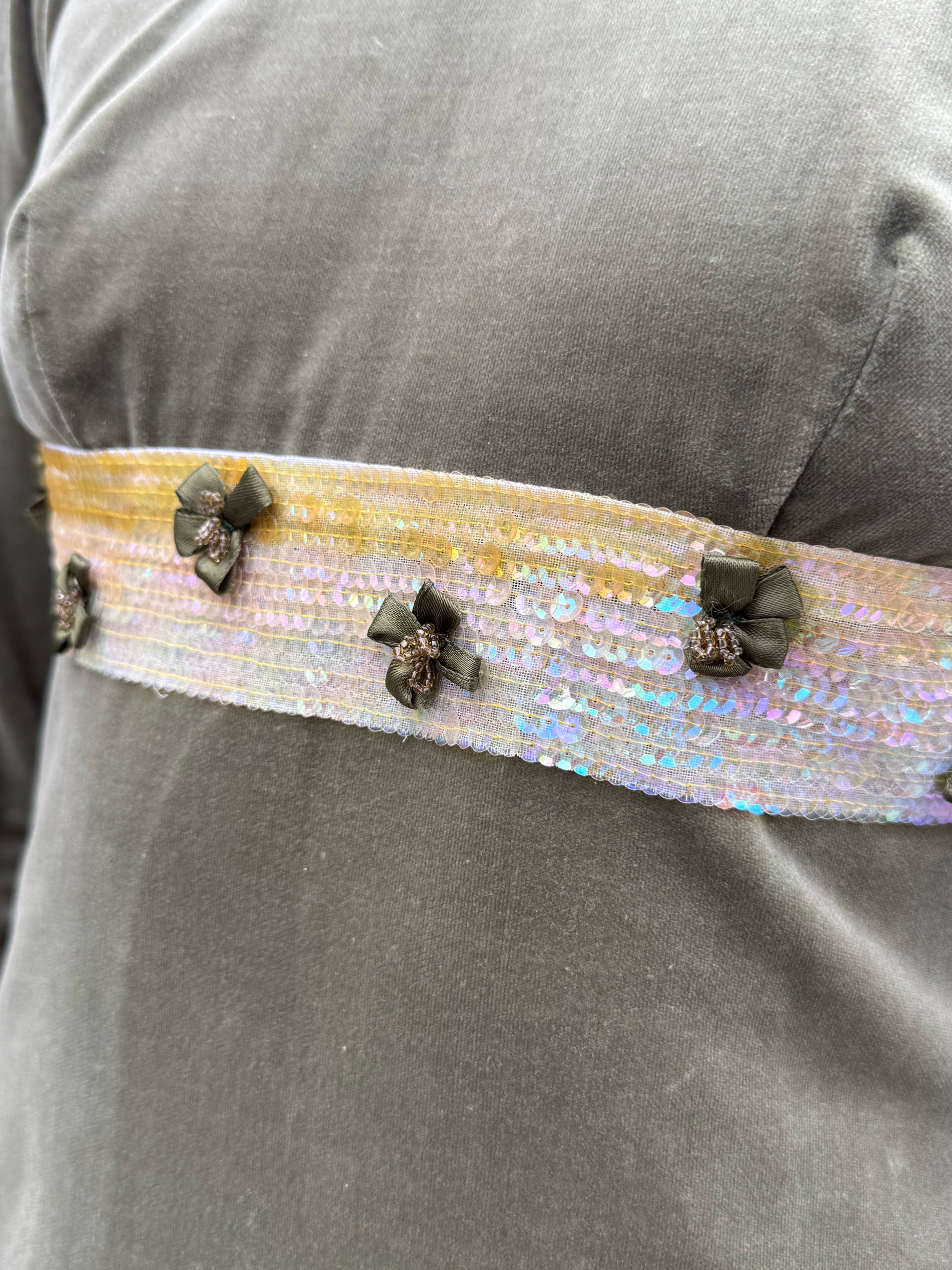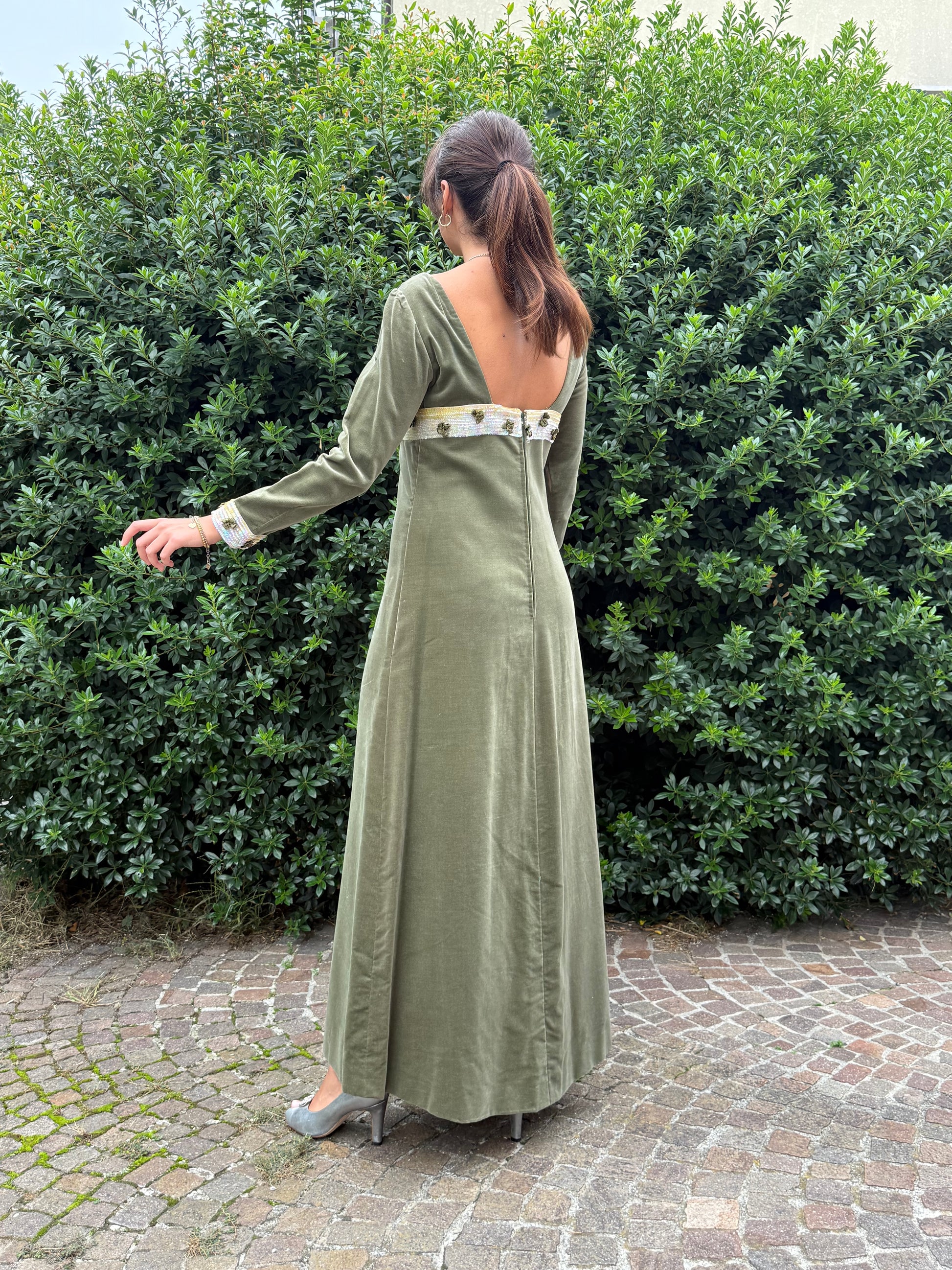 Maxi dress sartoriale in velluto verde pistacchio, che richiama le linee del Regency con accenti medievali. Lo scollo rotondo e le maniche lunghe si sposano con la fascia decorata in vita e ai polsi, arricchita da ricami e inserti luminosi che ne sottolineano l’eleganza artigianale. È un abito che unisce la morbidezza del velluto con dettagli preziosi, trasmettendo un fascino d’altri tempi, perfettamente in linea con le rivisitazioni romantiche degli anni ’70.