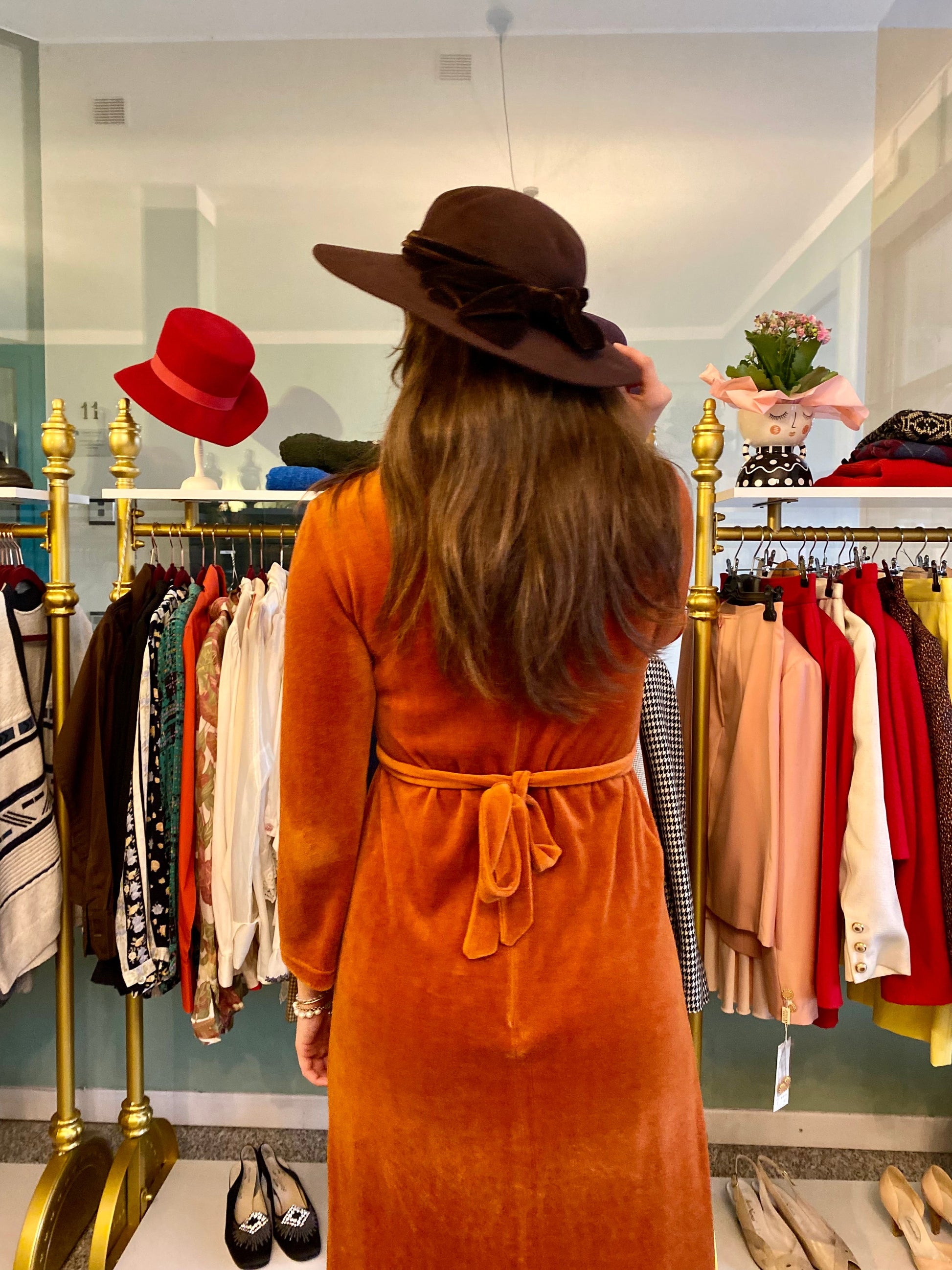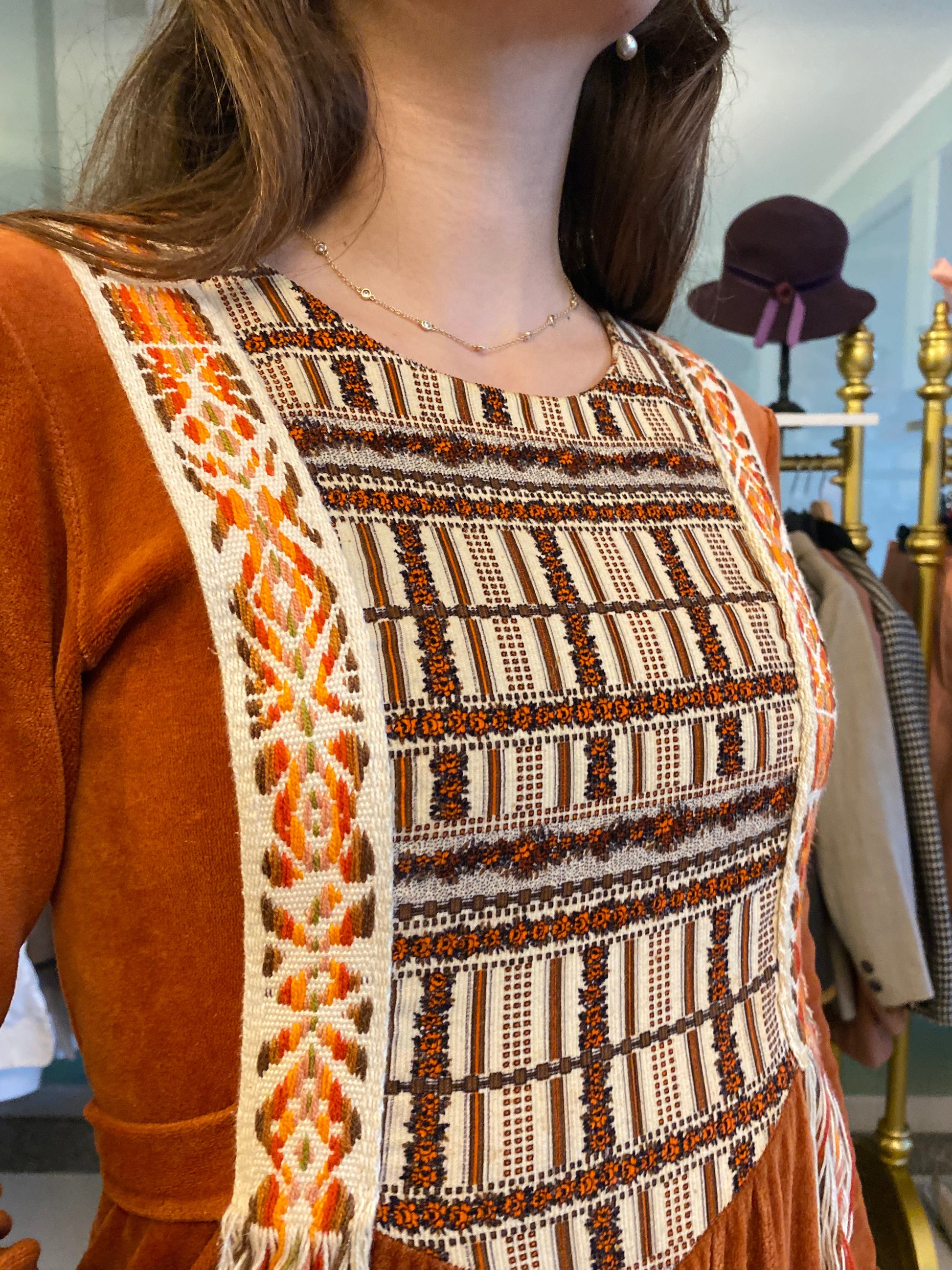 L’abito è davvero iconico del periodo, color ruggine con fantasia etnica sul corpino, che termina con frange