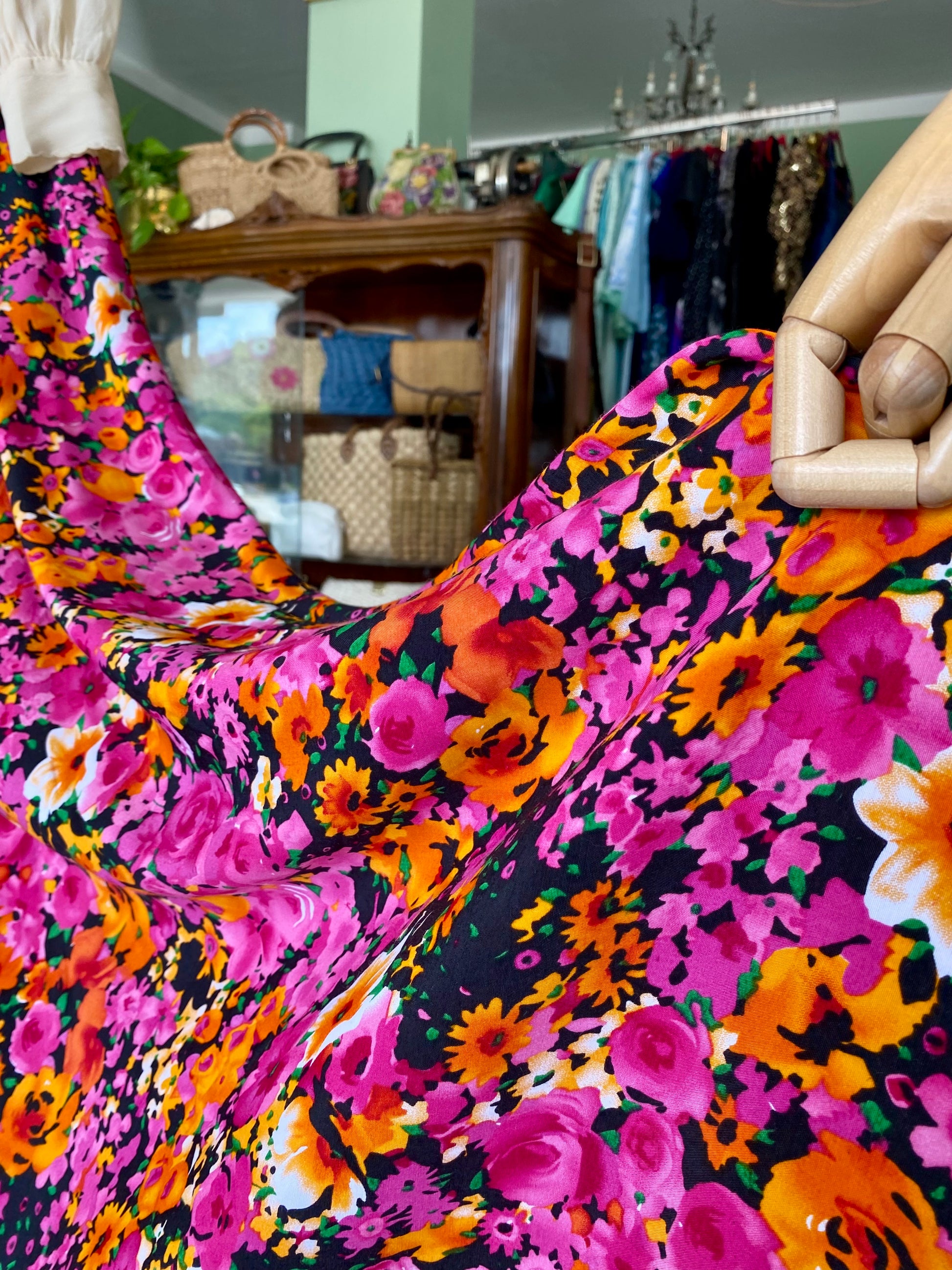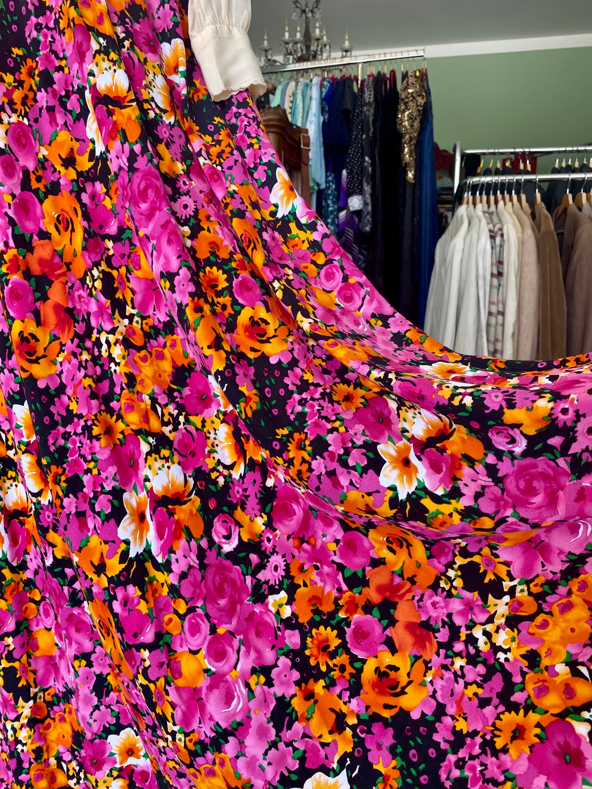 Maxi gonna originale anni ’70 in viscosa fluida, con ampiezza spettacolare, quasi a ruota intera, stampa floreale vivace nei toni del fucsia, arancio e bianco su fondo blu. Un pezzo unico dal forte impatto visivo, perfetto per chi ama i capi d’archivio pieni di personalità.
