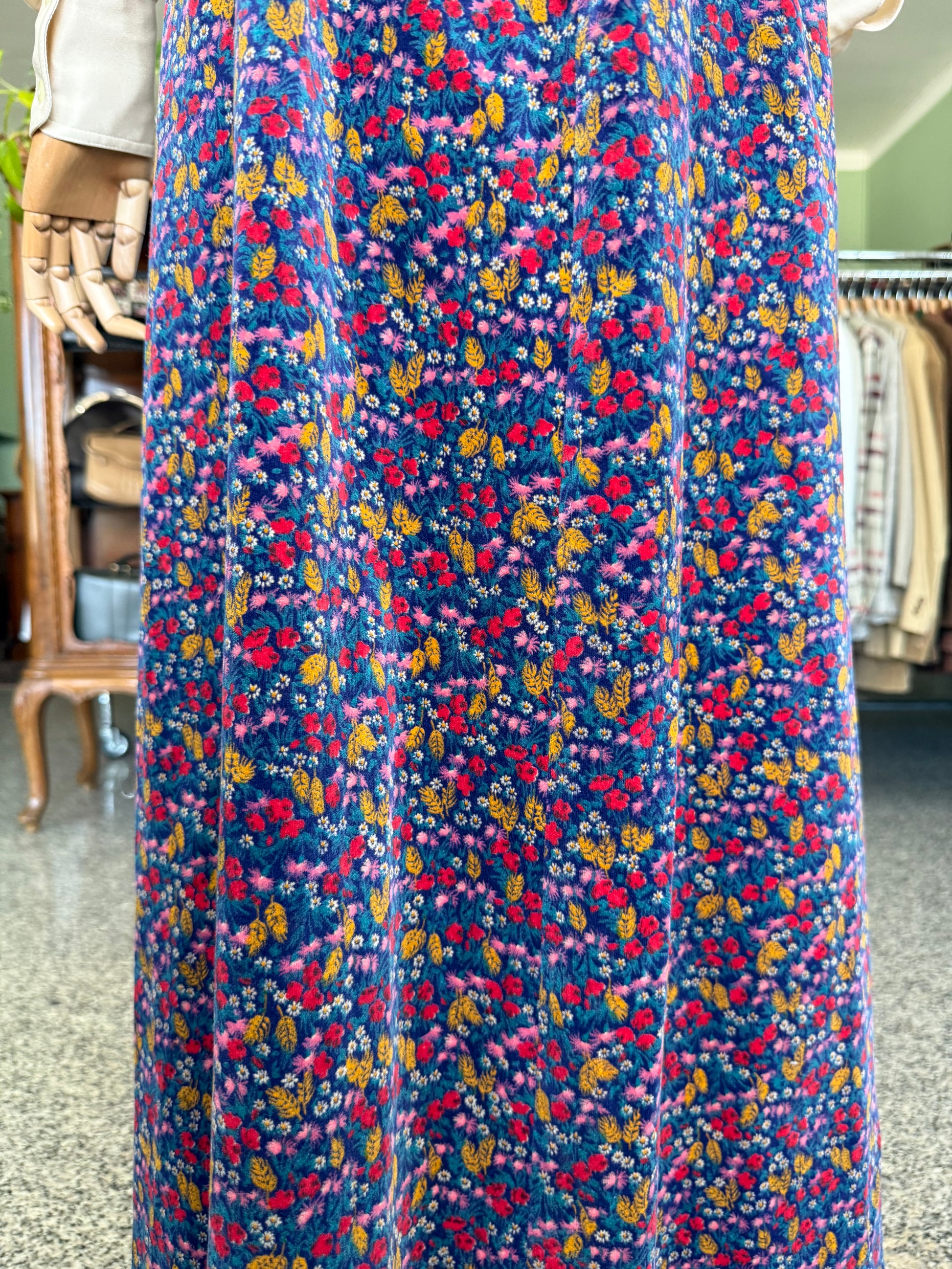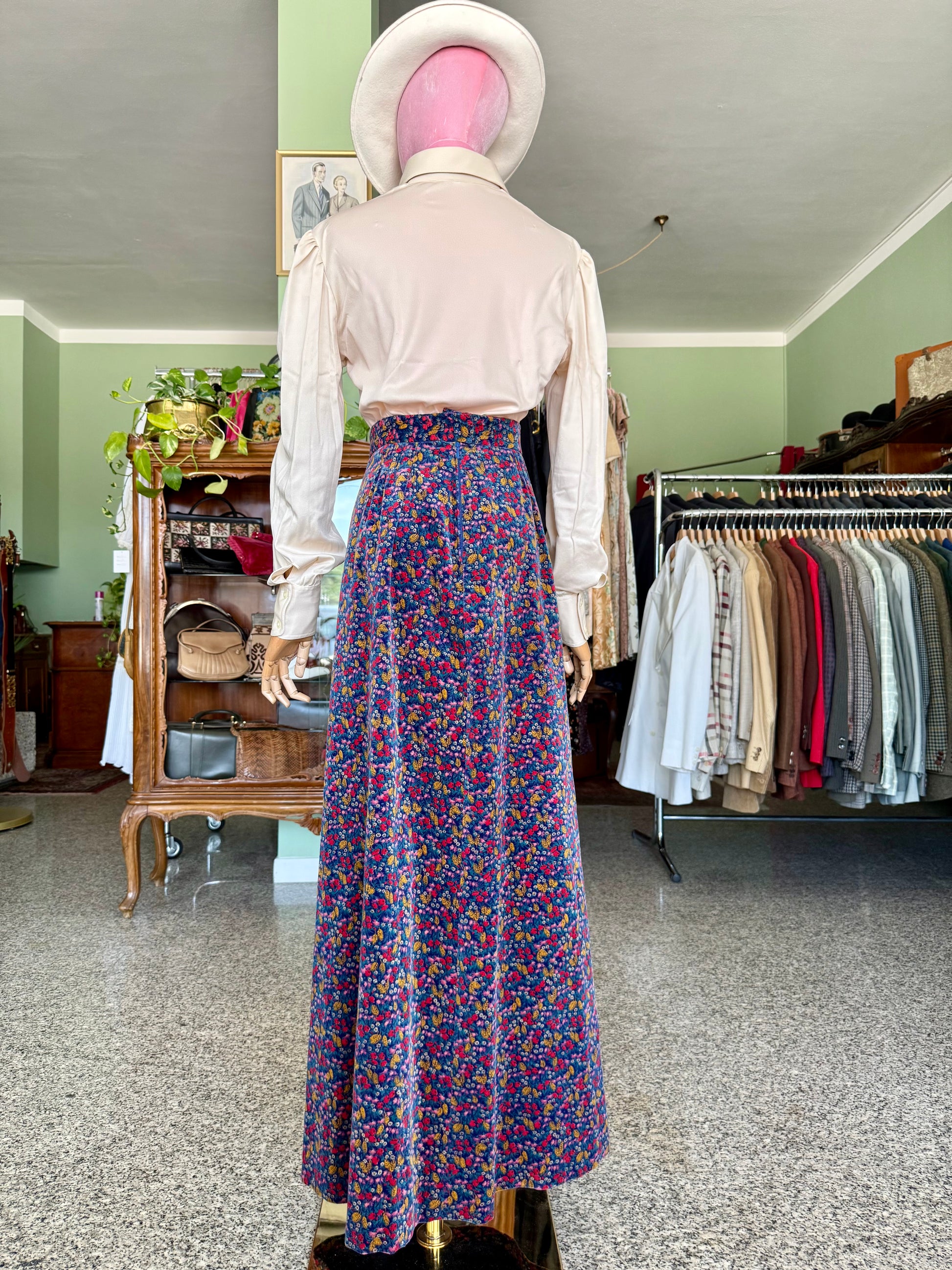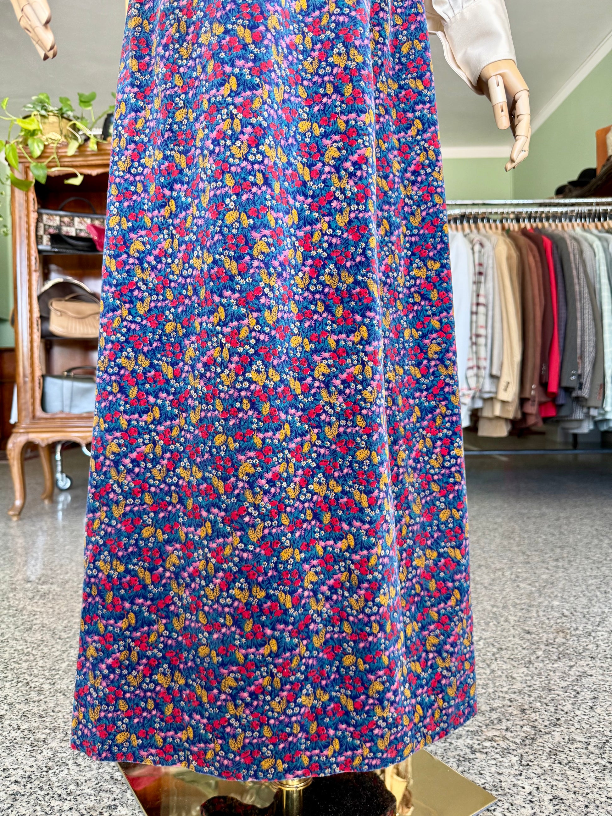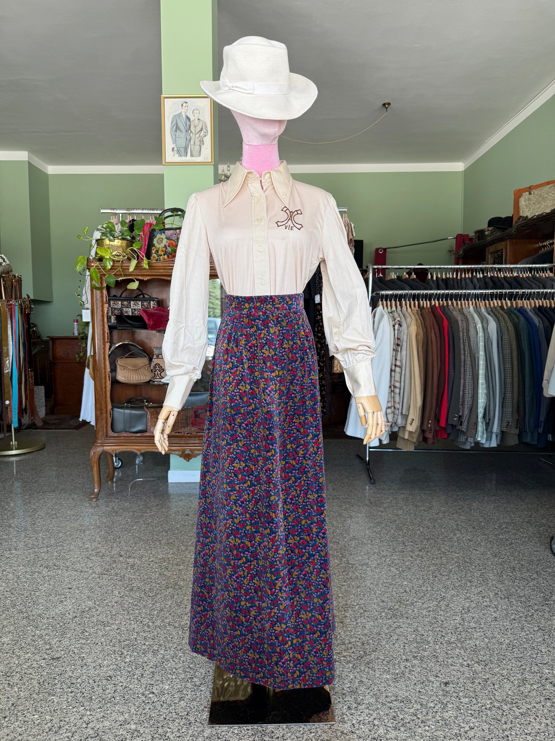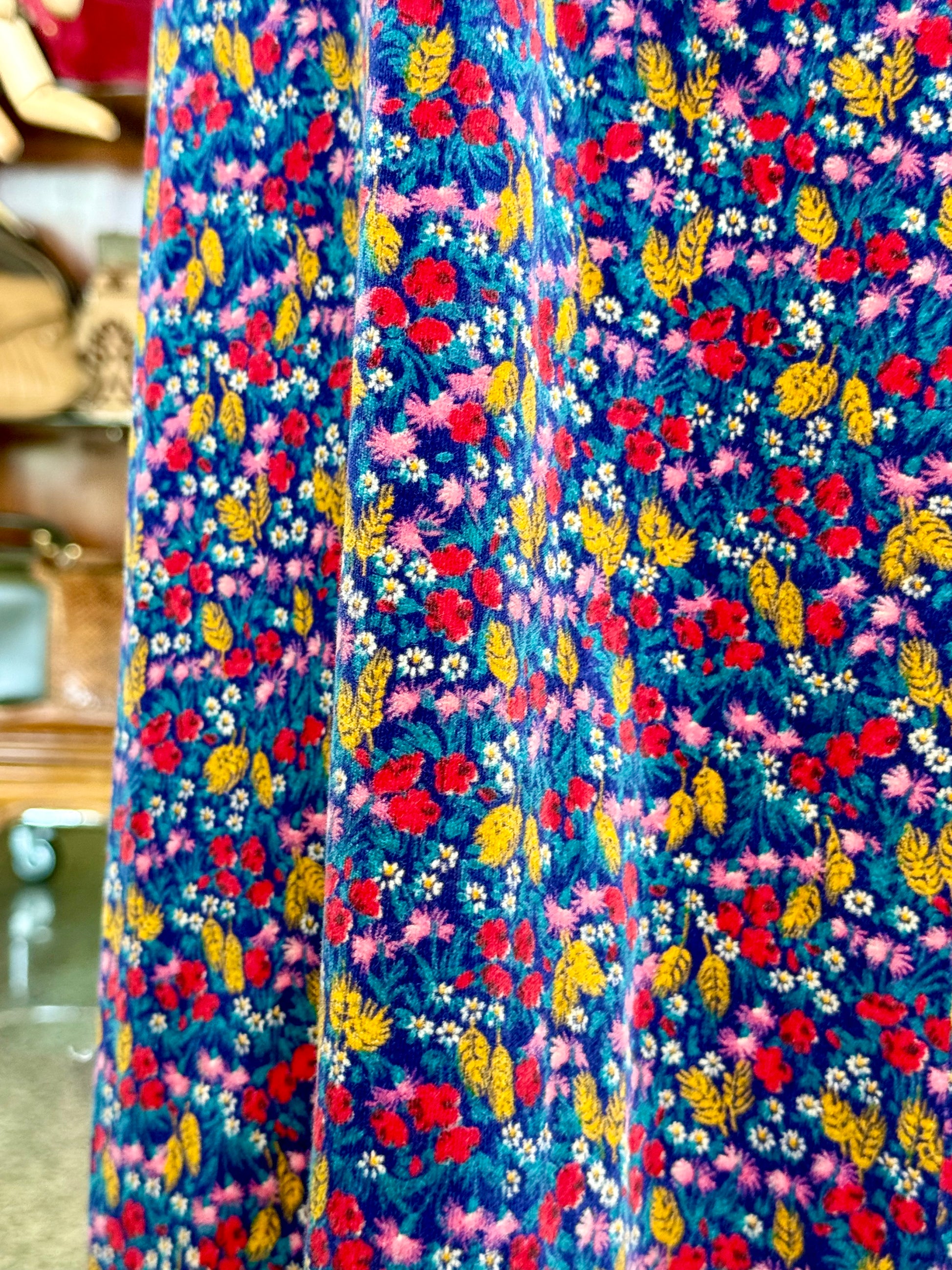 Maxi gonna anni ’70, in velluto morbido stampato con una micro fantasia floreale nei toni del rosso, giallo e blu. La texture vellutata aggiunge profondità e luce ai piccoli fiori, creando un effetto quasi tridimensionale. Il taglio è lineare e avvolgente, con vita alta e caduta elegante che slancia la figura. Porta con sé lo spirito bohémien e romantico degli anni ’70, con un tocco folk sofisticato che richiama i viaggi on the road.