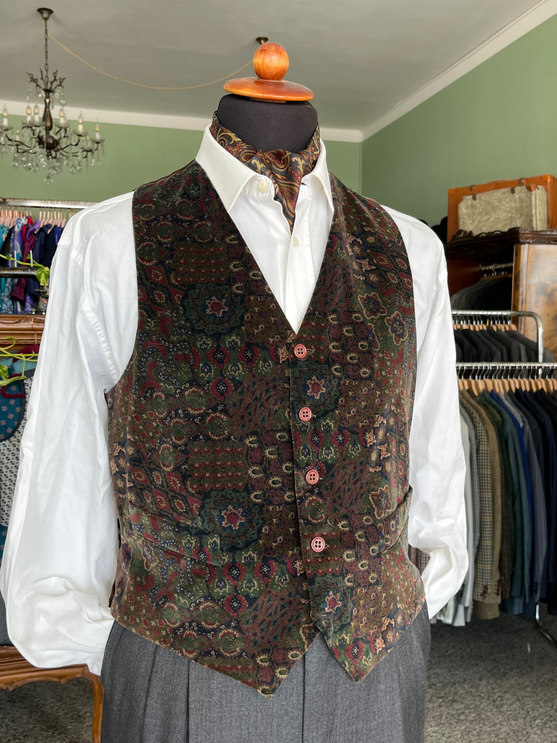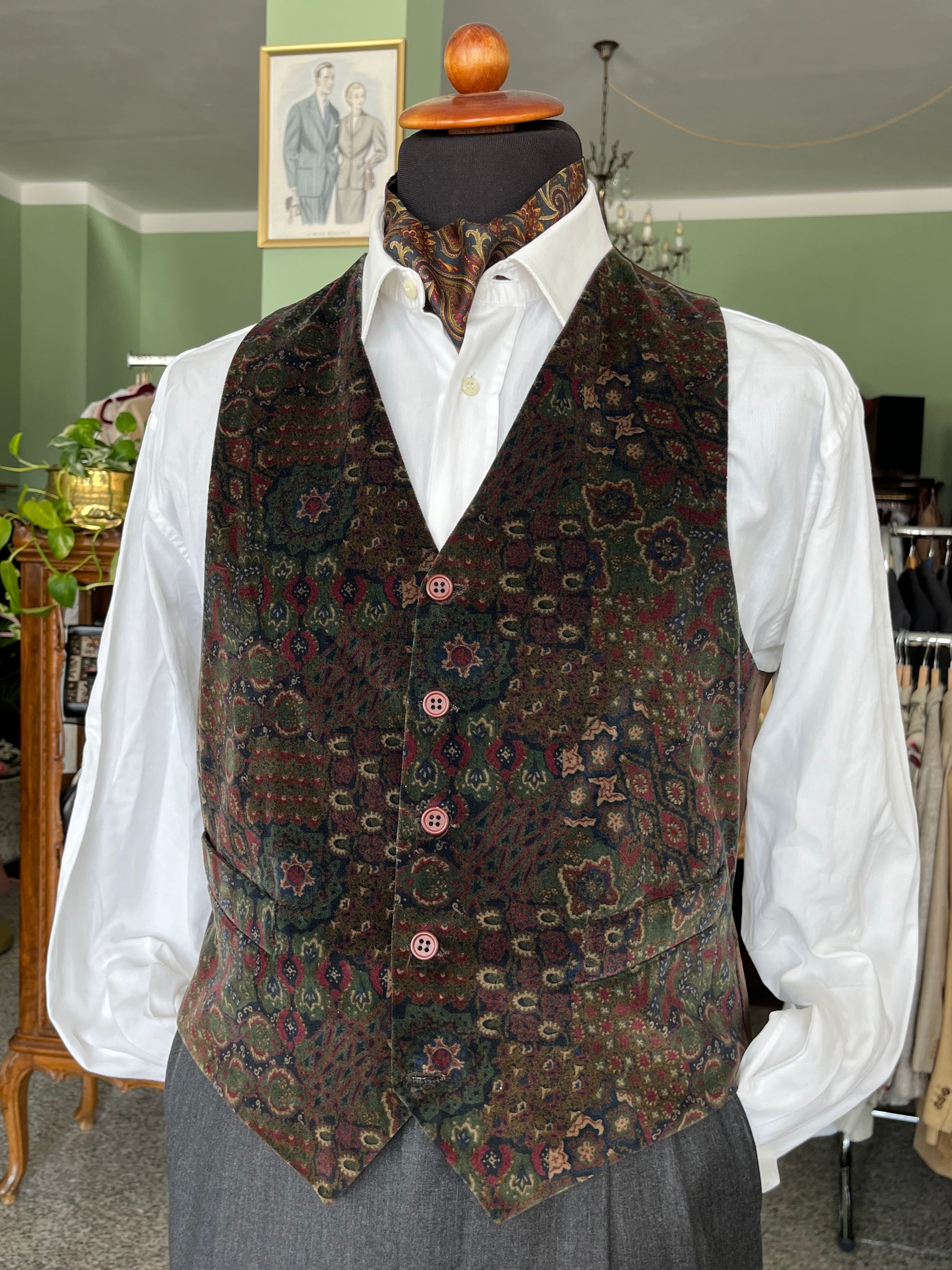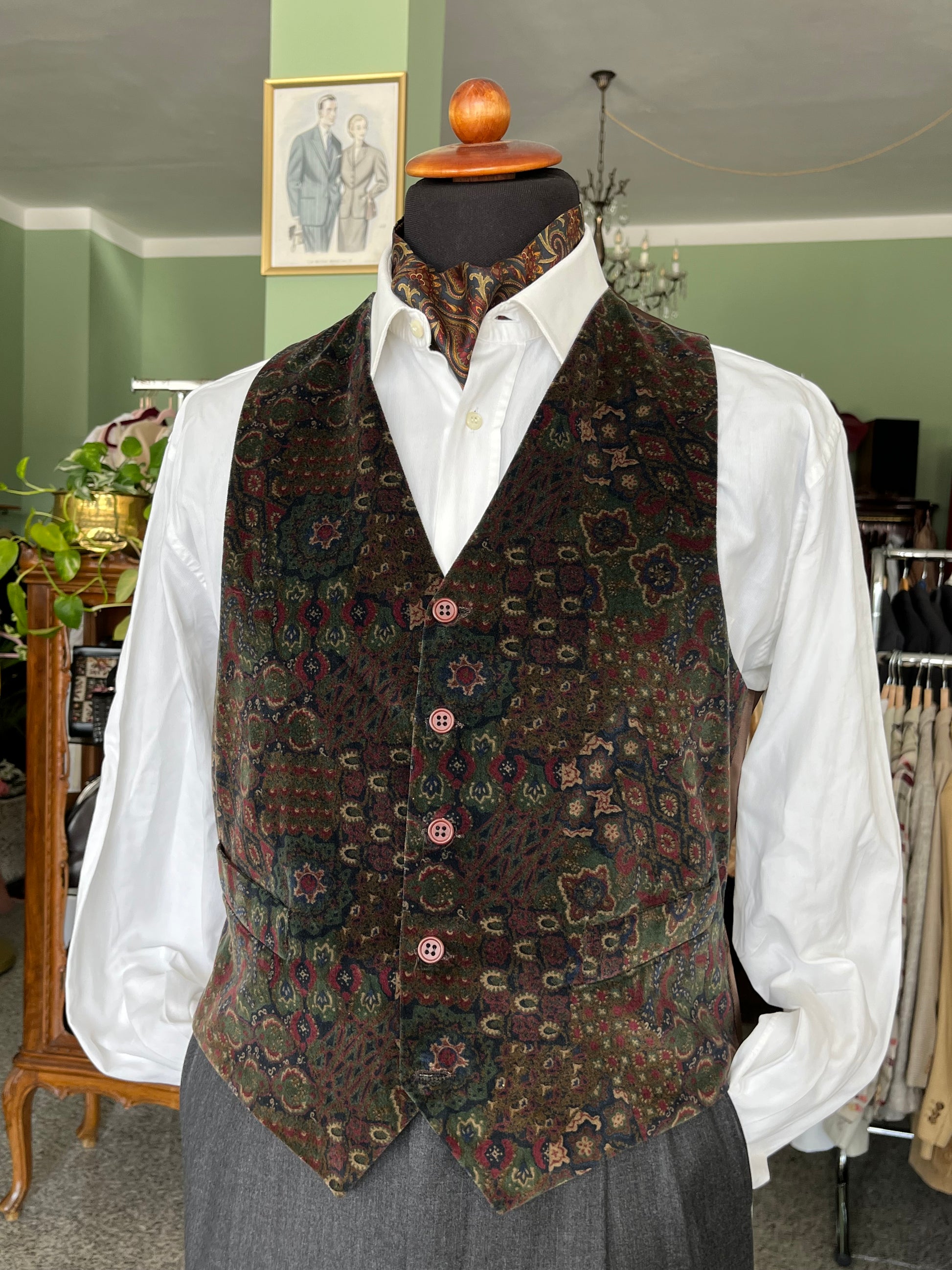 Panciotto anni ‘80 in 100% velluto di cotone, sui toni del marrone e del verde con fantasia astratta.