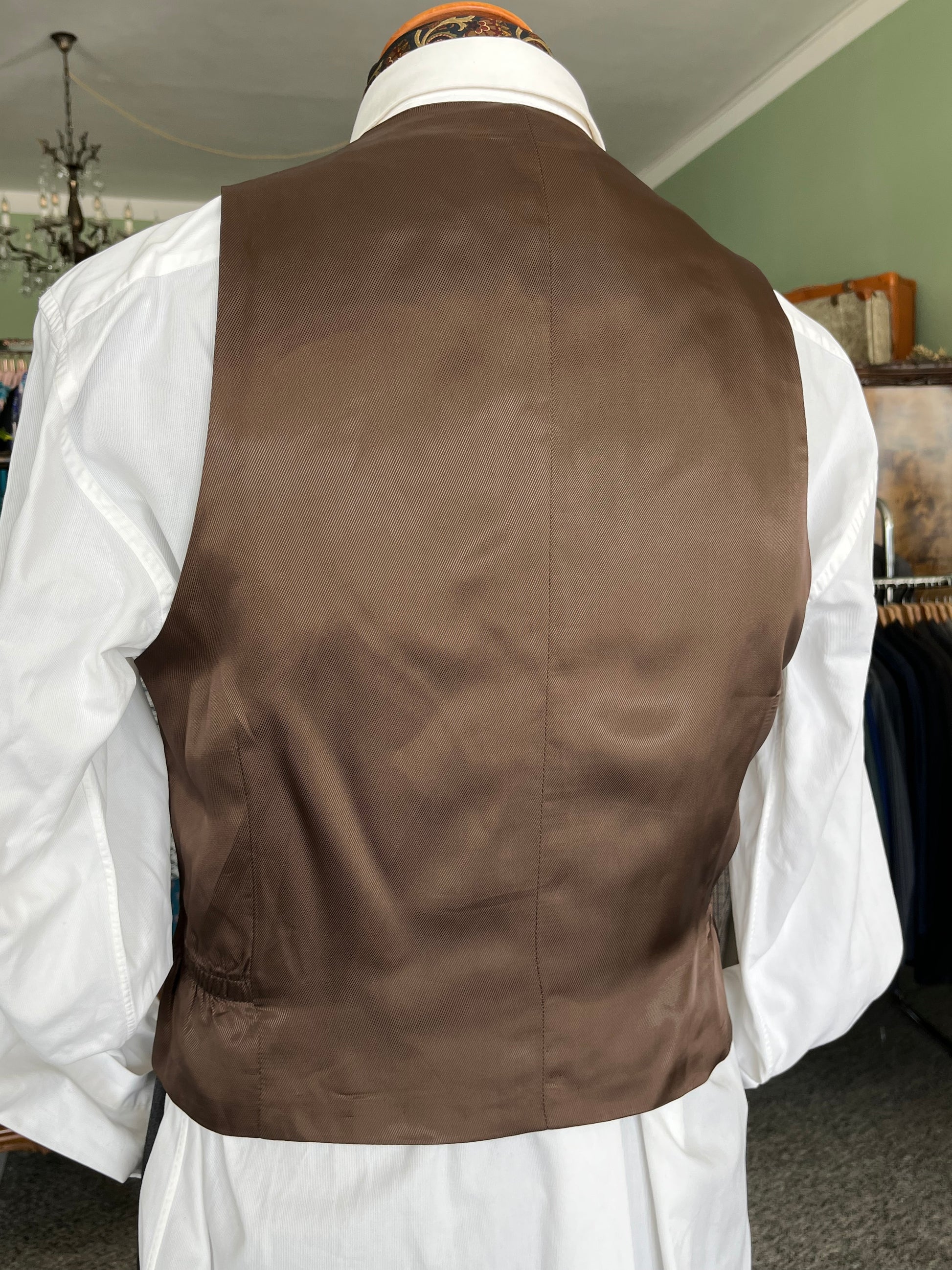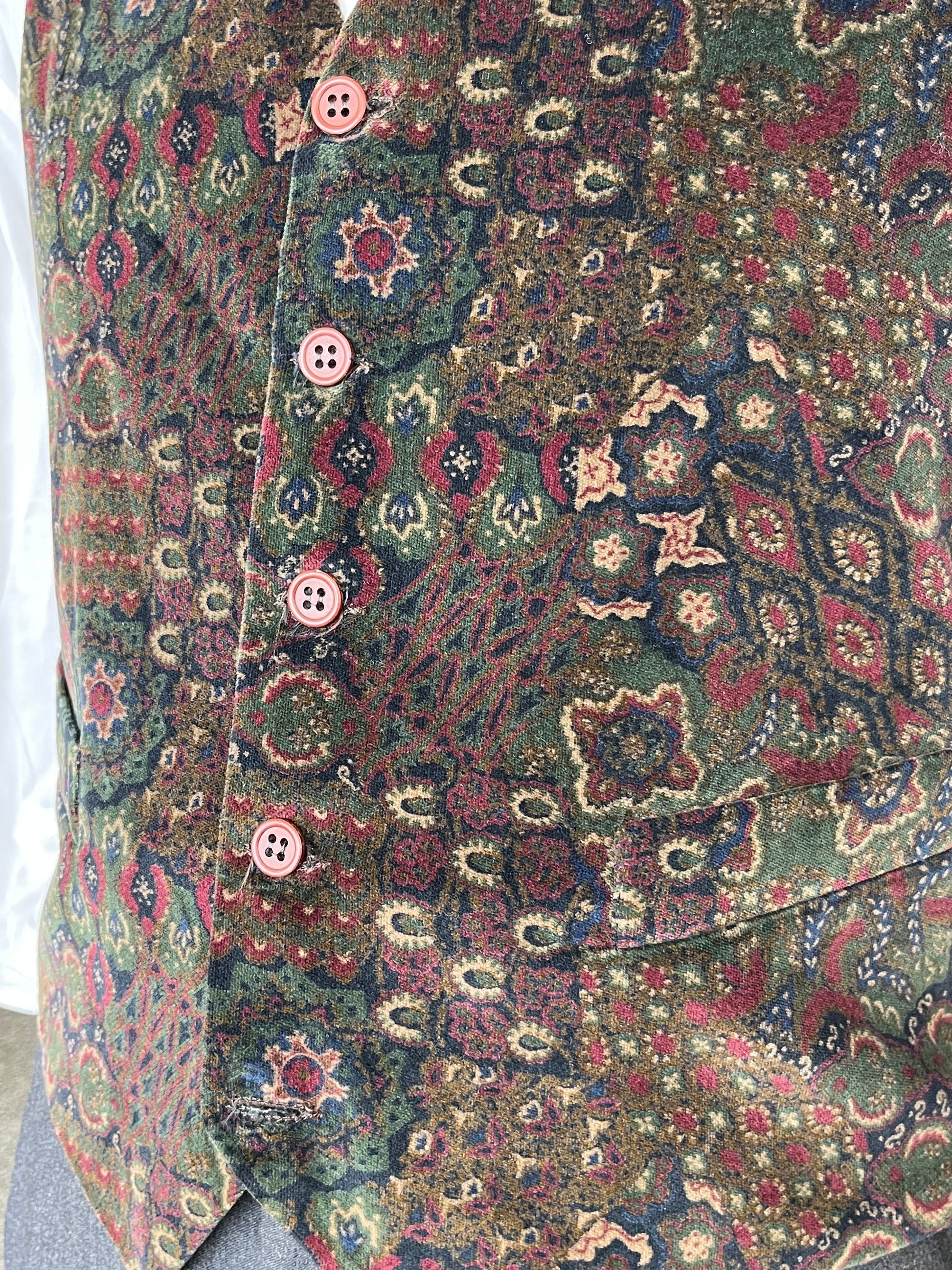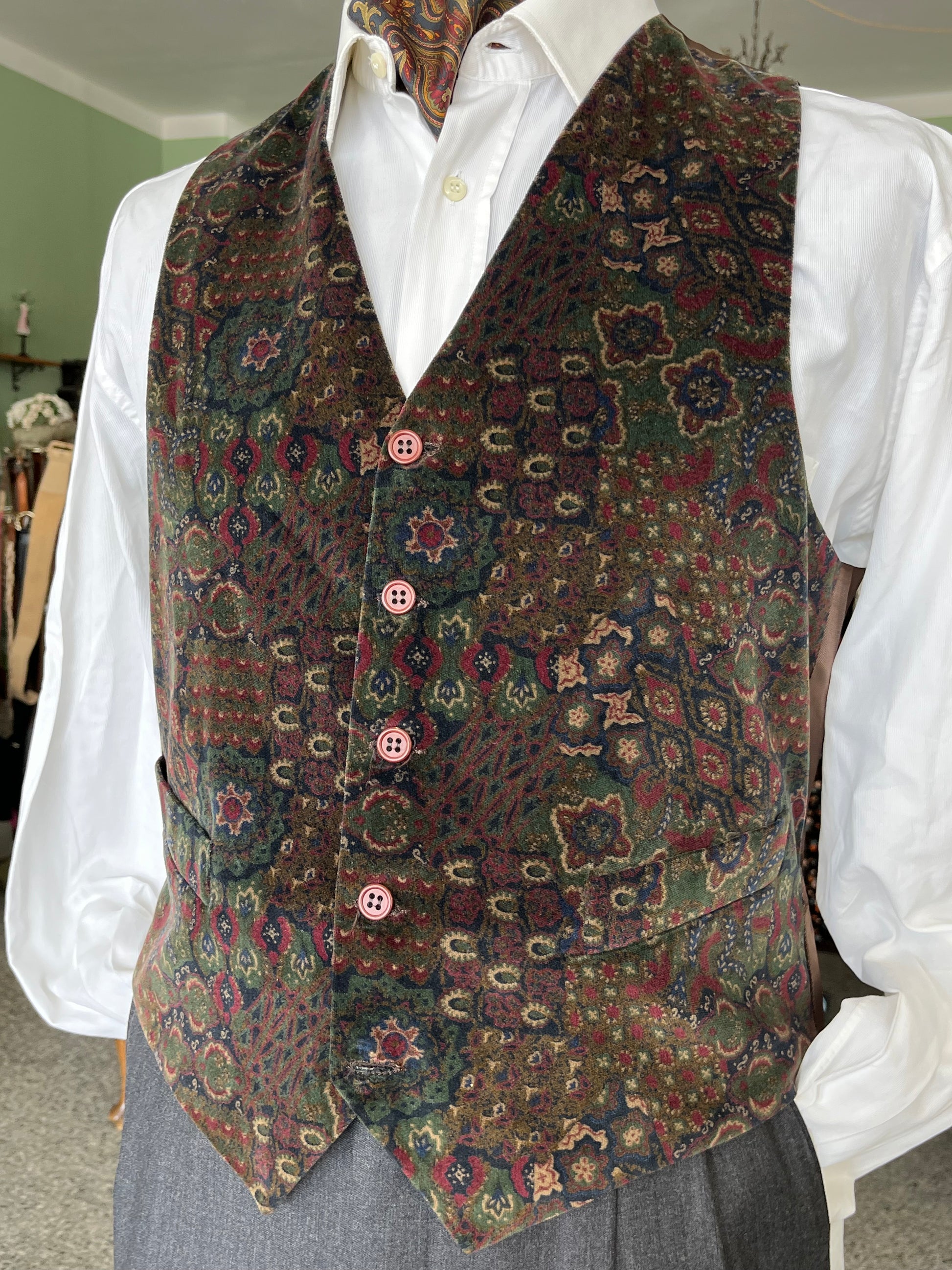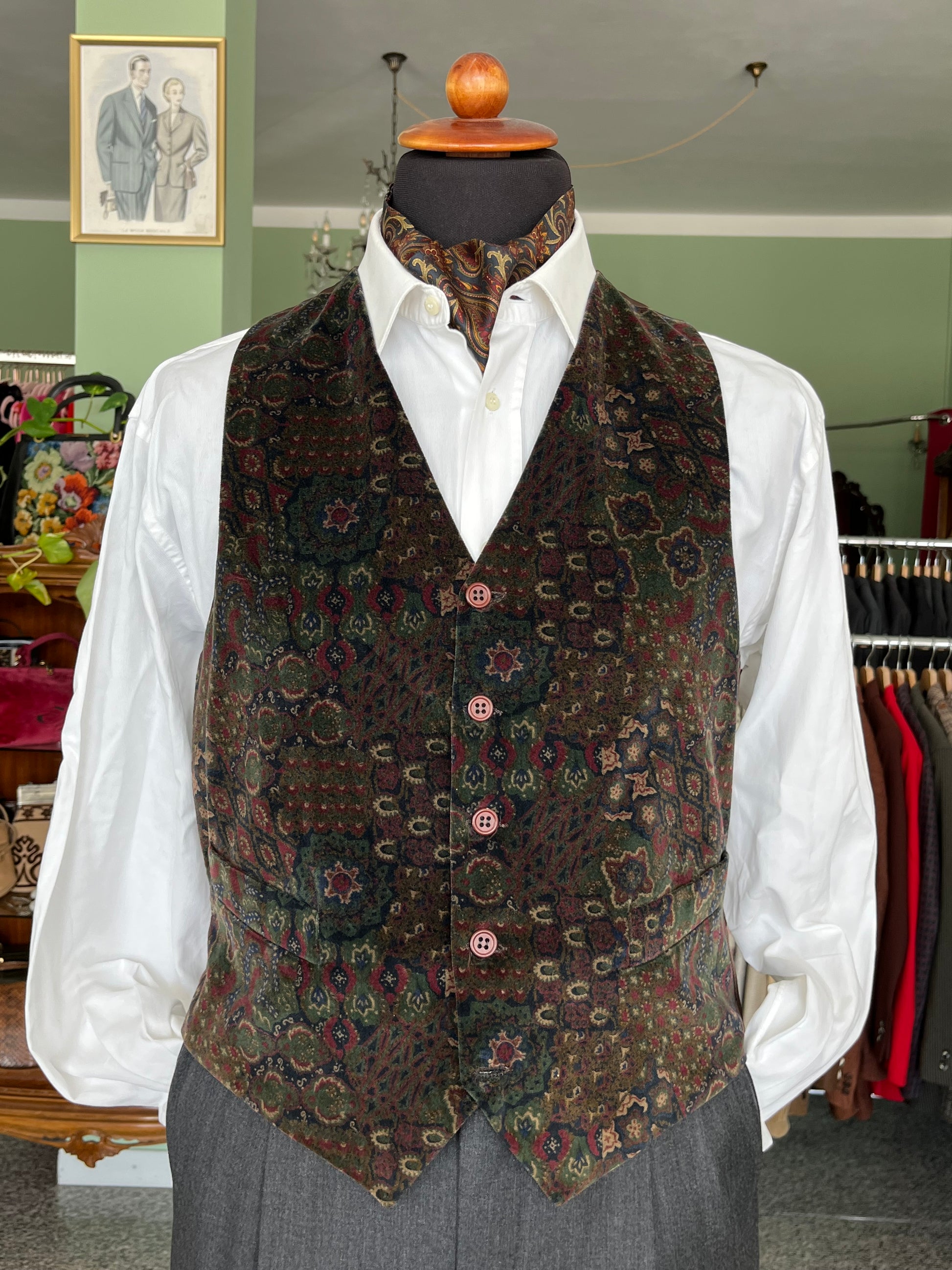 Panciotto anni ‘80 in 100% velluto di cotone, sui toni del marrone e del verde con fantasia astratta.