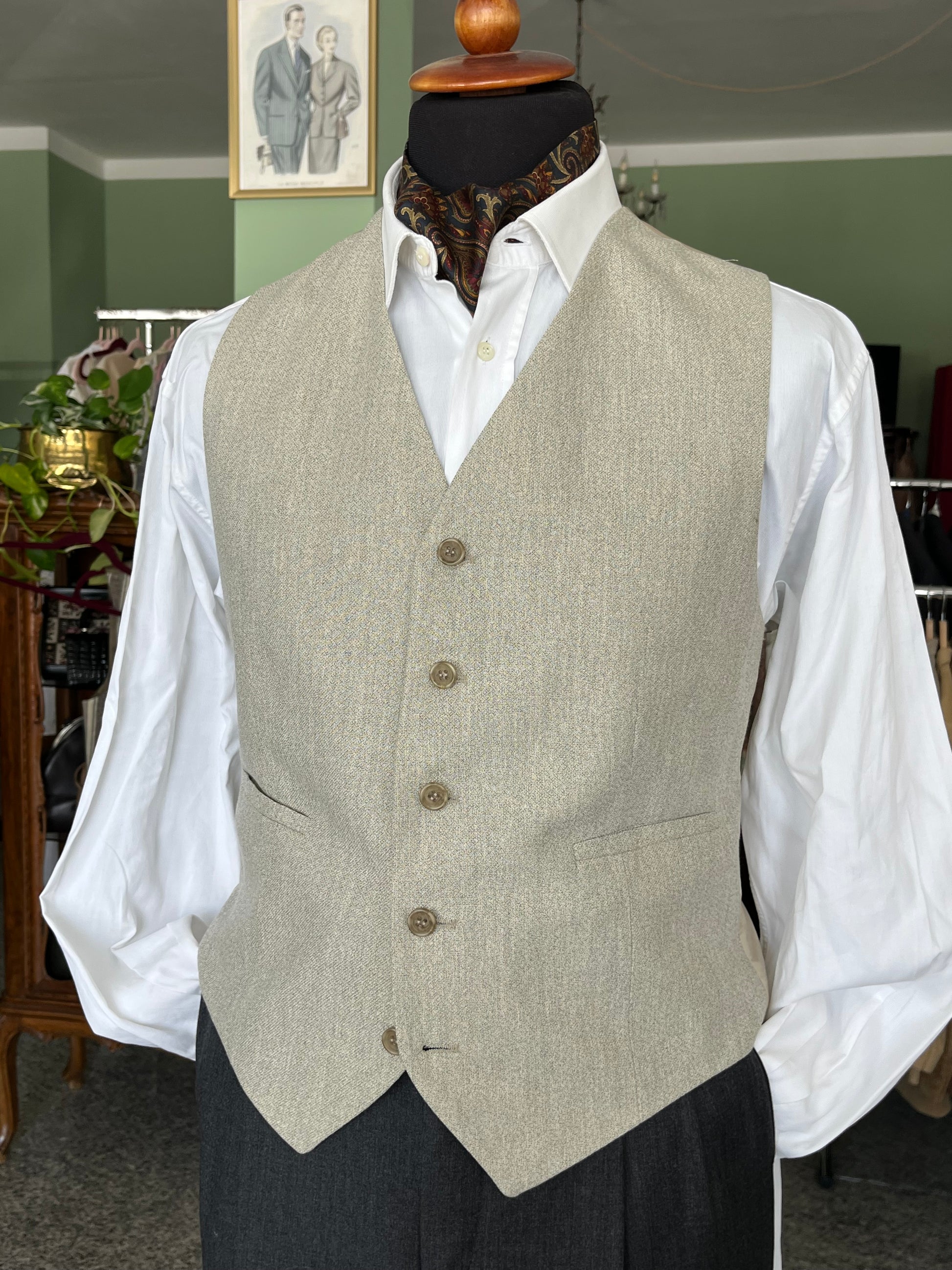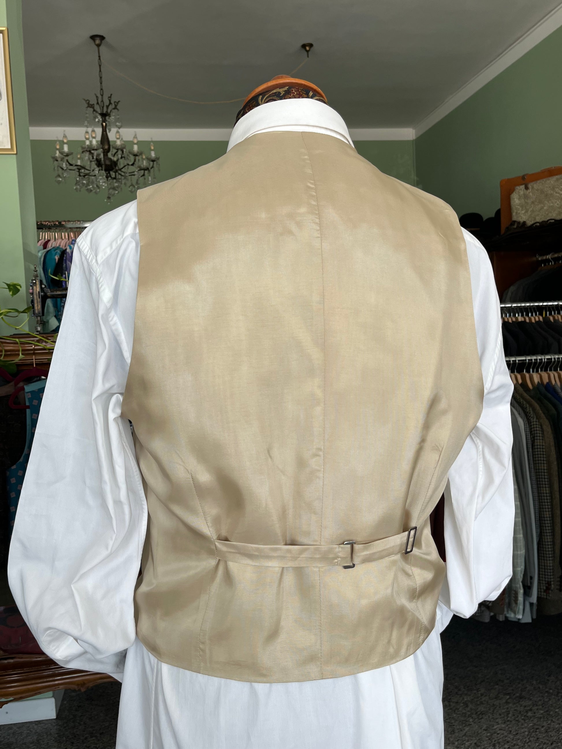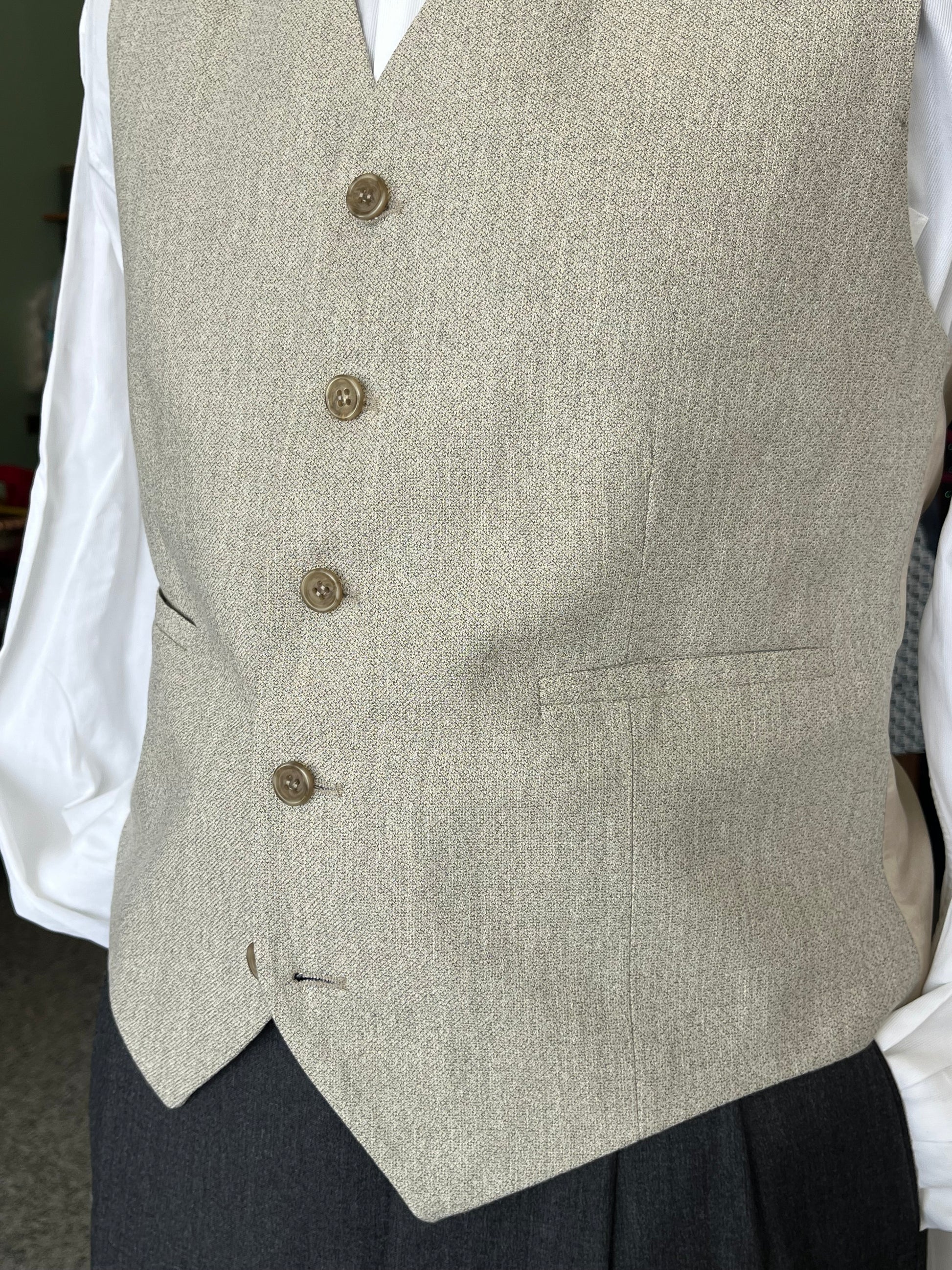 Il panciotto presenta abbottonatura a cinque bottoni, due taschini a filetto sul davanti e fibbia scorrevole sul retro.
