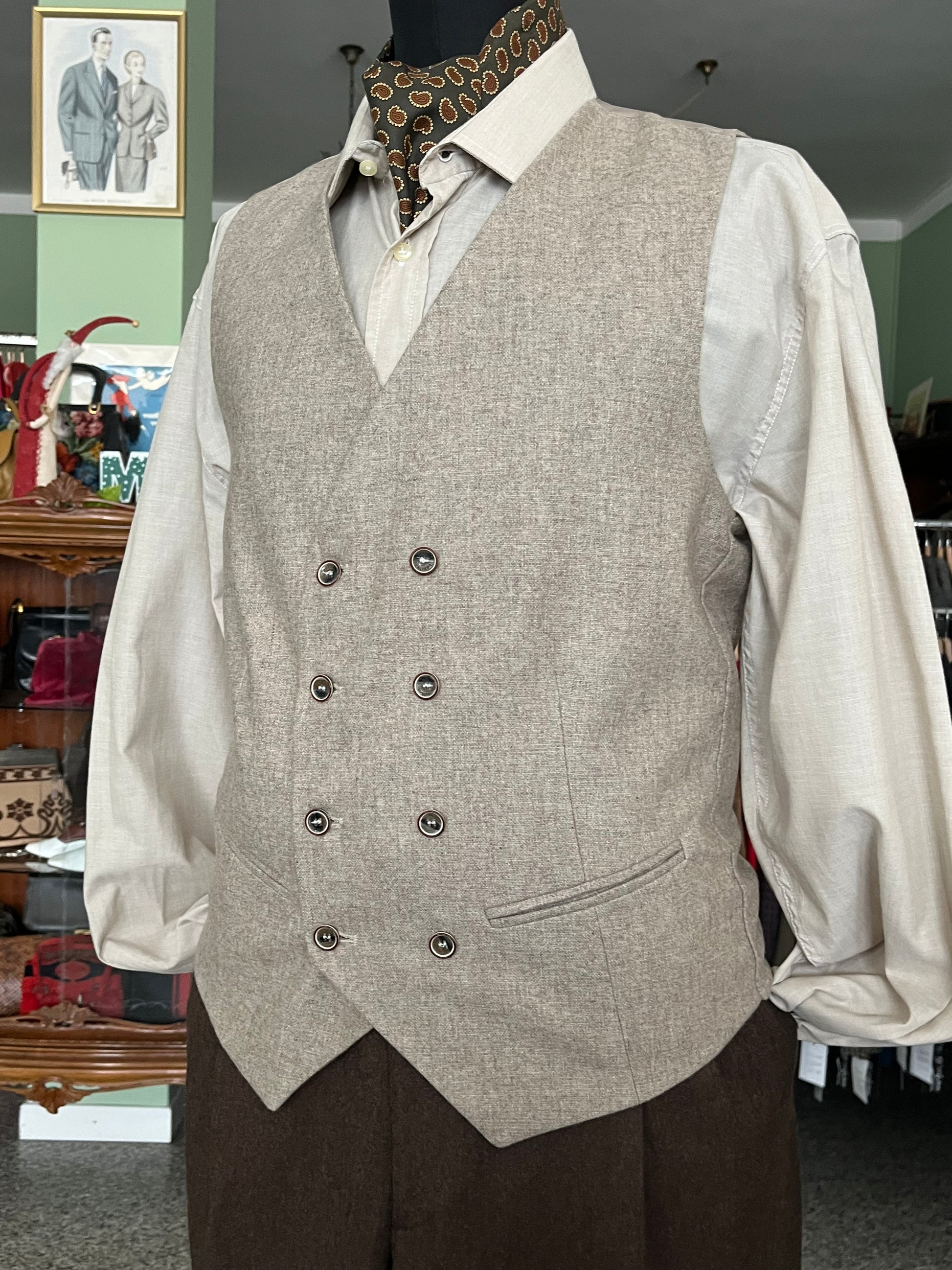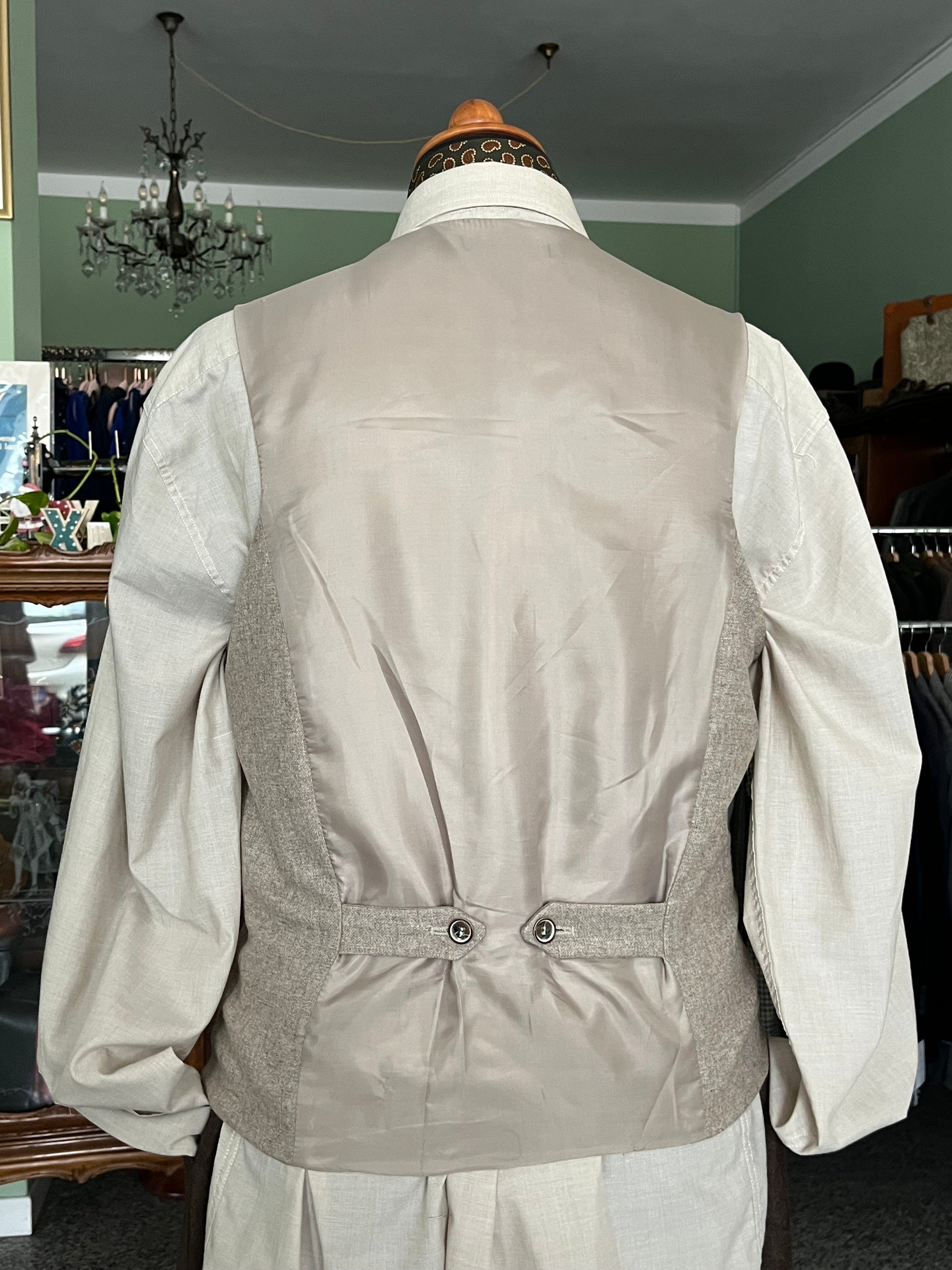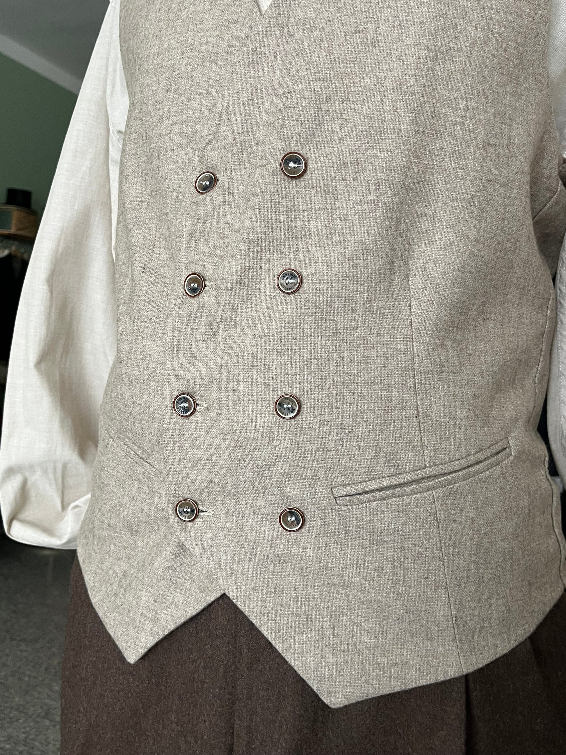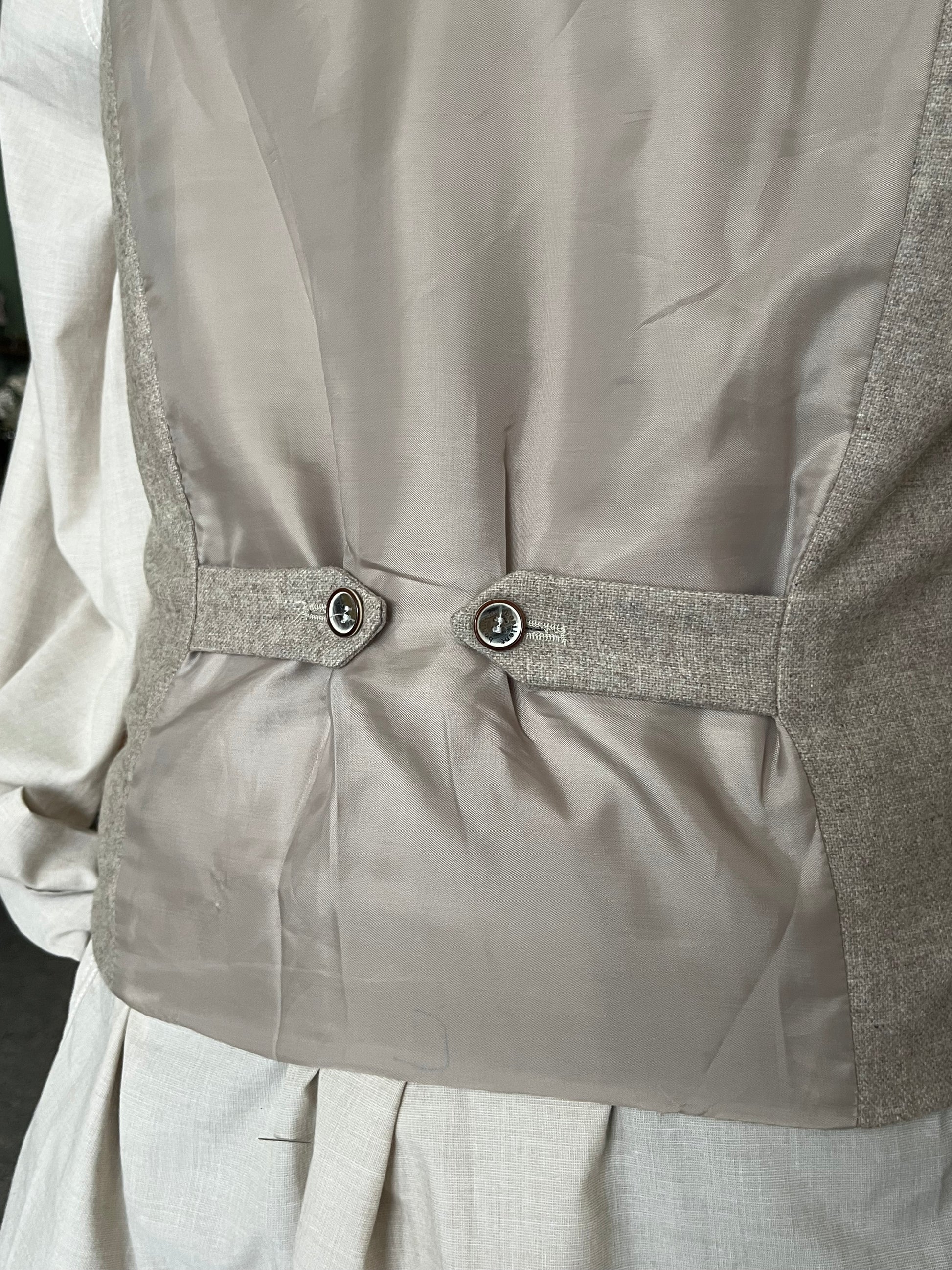 Il panciotto presenta abbottonatura doppiopetto, due taschini a filetto sul davanti e regolazione a bottoni sul retro.