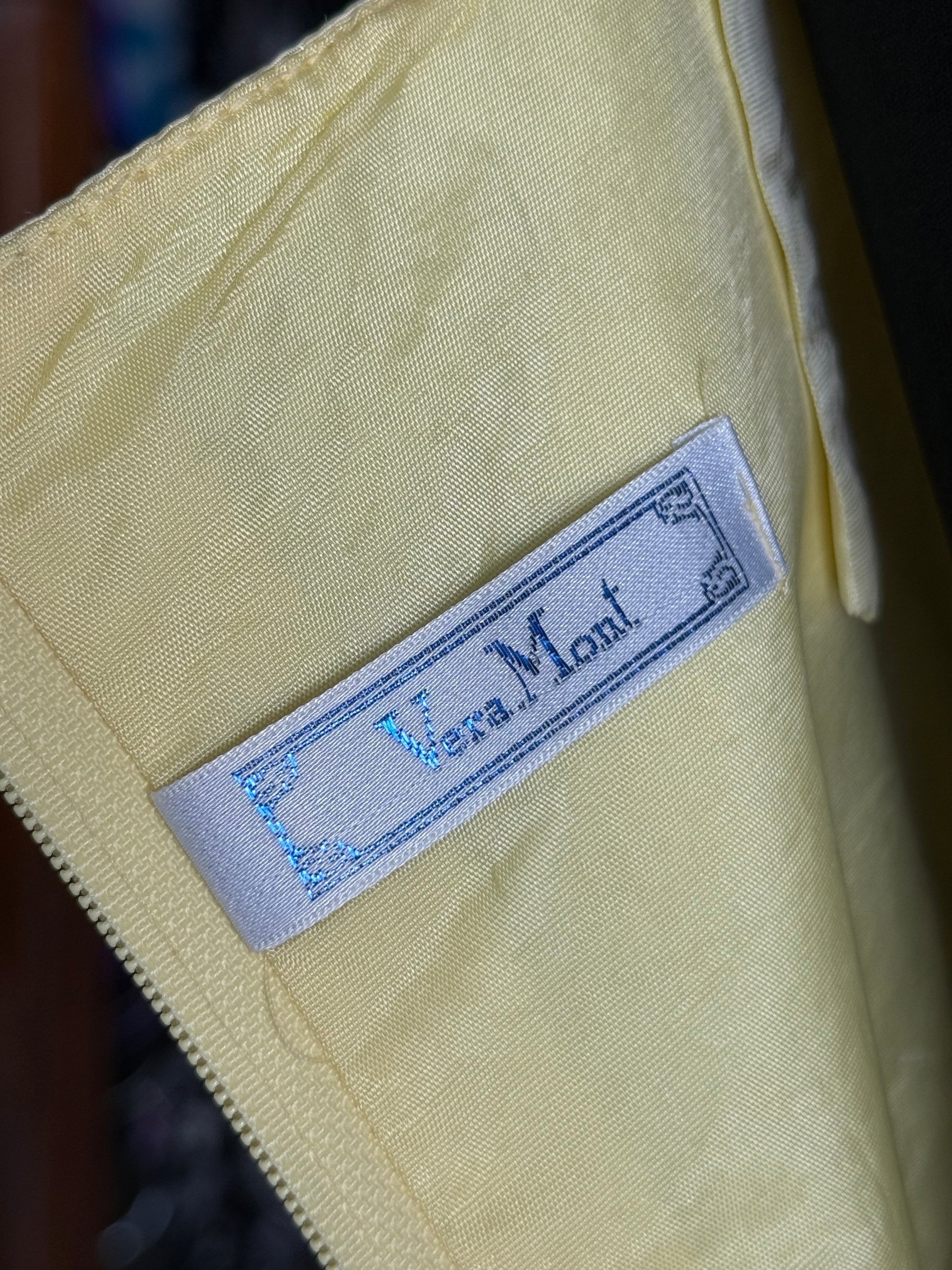 Party dress anni ‘80 Vera Mont, color giallo pastello effetto moirè di seta (marmorizzato). L’abito presenta un’ala di rouches sul corpino con un fiore gioiello. Il modello segna il punto vita e la gonna scende lunga e ampia.