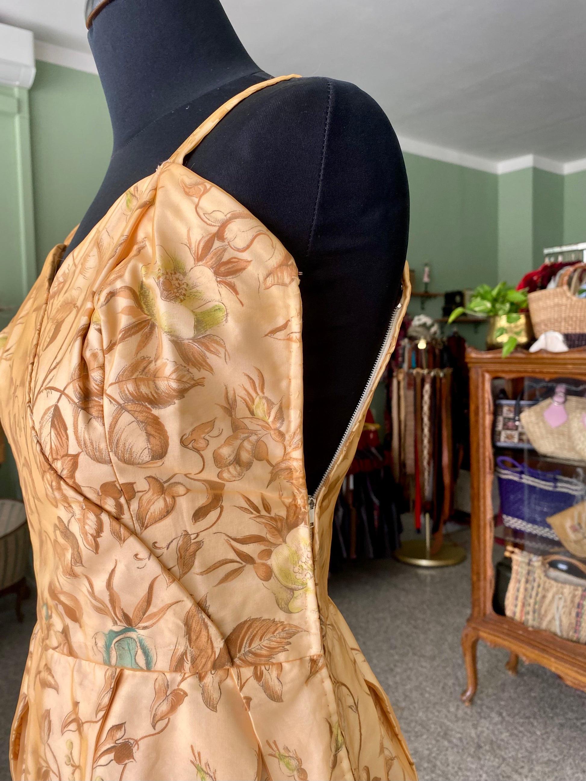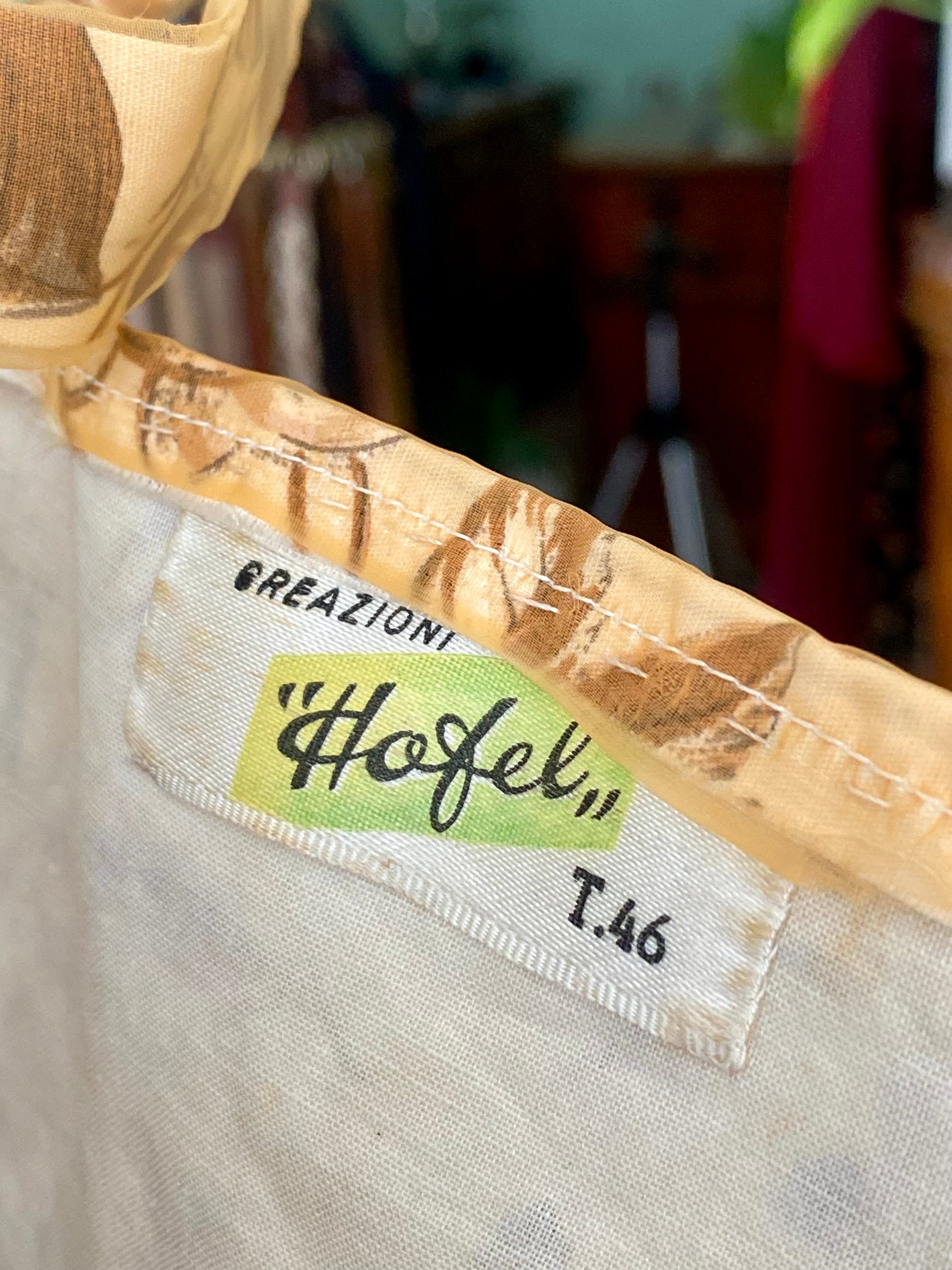 Abito originale anni ’50 firmato “Creazioni Hofel”, esempio perfetto di pronto moda italiana del dopoguerra. Il modello, con corpino sagomato e ampia gonna a pieghe, è realizzato in un pregiato cotone strutturato, dalla mano inamidata, che conferisce volume e una resa impeccabile. L’intero abito è sovrastato da un sottilissimo velo di organza stampata, con motivi floreali nei toni seppia, verde salvia e azzurro polvere: un dettaglio raffinato che dona profondità visiva e una leggera trasparenza delicata. Capo raro, femminile e di grande valore collezionistico, tipico dell’eleganza di metà Novecento.