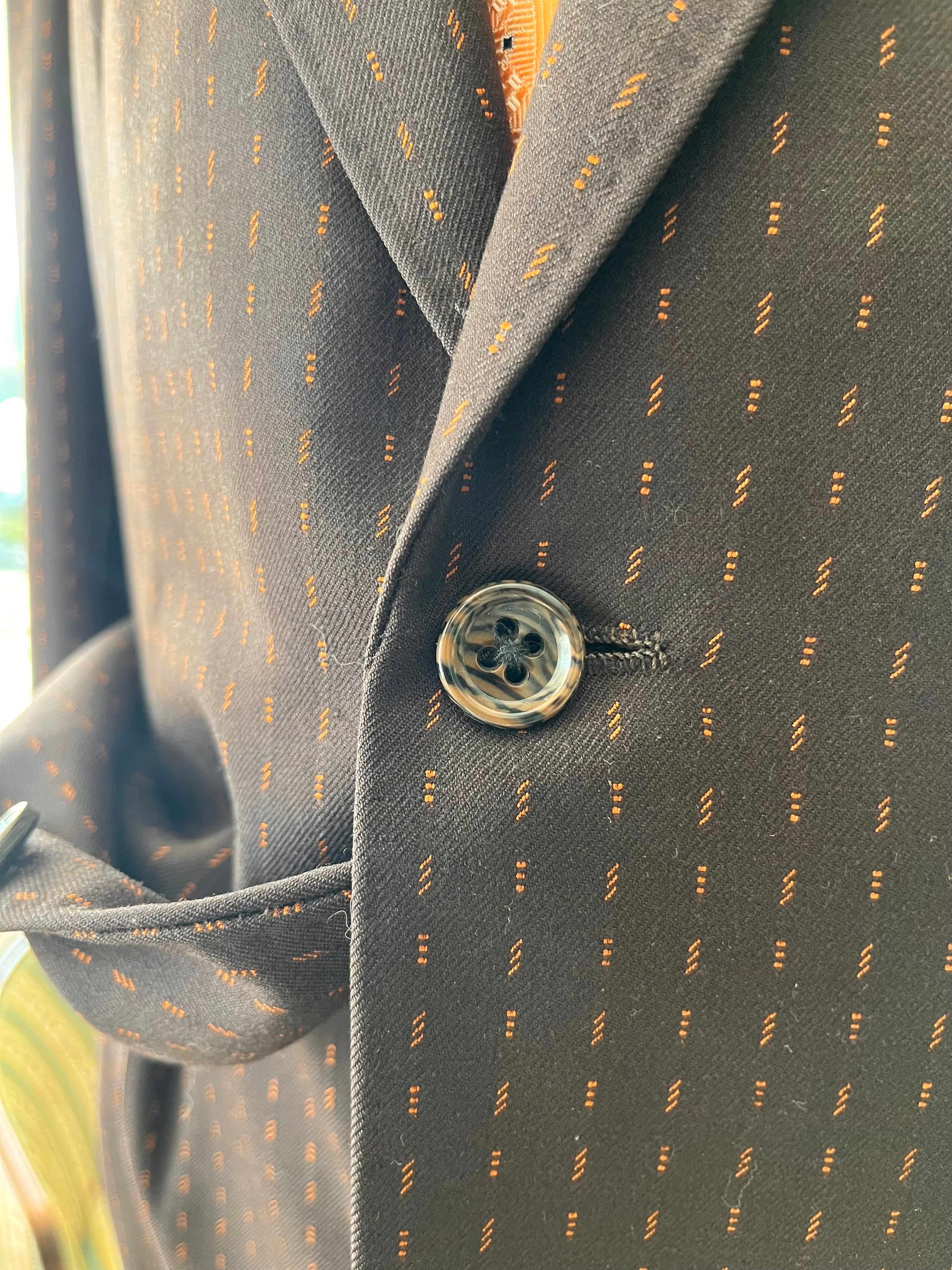 Il tessuto è un 100% lana, di colore marrone con fantasia a righe tratteggiate arancio, ideale per la stagione fredda.