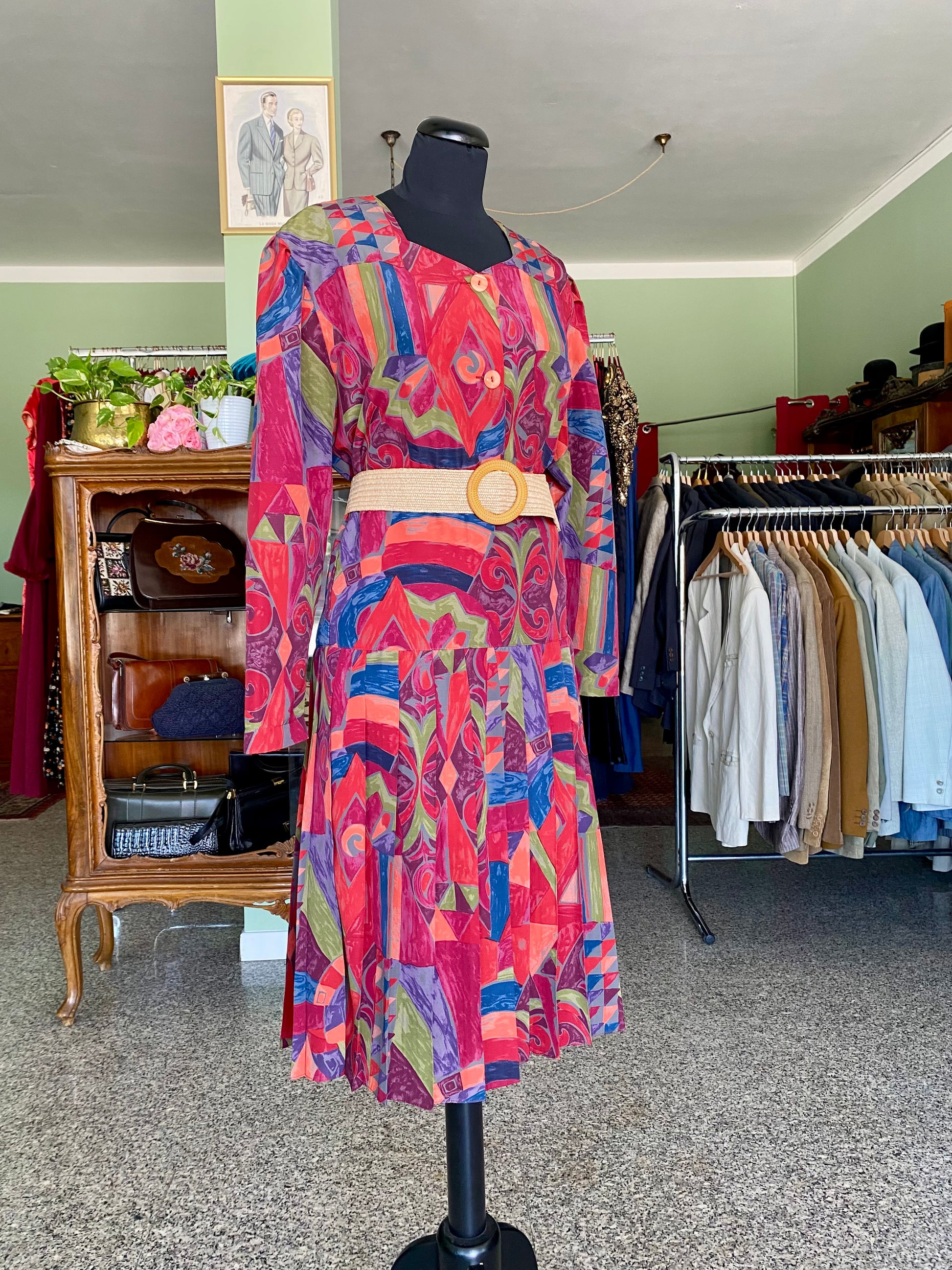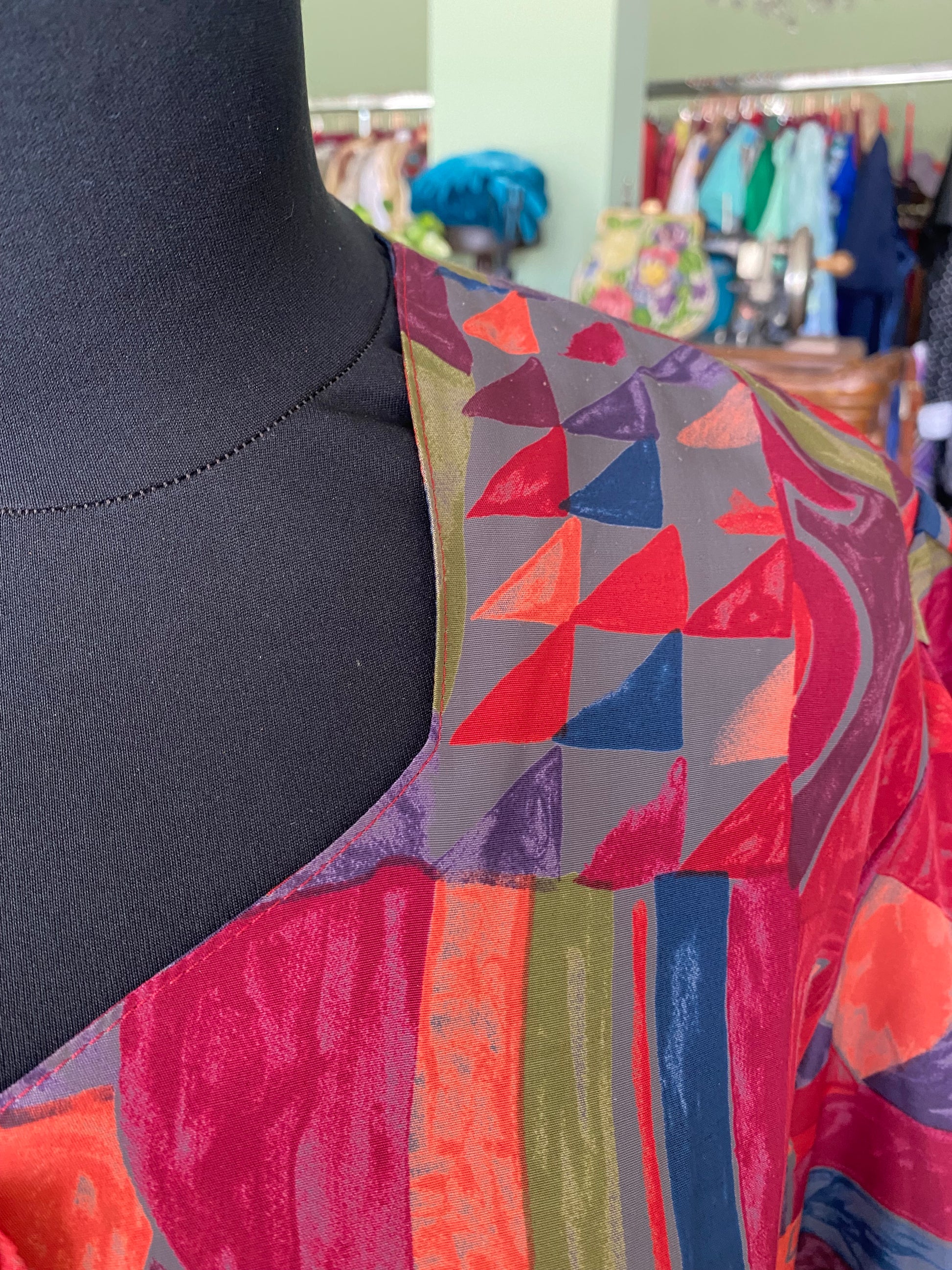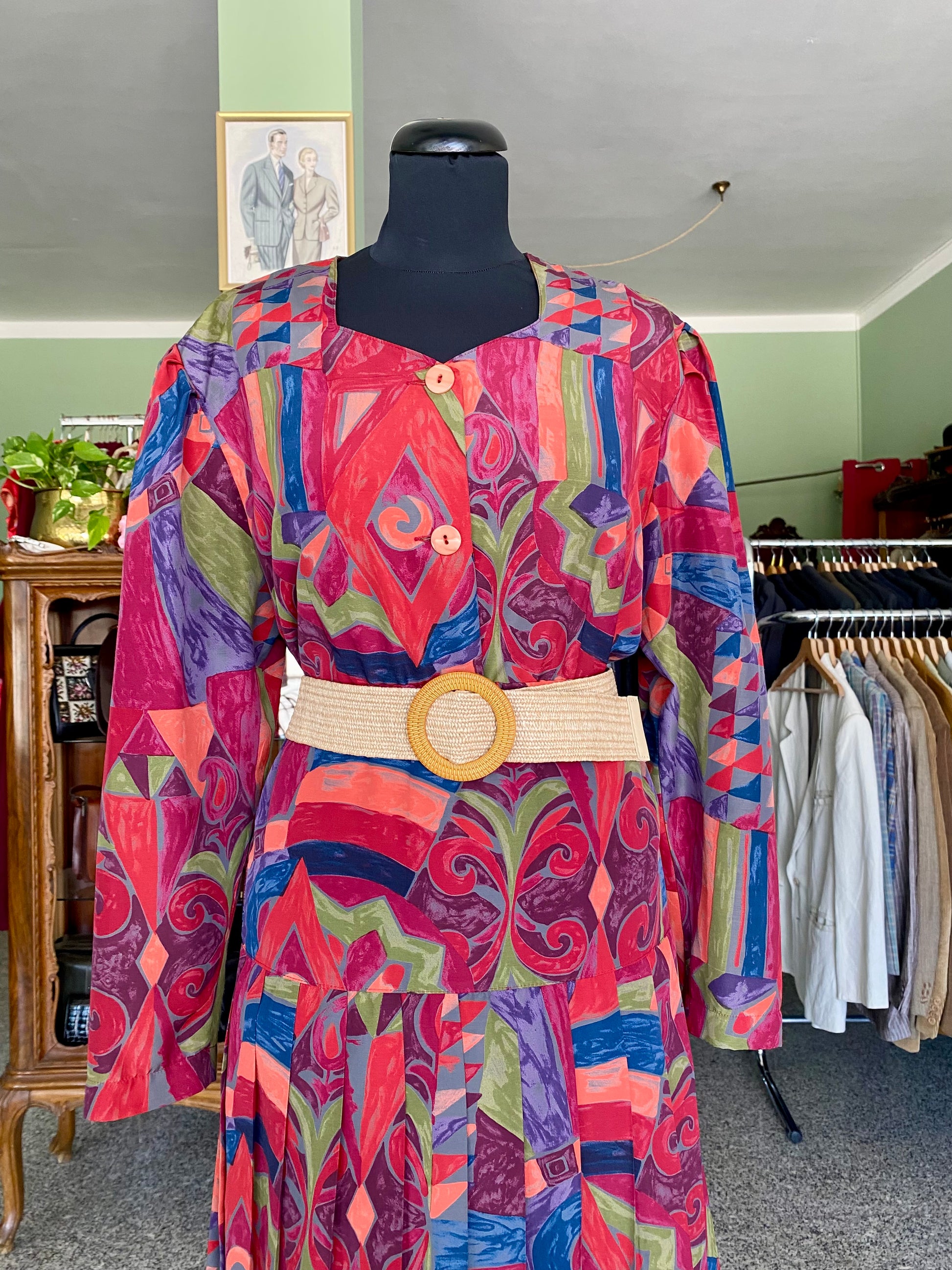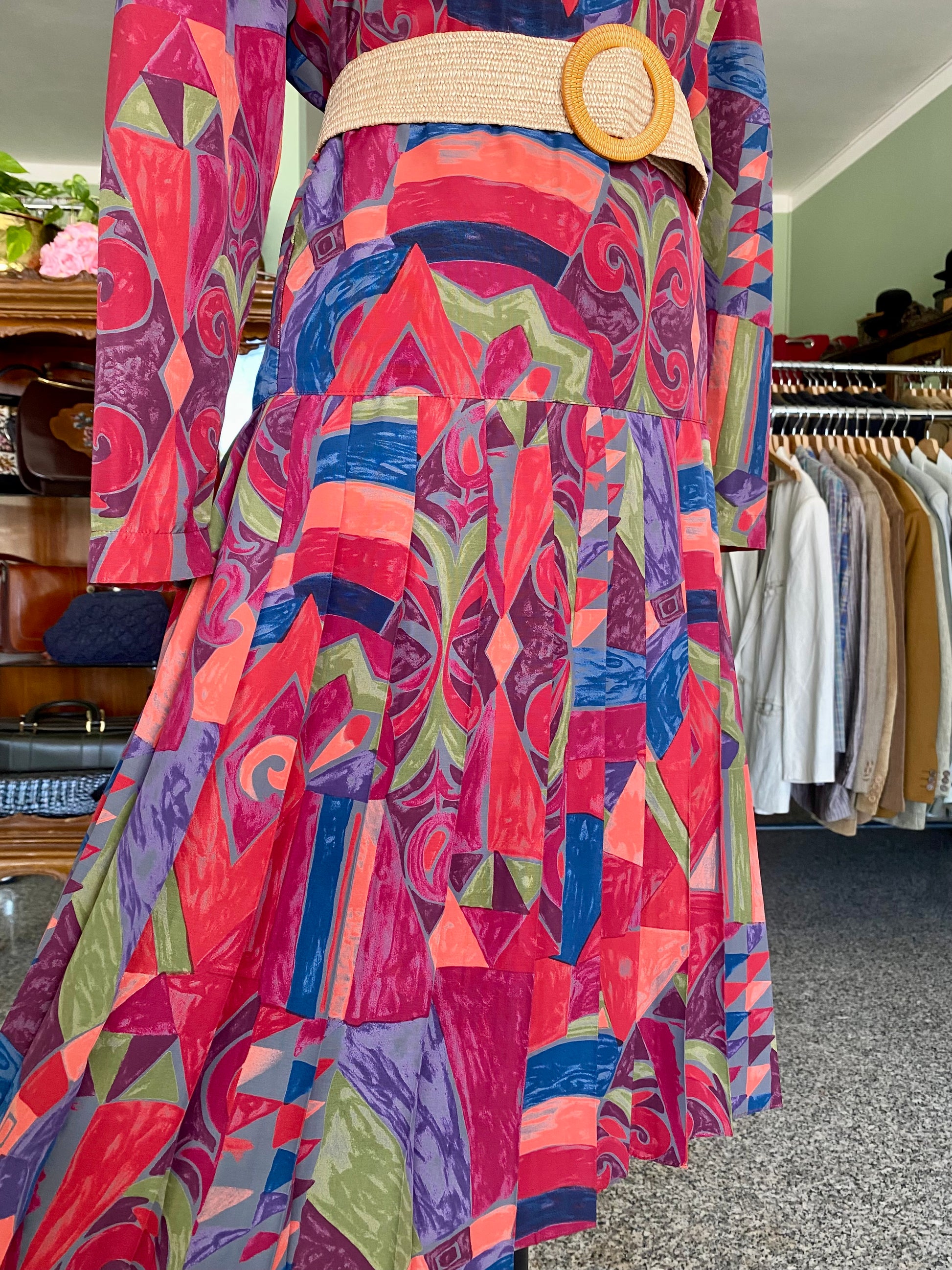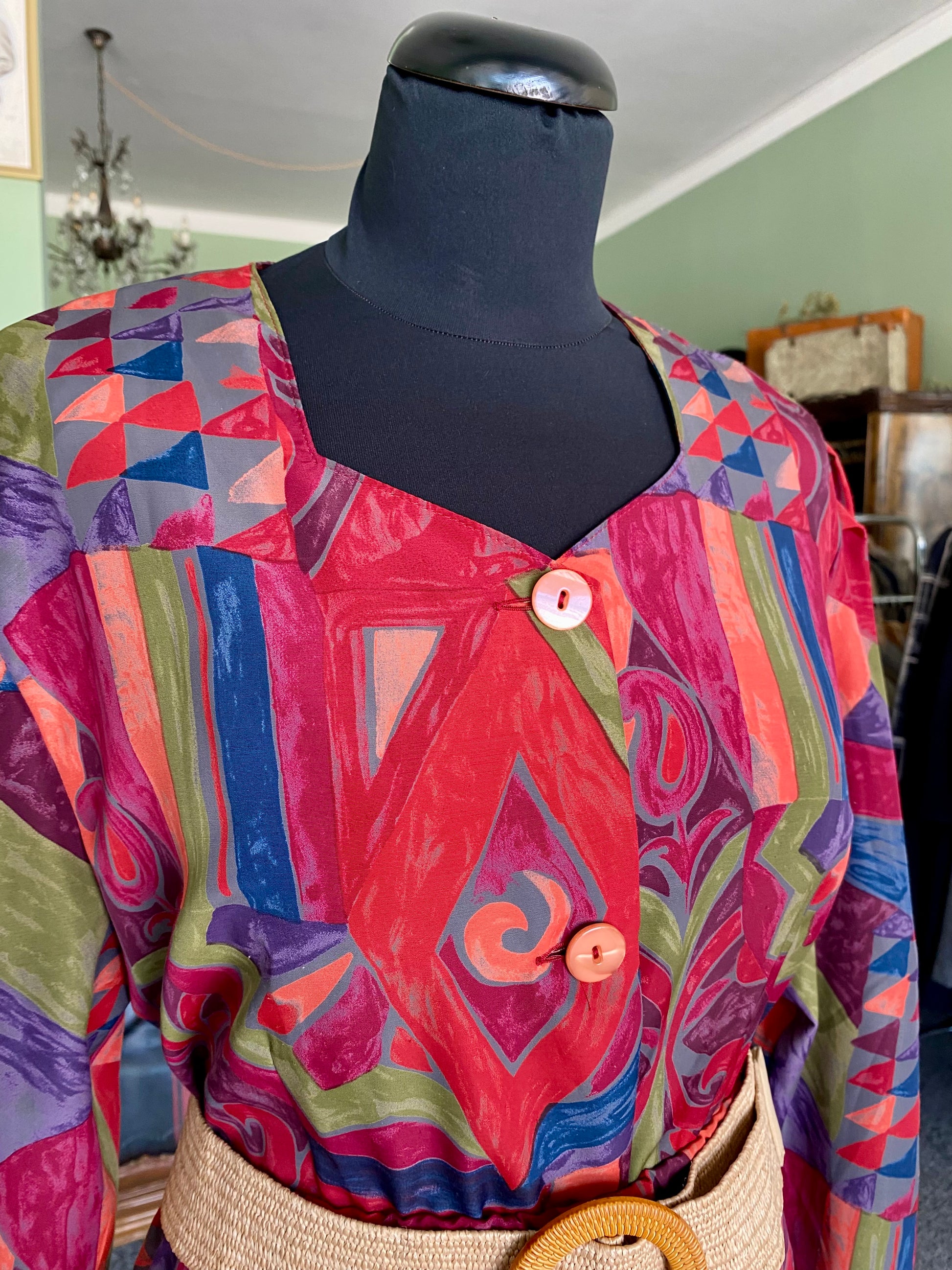 Completo vintage anni ’80 — camicia e gonna in stampa geometrico-tribale multicolor - TG. 46