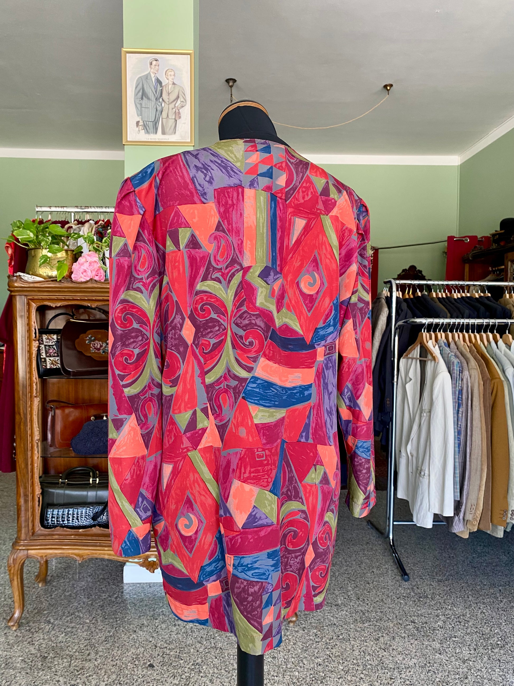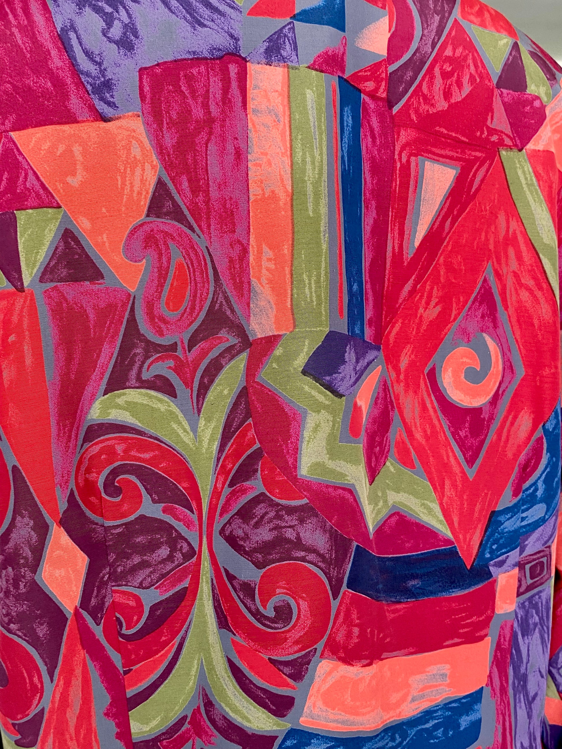 La fantasia è un mix dinamico di geometrie astratte e richiami tribali, con un’esplosione di colori vividi: rosso fragola, fucsia, arancio, lilla, verde oliva e blu elettrico. Il disegno ha un gusto dichiaratamente postmodernista, tra memorie di pattern etnici, arte déco e suggestioni grafiche da tessuto wax reinterpretato in chiave pop.