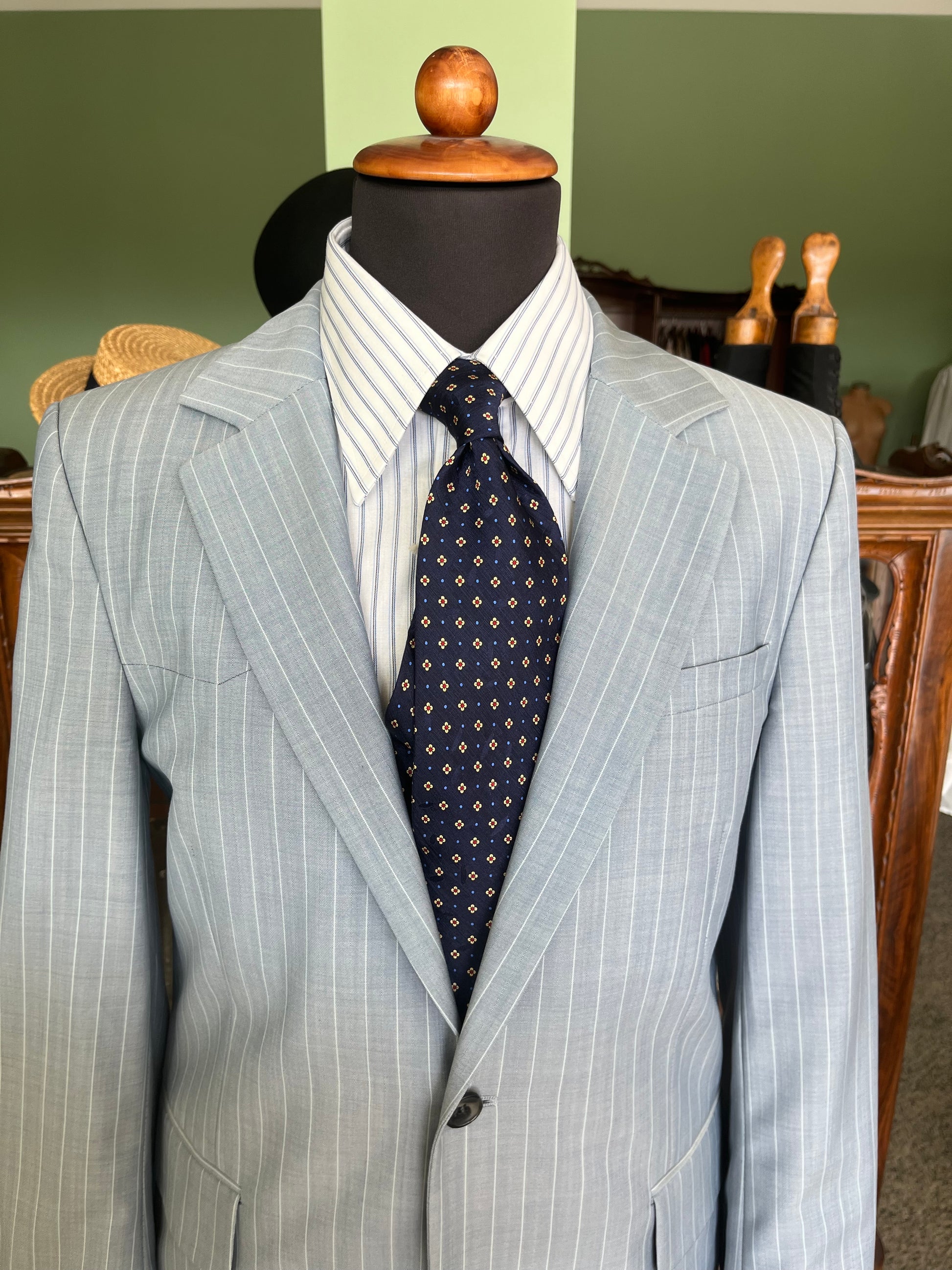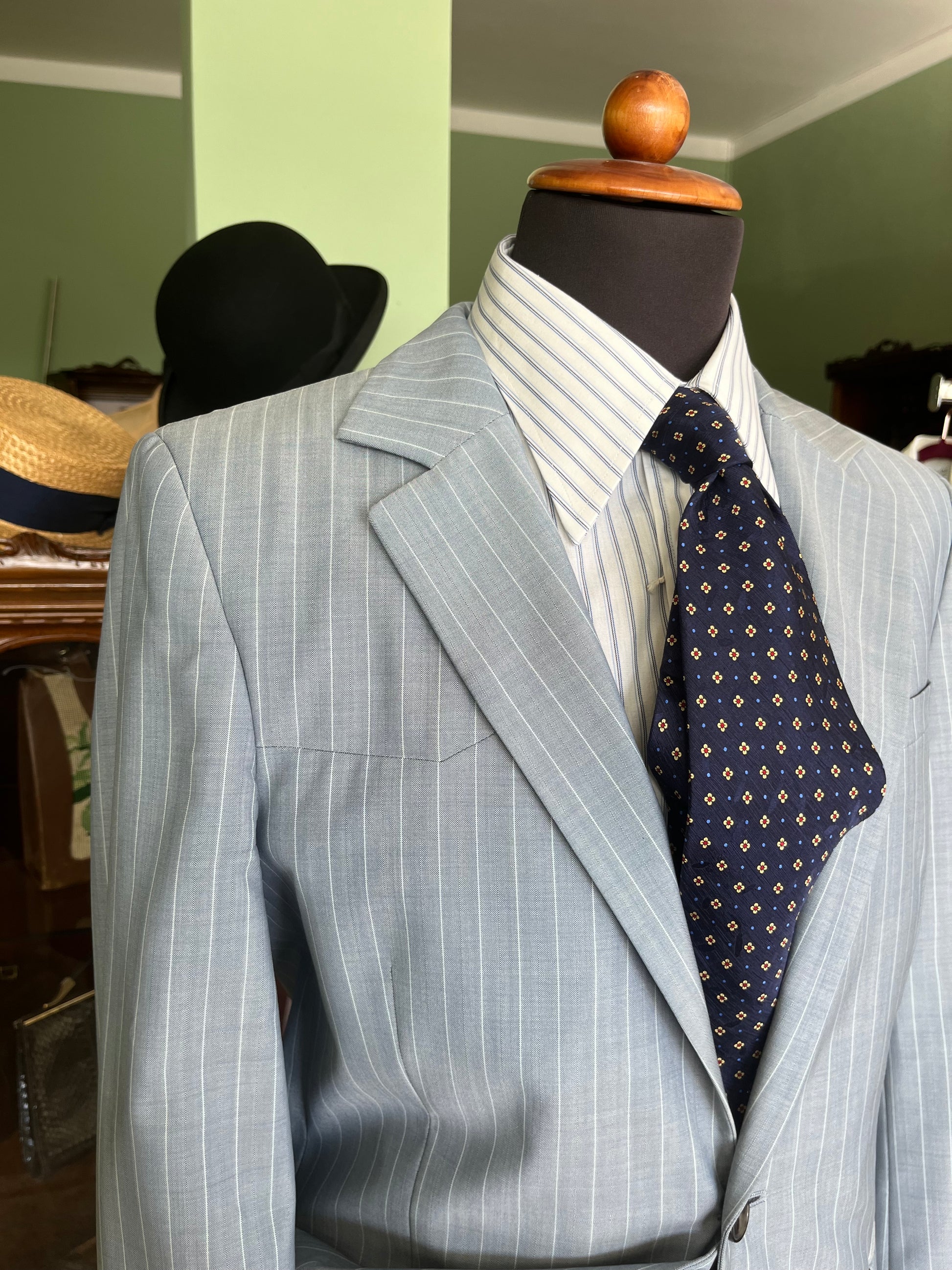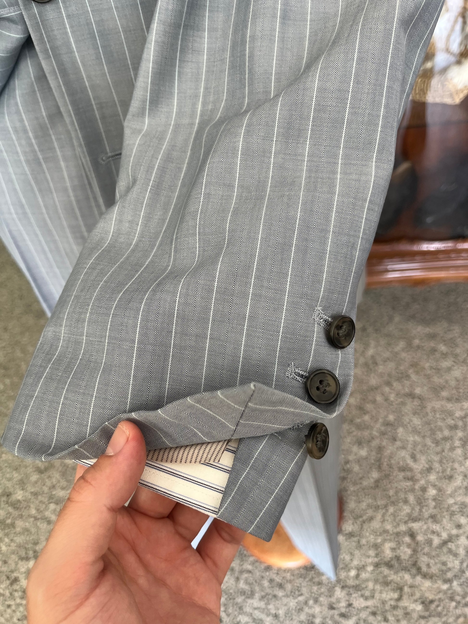 La giacca è un monopetto, due bottoni, baveri a dente, tasche a pattina, spacco singolo sul retro ed asole funzionanti al polso.