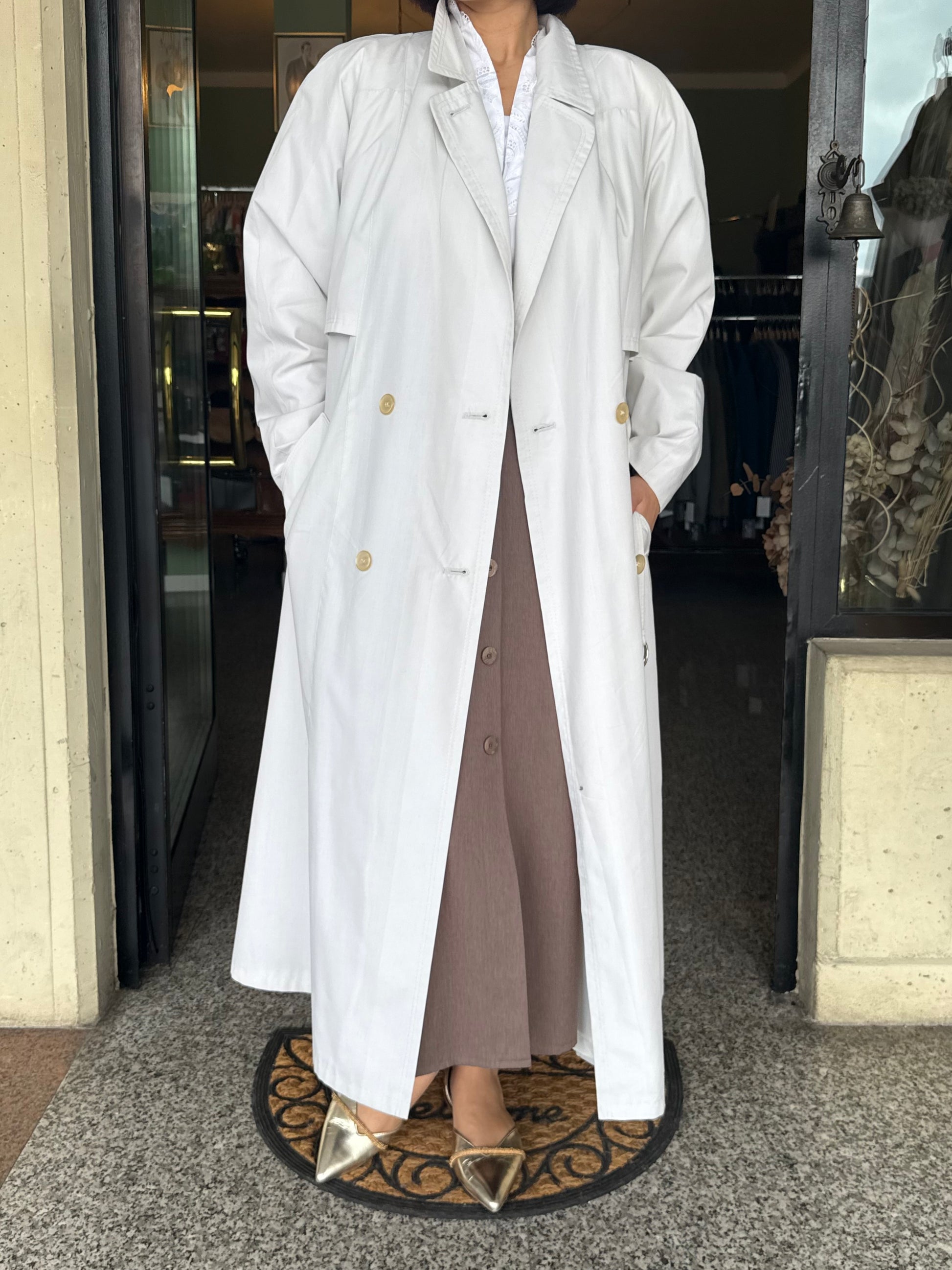 Un modello lungo anni ‘80, dal taglio lineare e morbido, con cintura in vita per regolare la silhouette. Bottoni doppi sul davanti e spalle ampie, ideale per uno stile elegante e luminoso.
