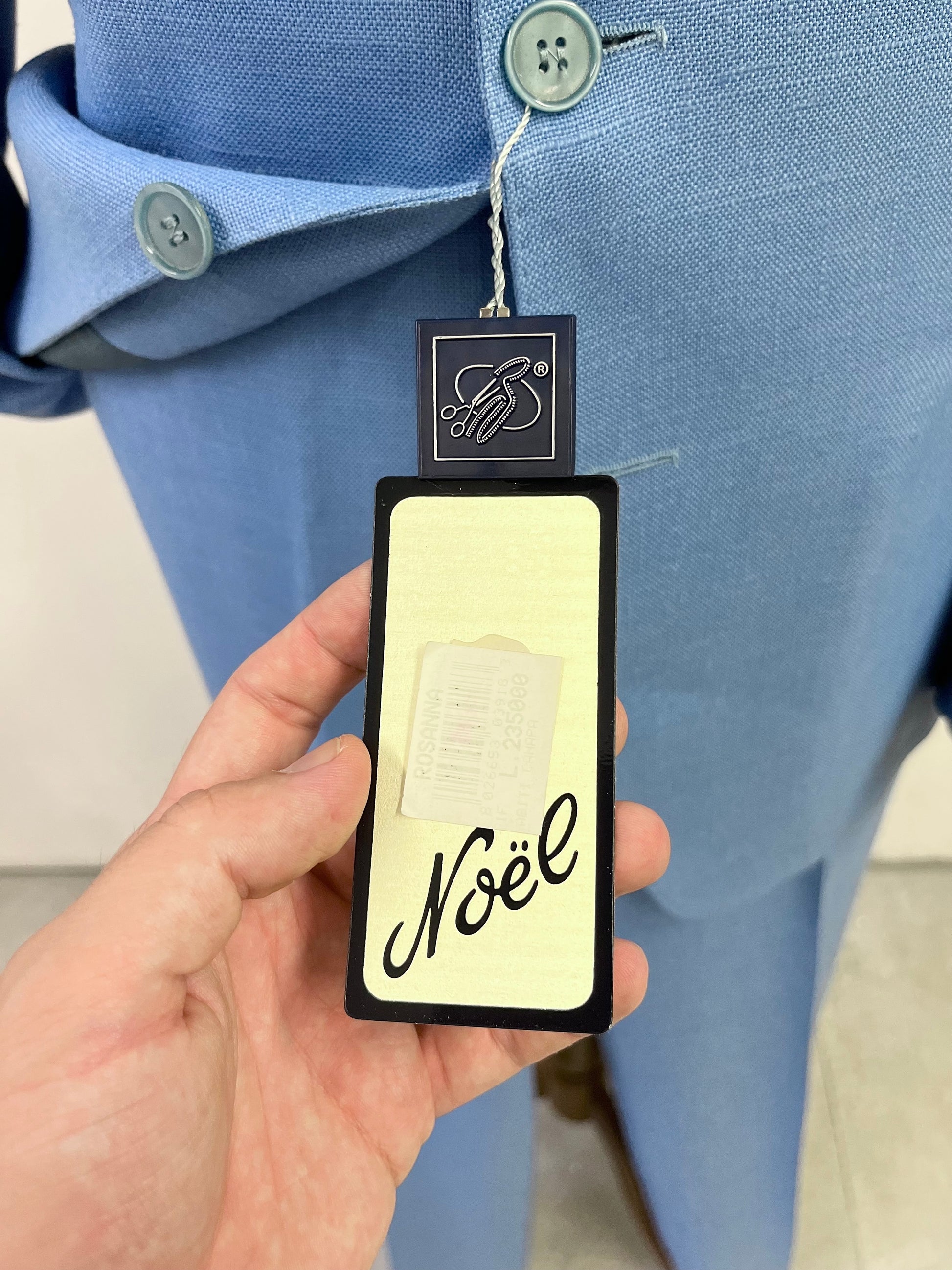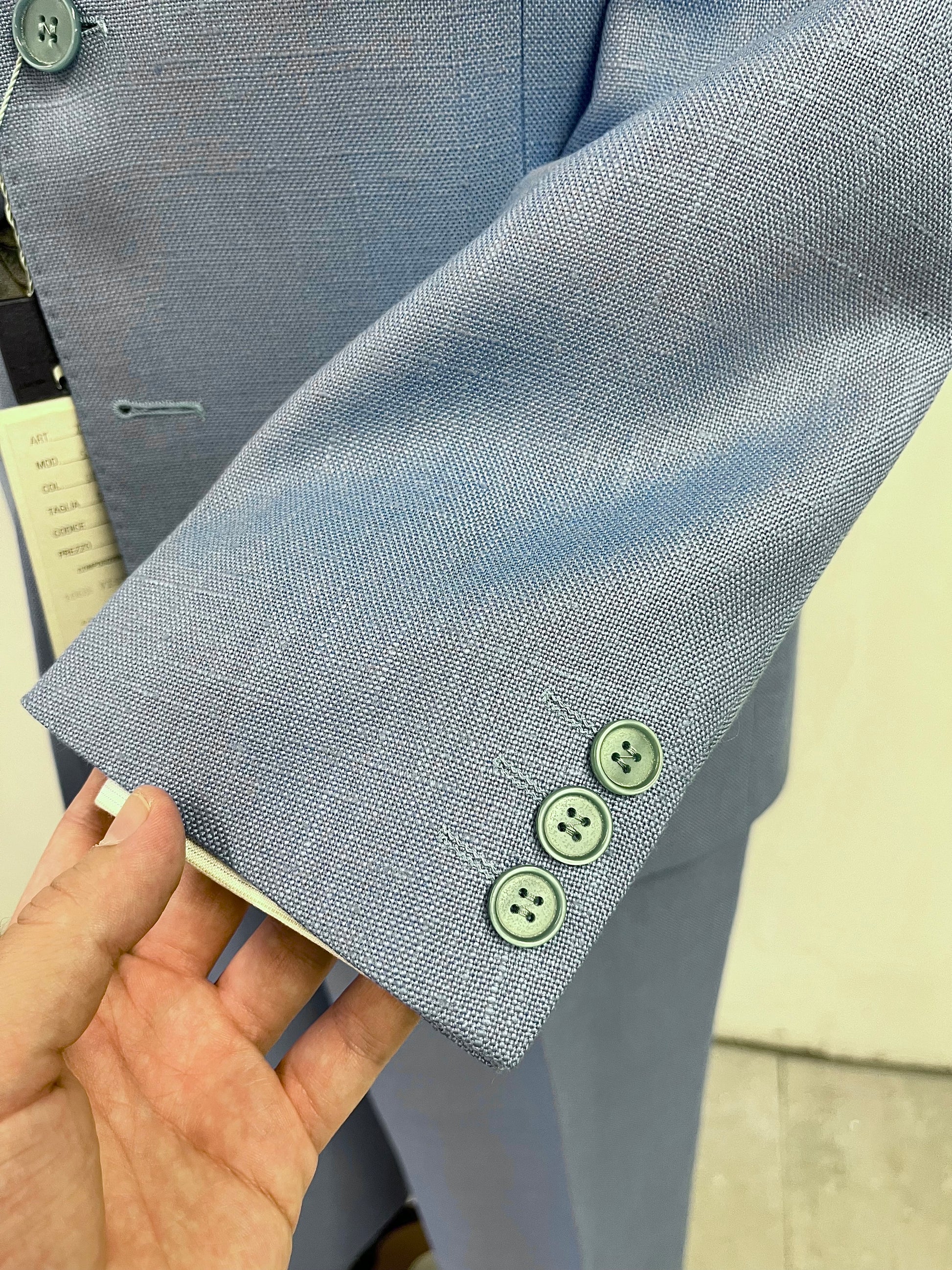 La giacca è un monopetto, dUe bottoni, baveri a dente, tasche a filetto e nessuno spacco sul retro.