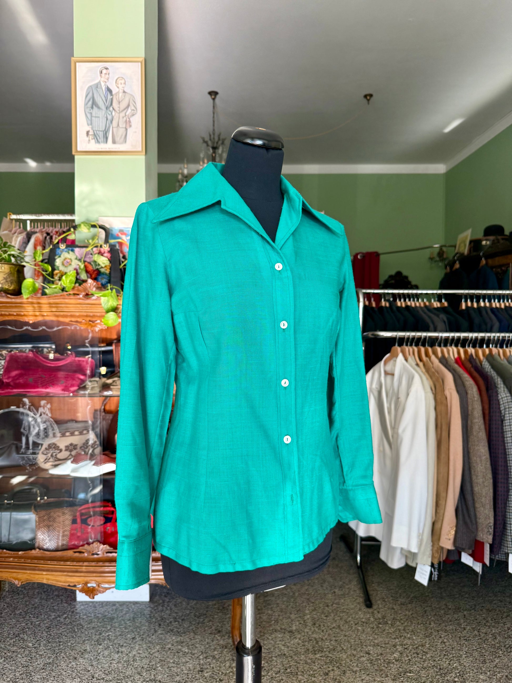 Camicia anni ’70 dal colletto ampio tipico dell’epoca, color verde brillante. Le maniche lunghe terminano con polsini abbottonati; il colore verde brillante dona freschezza e carattere, ideale da abbinare a gonne o pantaloni a vita alta.
