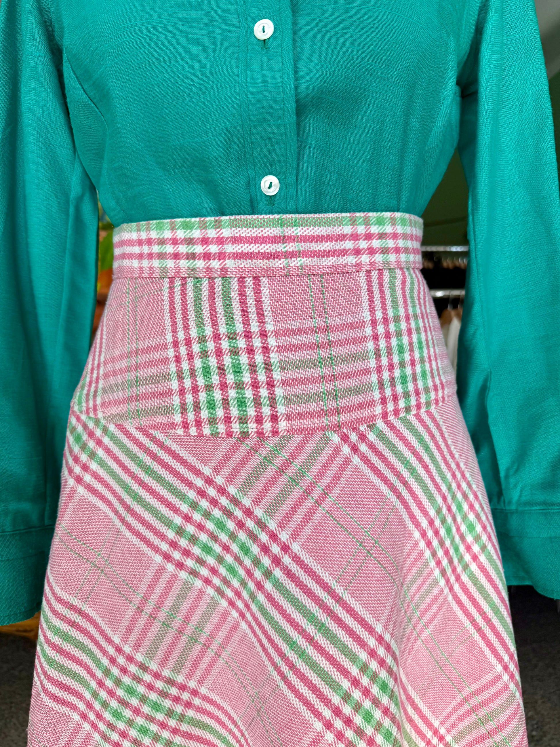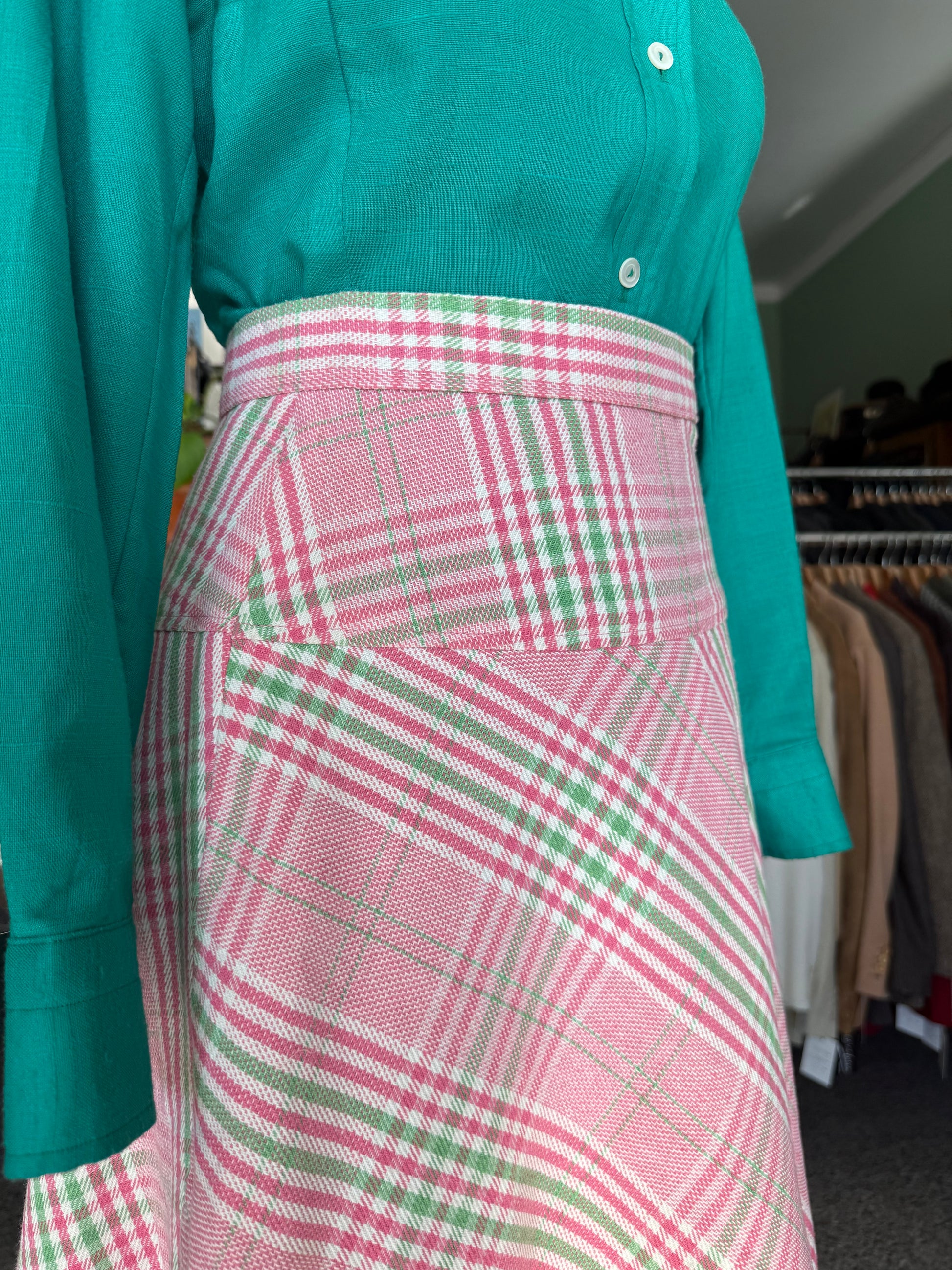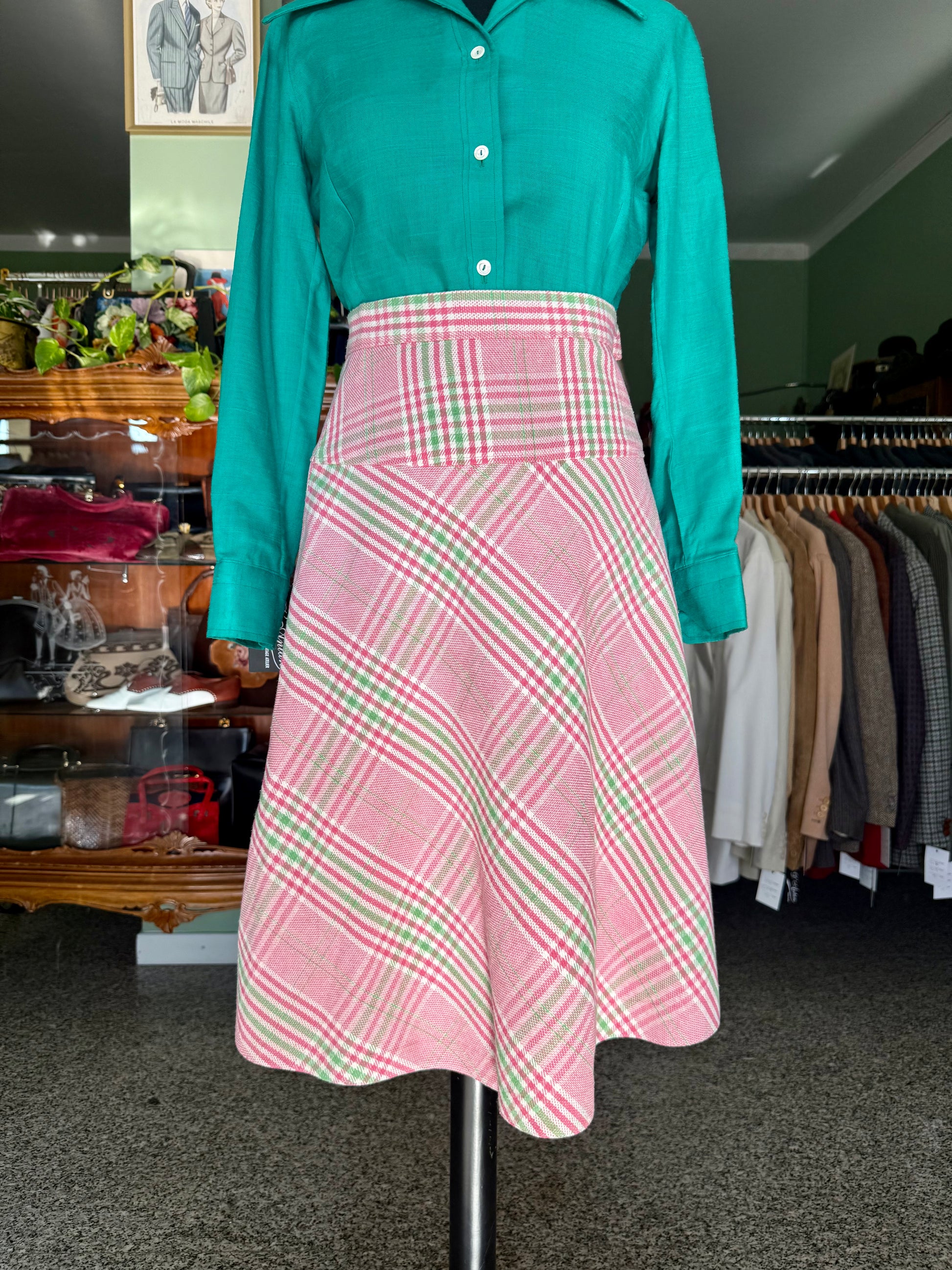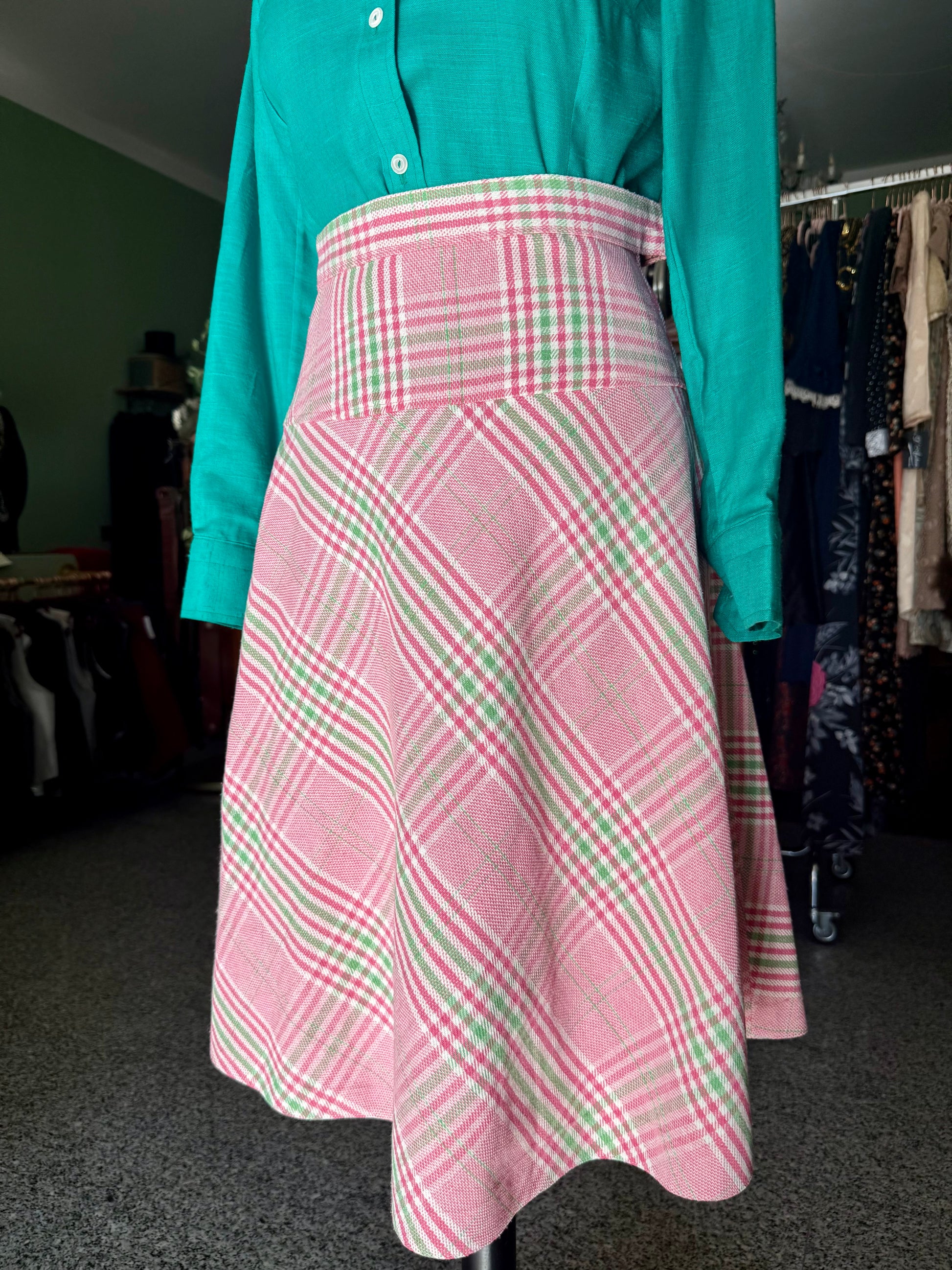 Gonna svasata anni ‘70 con fantasia a quadri rosa e verde, dal taglio sartoriale e vita alta strutturata con fascia a contrasto. Realizzata in lana, cade morbida e si apre leggermente sul fondo.