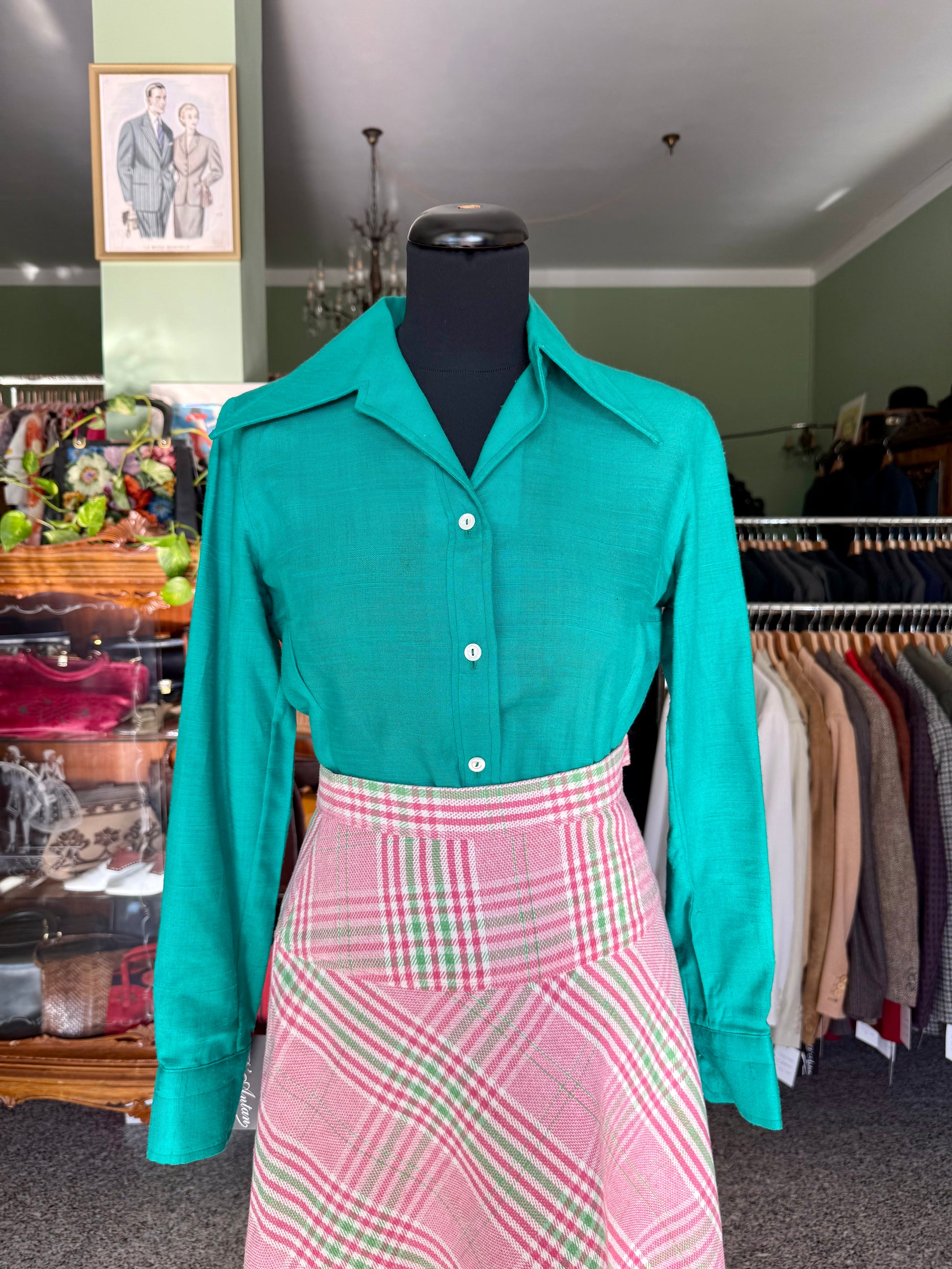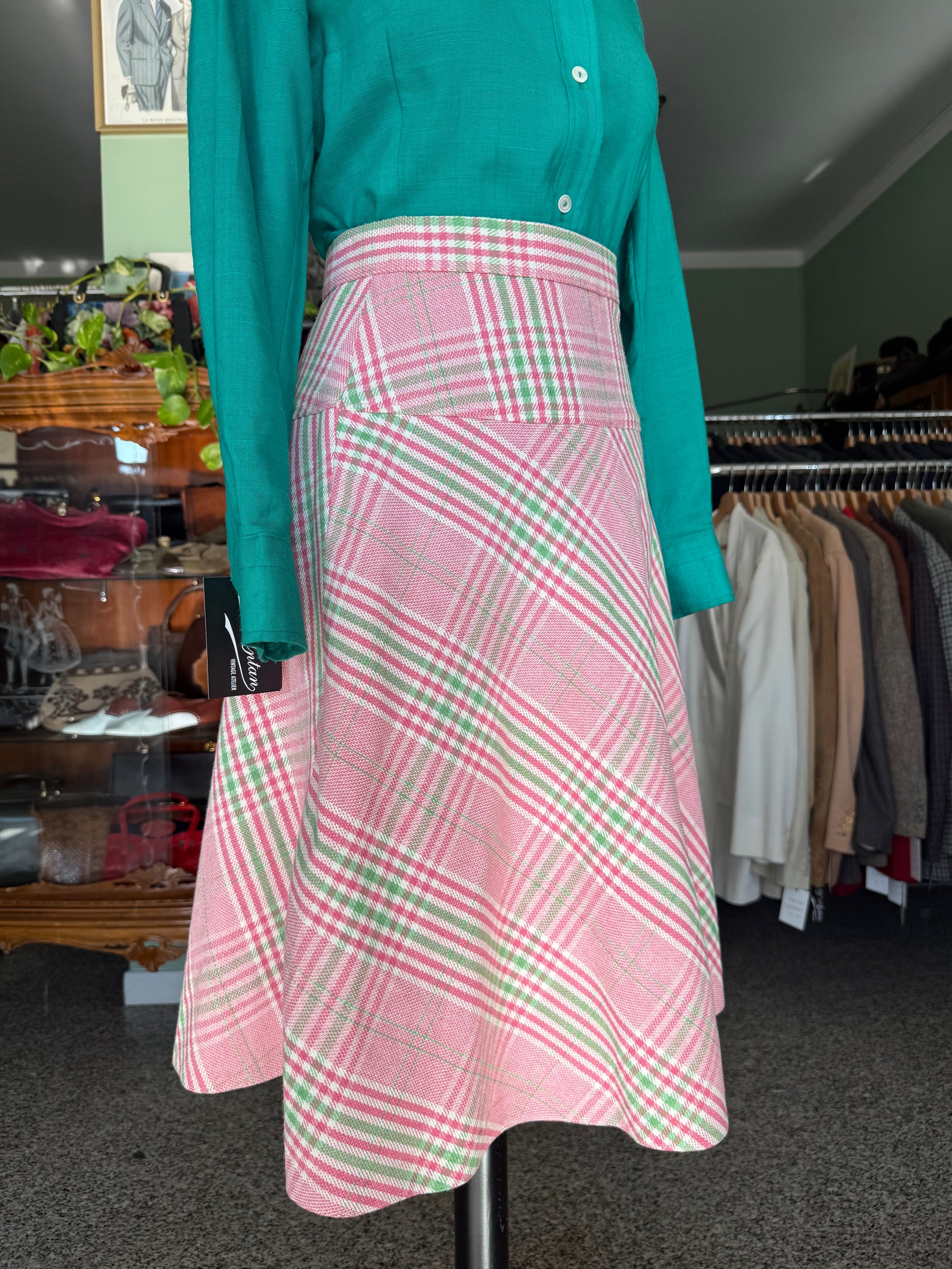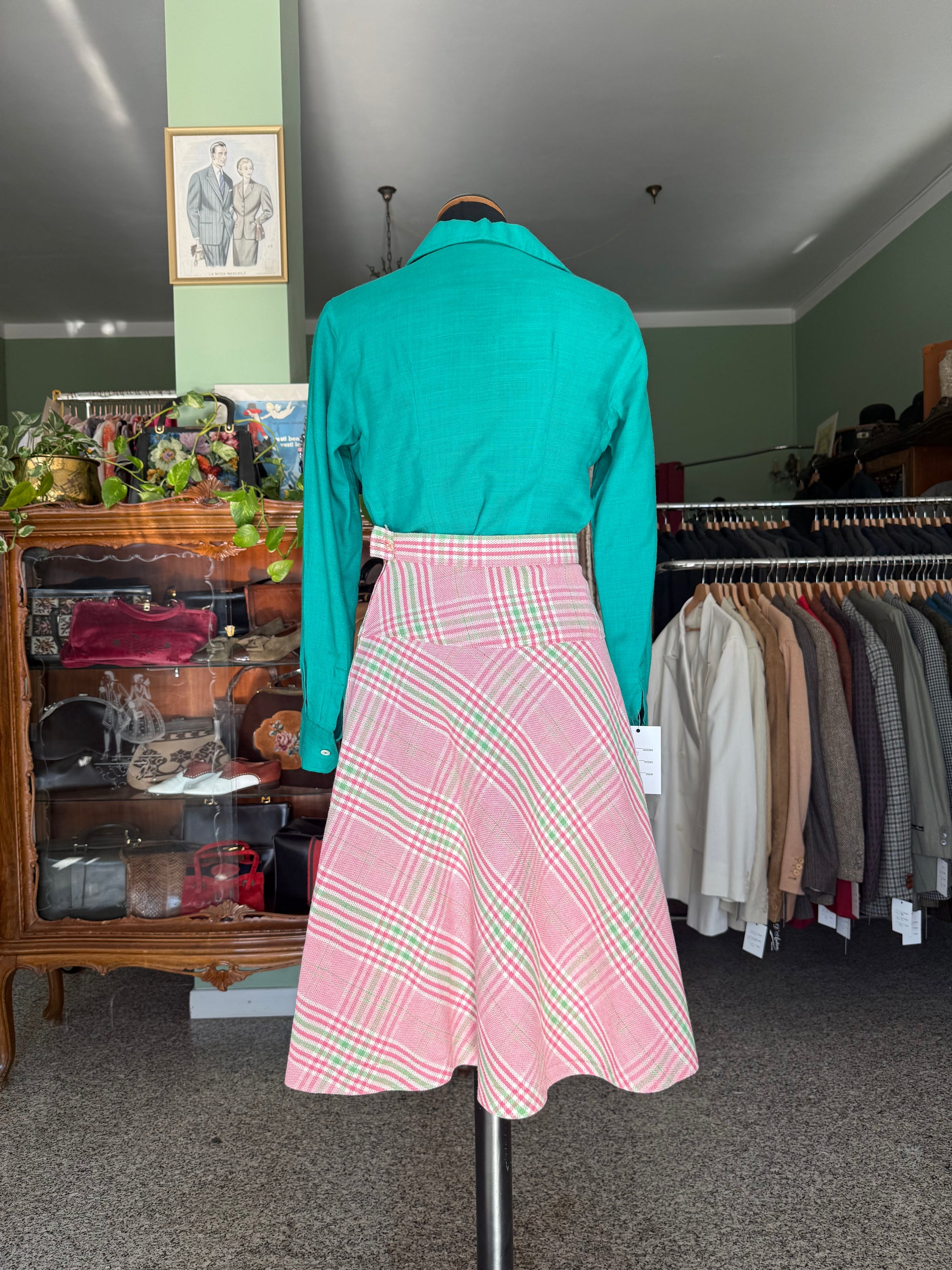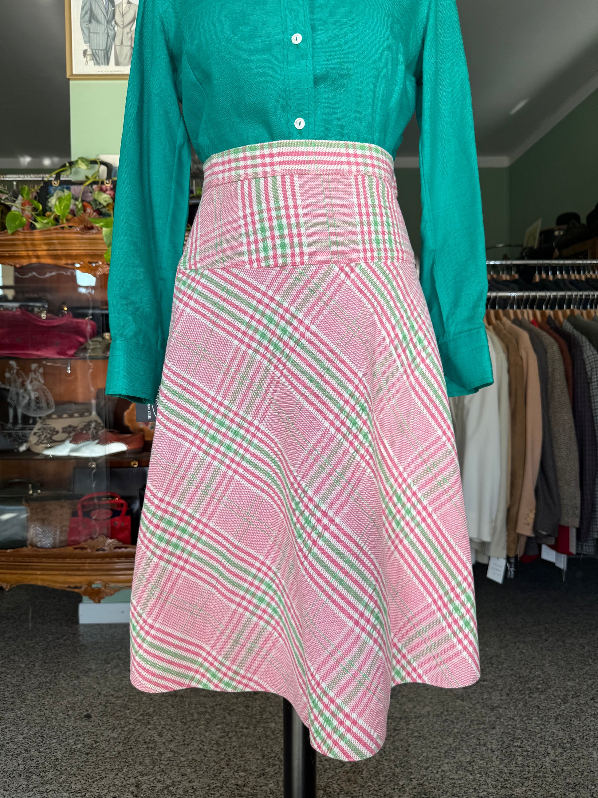 Gonna svasata anni ‘70 con fantasia a quadri rosa e verde, dal taglio sartoriale e vita alta strutturata con fascia a contrasto. Realizzata in lana, cade morbida e si apre leggermente sul fondo.
