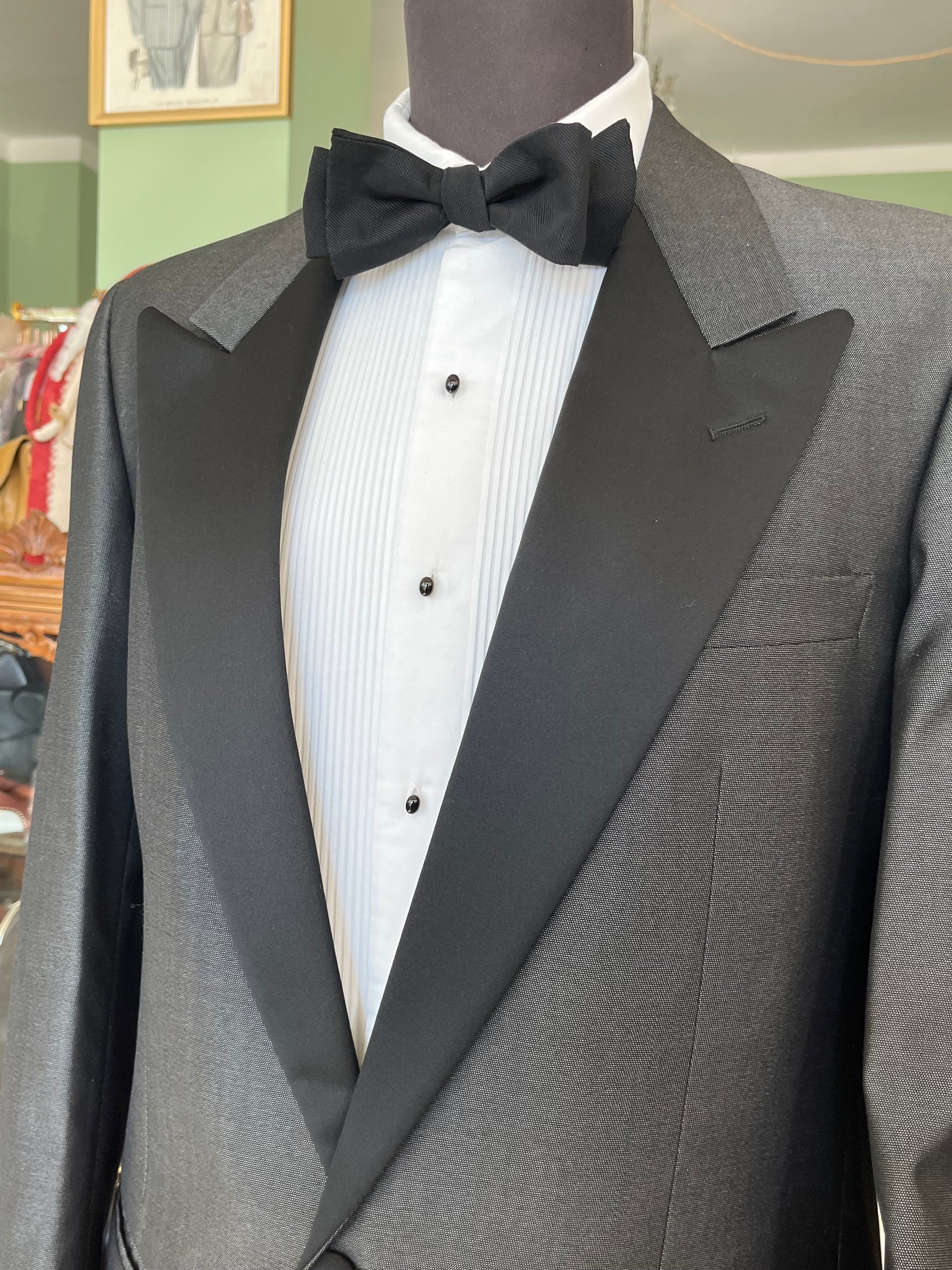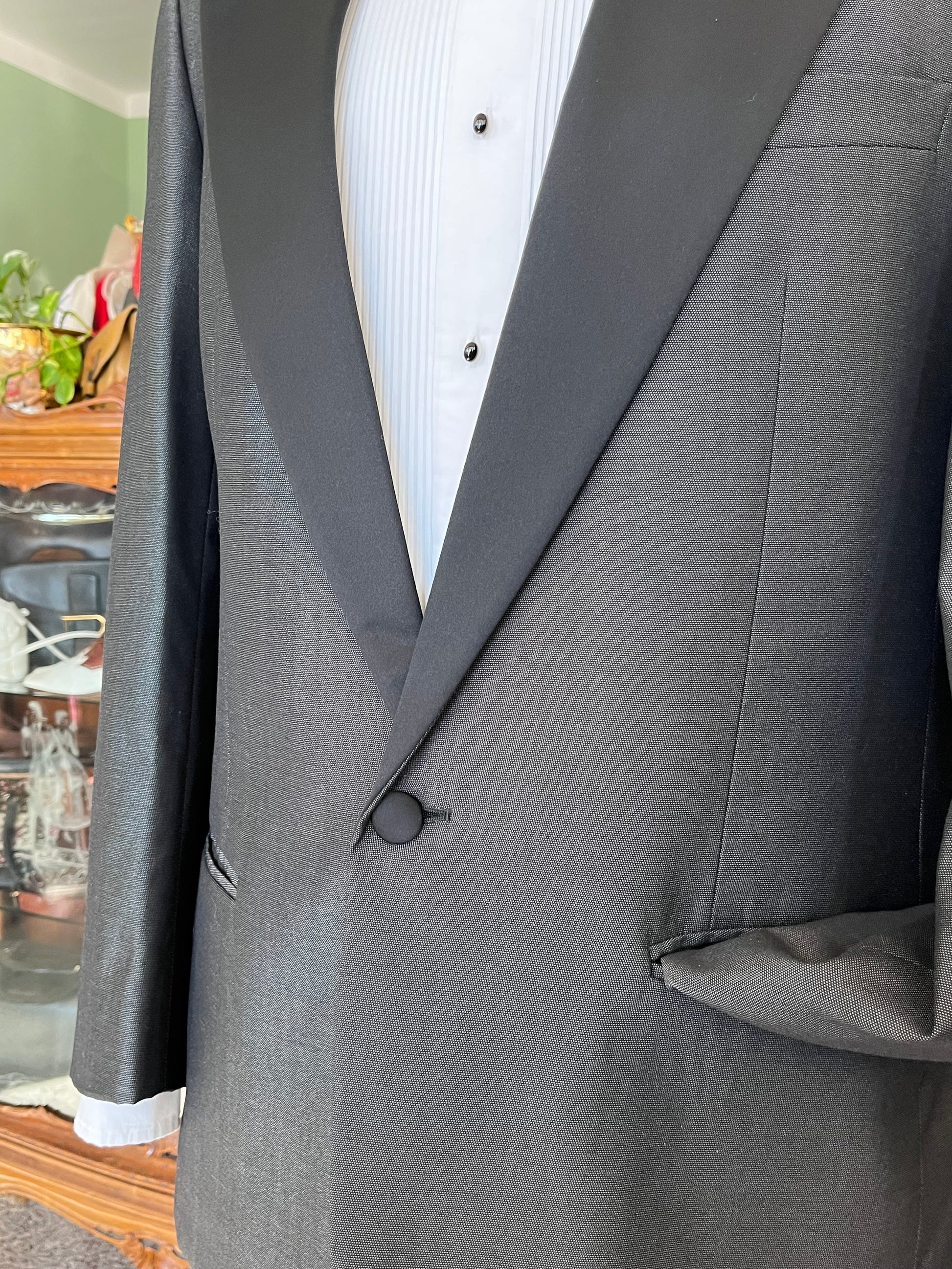 L’abito da sera presenta una giacca monopetto con baveri a lancia ricoperto di puro raso di seta, un bottone (come si confà allo smoking).