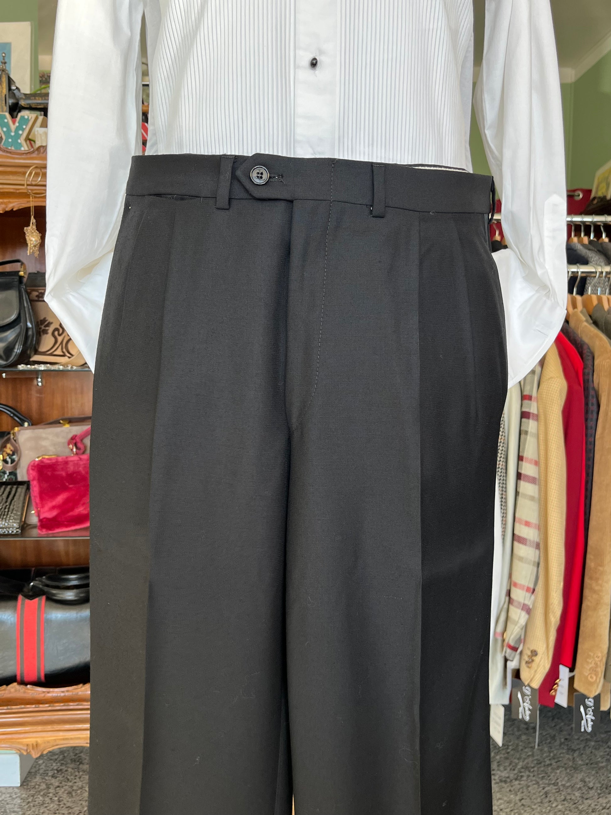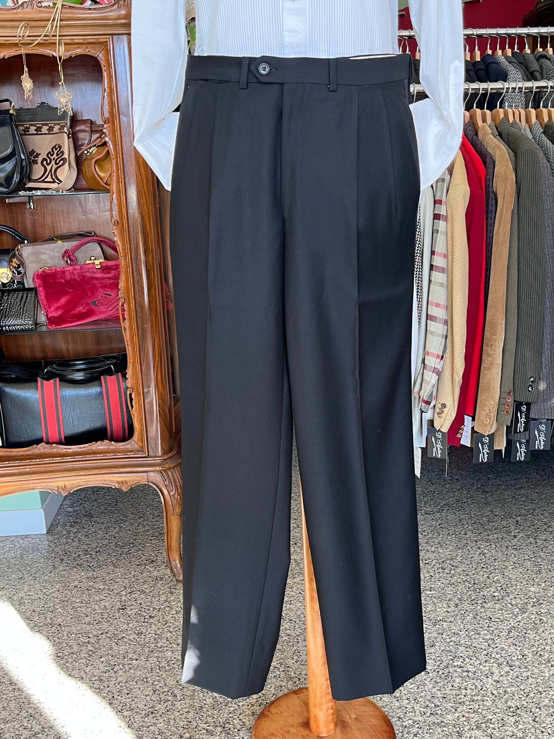 I calzoni sono a vita alta, con doppia piega in vita e gallone singolo in seta.