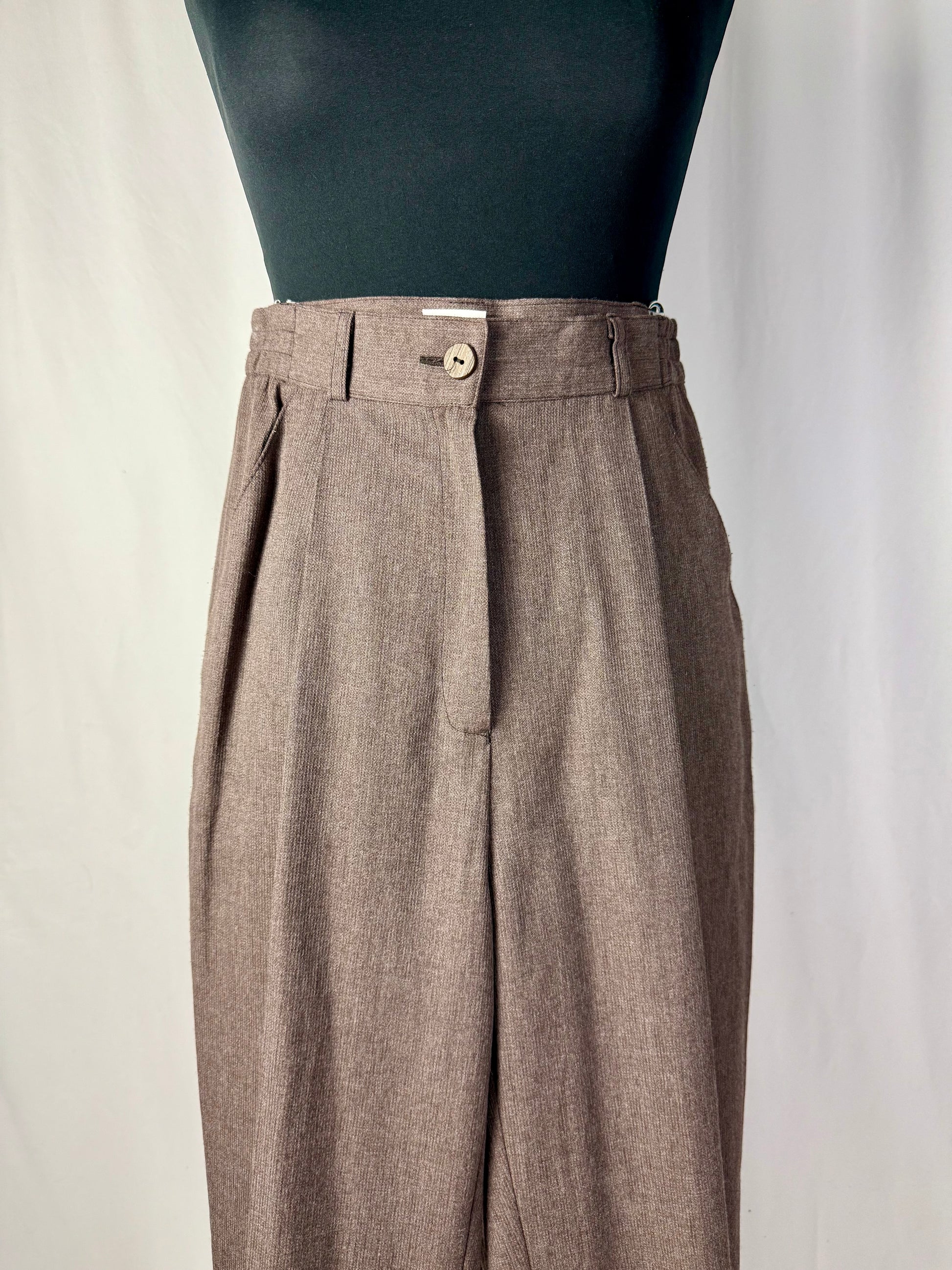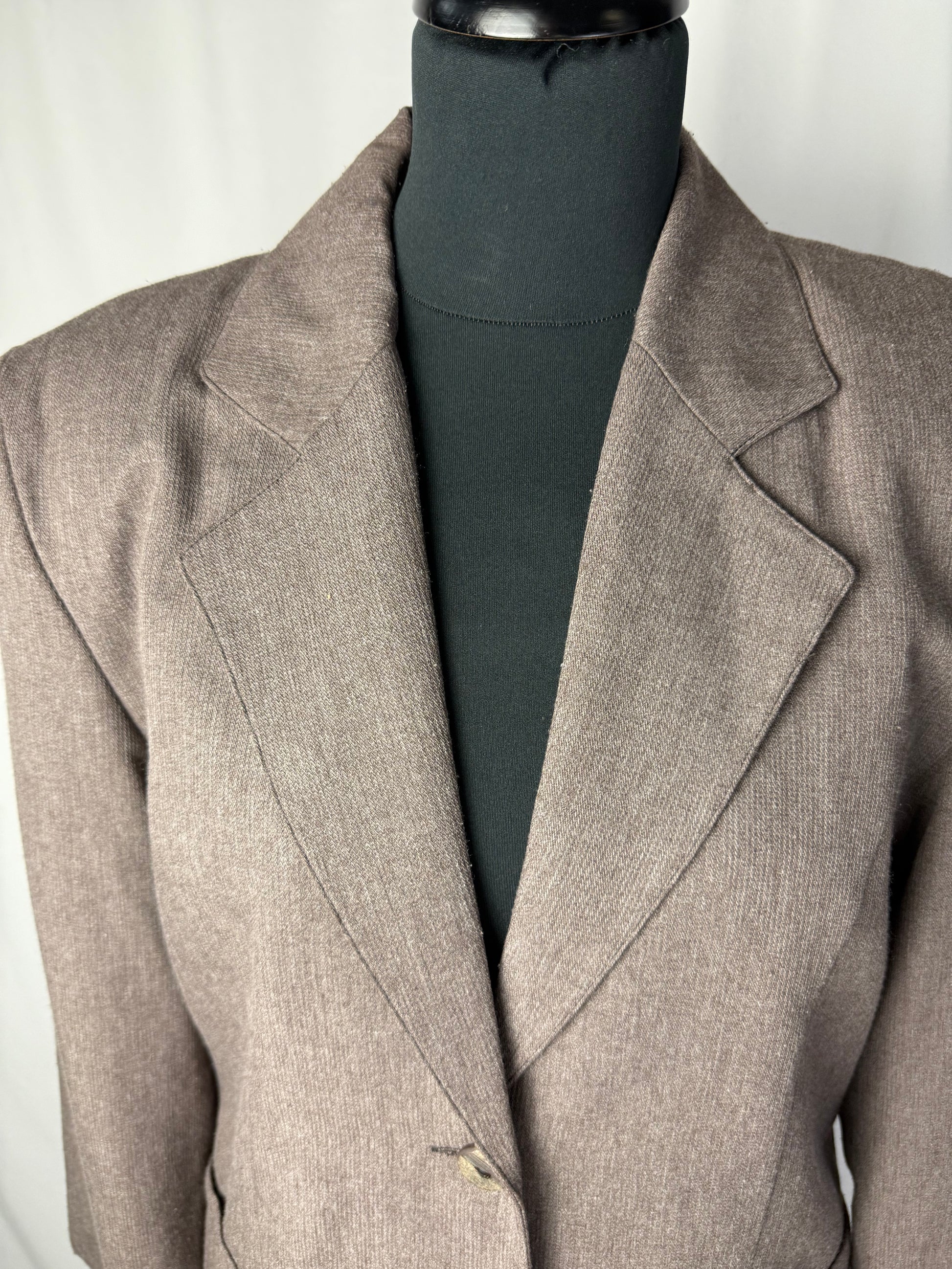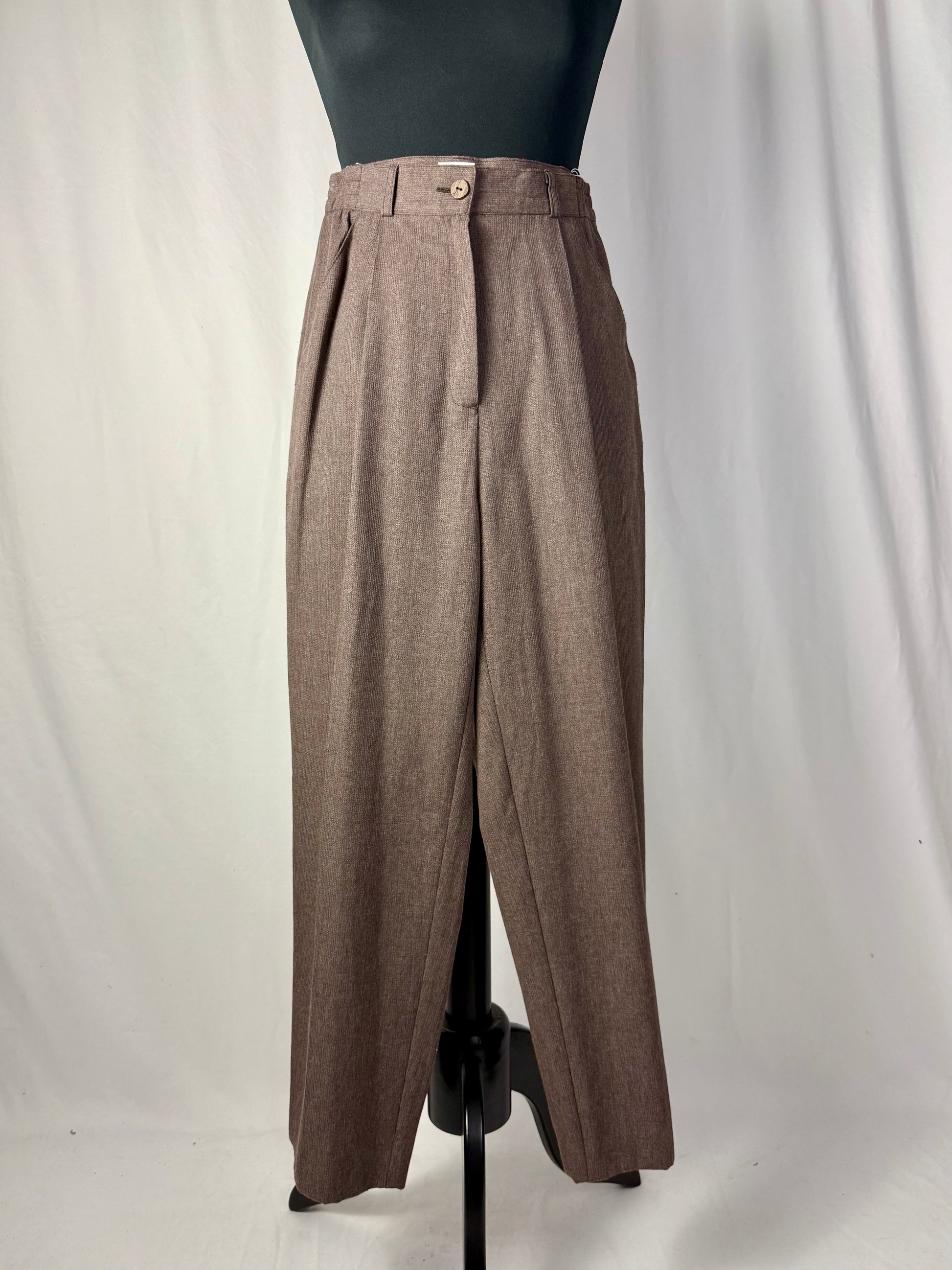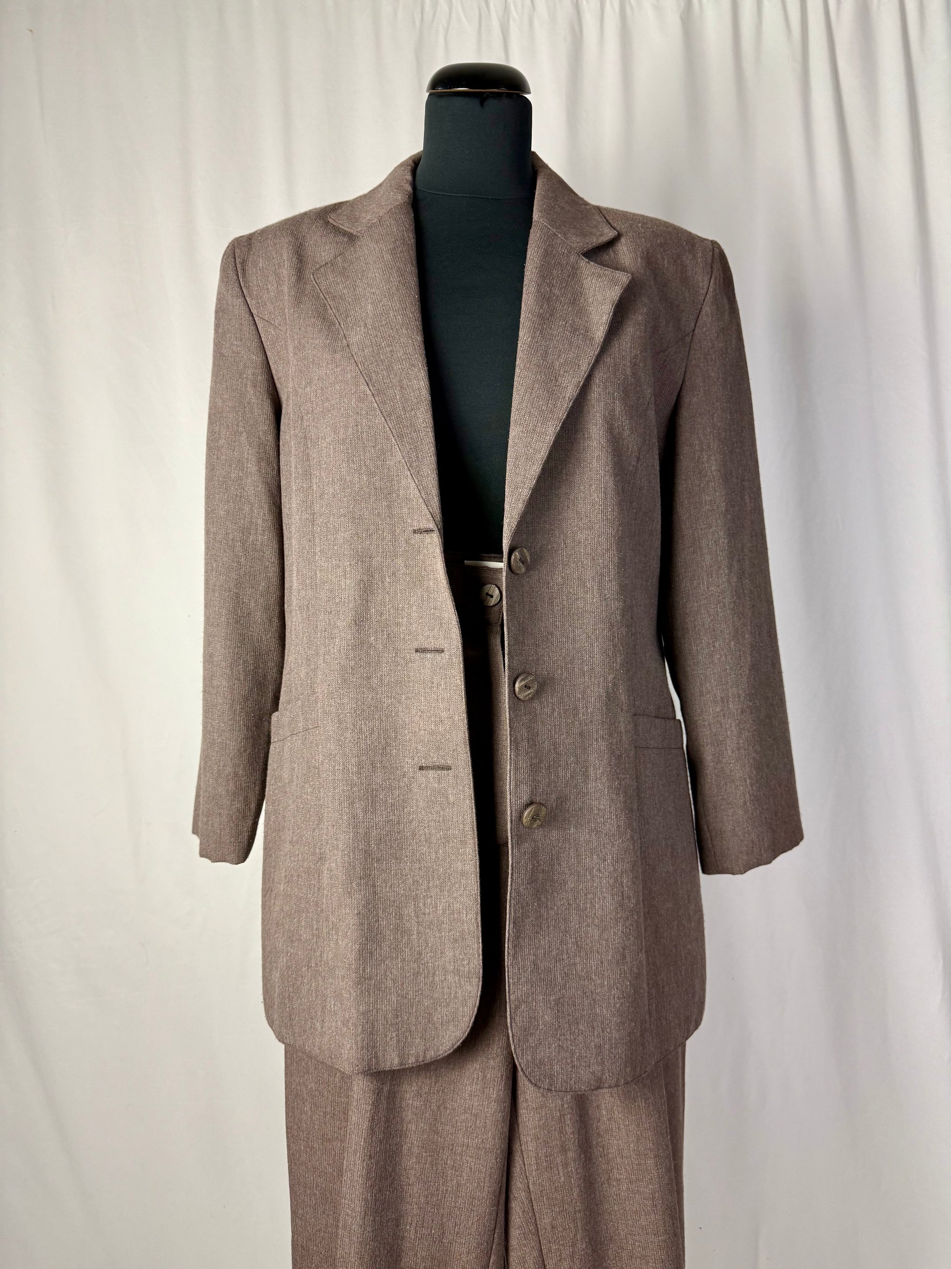 Tailleur anni ’80 in lana e viscosa color nocciola, composto da giacca monopetto con quattro bottoni e pantaloni a vita alta con pinces. La giacca, dal taglio strutturato e leggermente sfiancato, presenta rever classico e linee pulite tipiche dell’eleganza dell’epoca, mentre i pantaloni offrono una vestibilità comoda e fluida che slancia la figura.