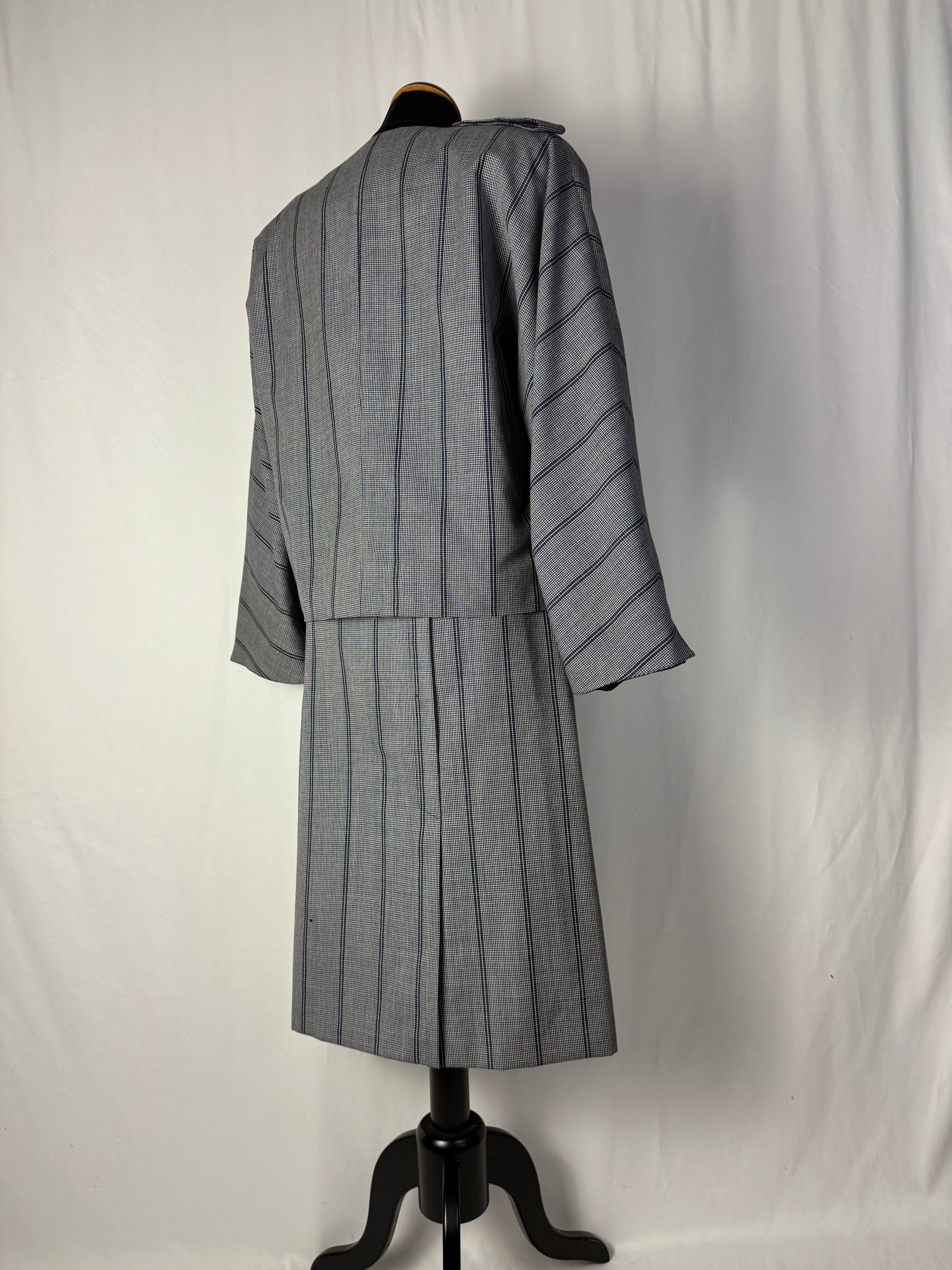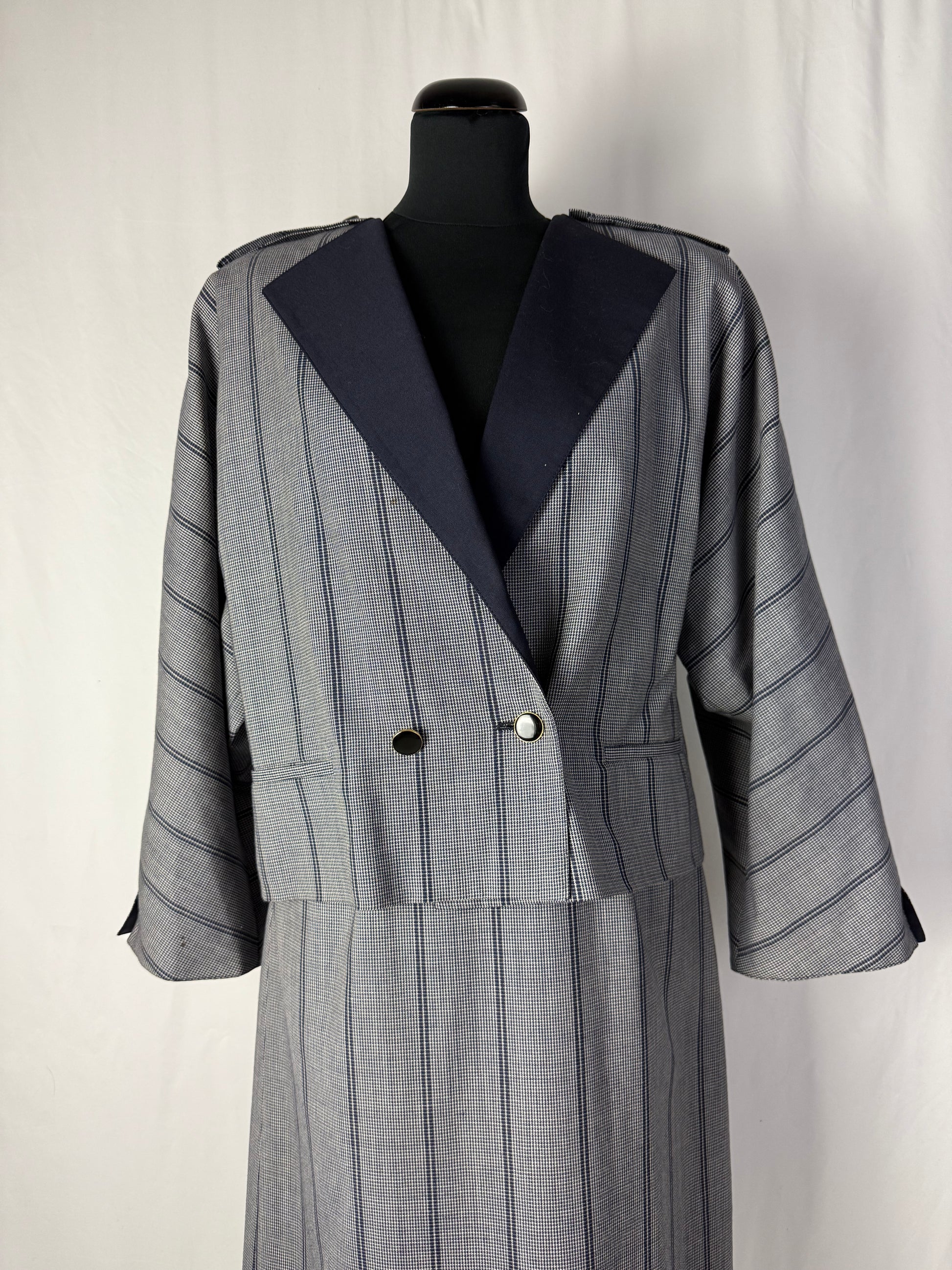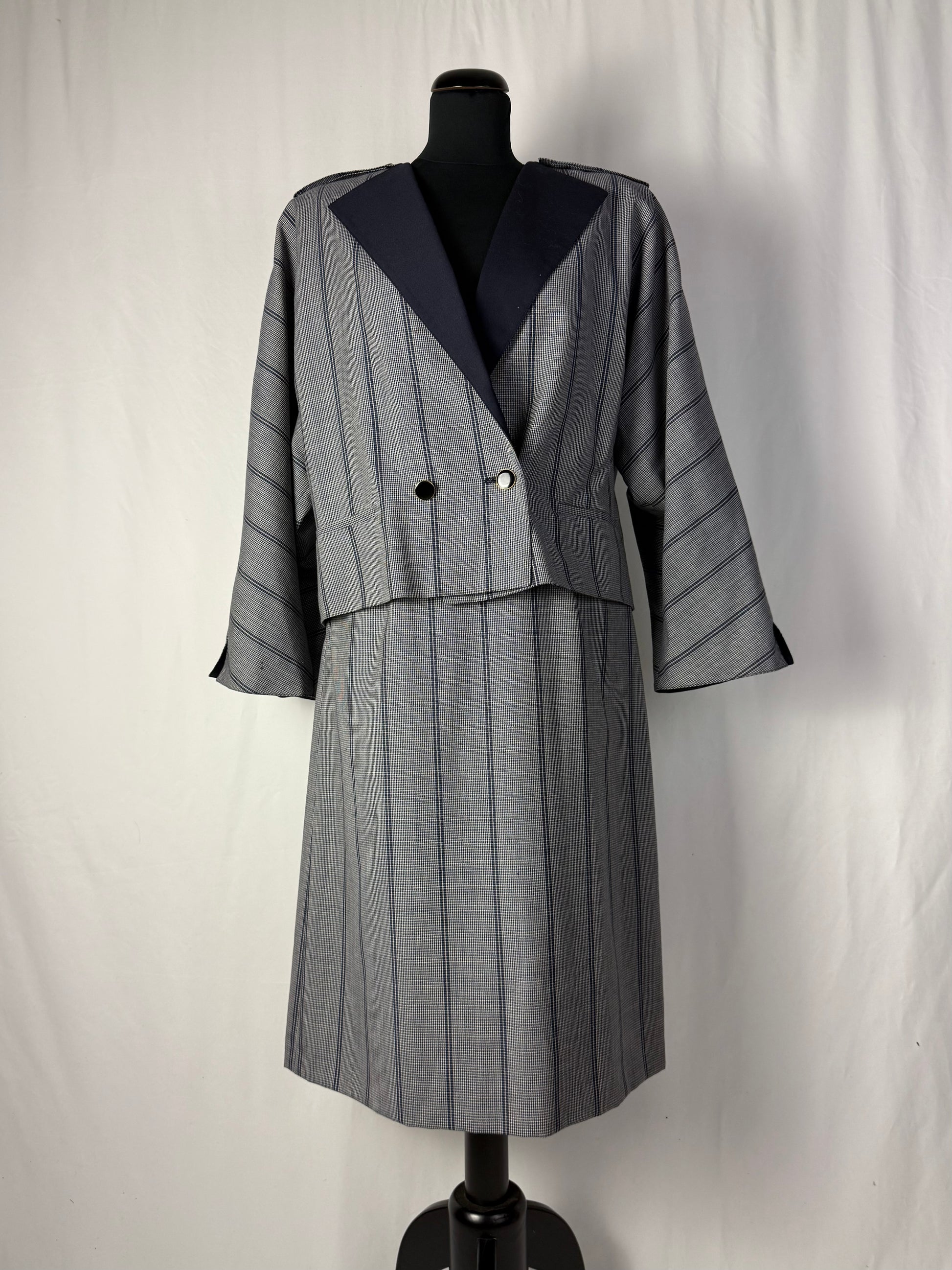 Iconico completo anni ’80 composto da giacca doppiopetto e gonna longuette, realizzato in pura lana con motivo gessato a micro pied-de-poule. Le spalle strutturate e il taglio deciso incarnano alla perfezione lo spirito del power dressing femminile dell’epoca: eleganza, autorevolezza e stile inconfondibile. Il rever a contrasto blu navy e i bottoni metallici aggiungono carattere, rendendo questo tailleur un capo d’archivio capace di raccontare la forza e la sofisticata sobrietà di una donna anni ’80.