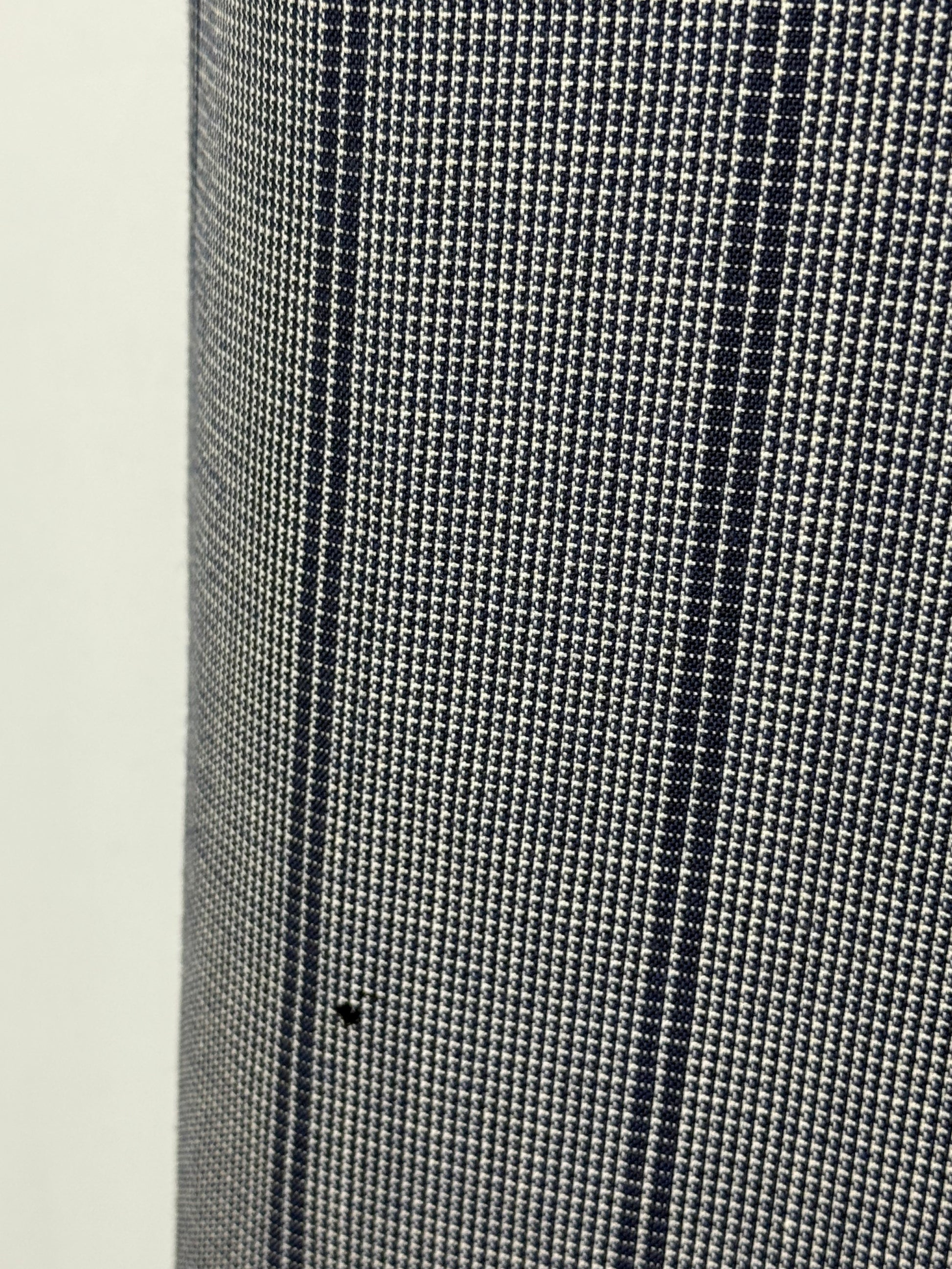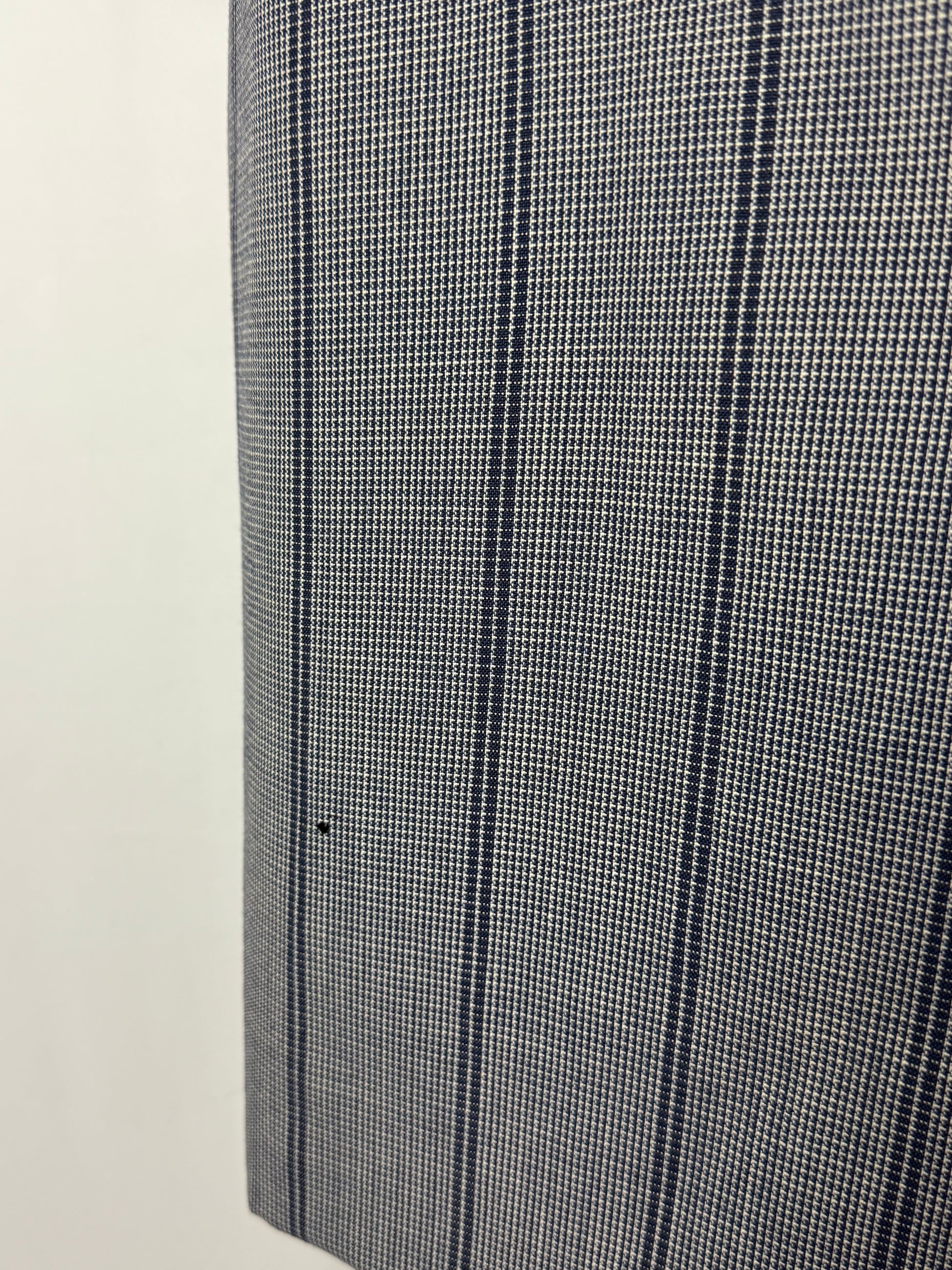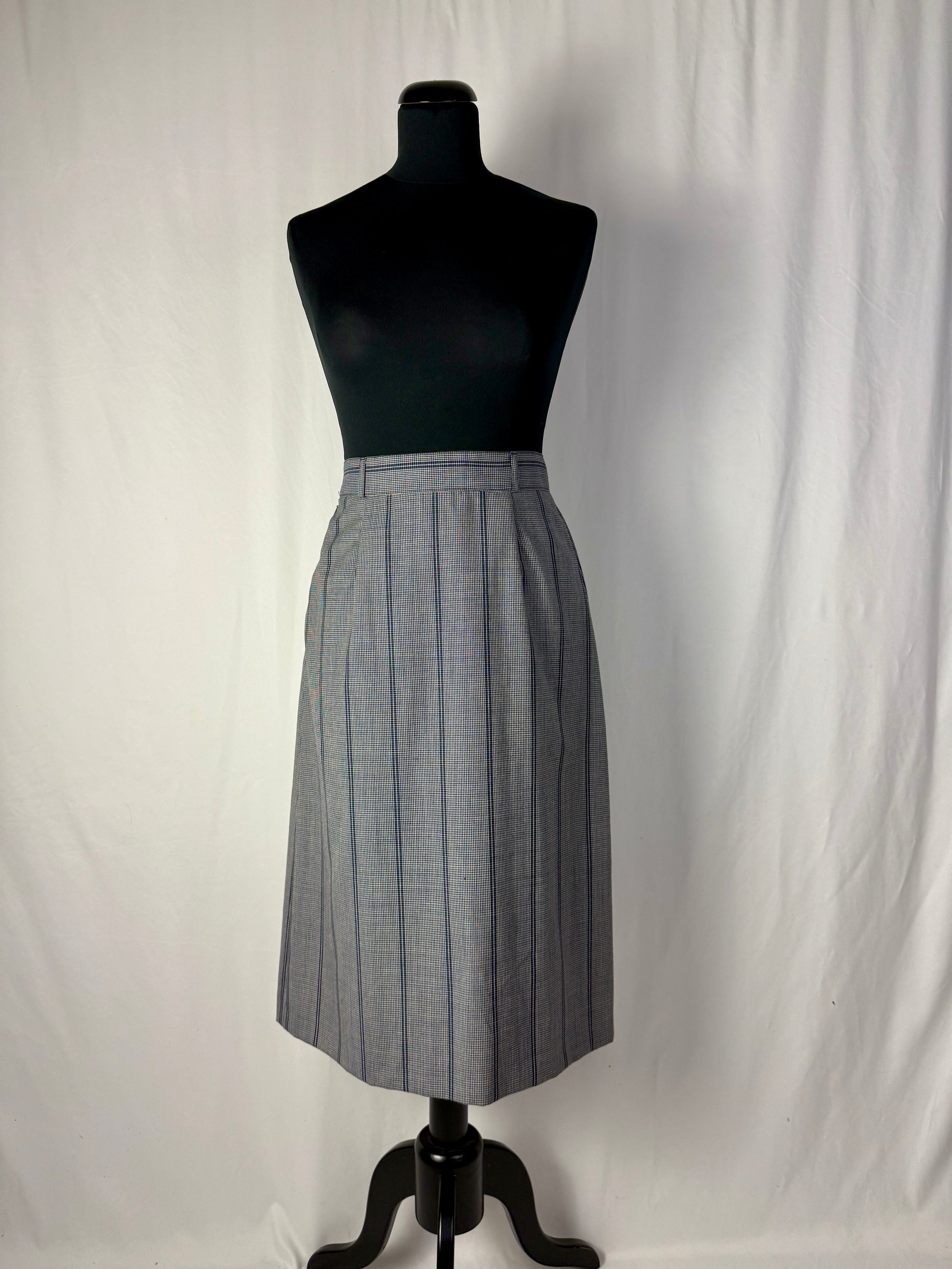 Iconico completo anni ’80 composto da giacca doppiopetto e gonna longuette, realizzato in pura lana con motivo gessato a micro pied-de-poule. Le spalle strutturate e il taglio deciso incarnano alla perfezione lo spirito del power dressing femminile dell’epoca: eleganza, autorevolezza e stile inconfondibile. Il rever a contrasto blu navy e i bottoni metallici aggiungono carattere, rendendo questo tailleur un capo d’archivio capace di raccontare la forza e la sofisticata sobrietà di una donna anni ’80.