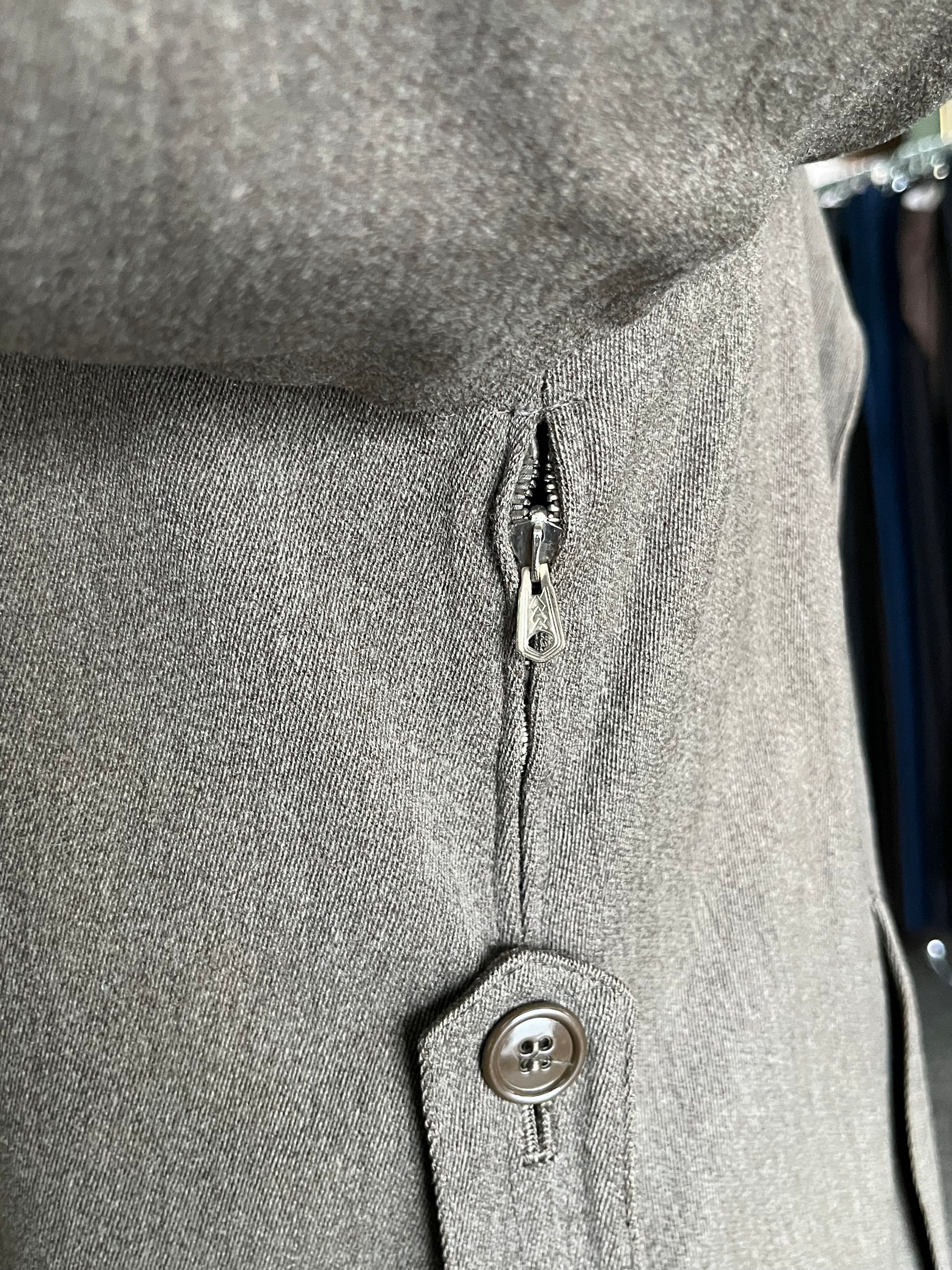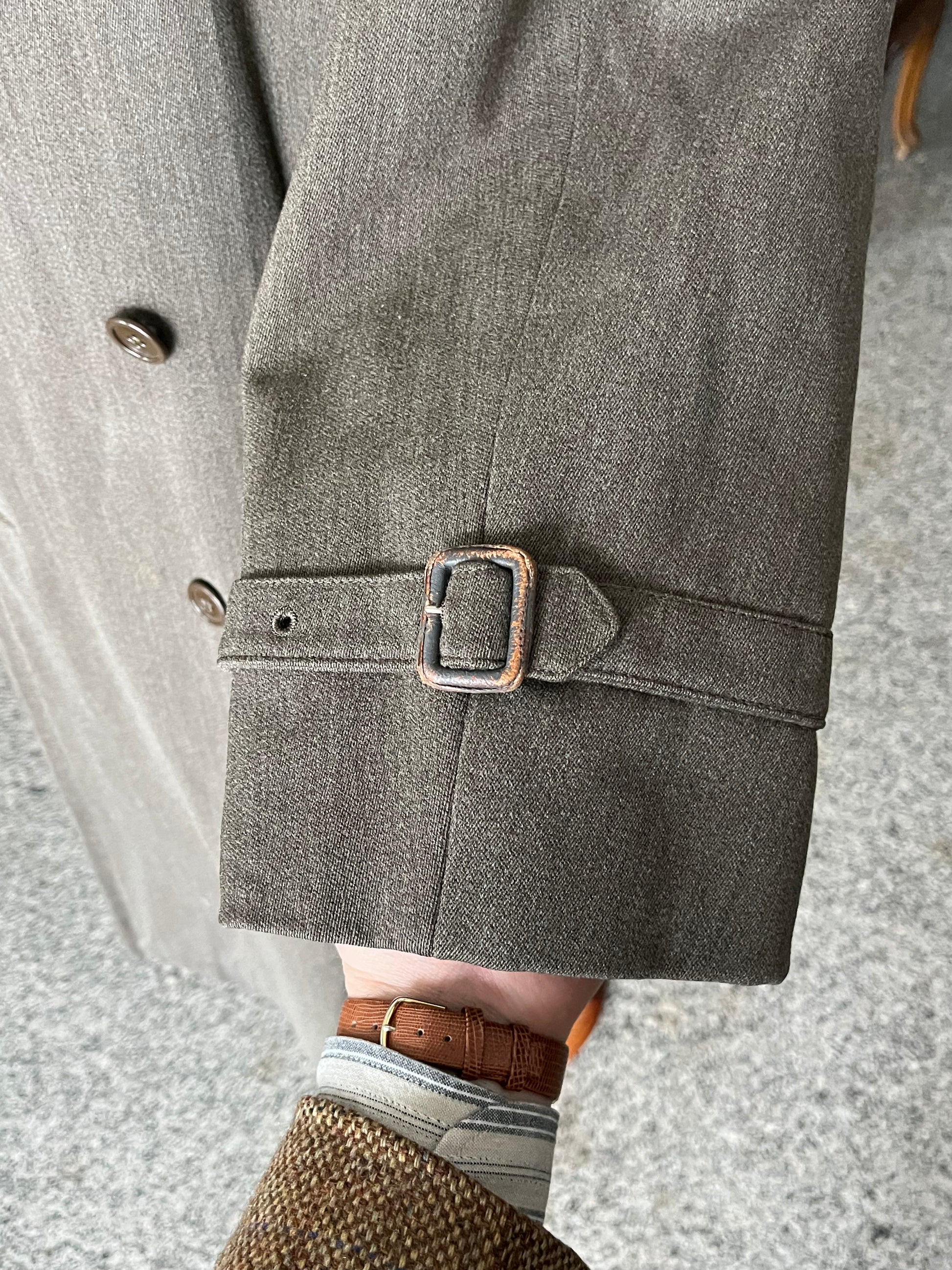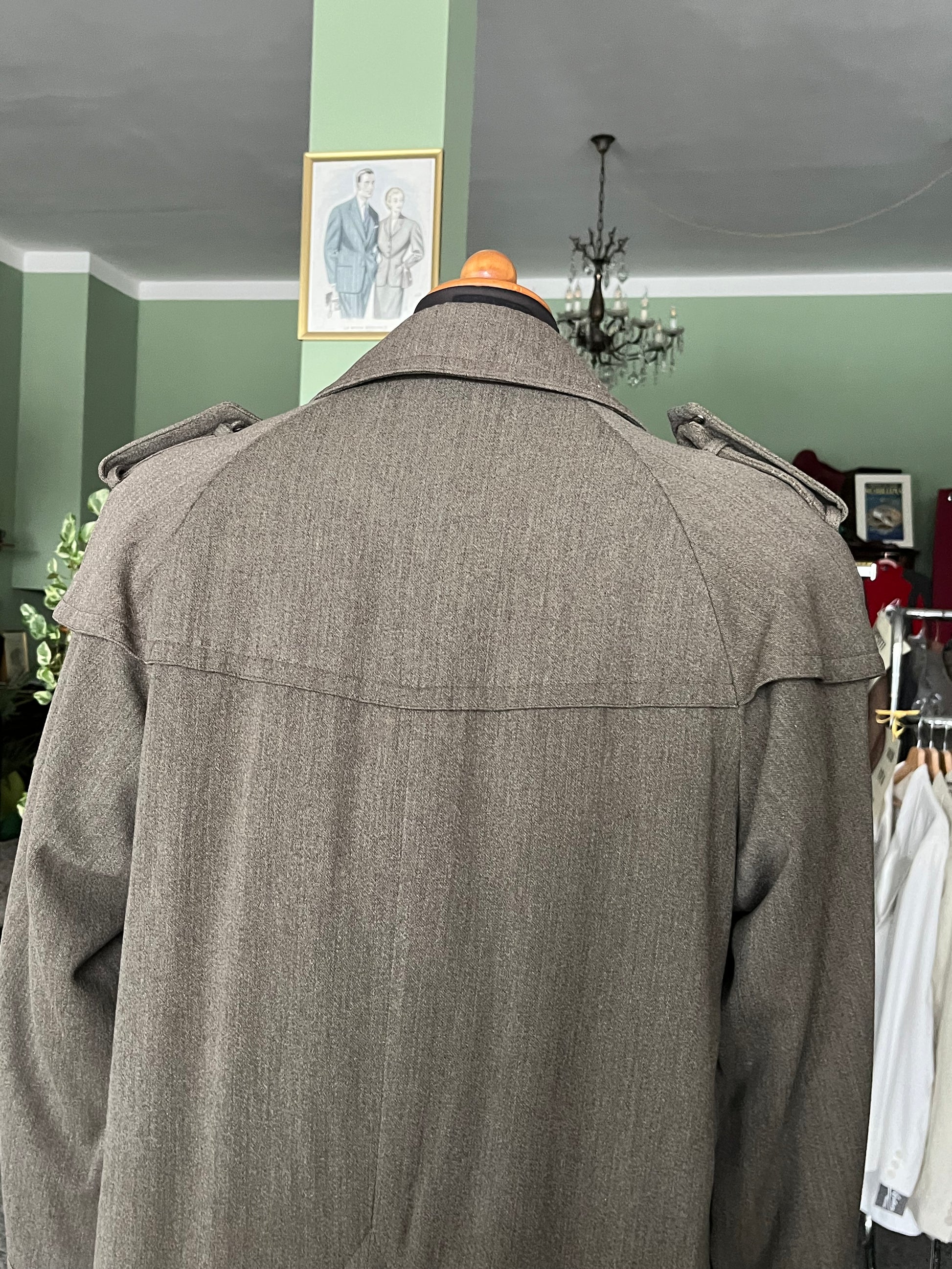 Il tessuto è uno stupendo gabardine di lana MOLTO pensate. Un tessuto totalmente scomparso dalla produzione di oggi e decisamente più pensate dei trench a cui siamo abituati (anche di quelli vintage).